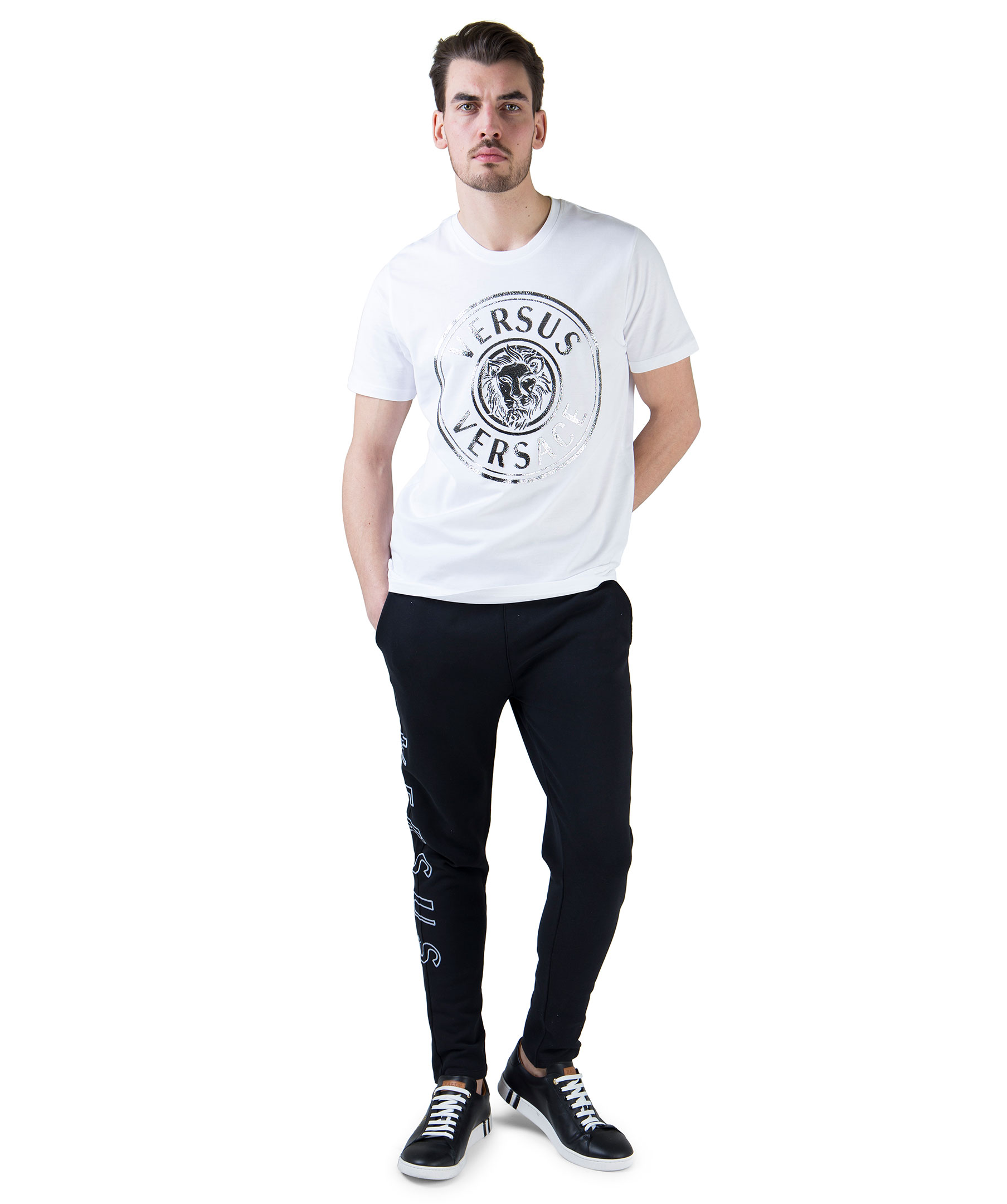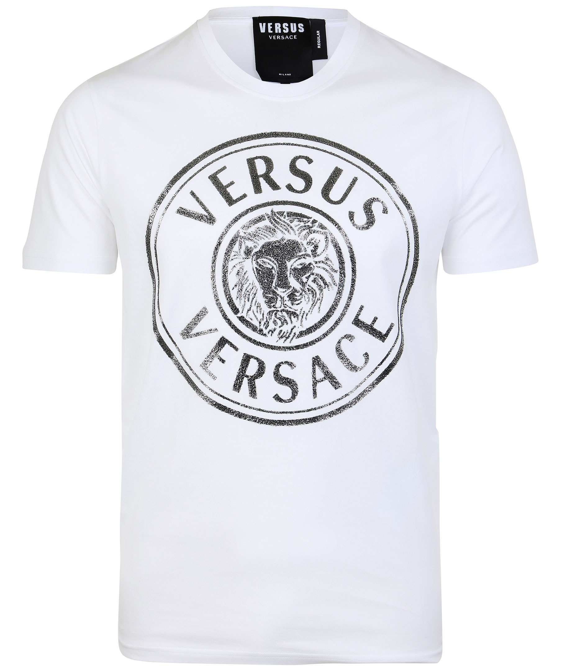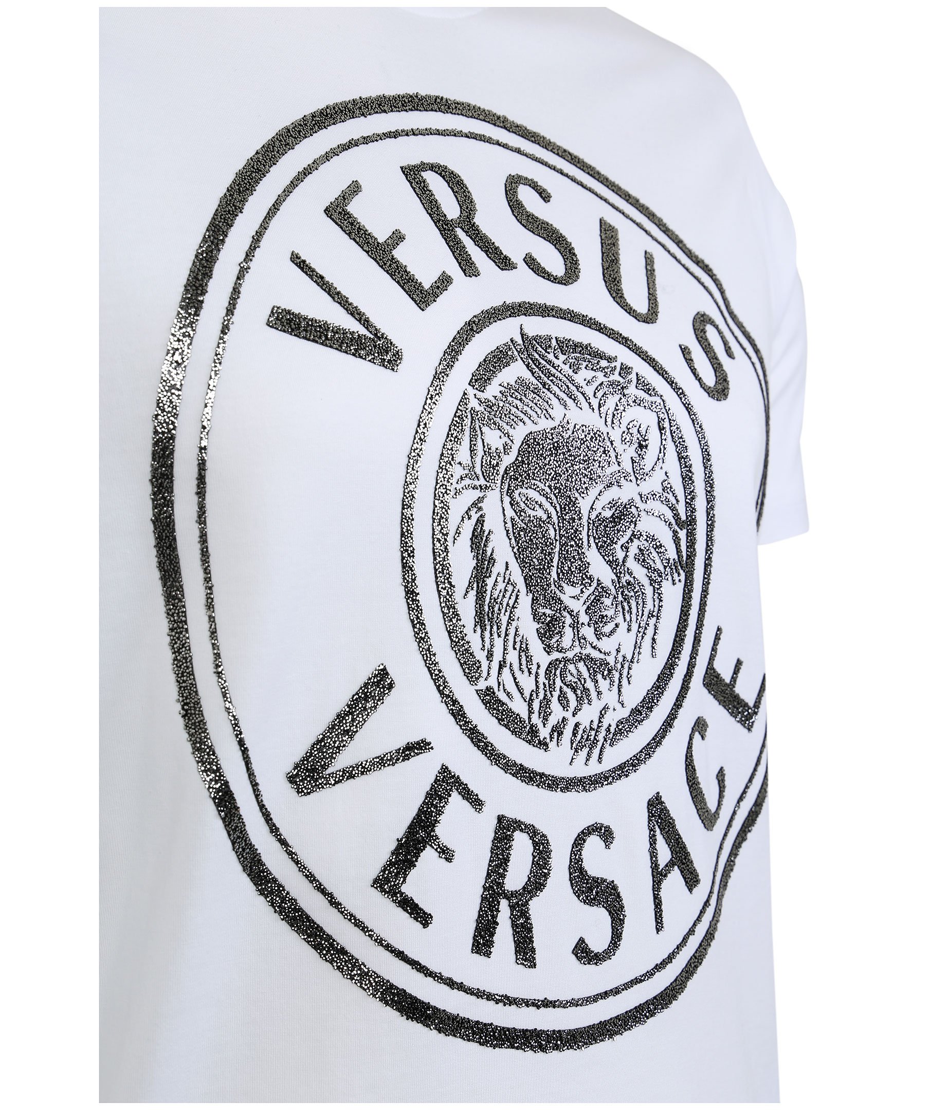 Vit t-shirt från Versus Versace. Rundad hals och stort glittrigt tryck på bröstet. Regular fit. Modellen är 192 cm lång och bär storlek L