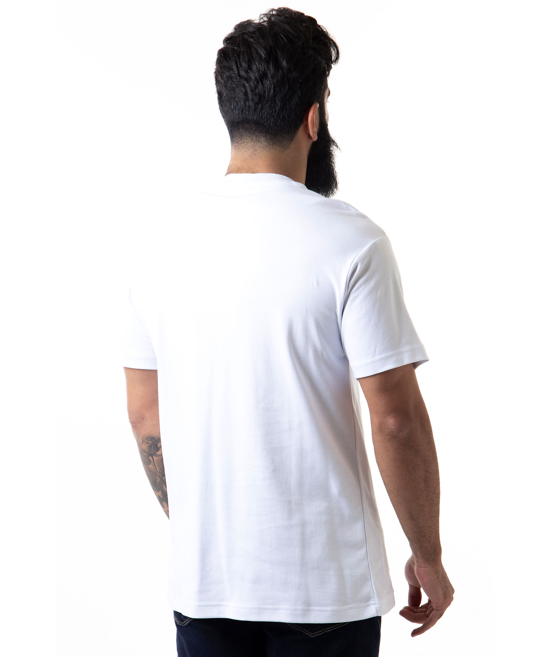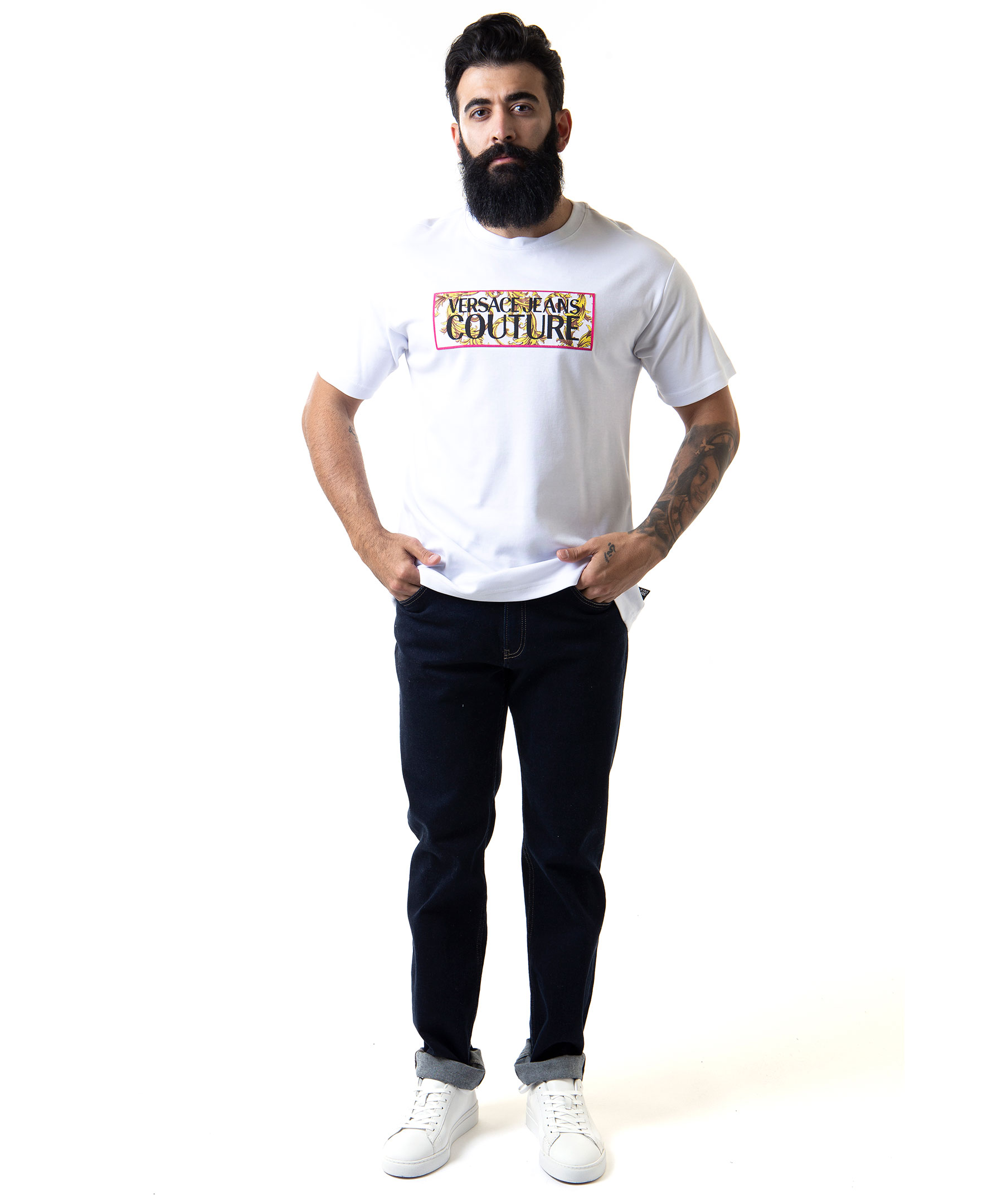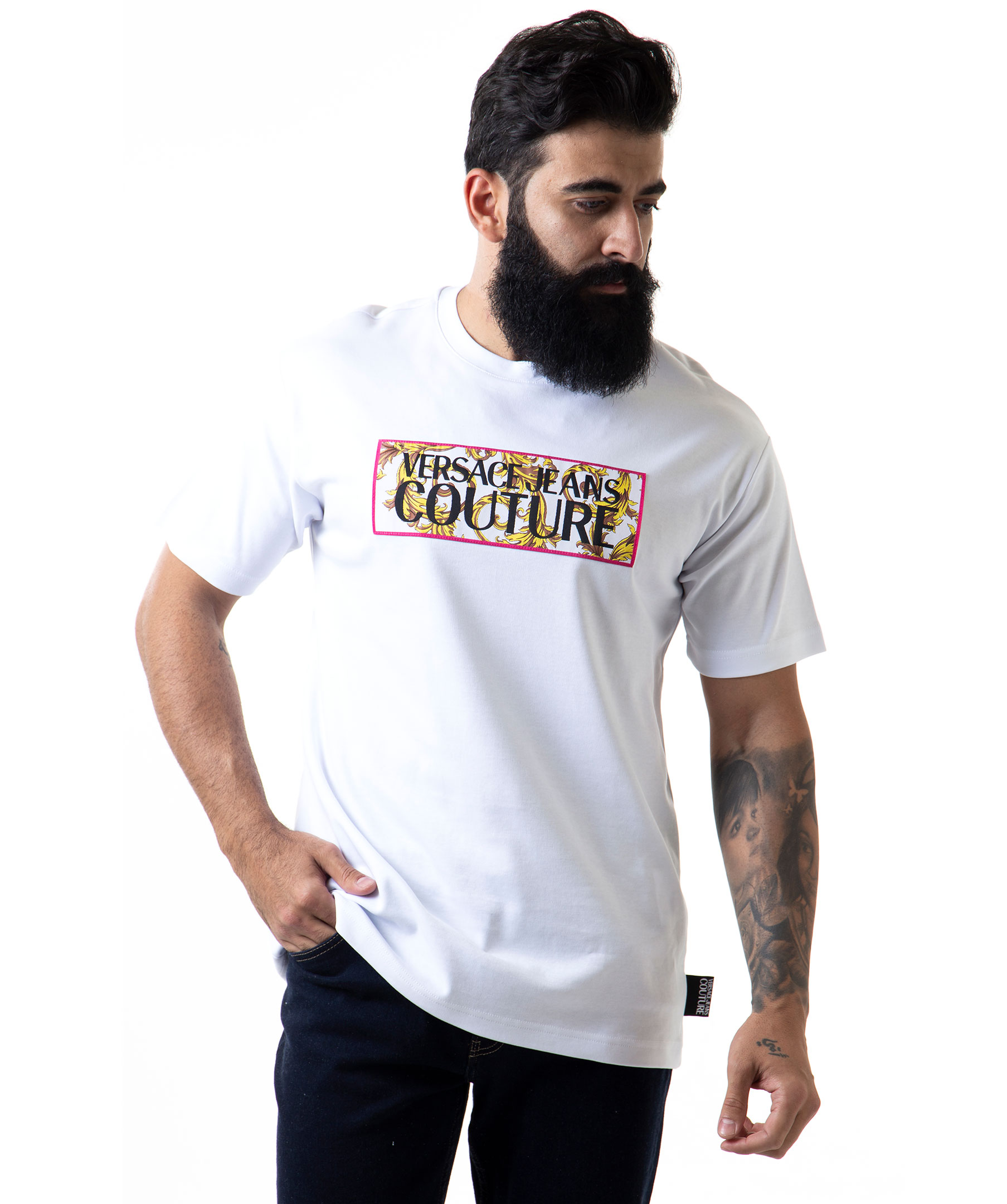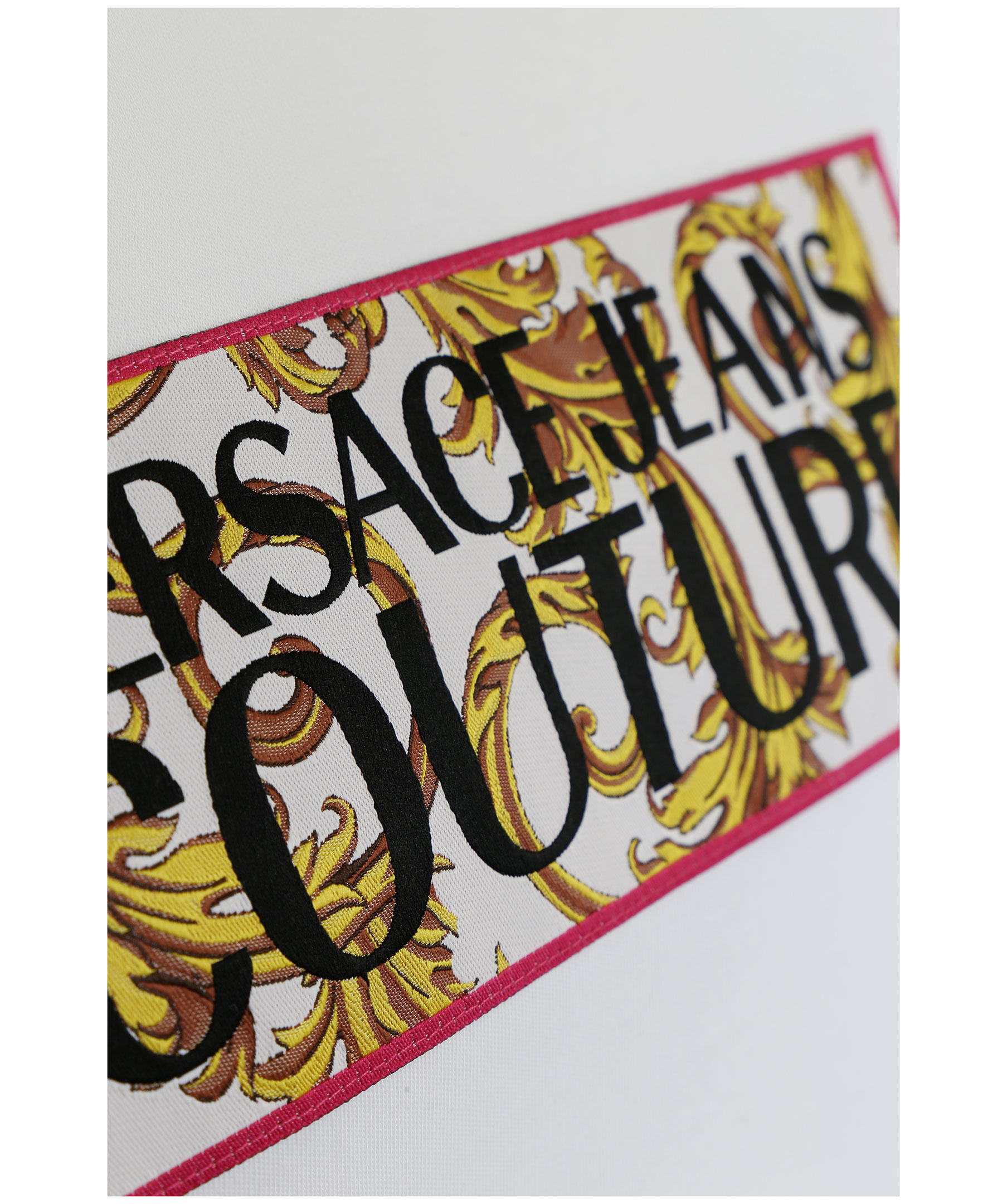 Vit t-shirt från Versace Jeans Couture tillverkad i bomull. Broderad tygapplikation på bröstet med mönster och logga. Modellen är 177 cm lång och bär storlek M.