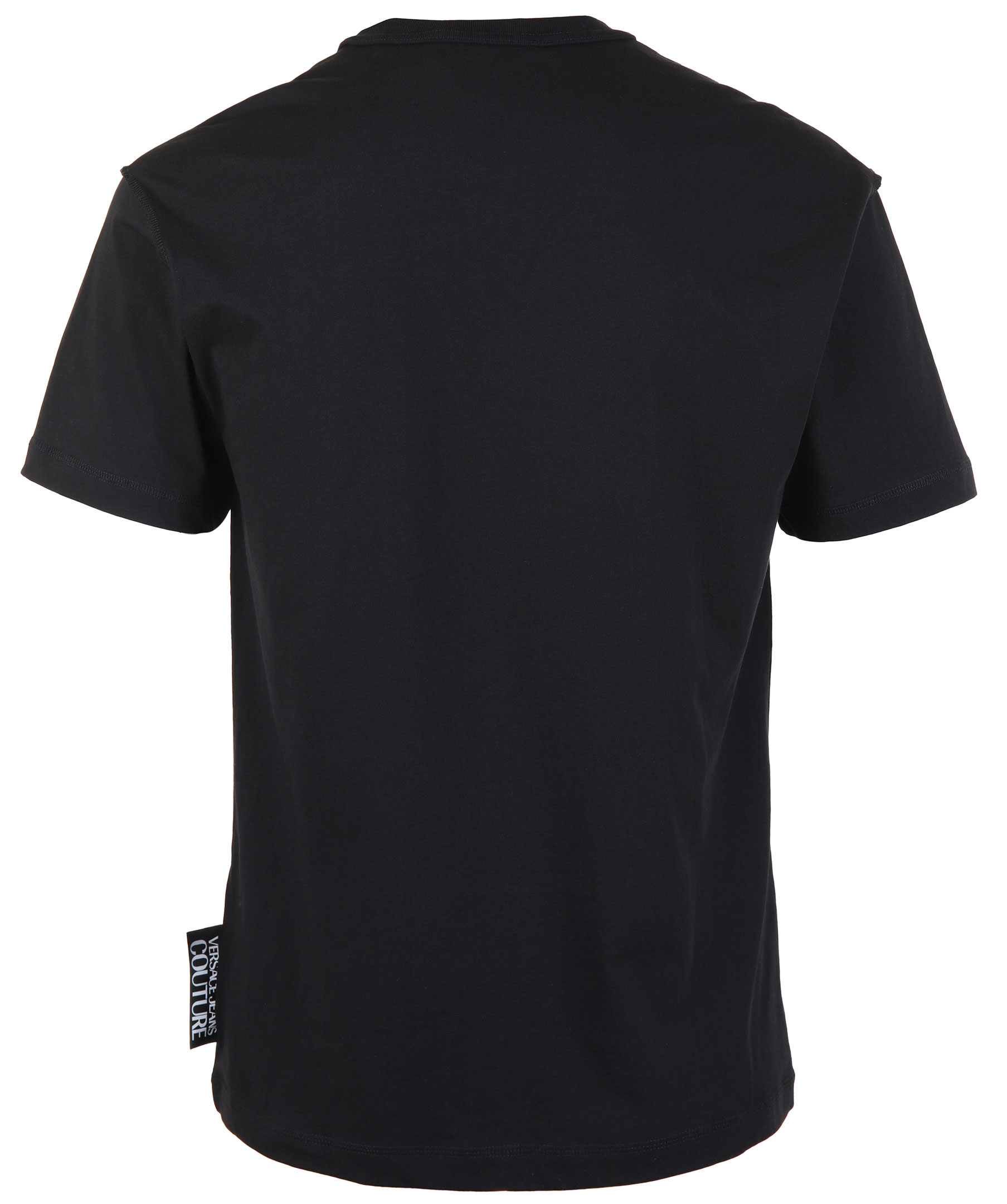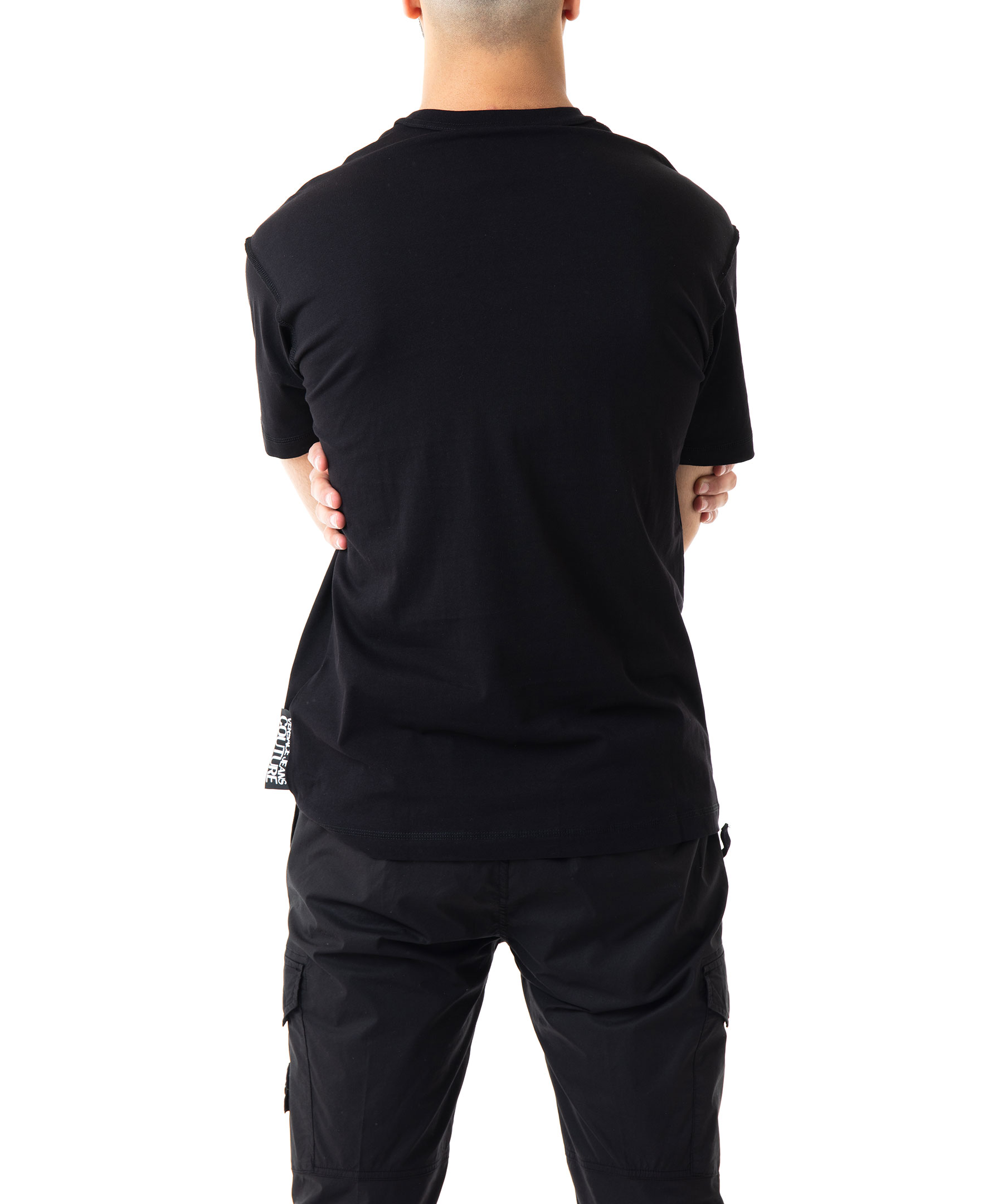 Svart t-shirt med rundad halsringning från Versace Jeans Couture. Ruta med mönstrat sidentyg med logotyp på bröstet. Tillverkad i 100% bomull. Modellen är 186 cm lång och bär storlek M.