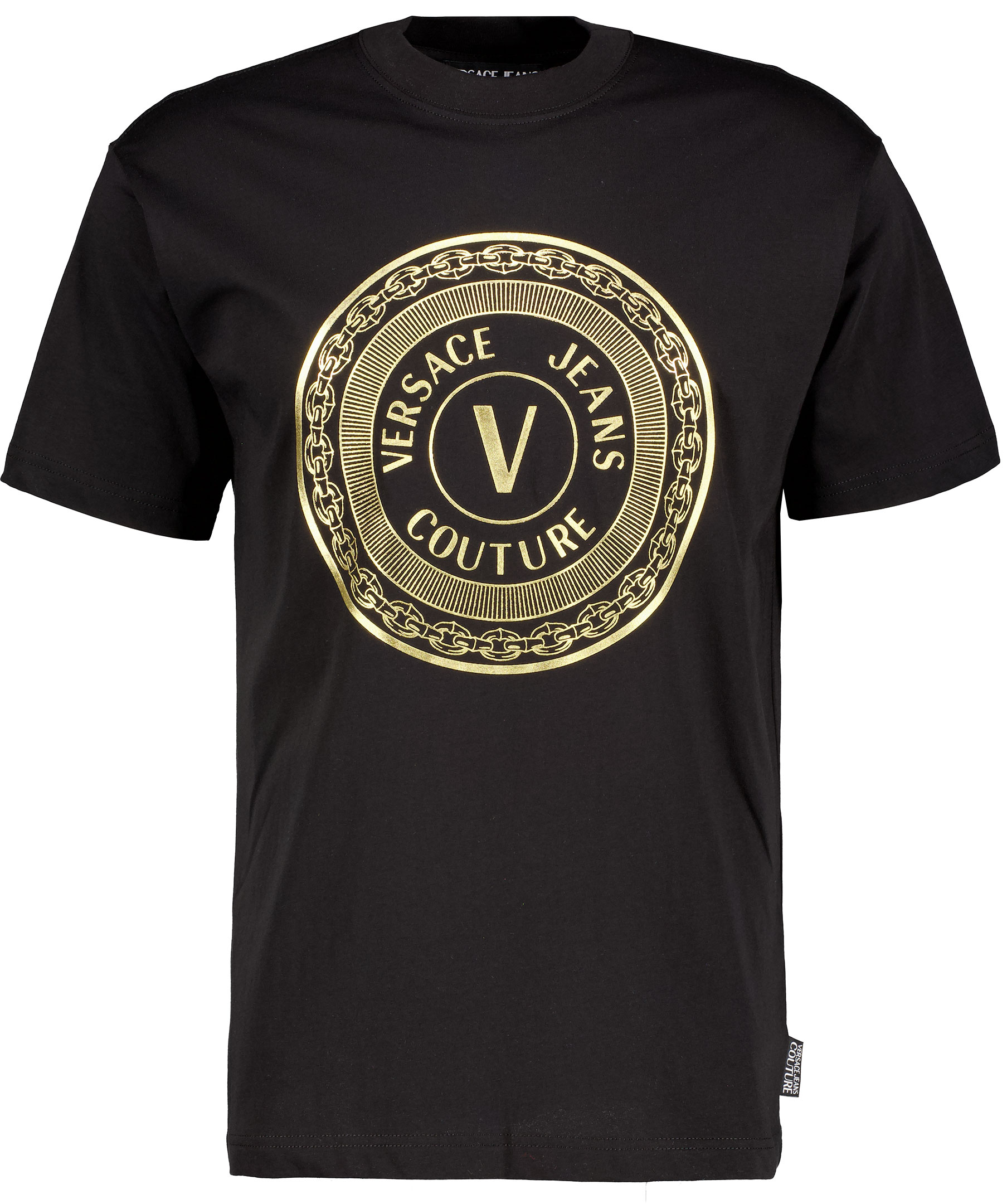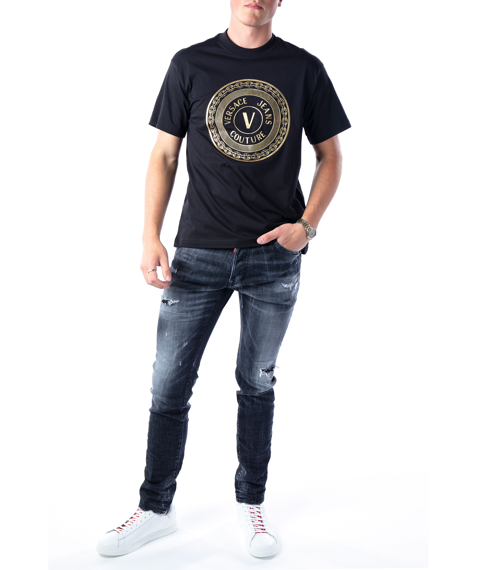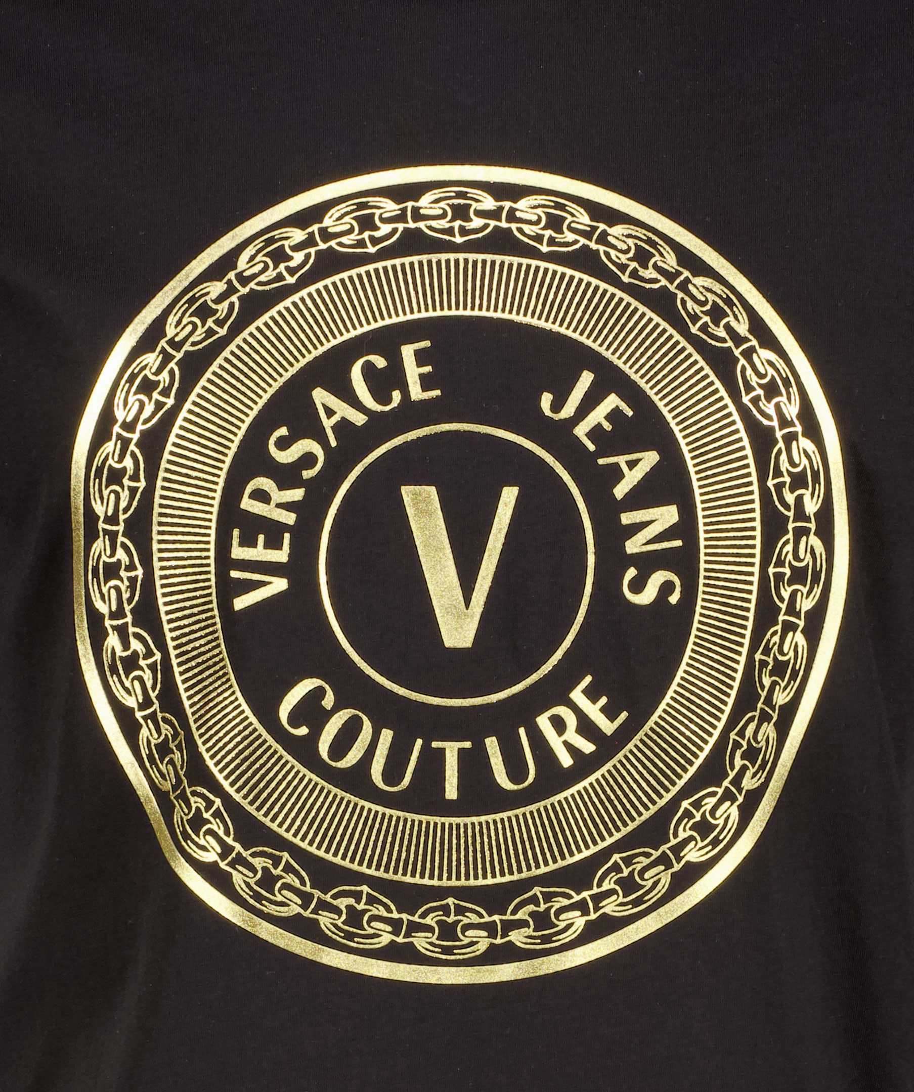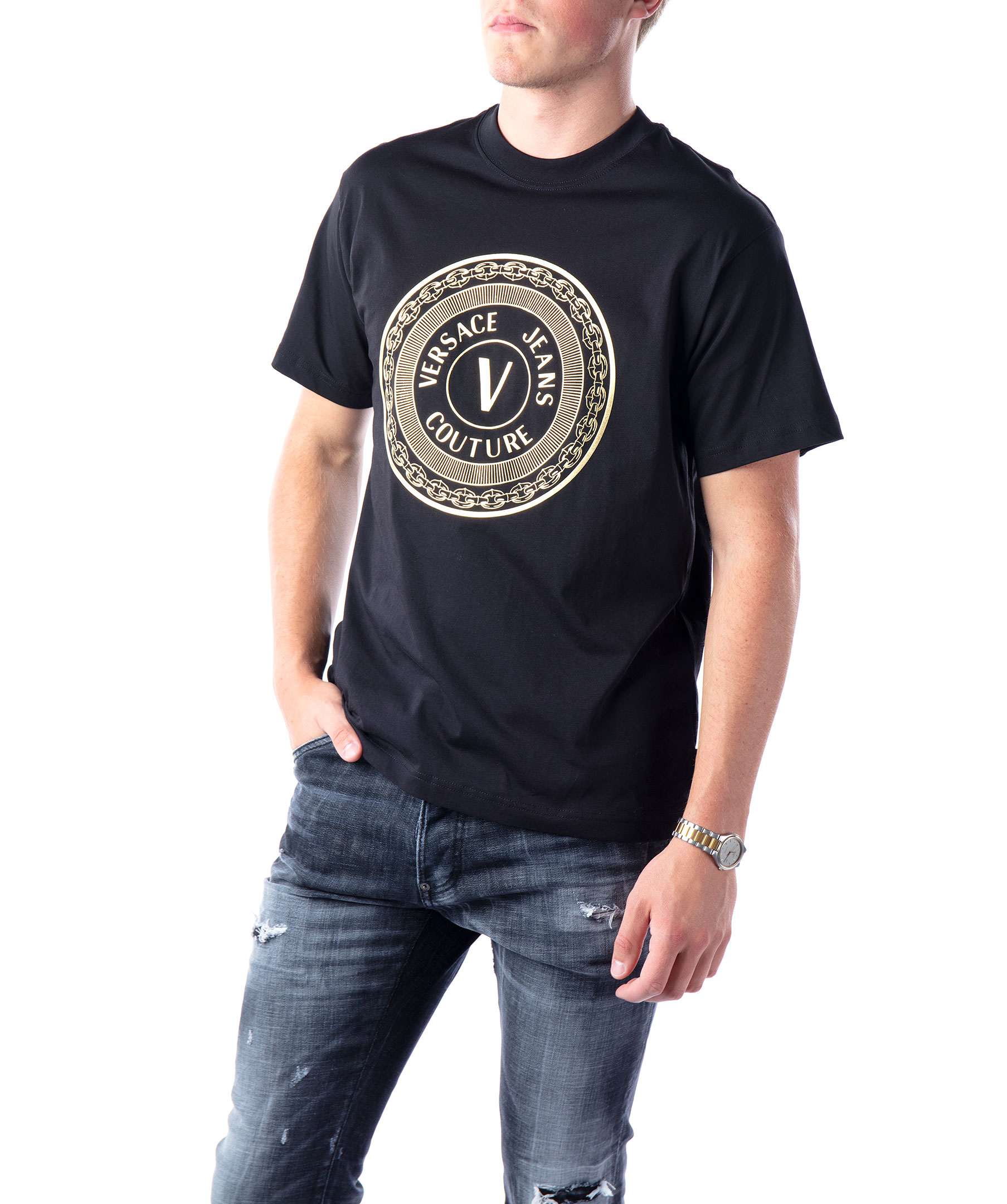 Svart t-shirt från Versace Jeans Couture. Tillverkad i 100% bomull. Stort, runt och guldfärgat tryck med logotyp på bröstet. Rundad halsringning med ribbad mudd. Liten svart lapp med guldfärgad logotyp längst ner på vänster sida i sömmen. Modellen är 190 cm lång och bär storlek M.