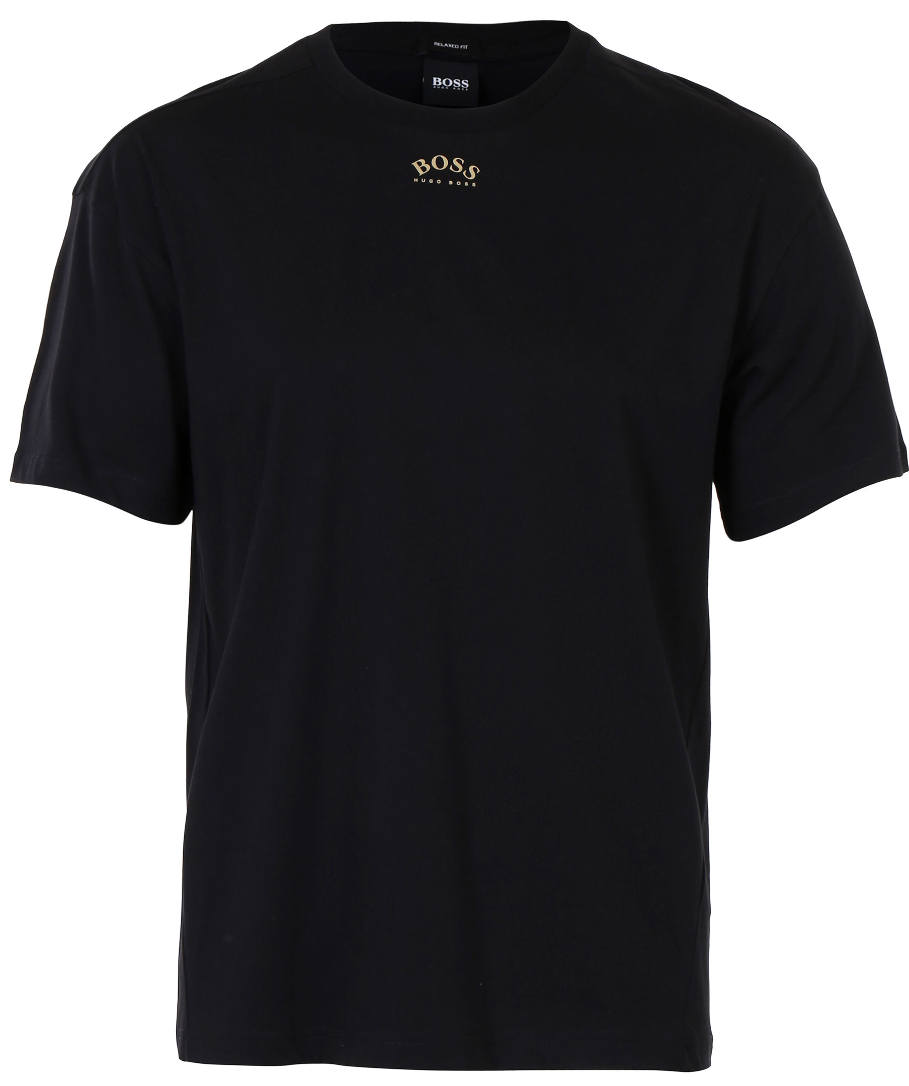 Svart t-shirt i 100% bomull från Hugo Boss. Liten guldfärgad logotyp fram uppe vid den rundade halsringningen och stor guldfärgad logotyp på ryggen.