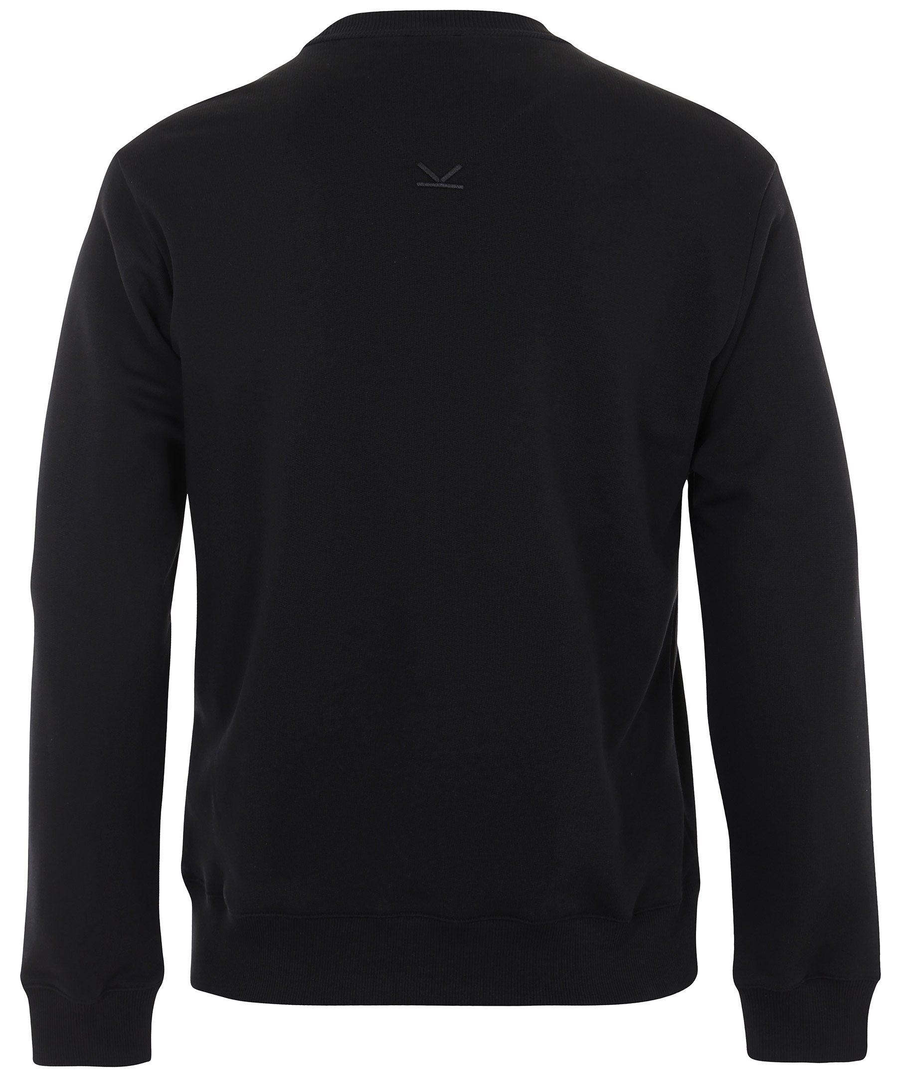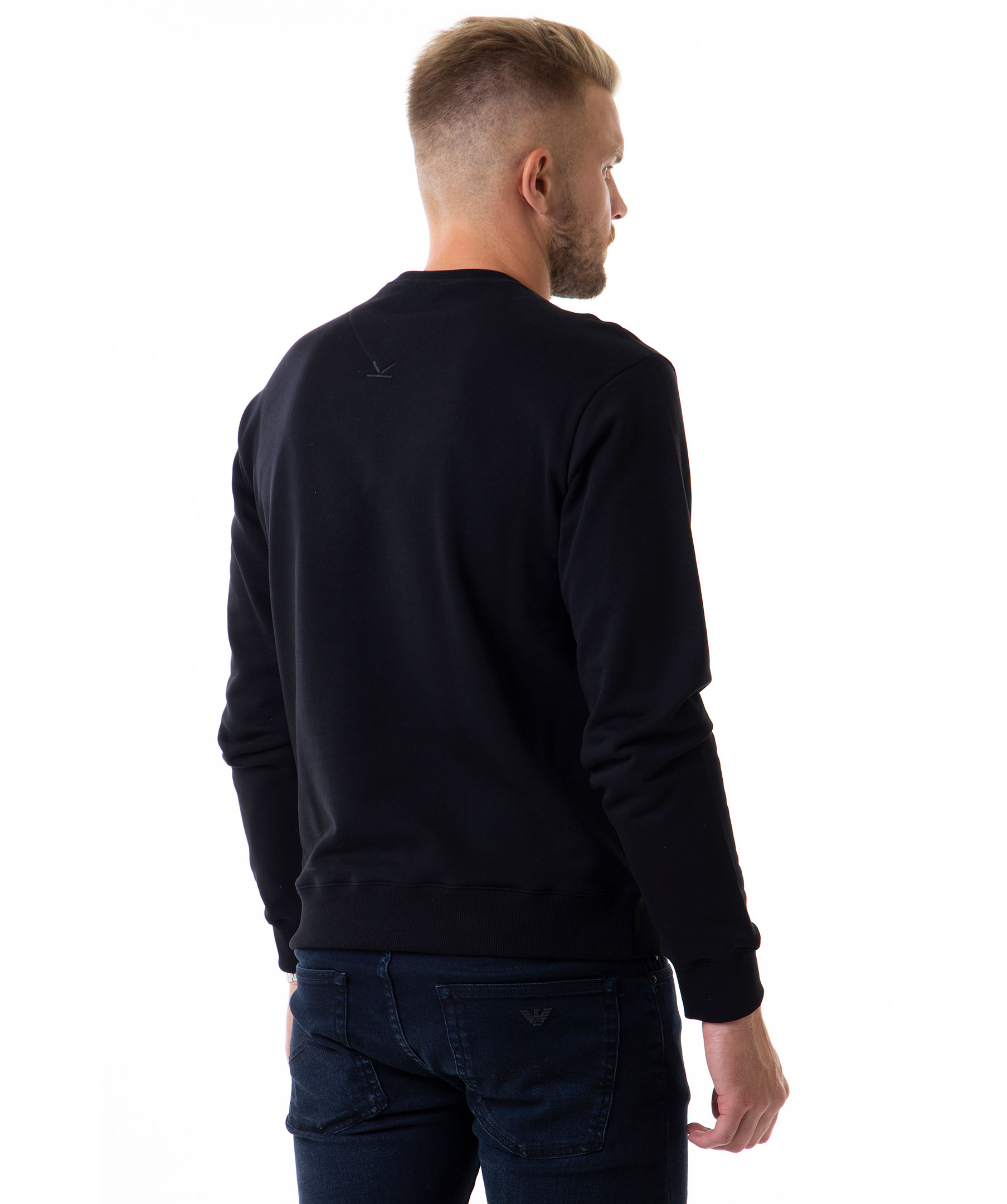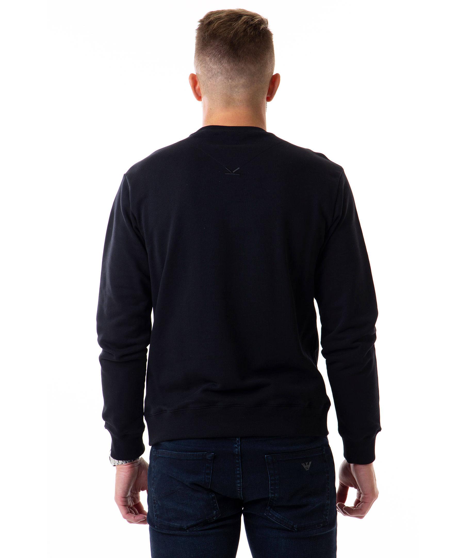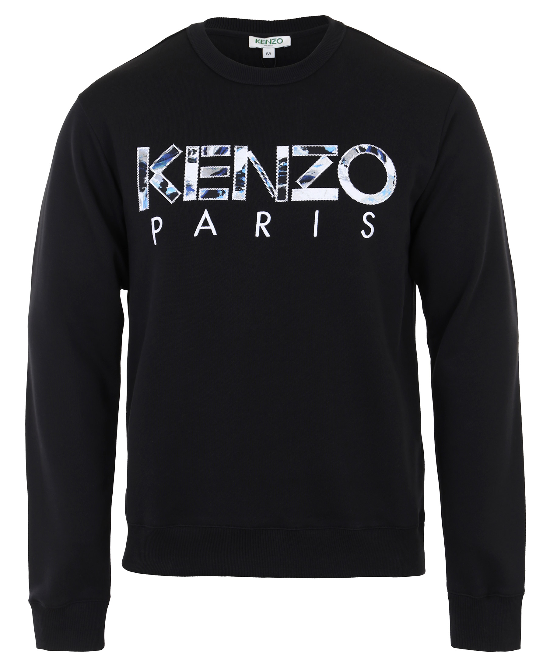 Svart collegetröja från Kenzo. Tillverkad i bomull. Vit brodyr och mönstrad logga på bröstet. Ribbstickade muddar vid hals, ärm och plaggslut. Modellen är 188 cm lång och bär storlek M.