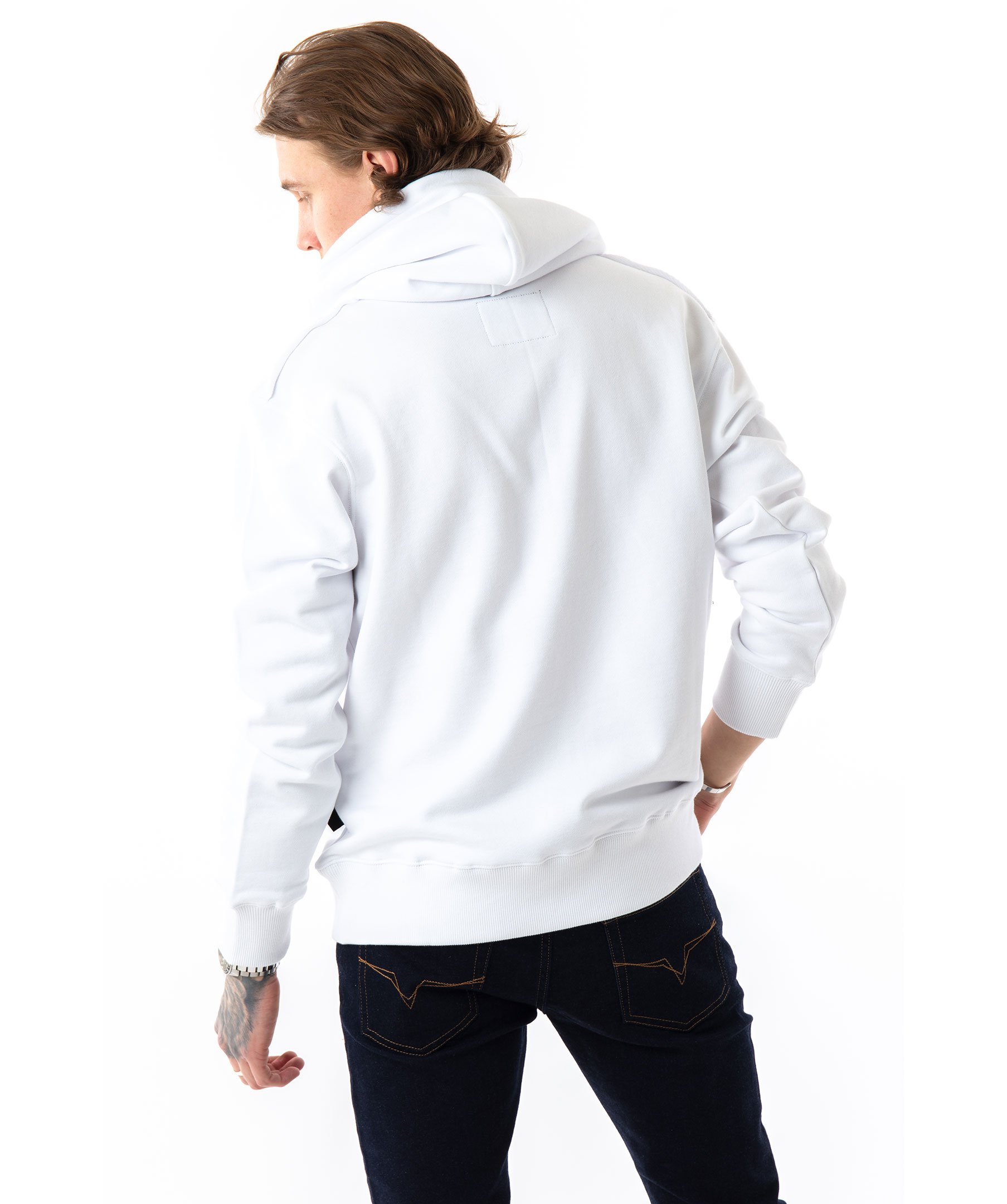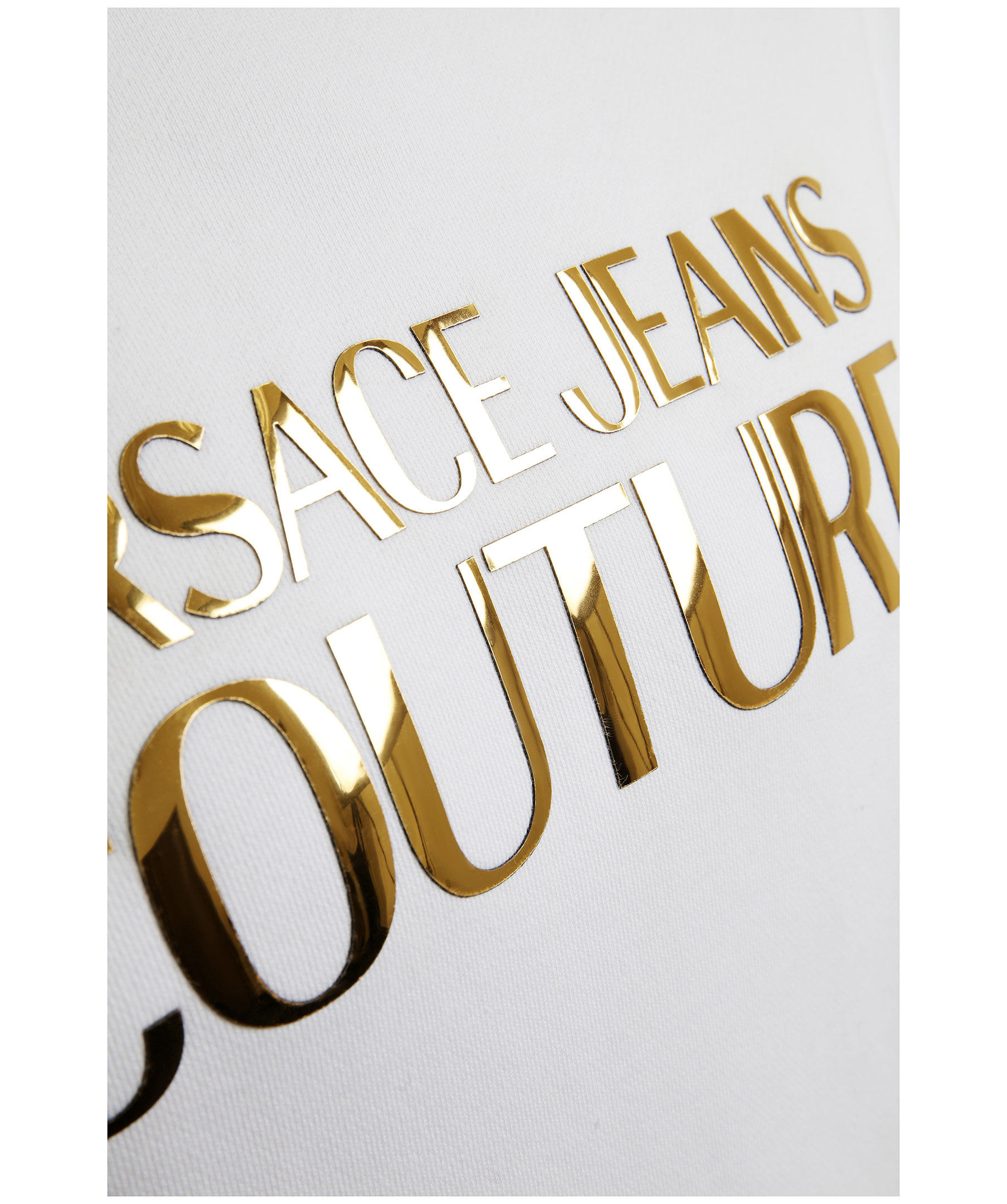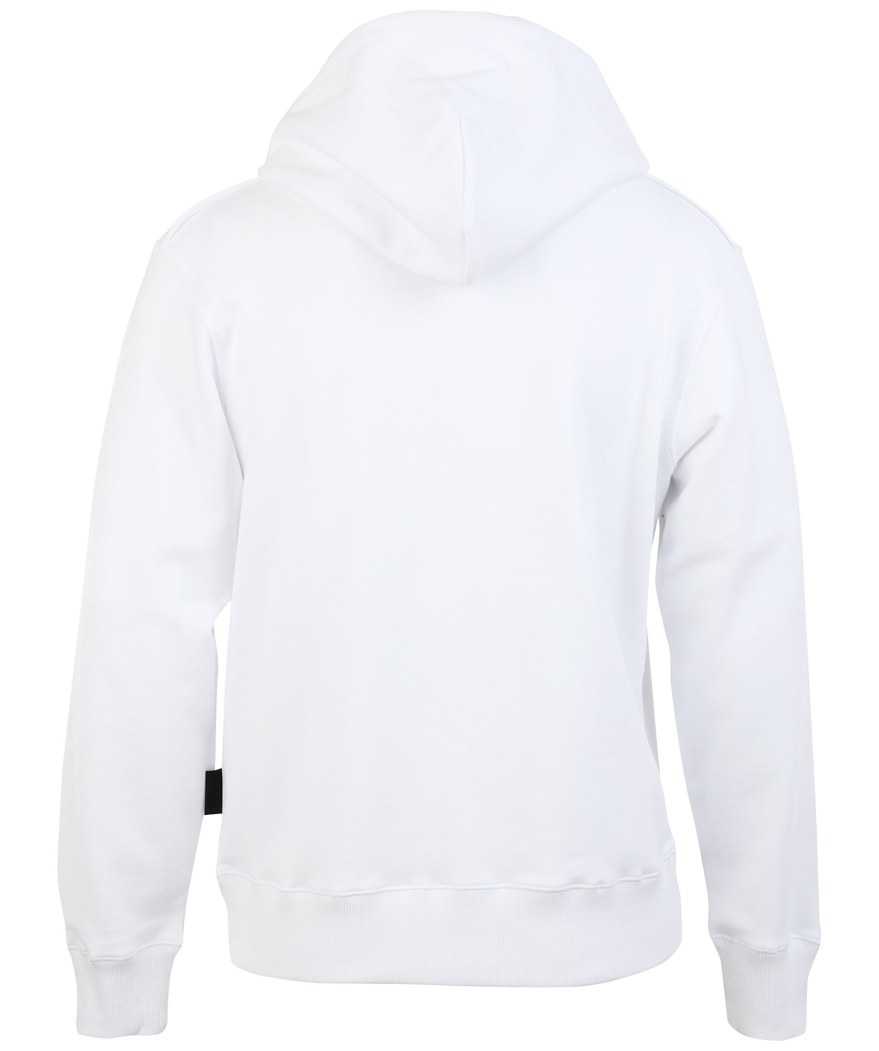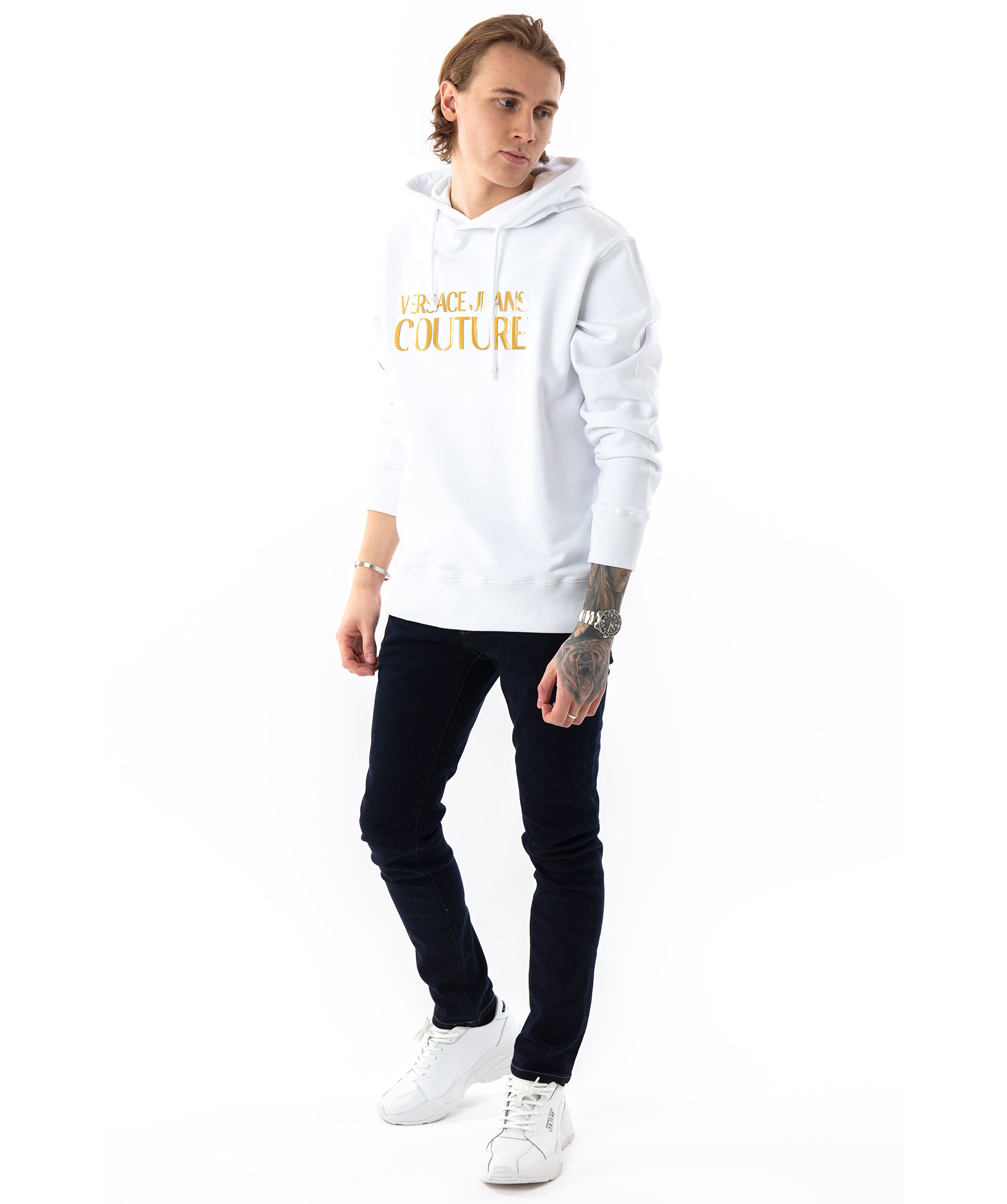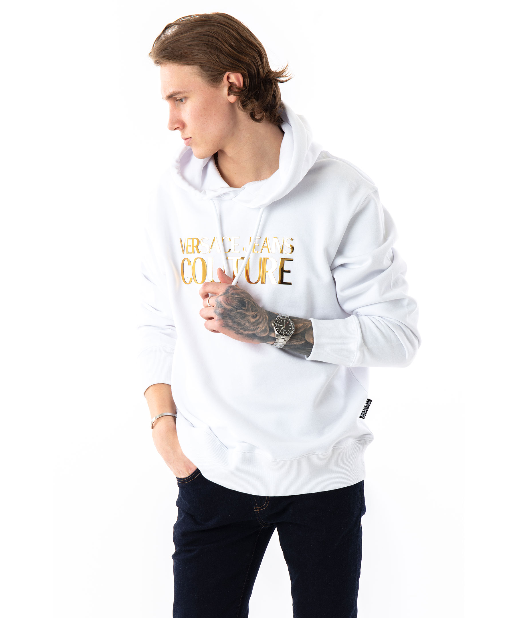 Vit hoodie från Versace Jeans Couture. Snörning i luvan och stor guldfärgad logotyp på bröstet. Muddar i ärmslut och i plaggslut. Modellen är 180 cm lång och bär storlek M.
