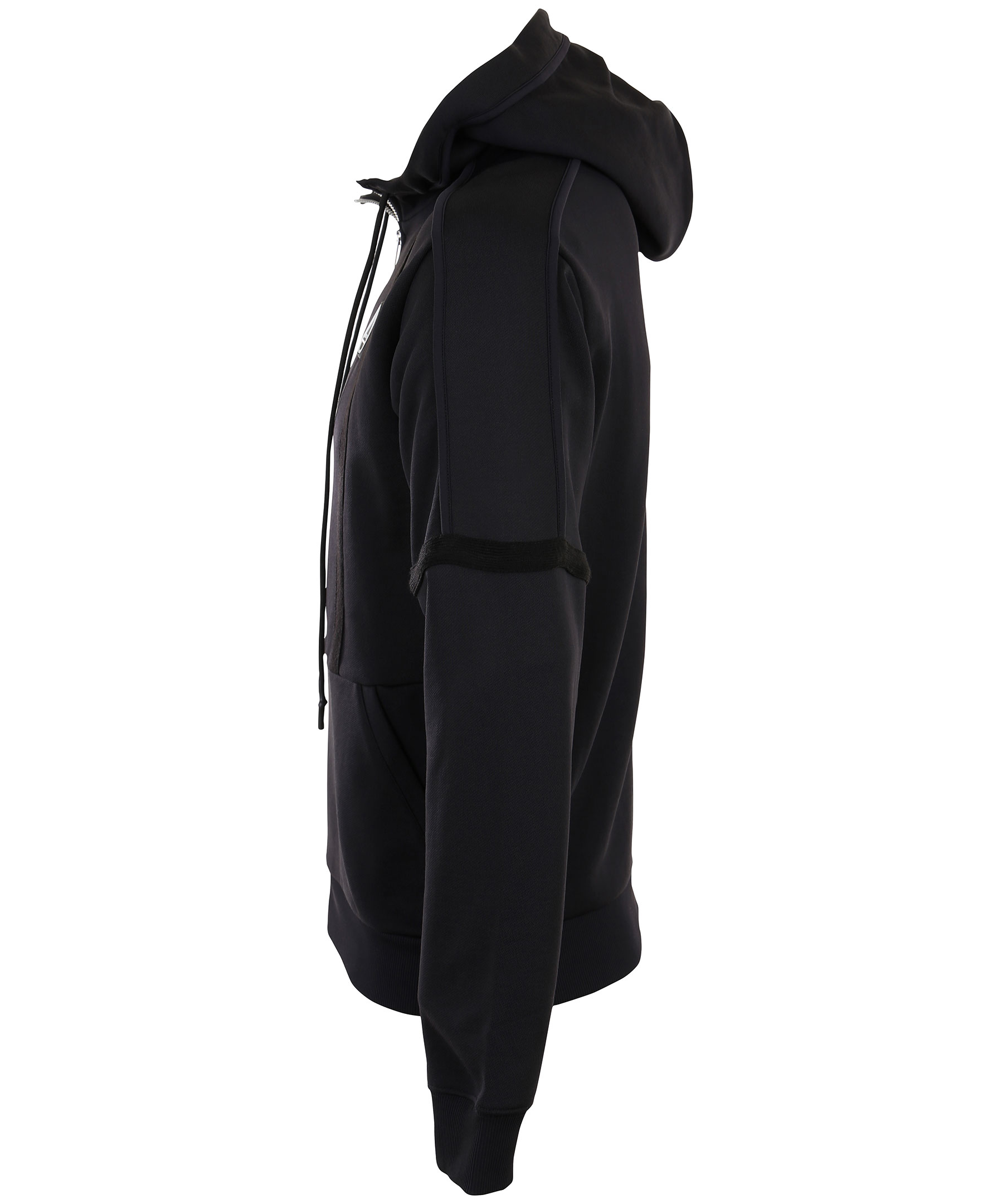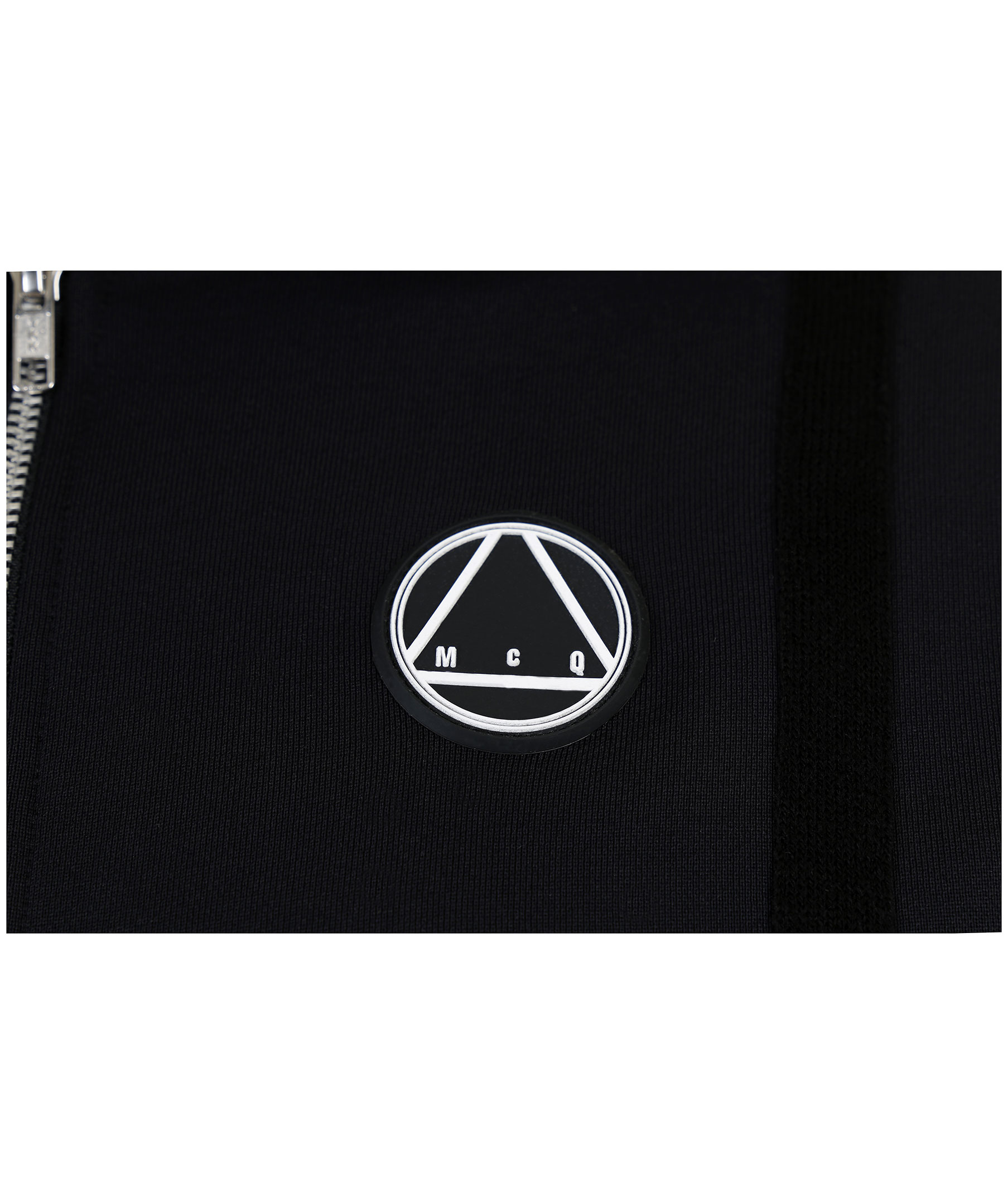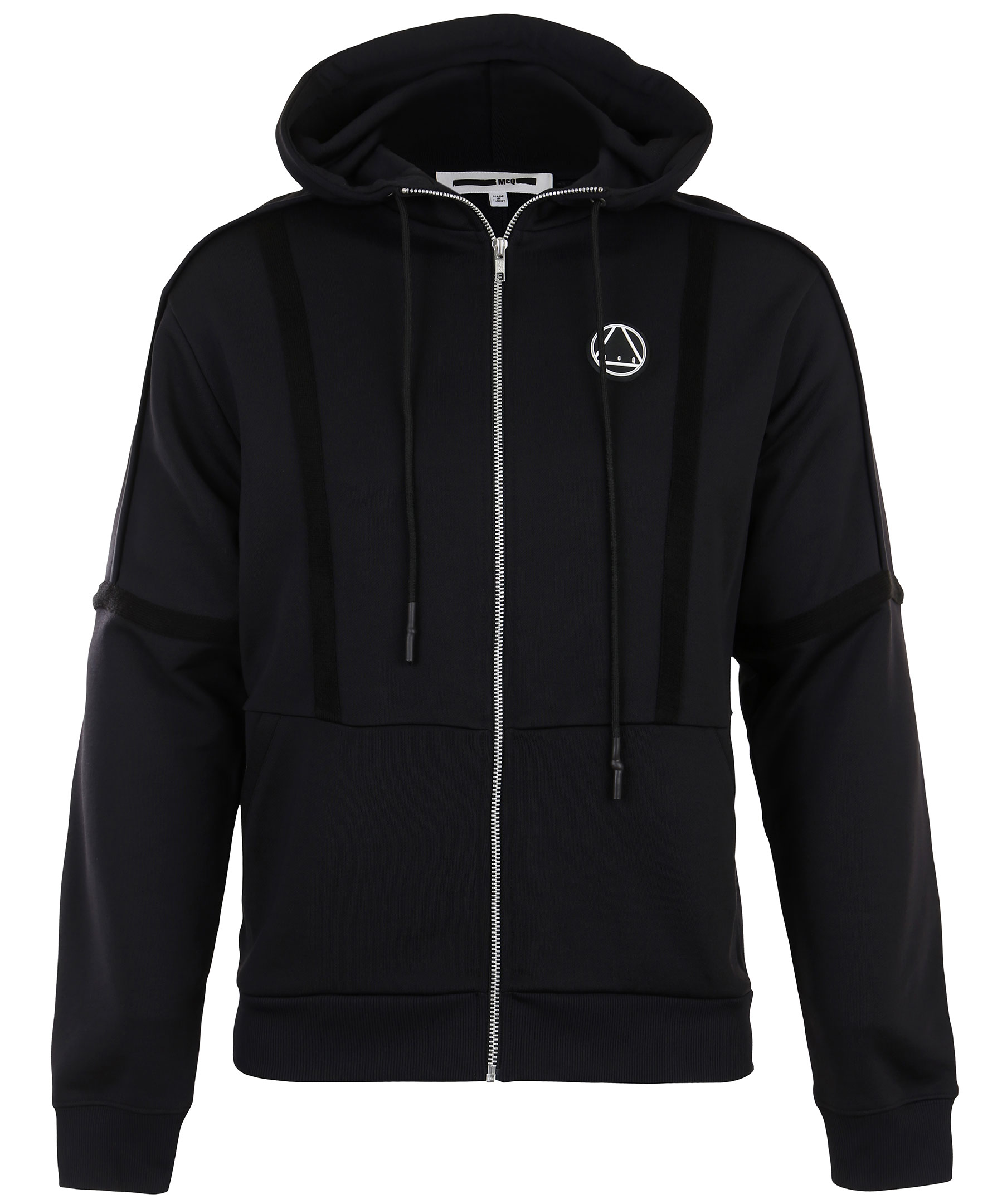 Svart zip-tröja med luva från McQ By Alexander McQueen. Två framfickor, gummerad logotyp i vitt på bröstet, dragsko i luva och dekorerad med synliga sömmar samt dekorativa revärer. Modellen är 183 cm lång och bär storlek M.