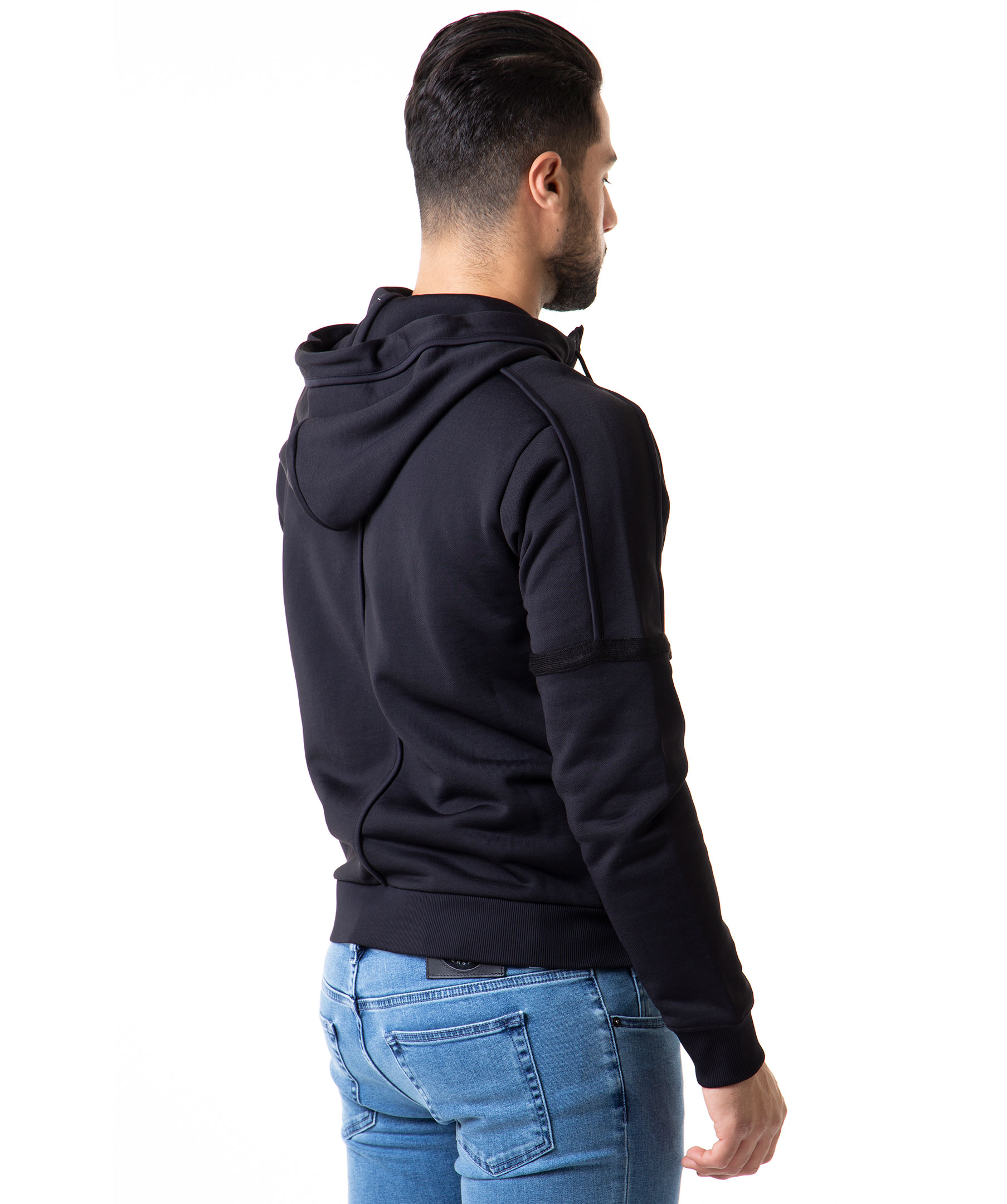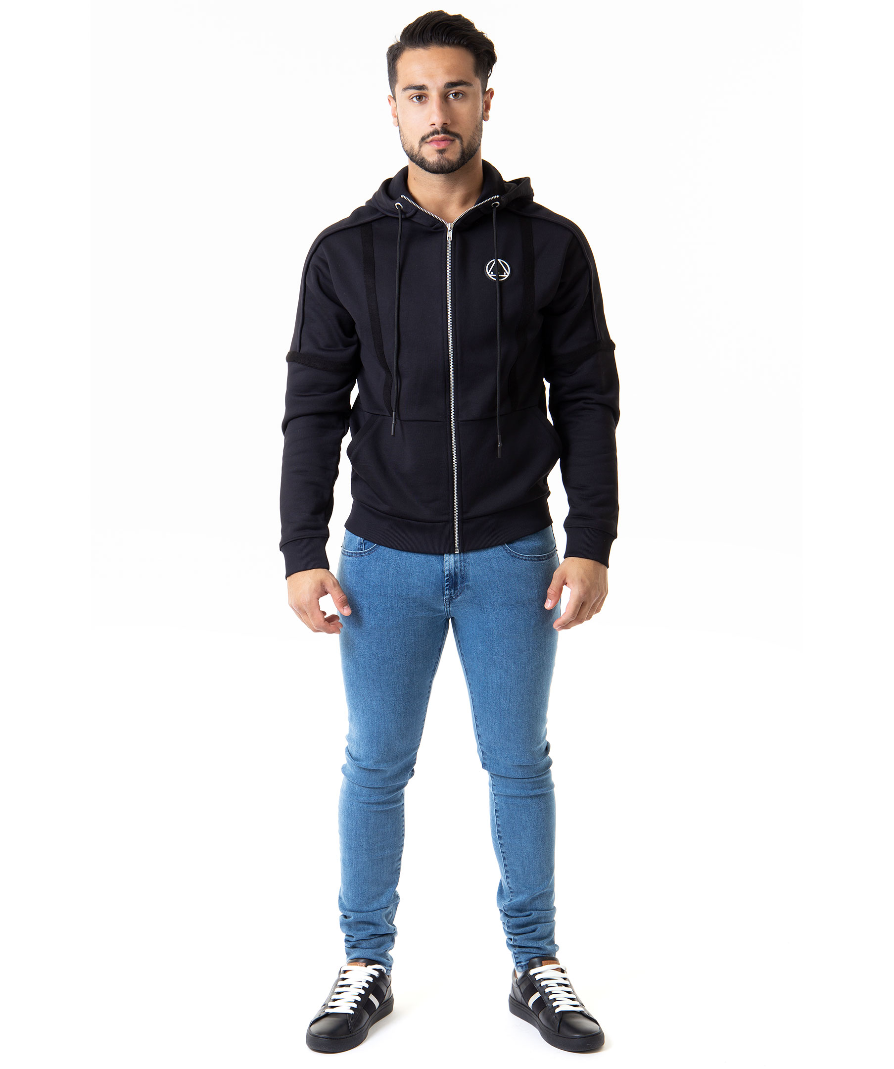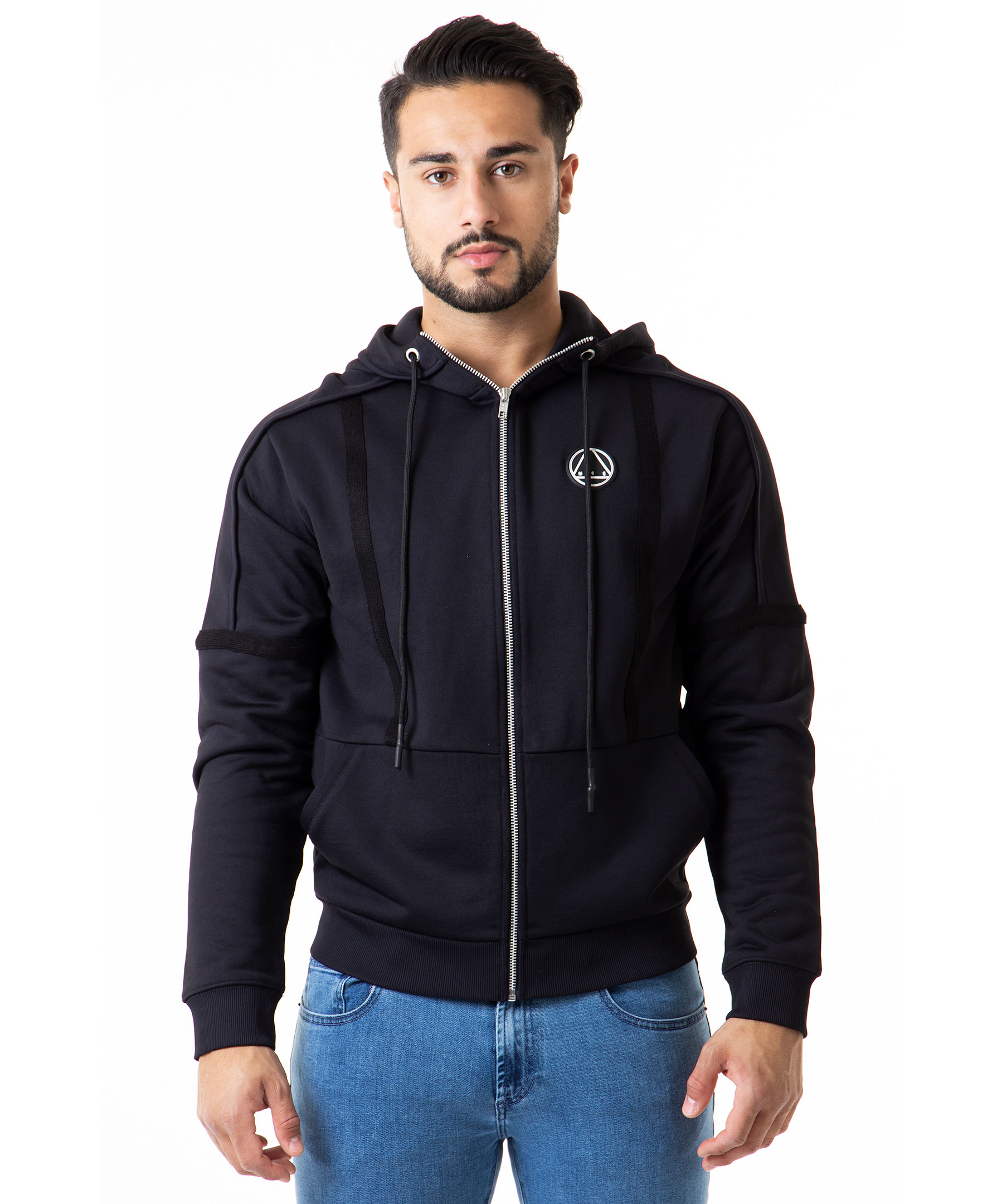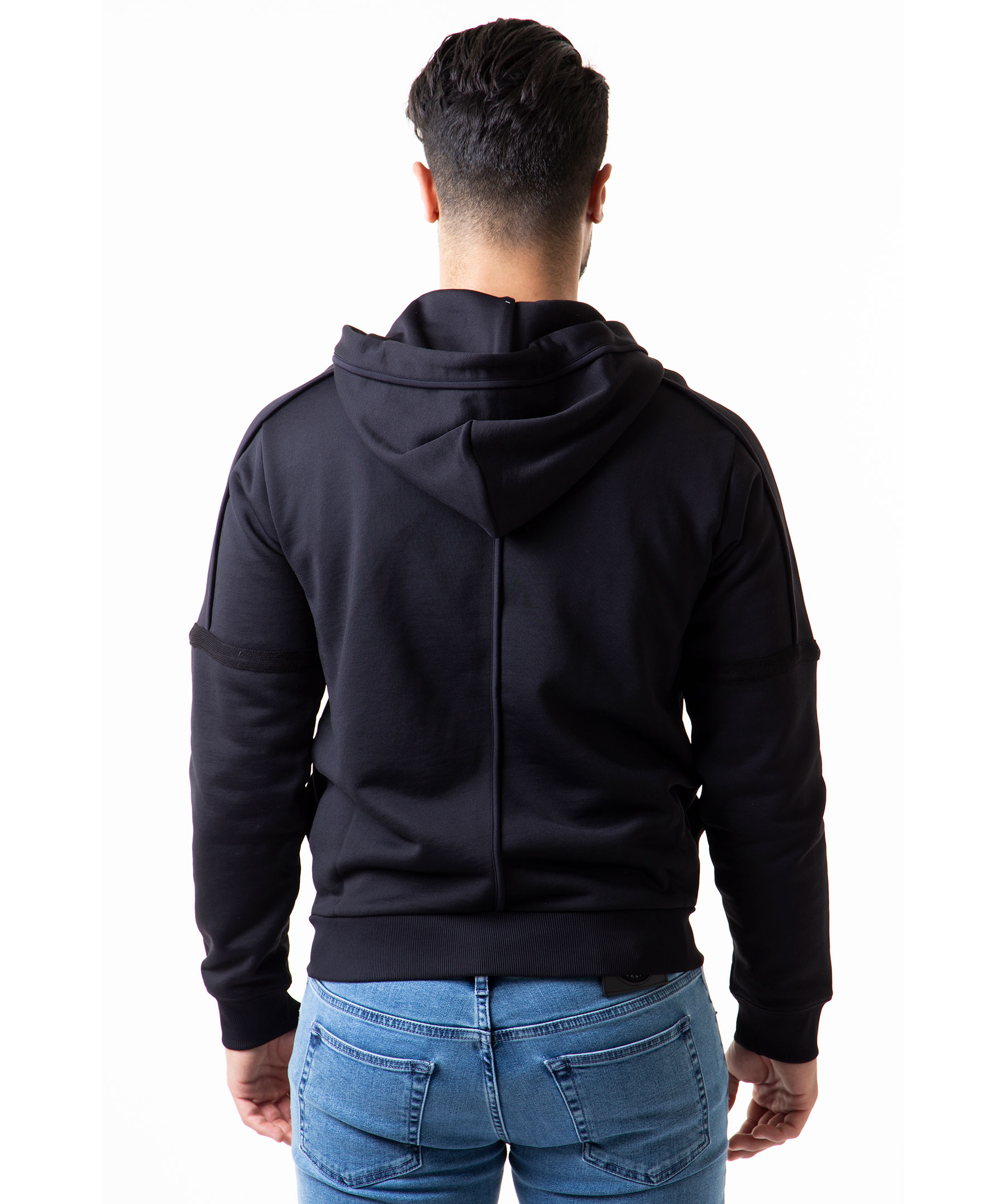 Svart zip-tröja med luva från McQ By Alexander McQueen. Två framfickor, gummerad logotyp i vitt på bröstet, dragsko i luva och dekorerad med synliga sömmar samt dekorativa revärer. Modellen är 183 cm lång och bär storlek M.