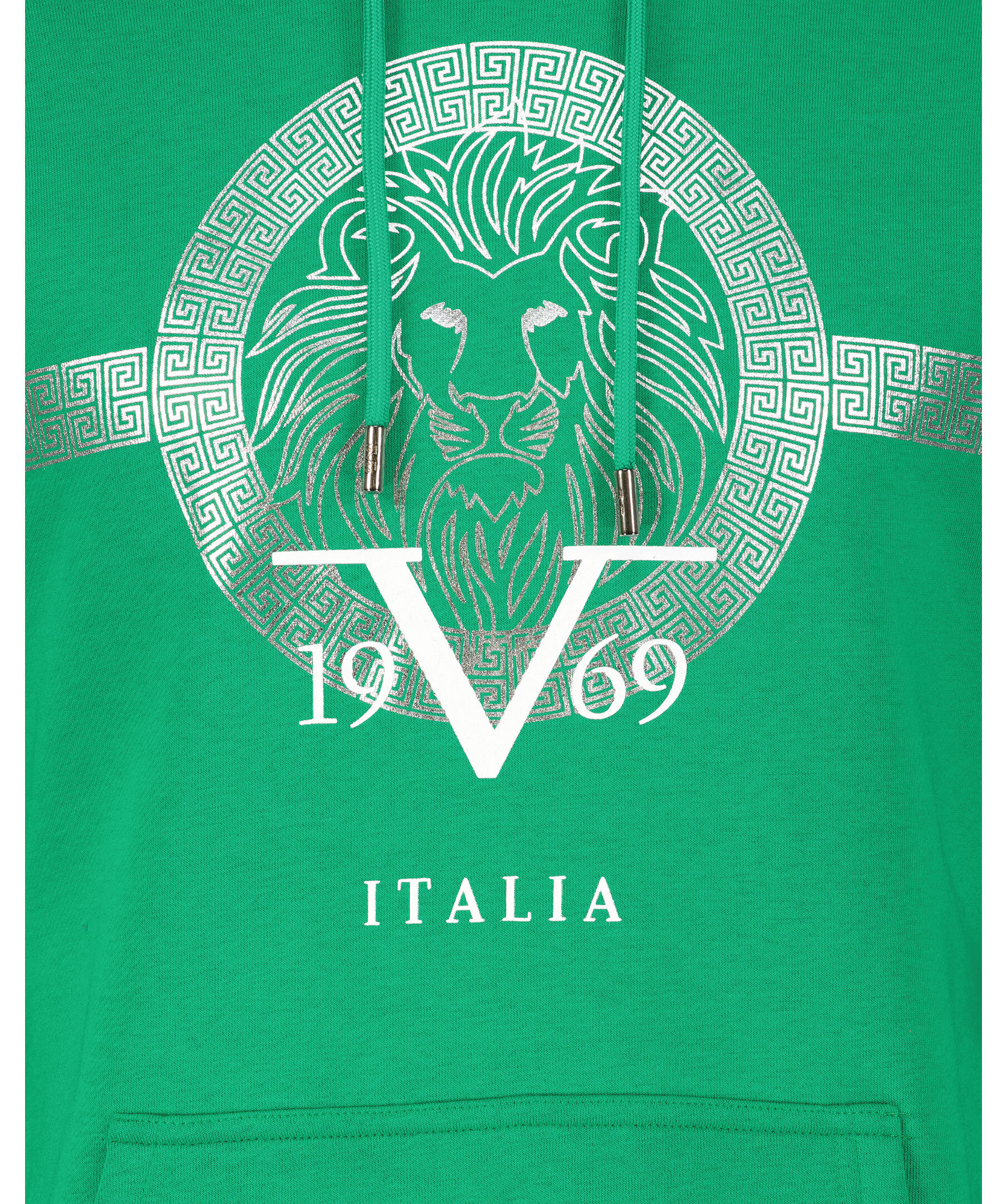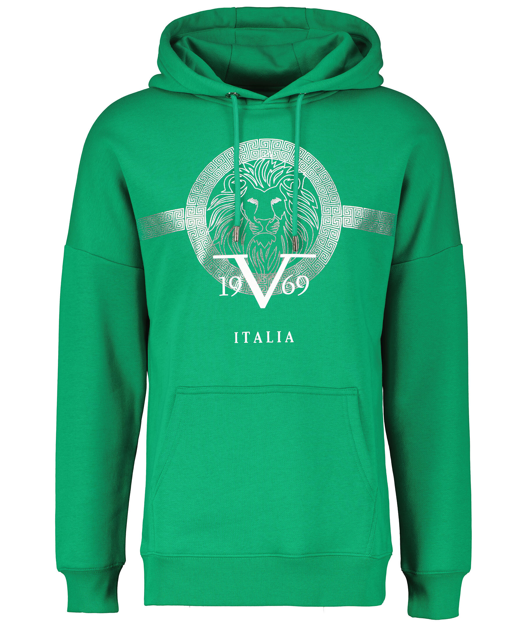 Grön hoodie från 19V69 Italia by Versace. Luva med dragsko. Känguruficka på magen. Ribbstickade muddar vid ärm- och plaggslut. Silverfärgat tryck över bröstet. Borstad insida. Tillverkad i bomullsblandning.