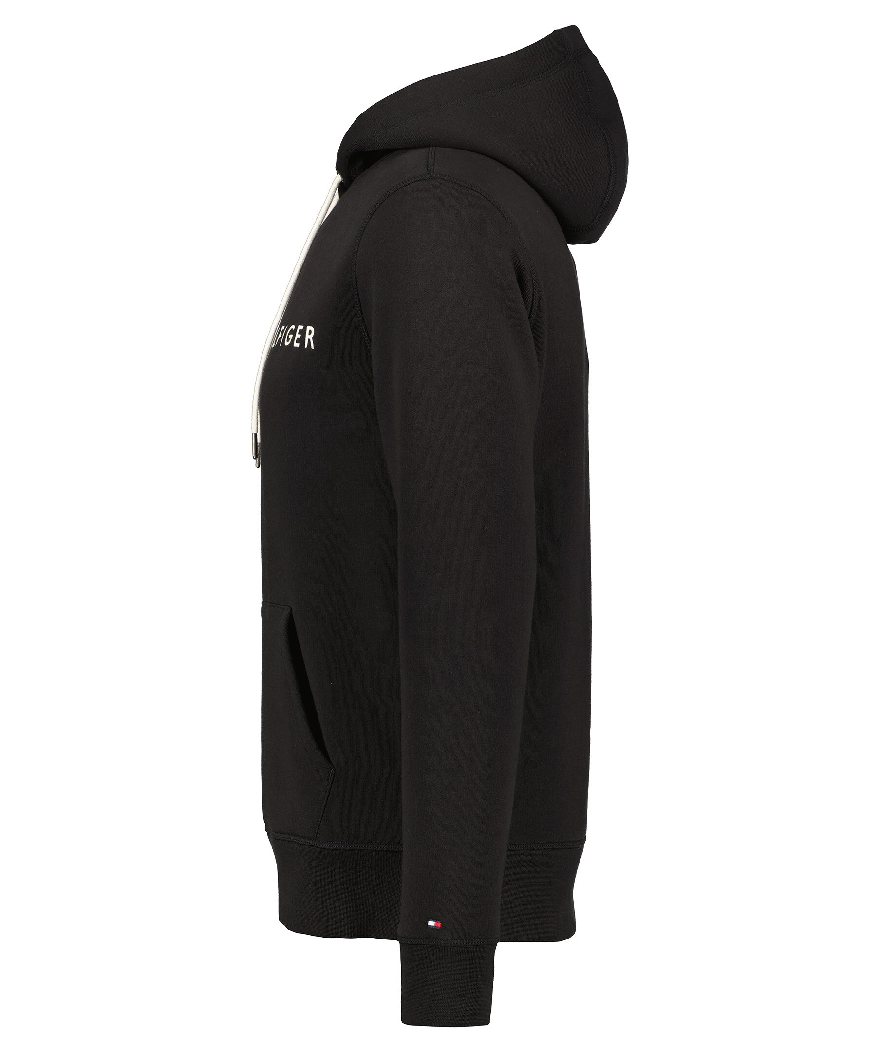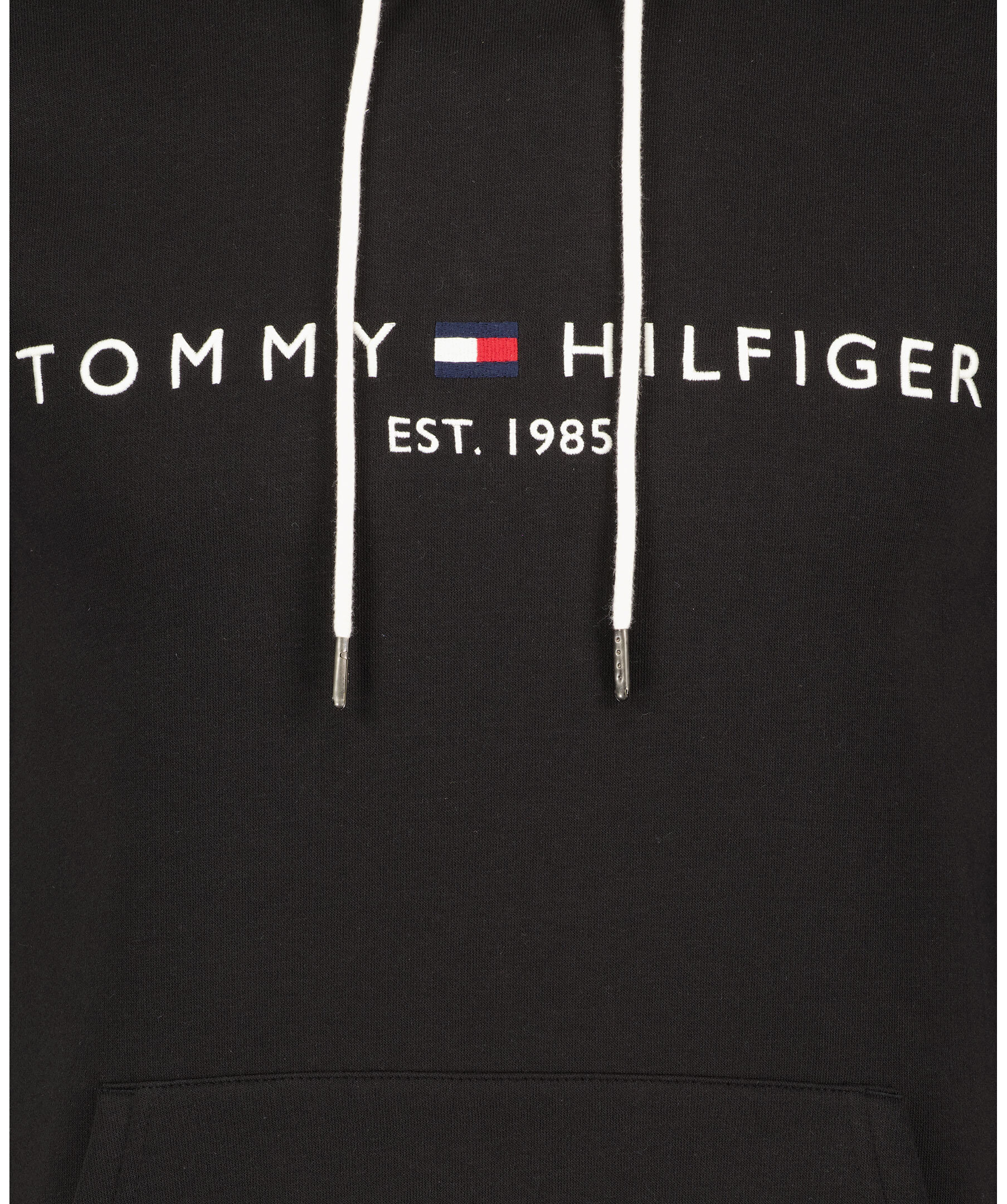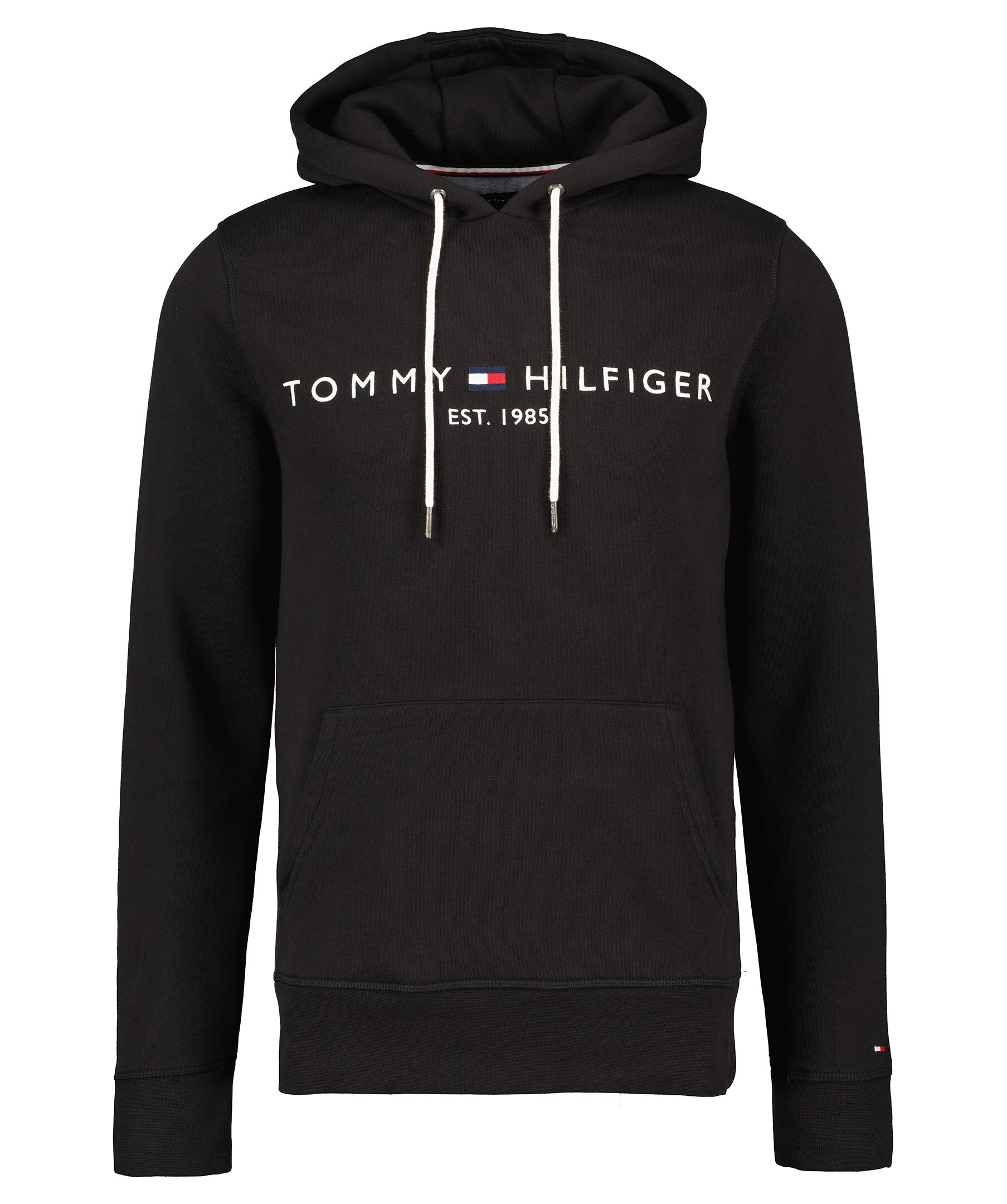 Svart hoodie med vit snörning i luvan från Tommy Hilfiger. Tillverkad i bomullsmix och har en mjuk, borstad insida. Vit, broderad logga på bröstet, känguruficka och ribbade muddar.