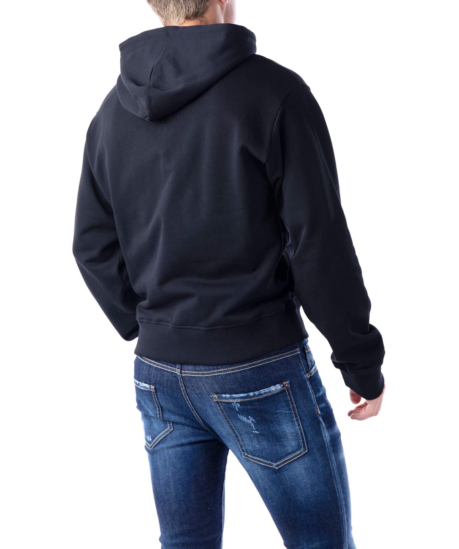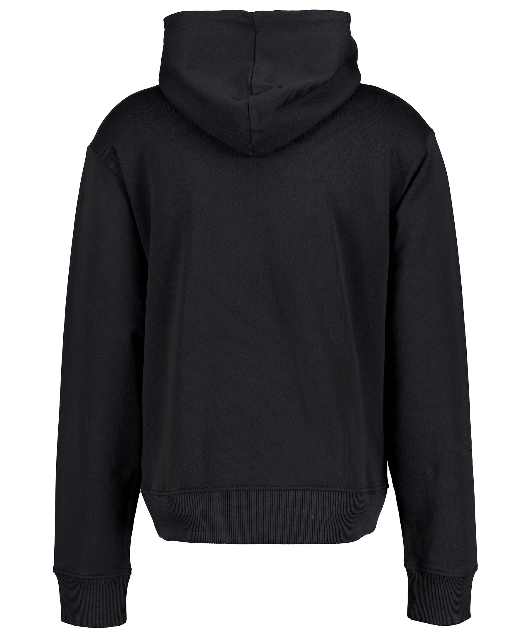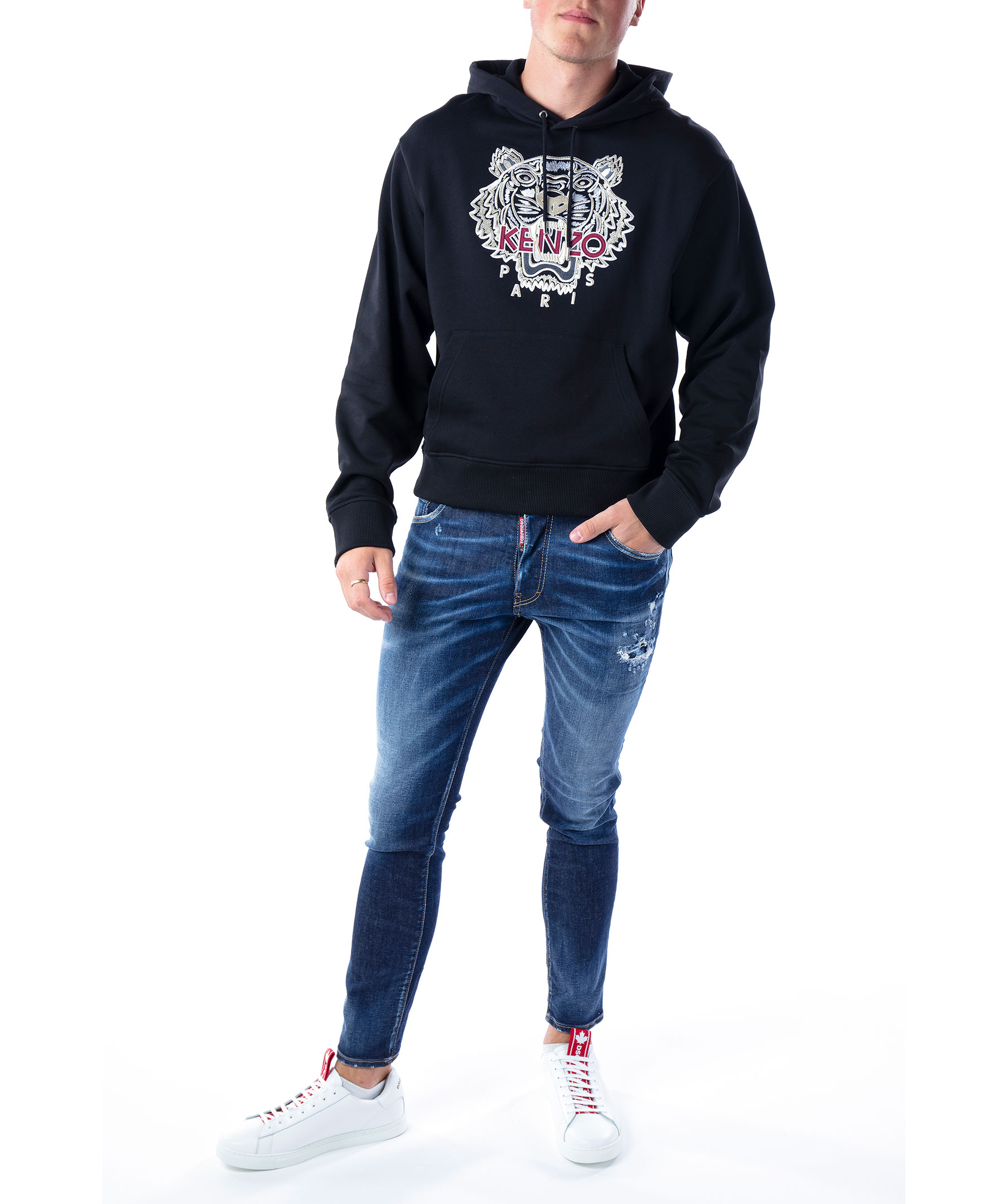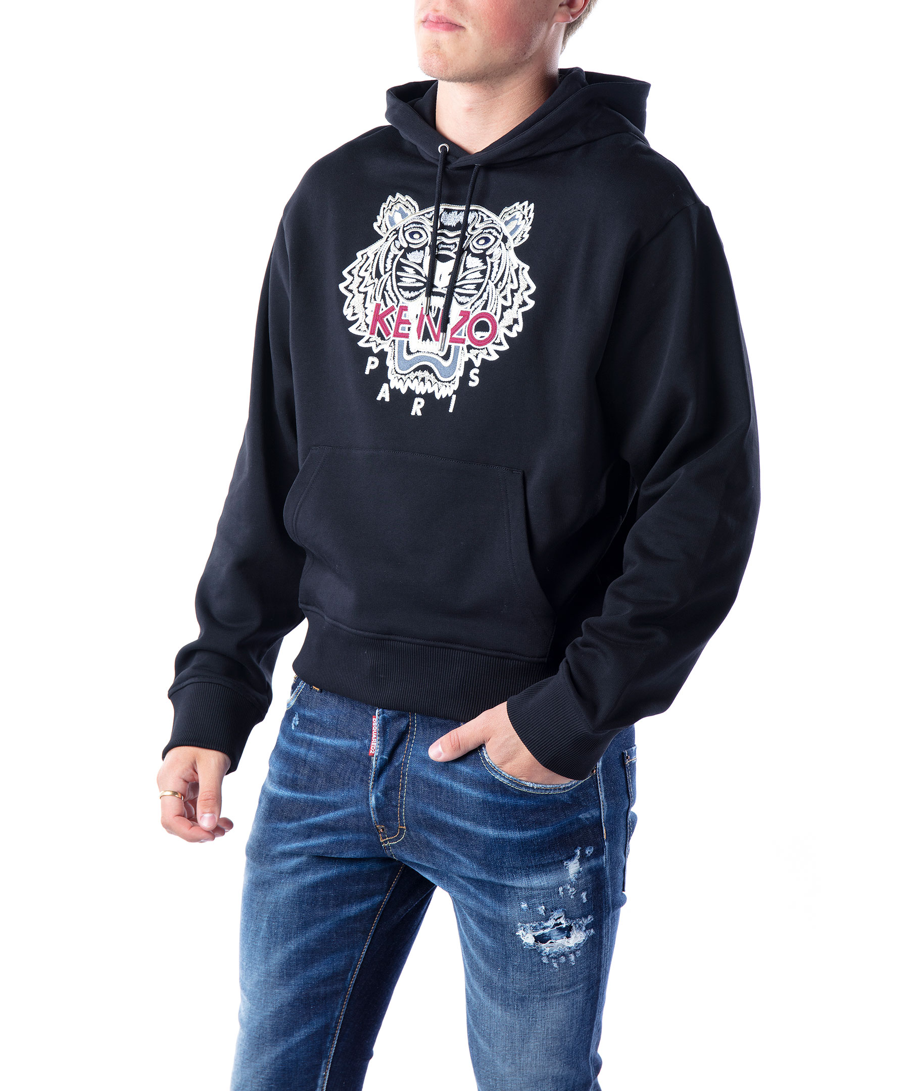 Svart hoodie i 100% bomull från Kenzo. Broderad, ikonisk tiger i vitt, grått och vinrött över bröstet. Luva med snörning, muddar i ärmslut och plaggslut samt ficka på magen. Modellen är 190 cm lång och bär storlek M.