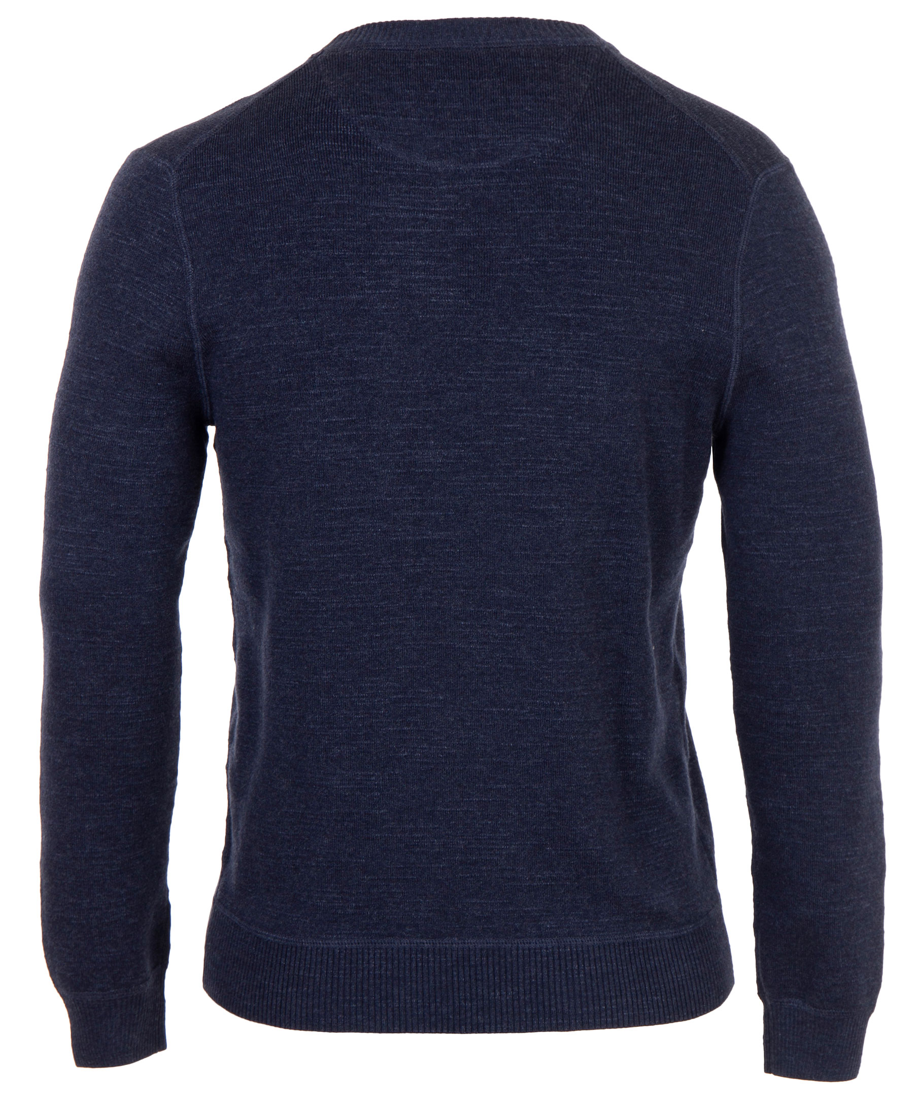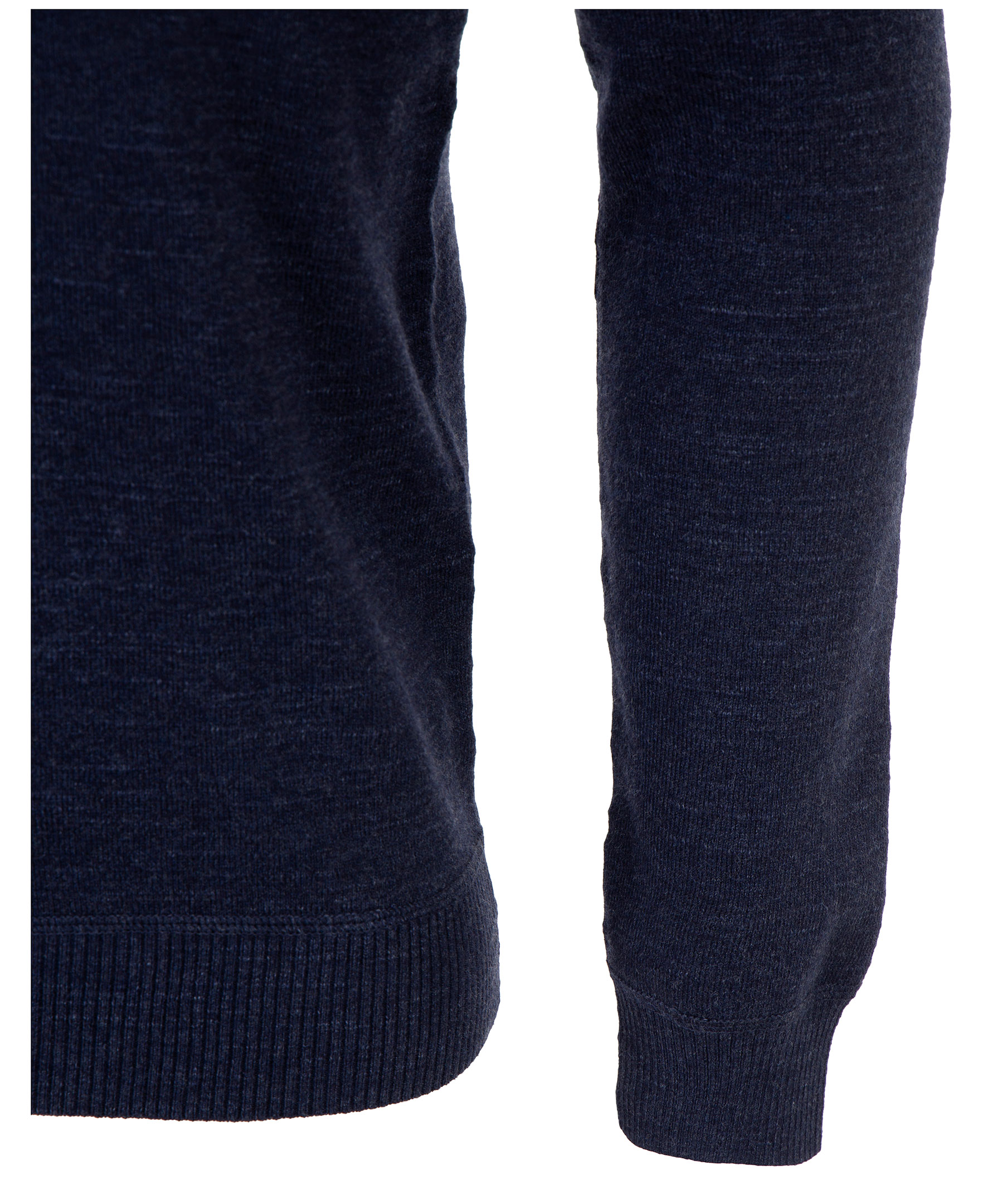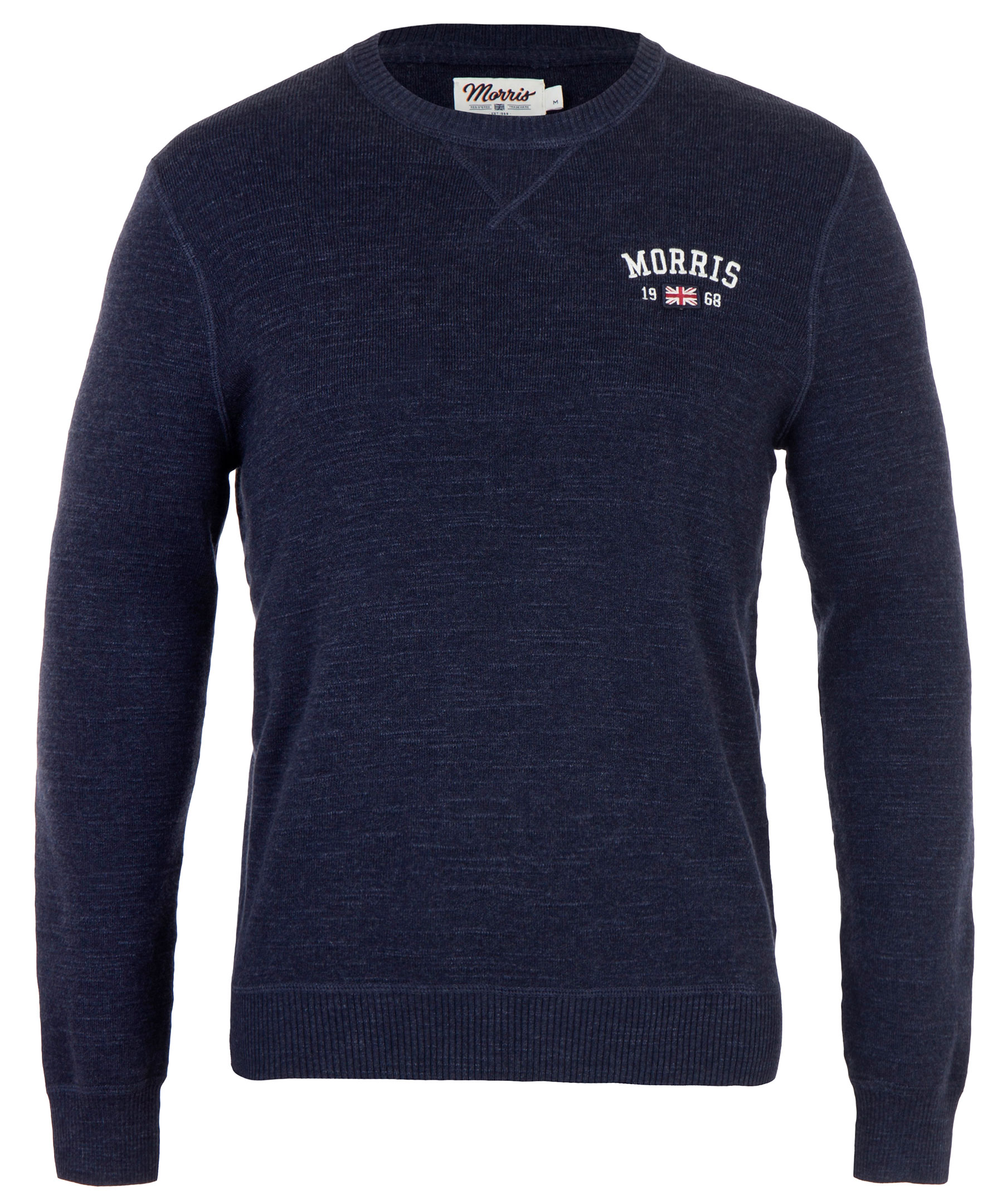 Mörkblå finstickad tröja i bomull från Morris. Rundad hals och ribbade muddar i ärmslut, runt ringning och i midjan. Broderad logotyp över vänster bröst.