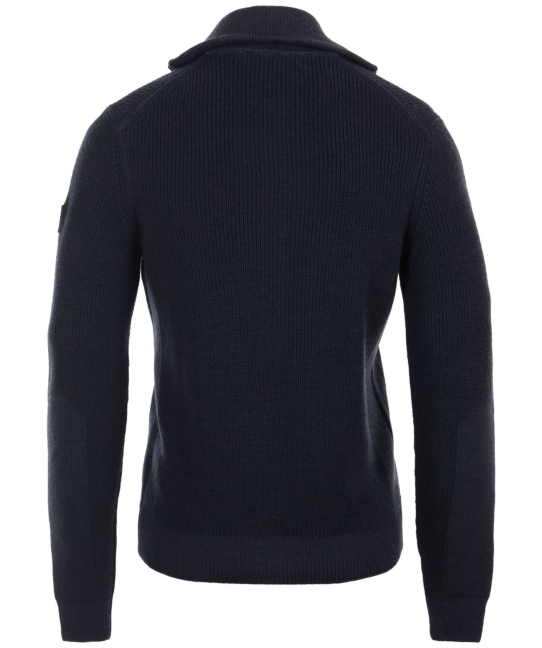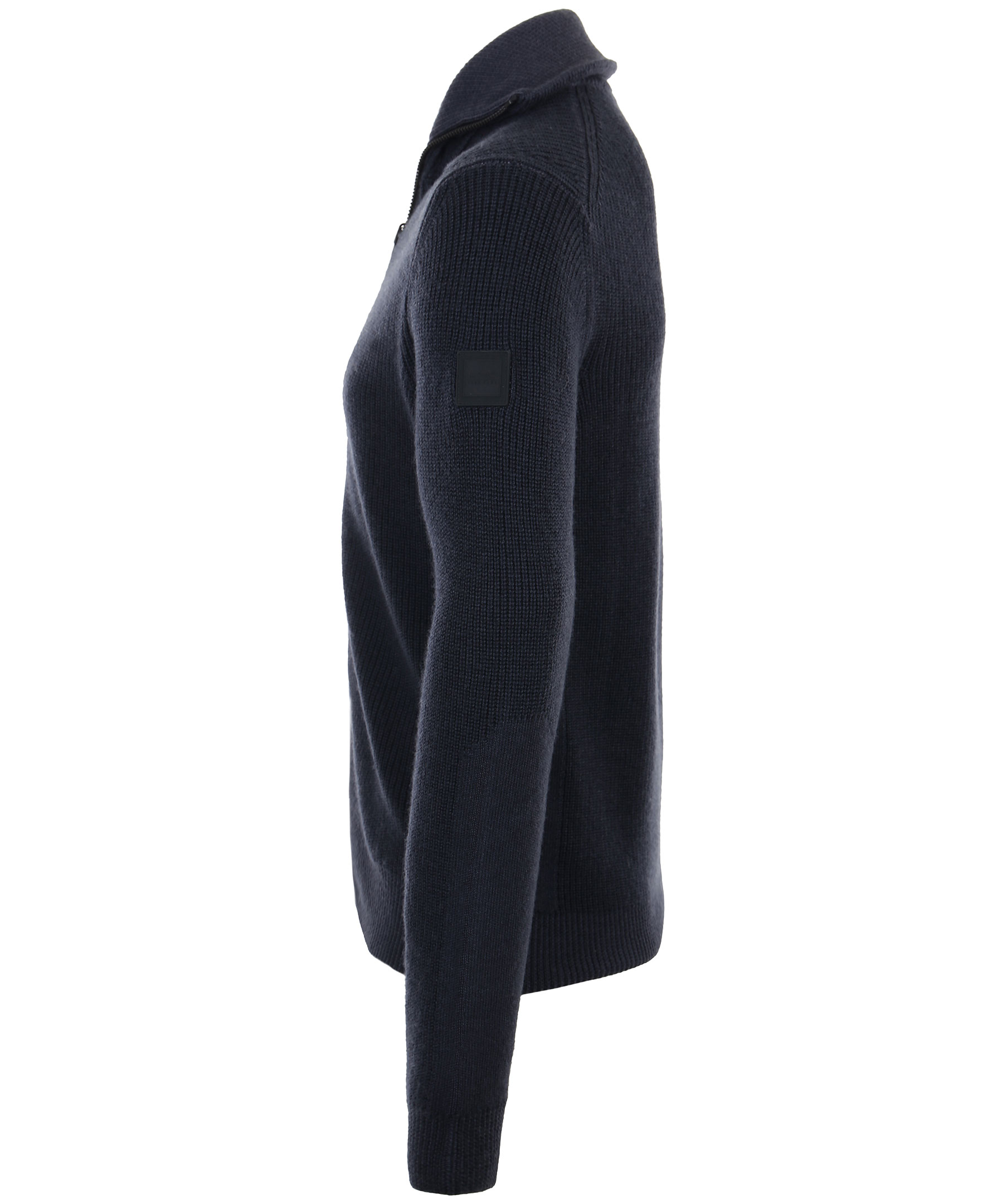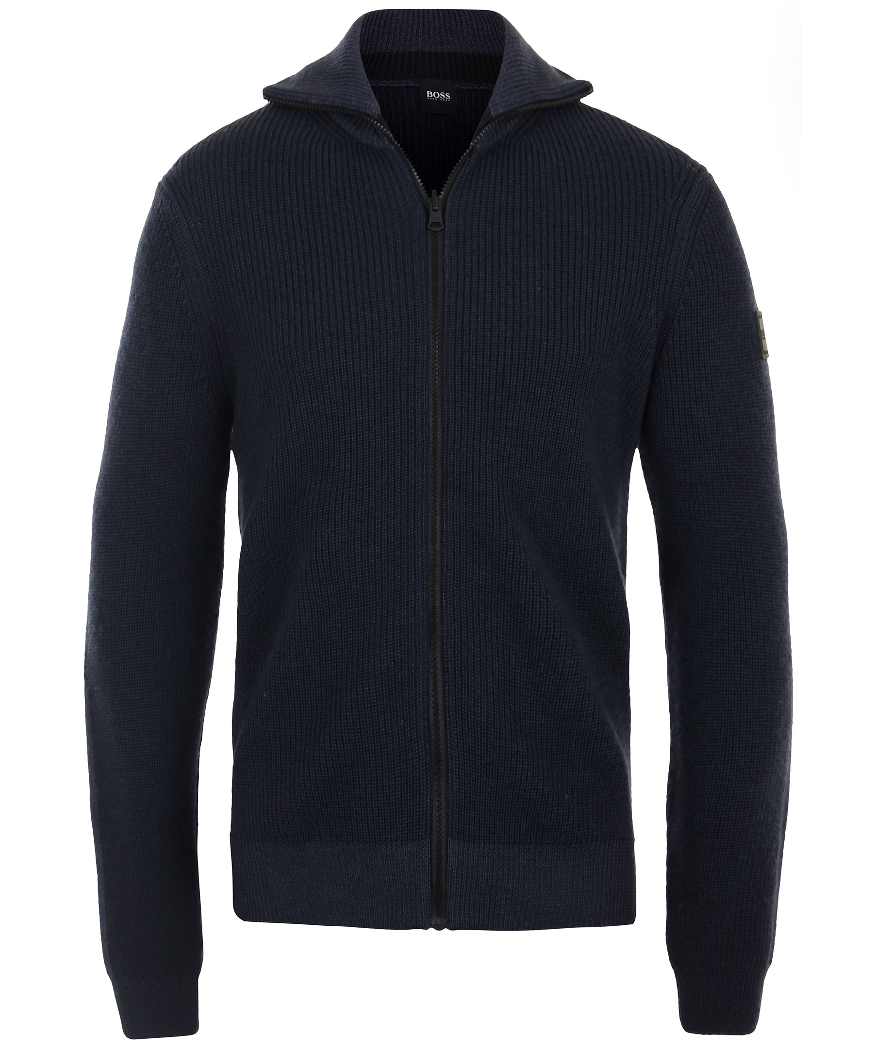 Stickad tröja med hög krage från Boss Casual. Stängs med dragkedja. Applicerad logotyp på vänster ärm och ribbade muddar i ringning, ärmslut och plaggslut. Tillverkad i 100% ull.