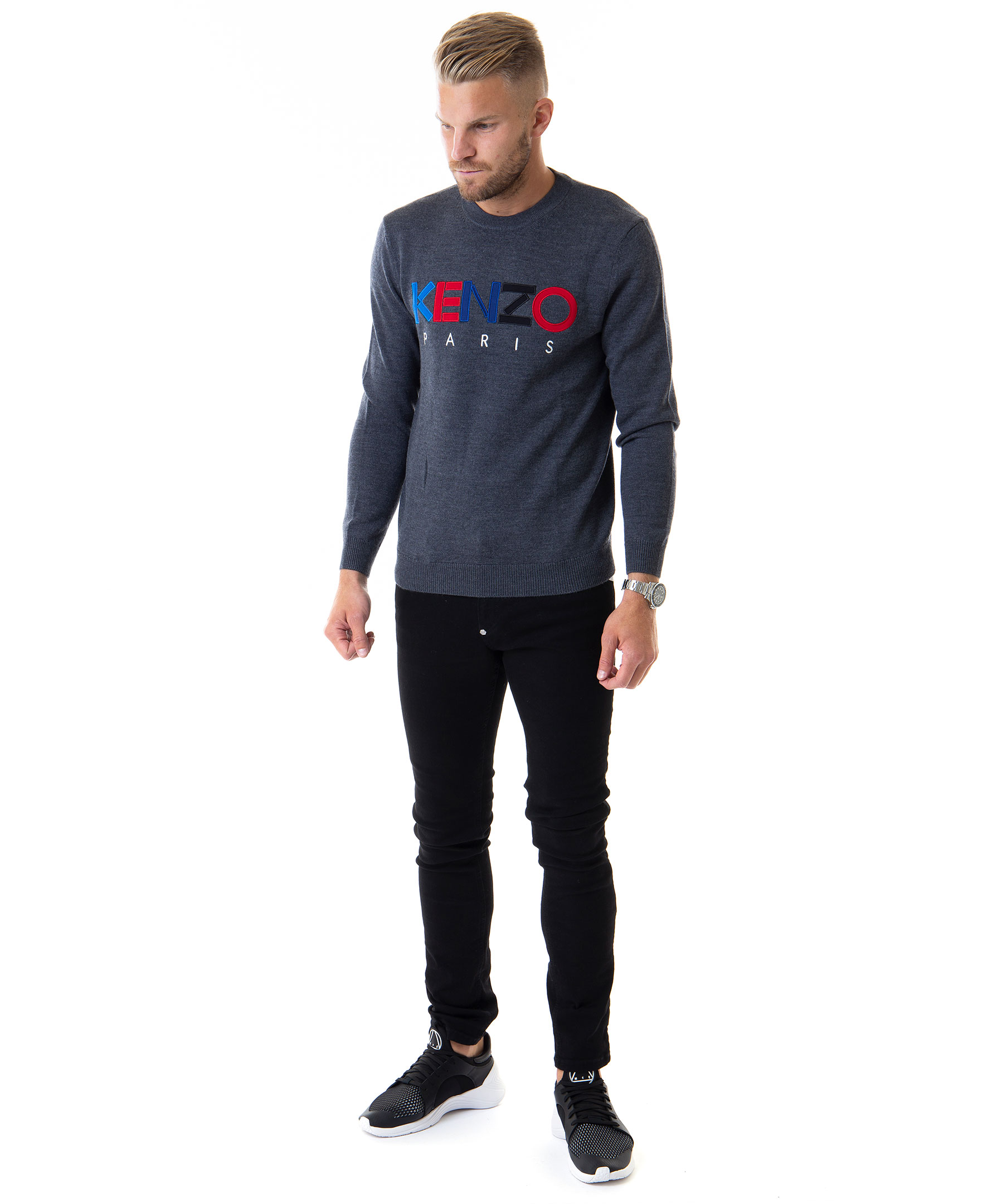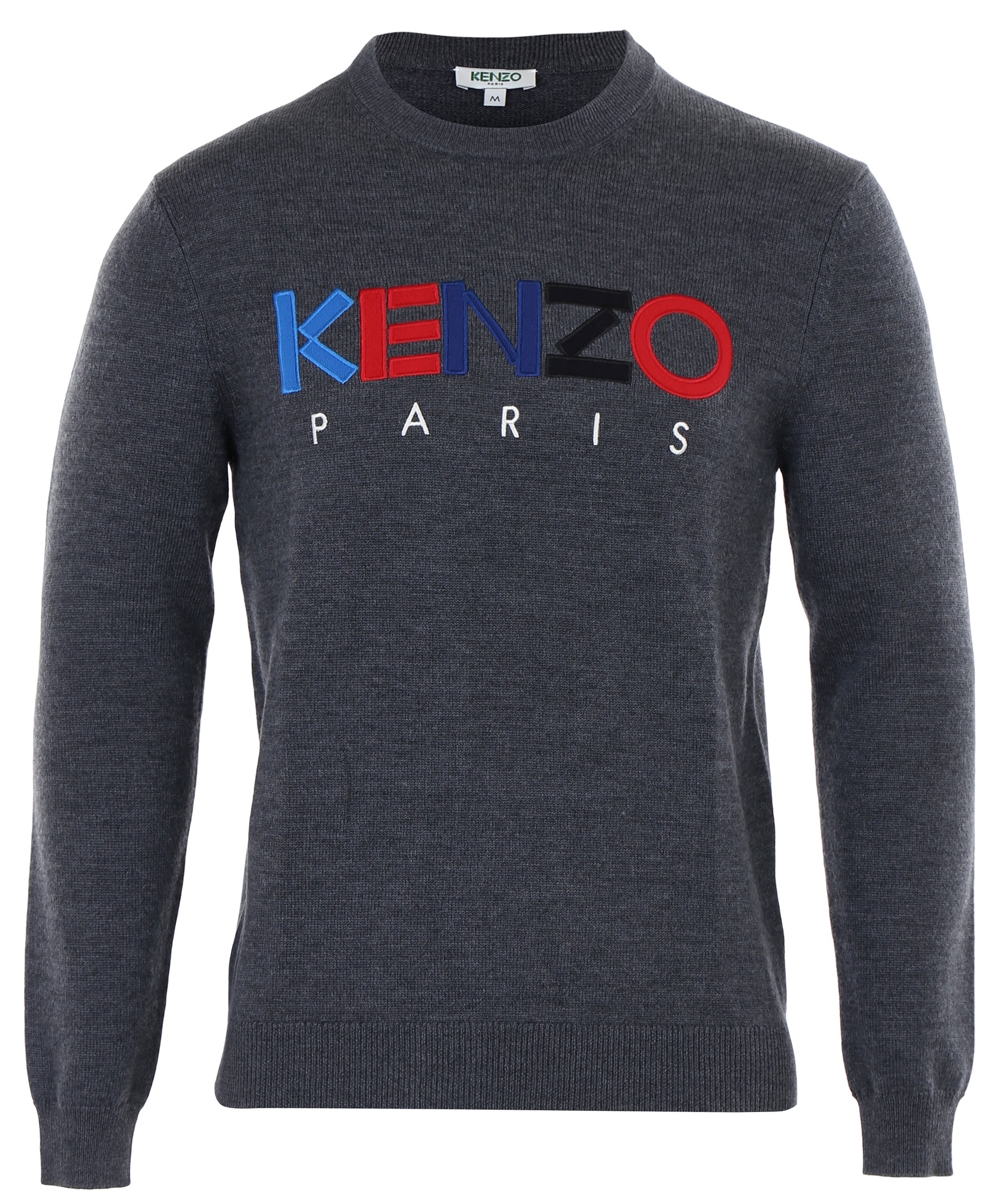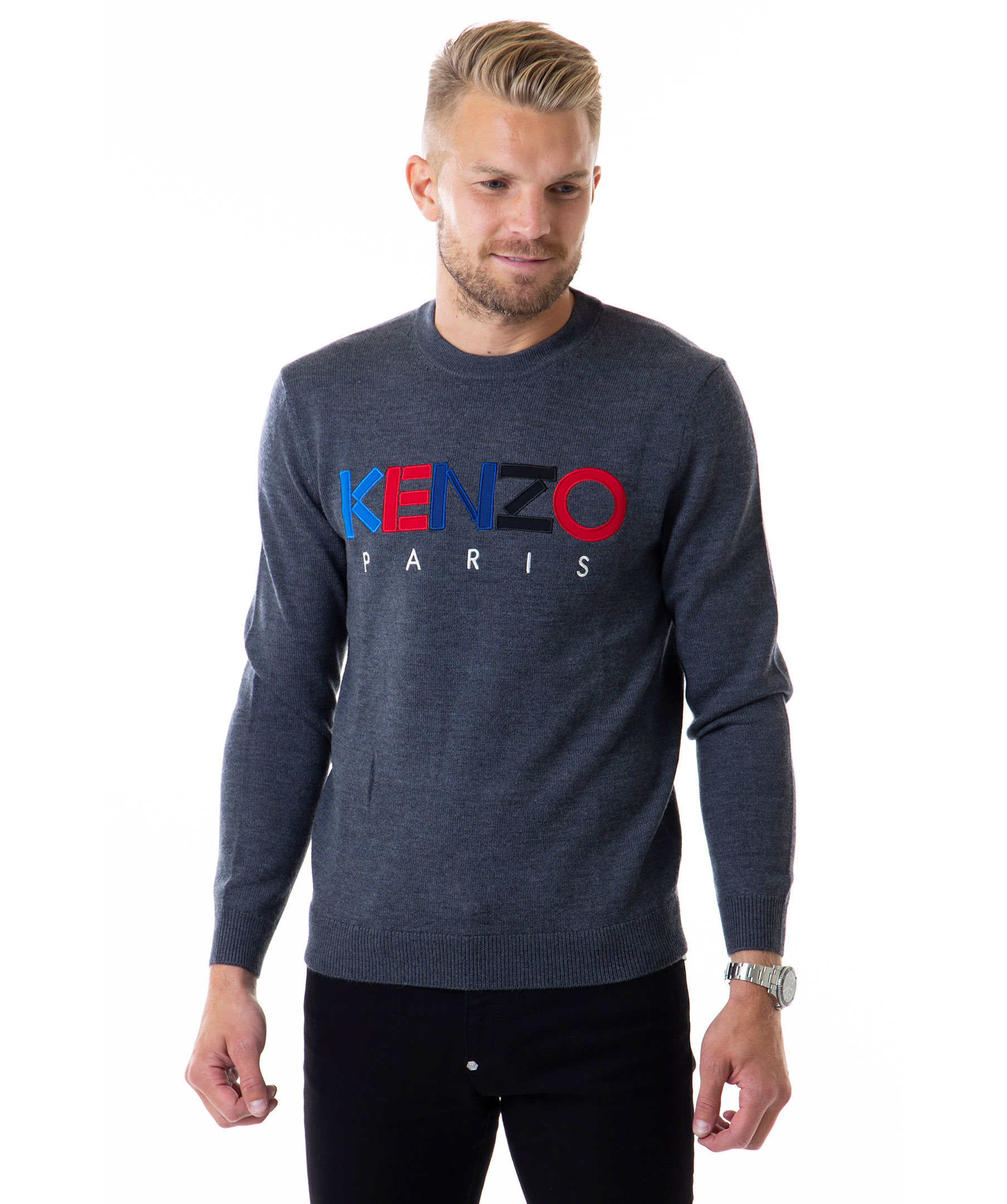 Grå finstickad tröja med brodyr från Kenzo. Broderad färgad logotyp mitt på bröstet. Ribbade muddar på ärmslut och plaggslut. Rundad halsringning. Modellen är 188 cm lång och bär storlek M.