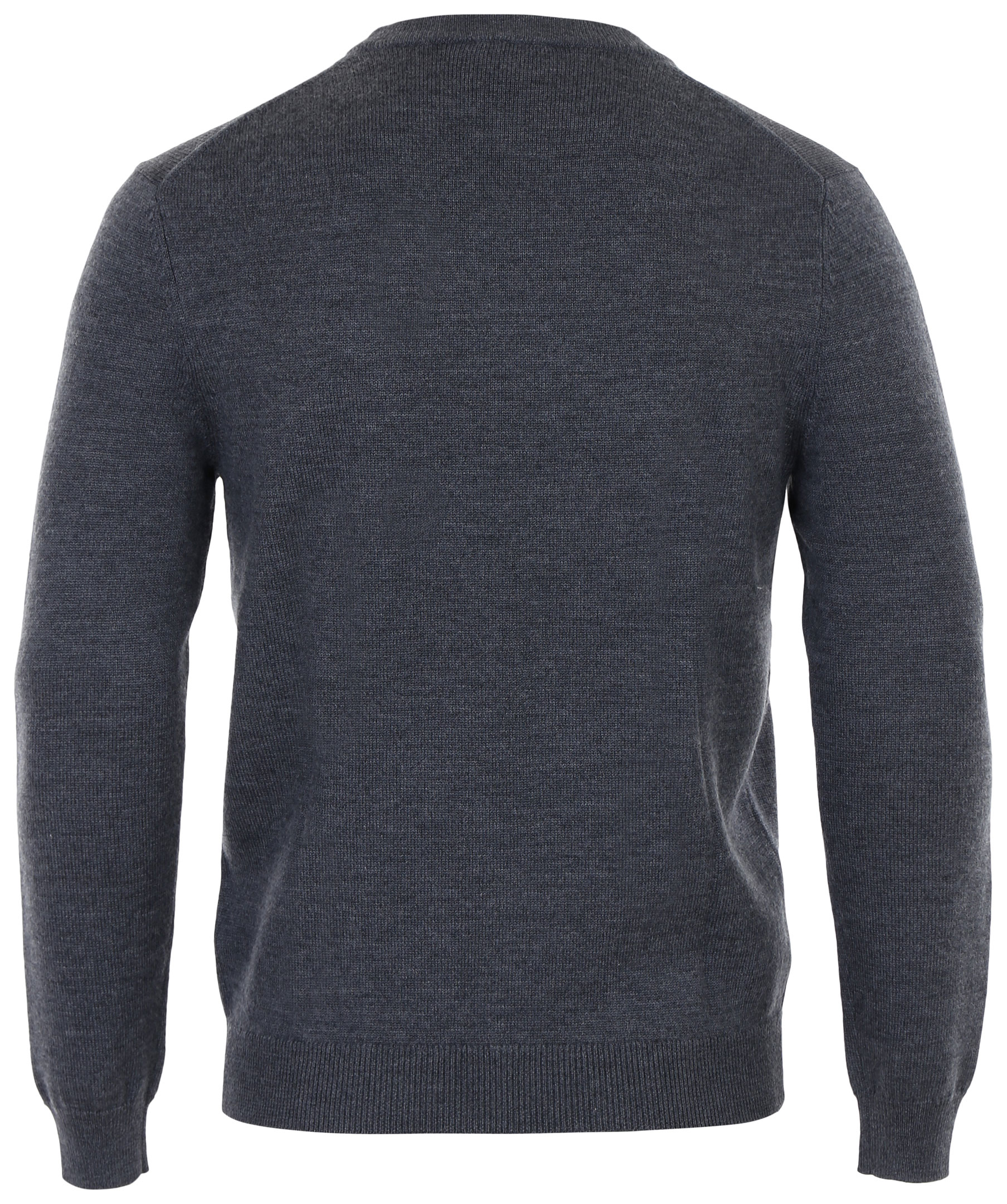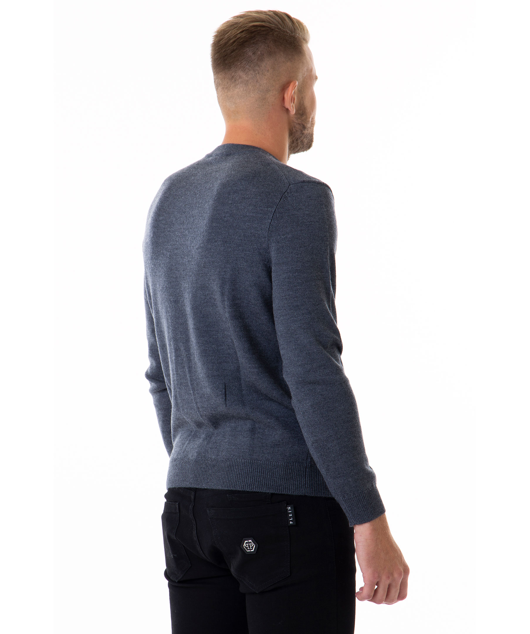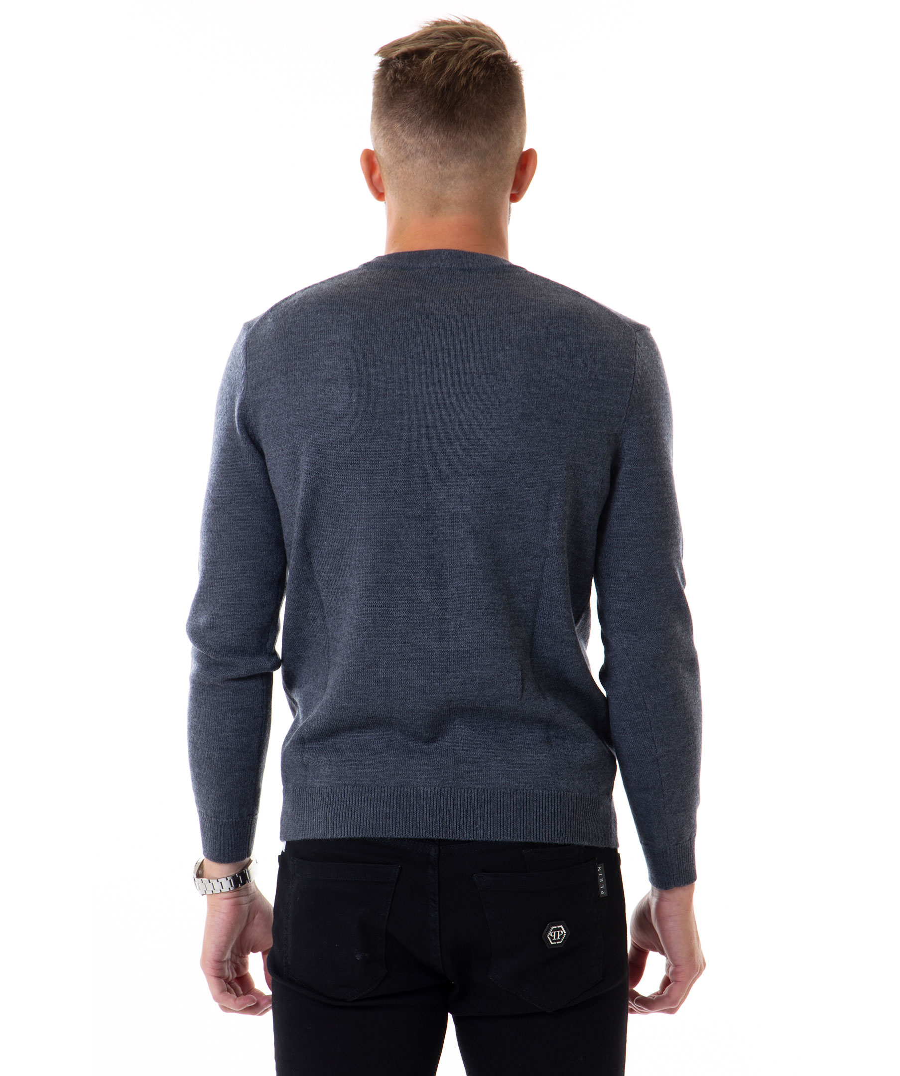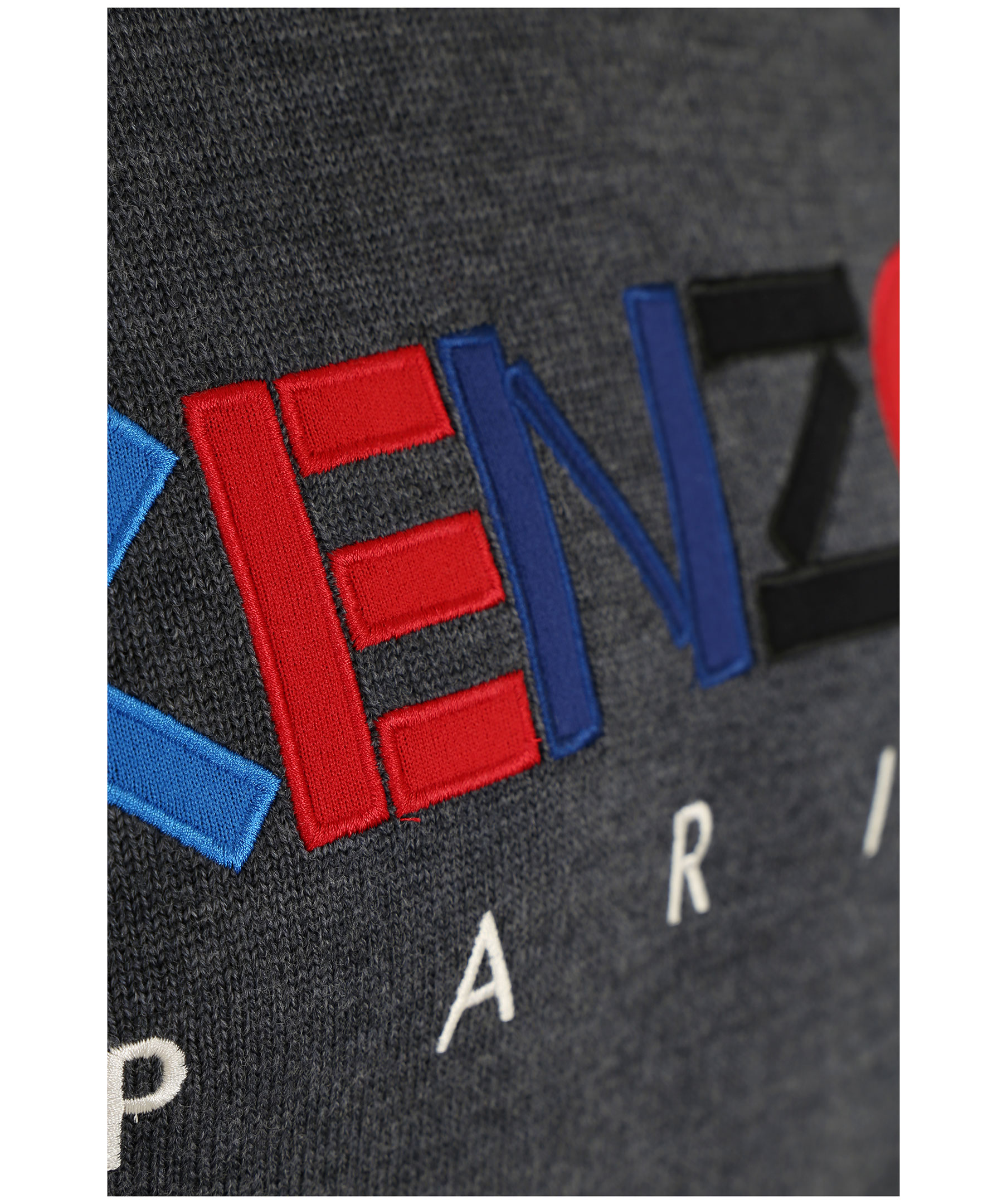 Grå finstickad tröja med brodyr från Kenzo. Broderad färgad logotyp mitt på bröstet. Ribbade muddar på ärmslut och plaggslut. Rundad halsringning. Modellen är 188 cm lång och bär storlek M.