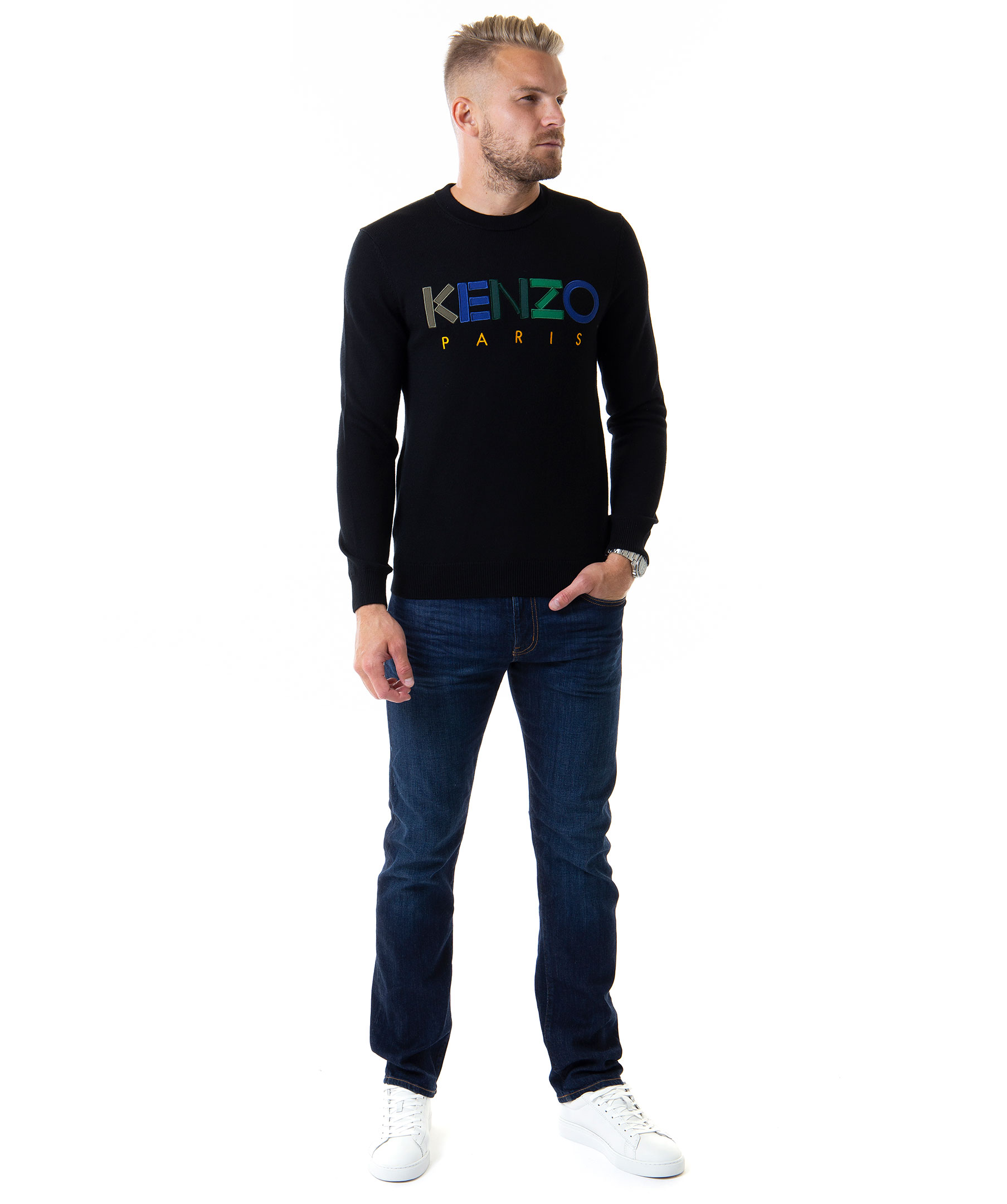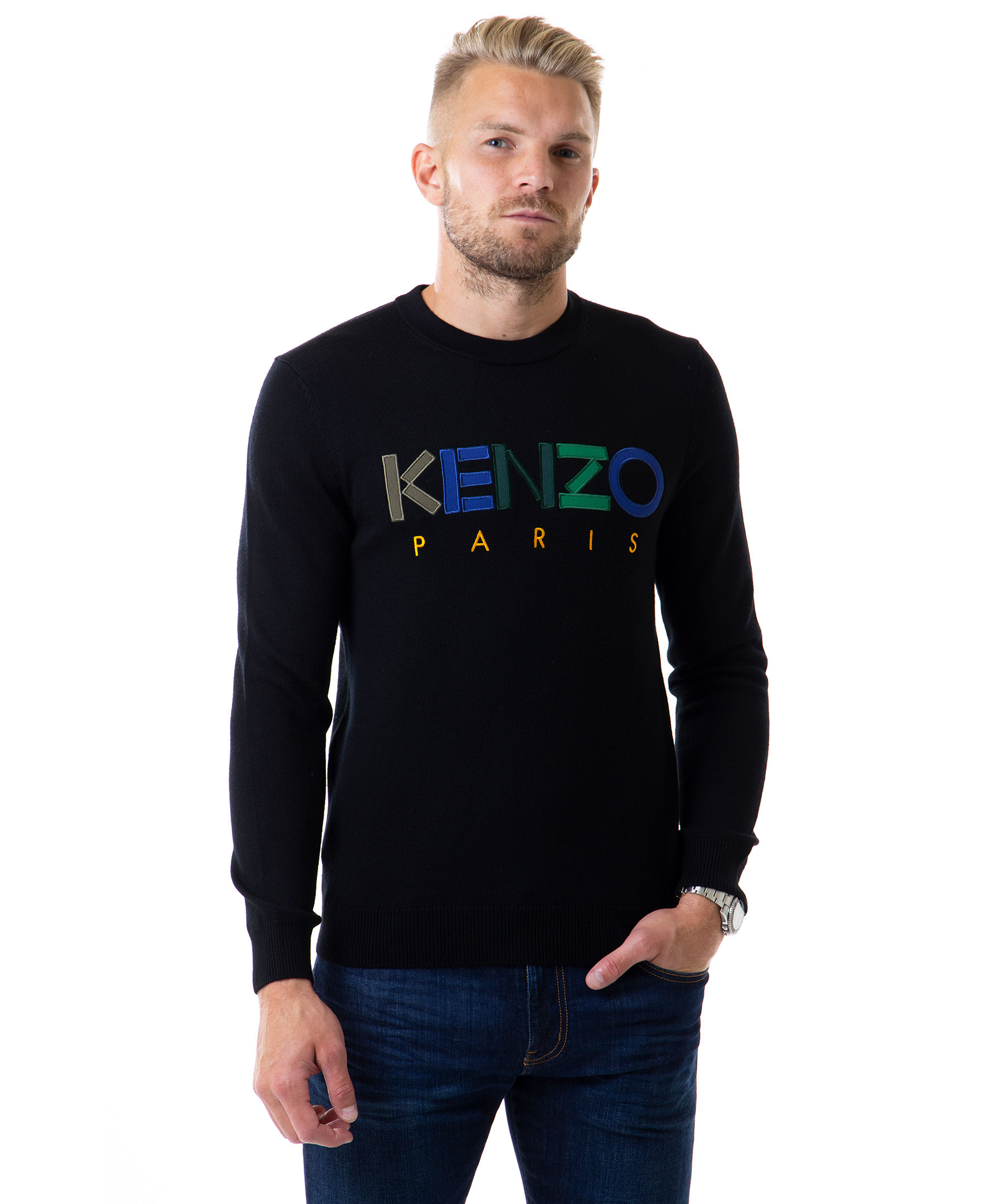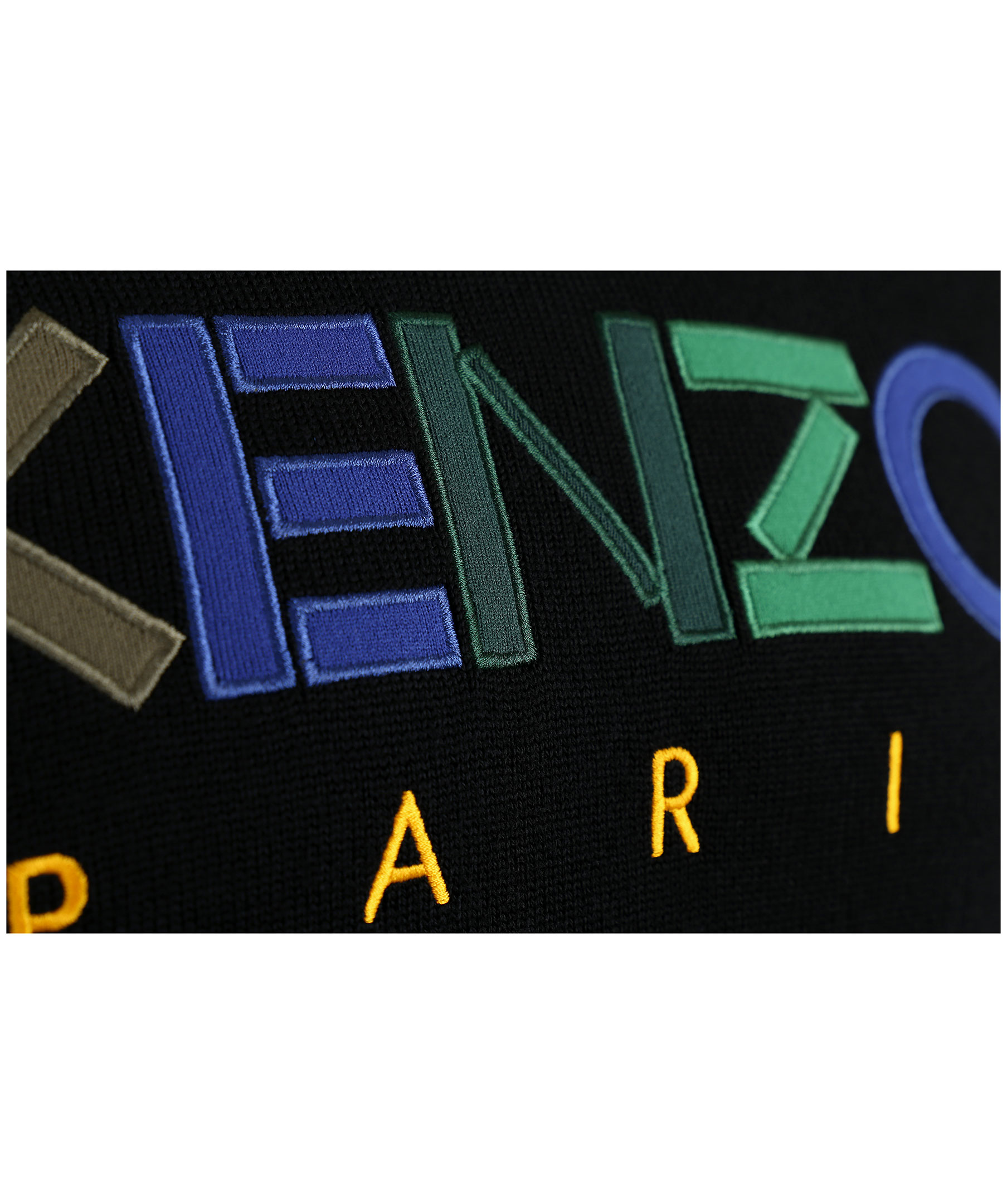 Svart stickad tröja i 100% ull från Kenzo. Stor färgglad brodyr på bröstet, rundad hals och ribbstickade muddar. Modellen är 188 cm lång och bär storlek M.