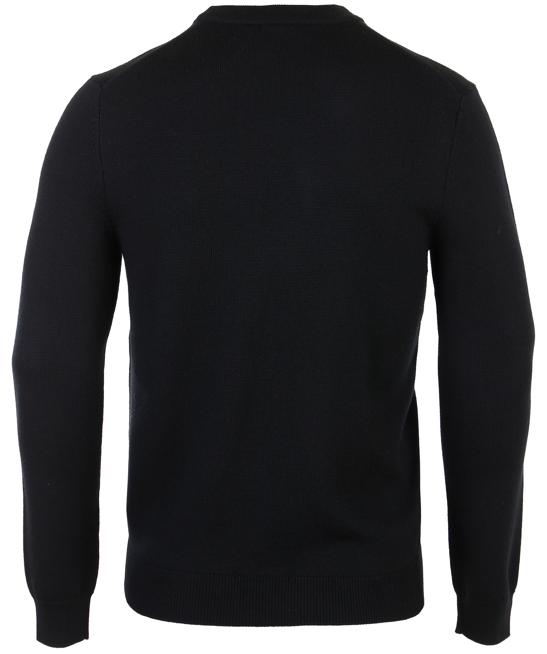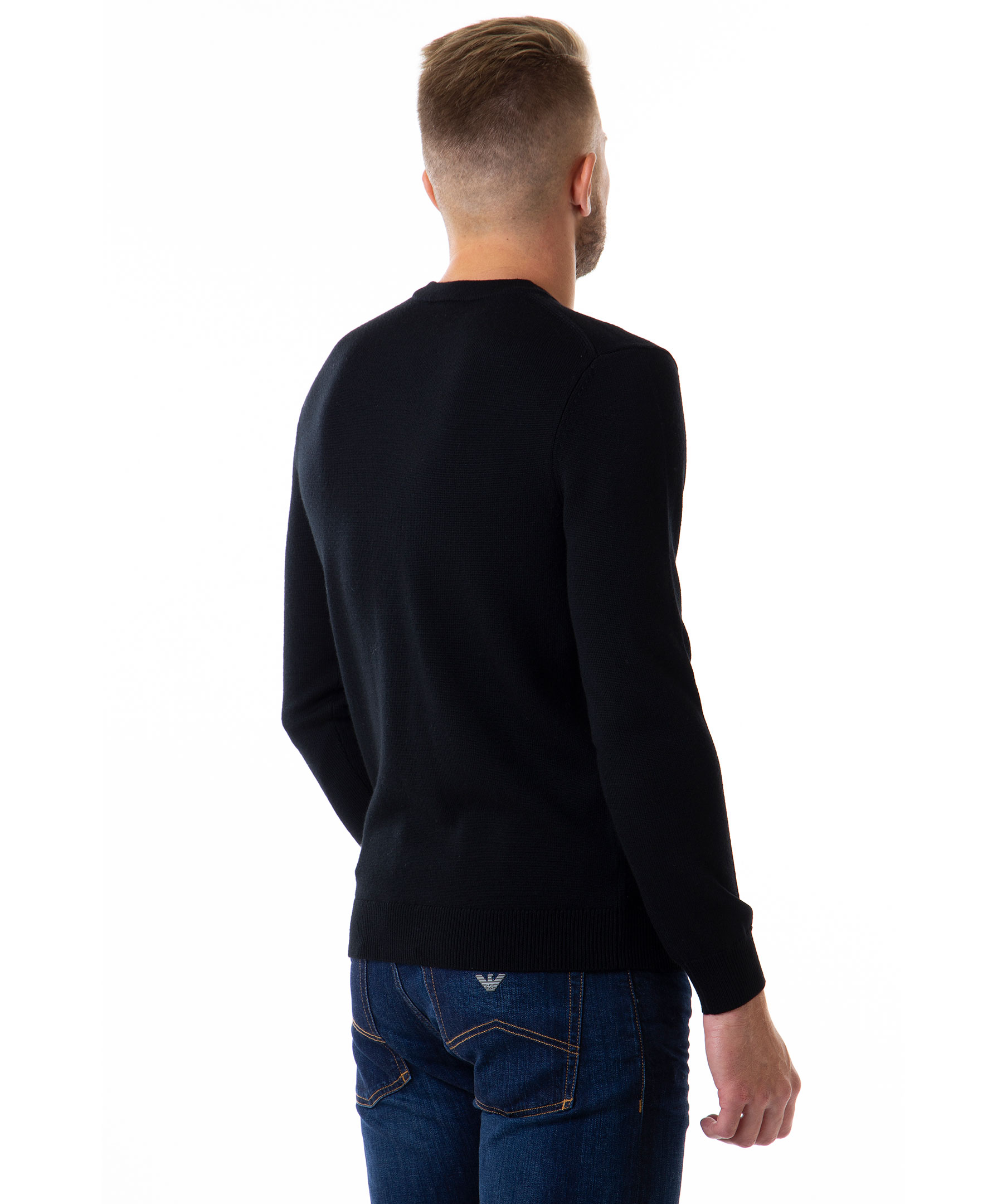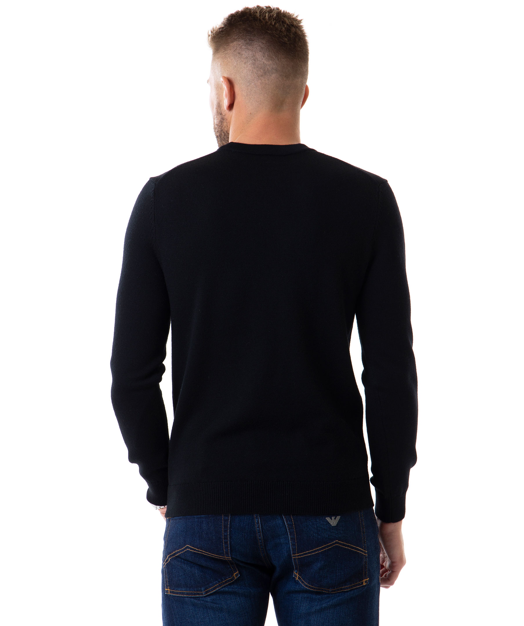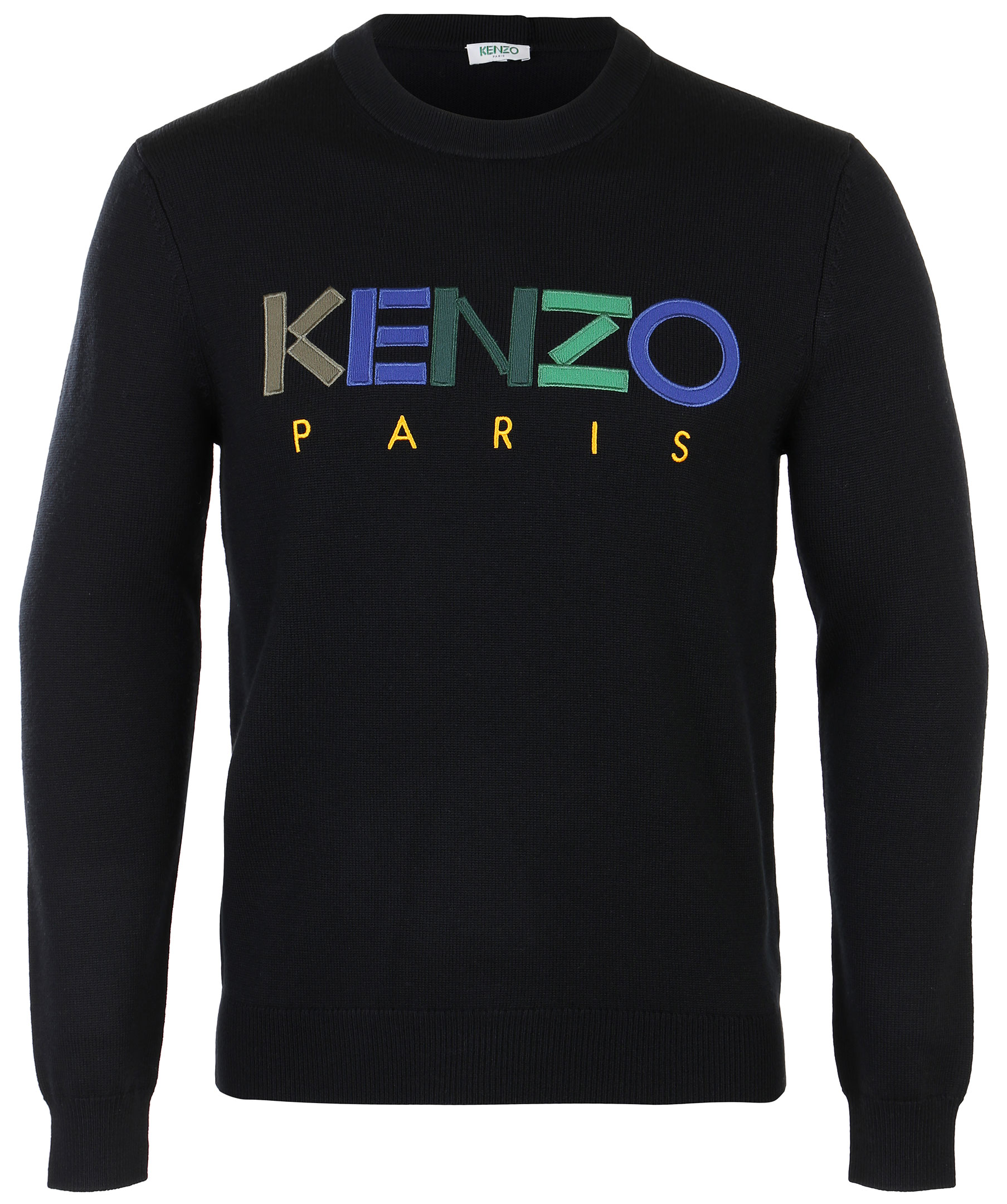 Svart stickad tröja i 100% ull från Kenzo. Stor färgglad brodyr på bröstet, rundad hals och ribbstickade muddar. Modellen är 188 cm lång och bär storlek M.
