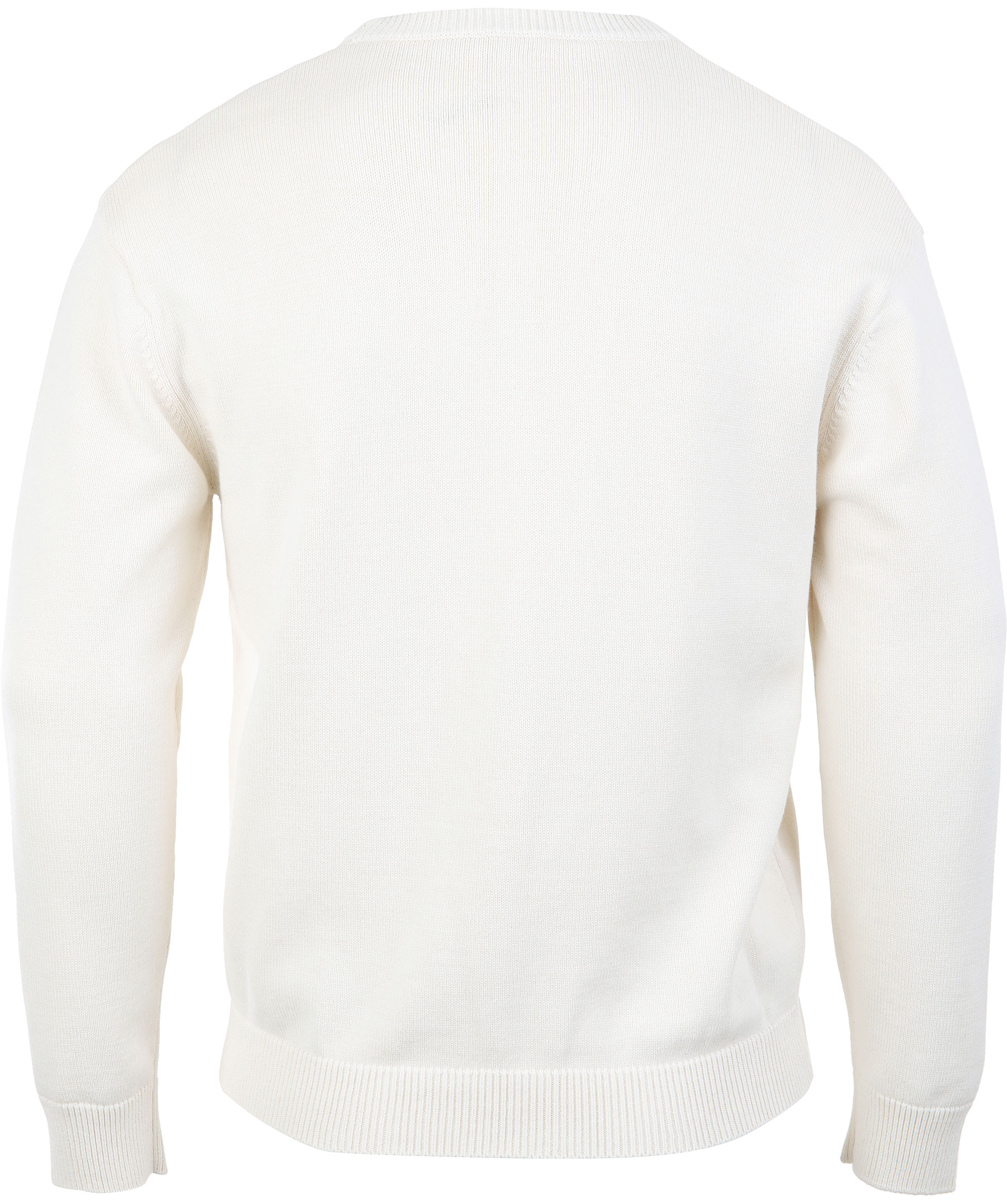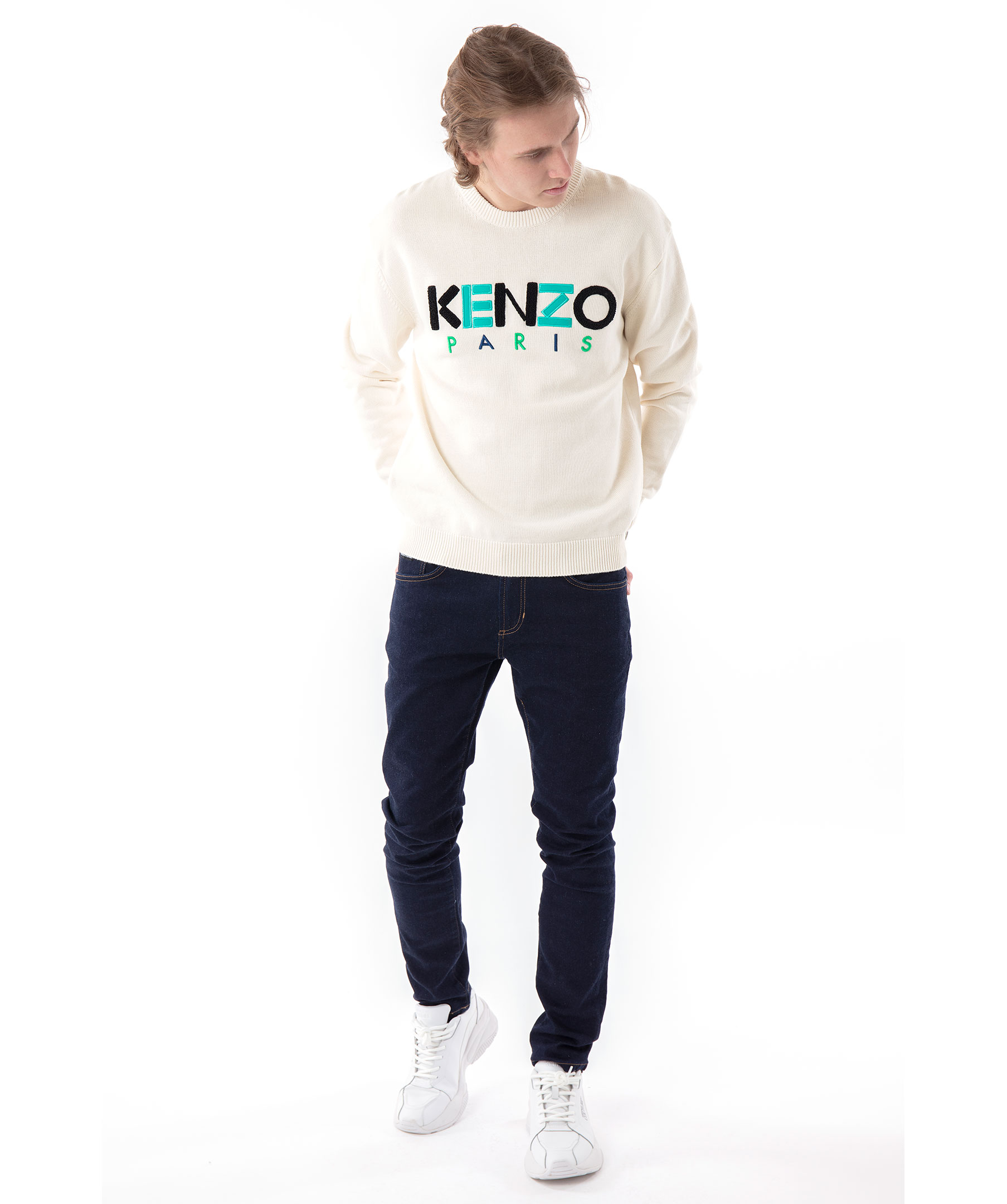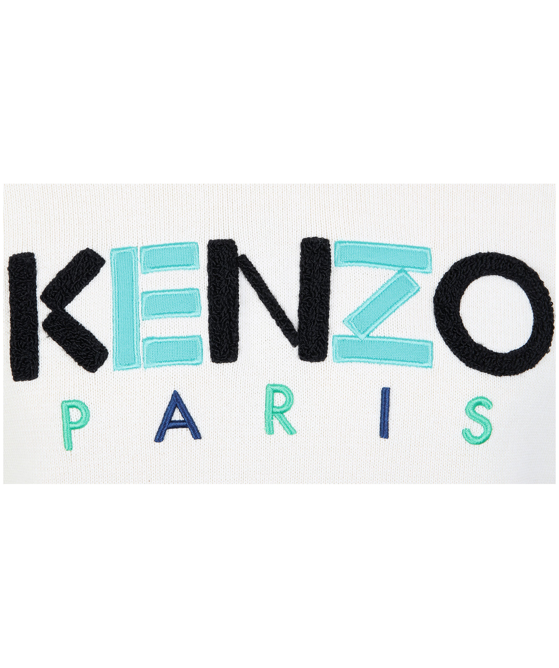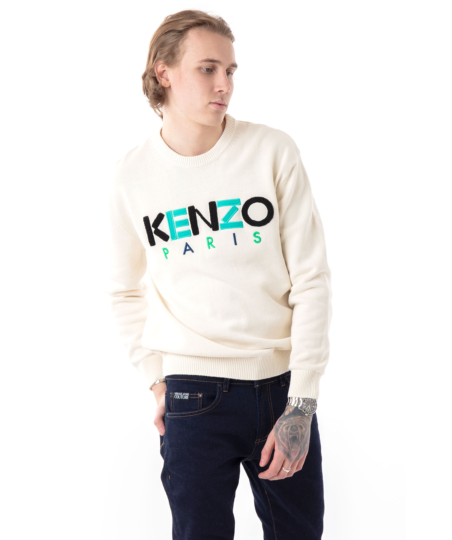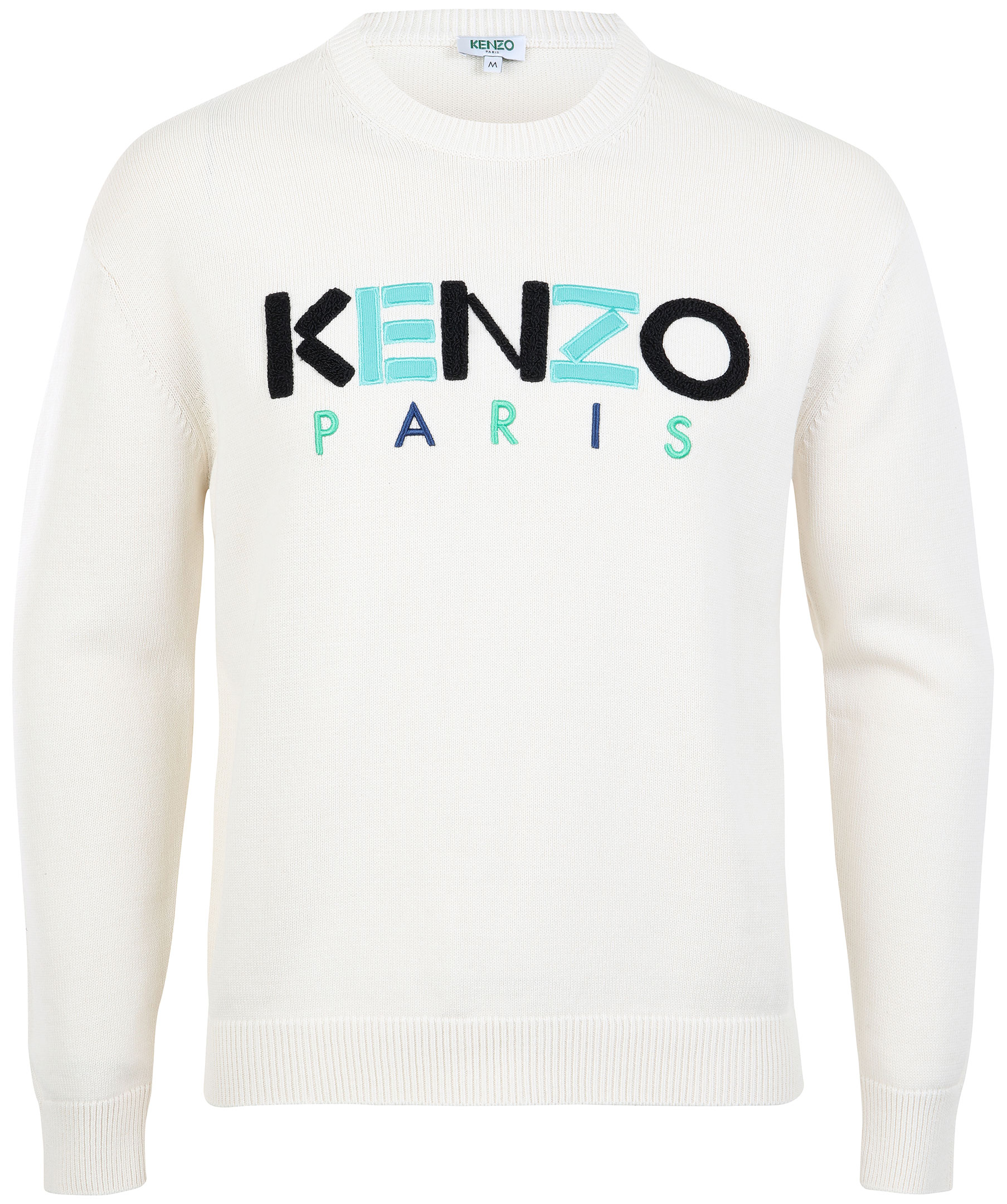 Gräddvit finstickad sweatshirt från Kenzo. Tillverkad i kraftig bomull. Stor logotyp överbröstet med brodyr och tygapplikation. Ribbstickade muddar. Modellen är 180 cm lång och bär storlek M.