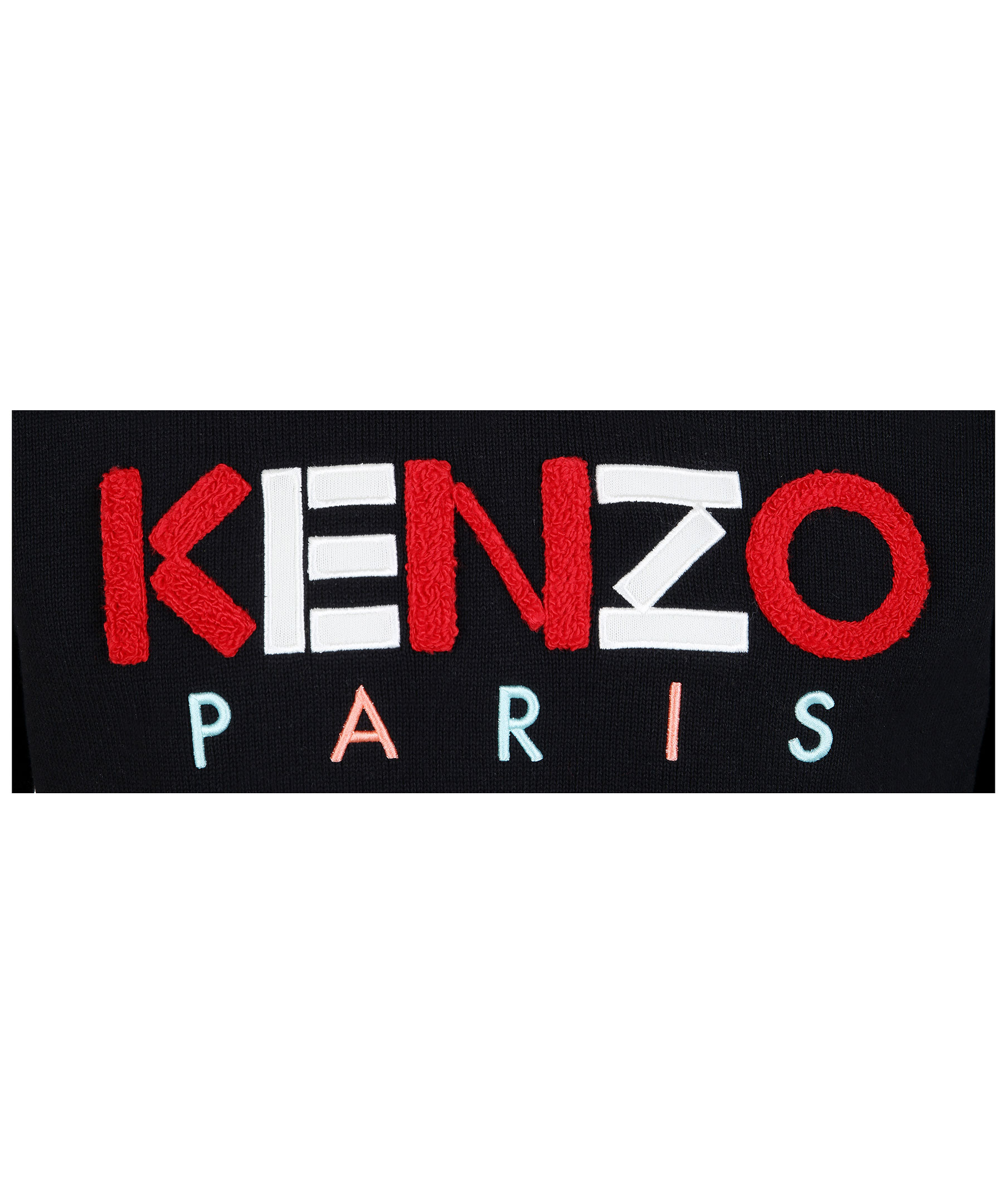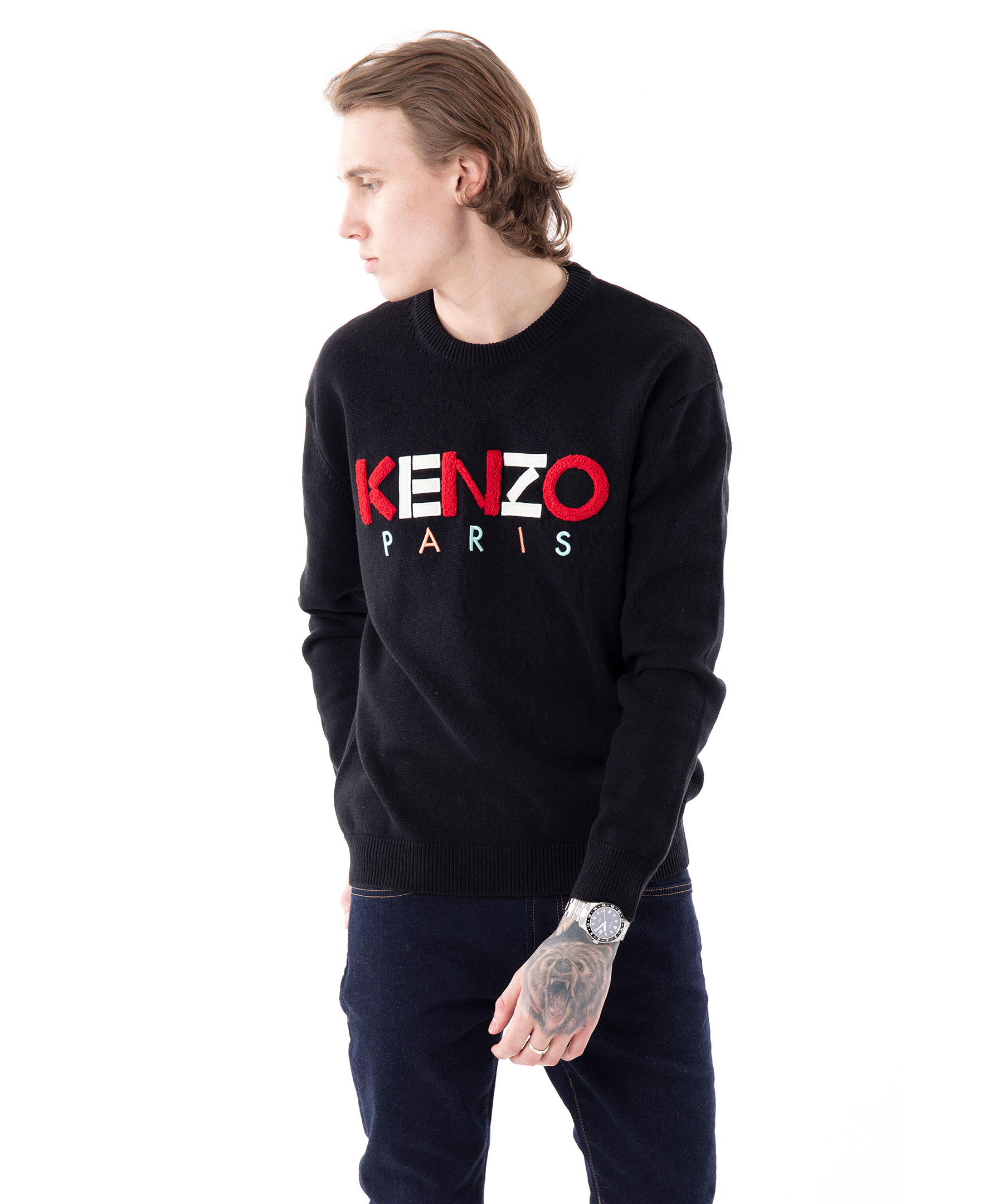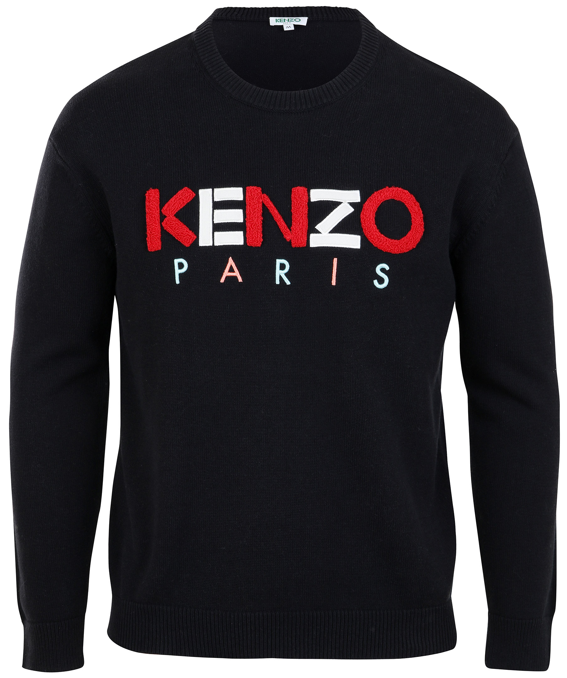 Svart finstickad sweatshirt från Kenzo. Tillverkad i kraftig bomull. Stor logotyp överbröstet med brodyr och tygapplikation. Ribbstickade muddar. Modellen är 180 cm lång och bär storlek M.
