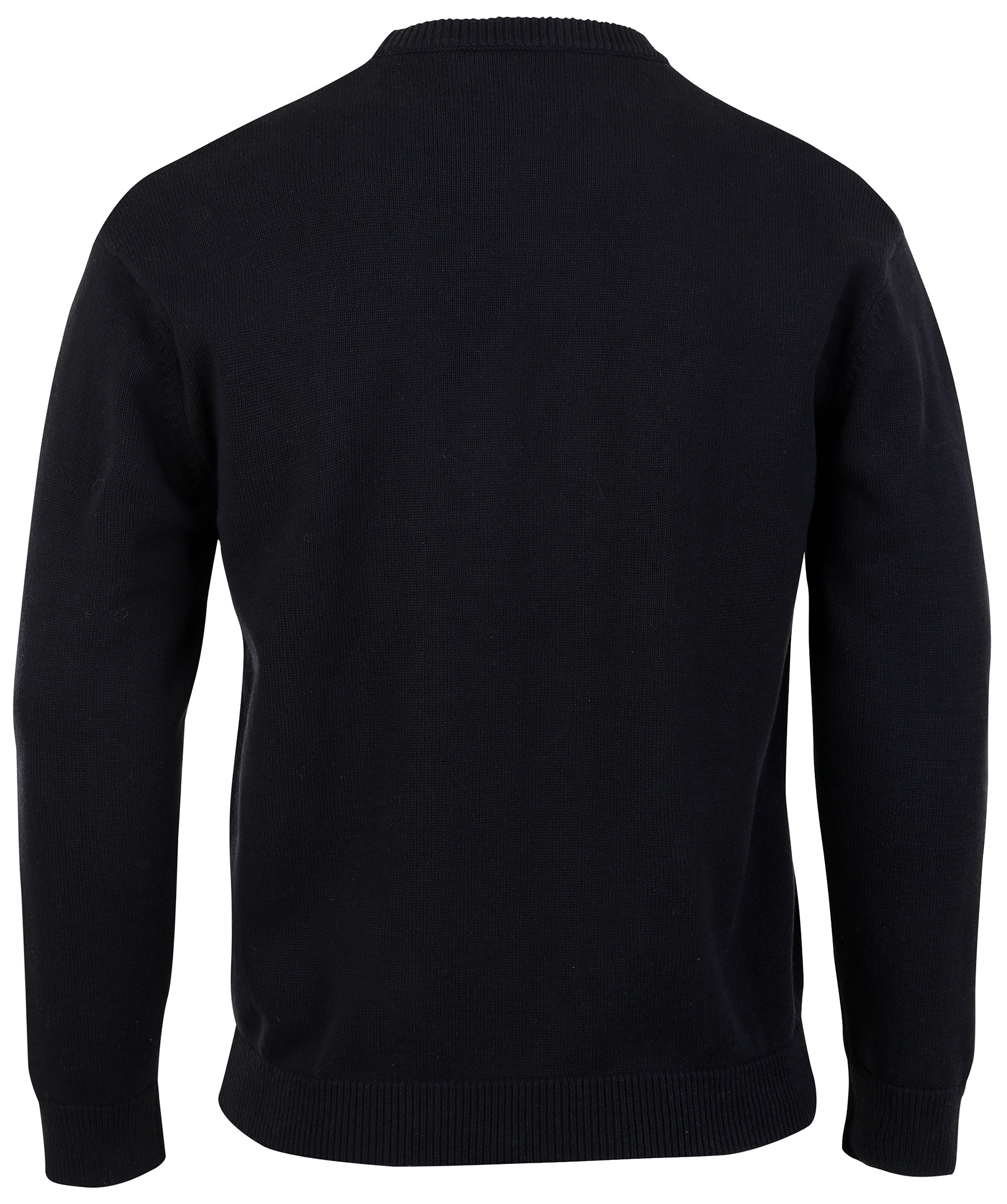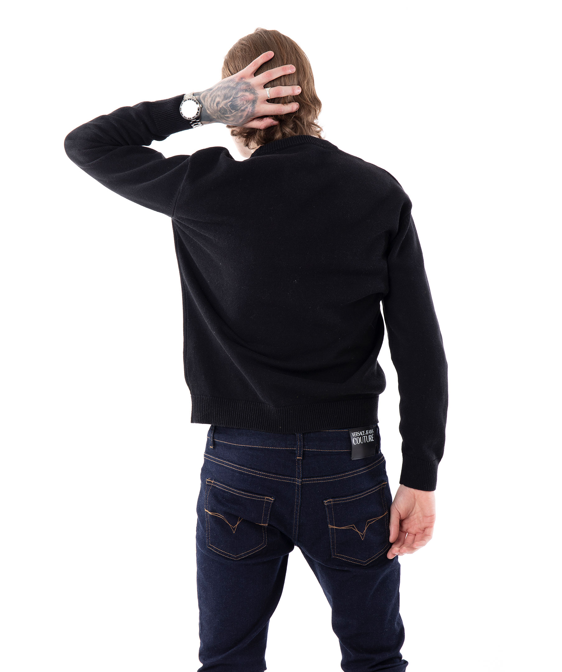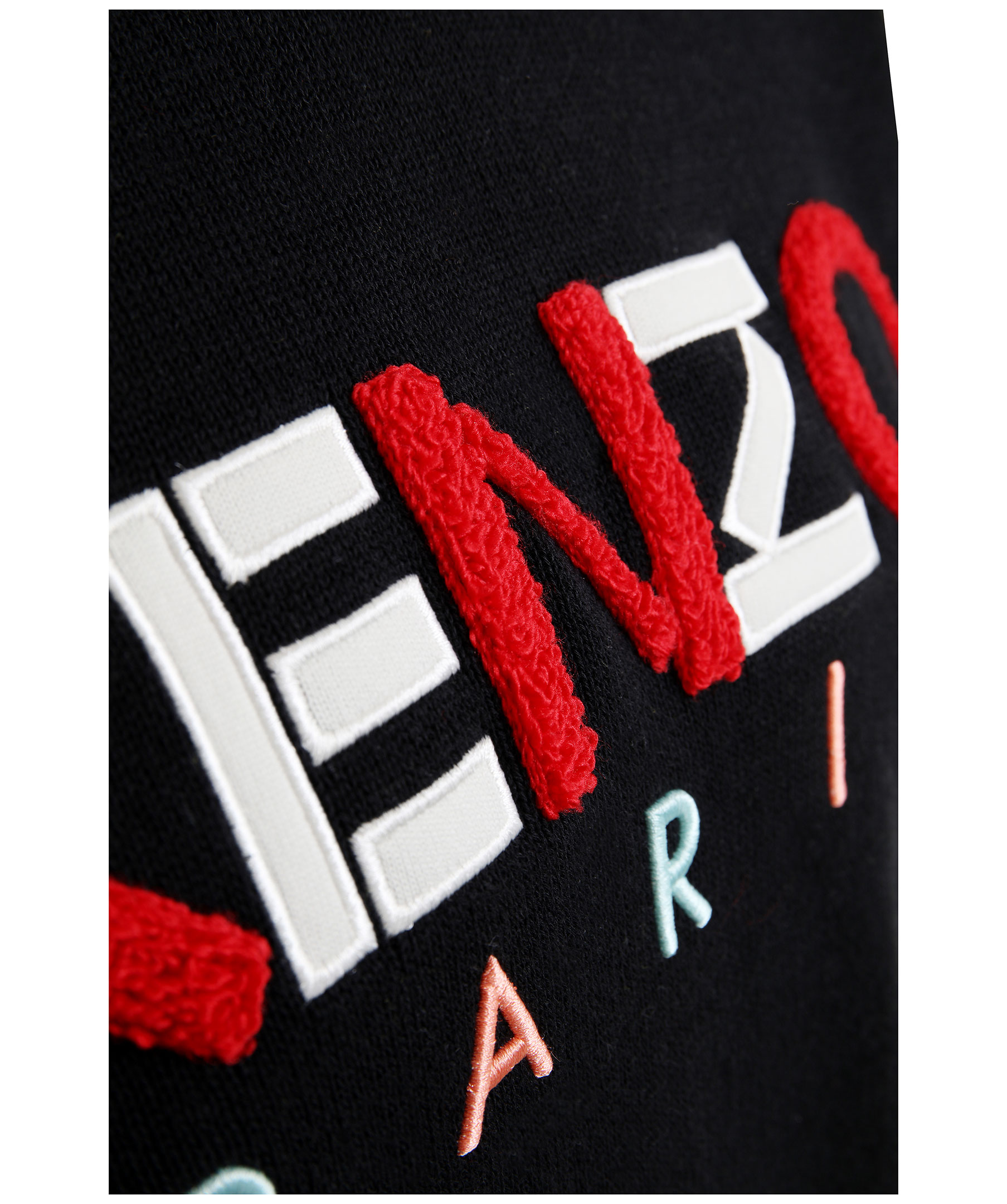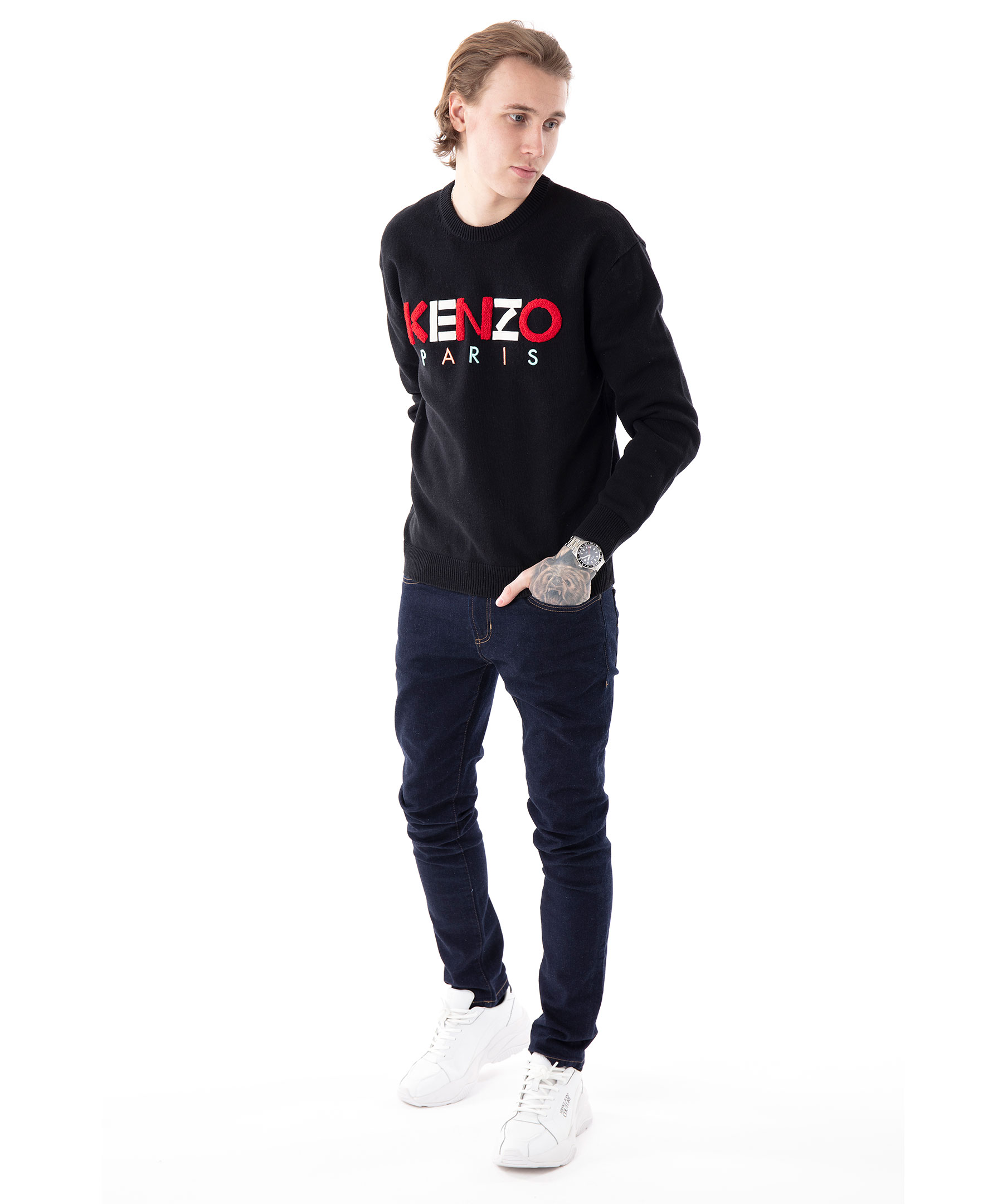 Svart finstickad sweatshirt från Kenzo. Tillverkad i kraftig bomull. Stor logotyp överbröstet med brodyr och tygapplikation. Ribbstickade muddar. Modellen är 180 cm lång och bär storlek M.