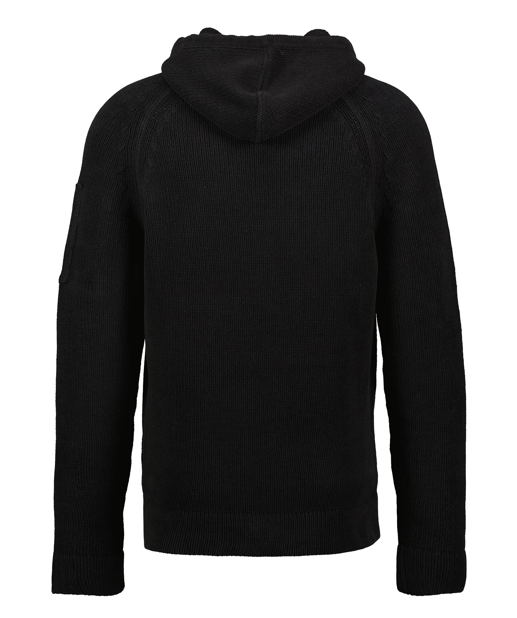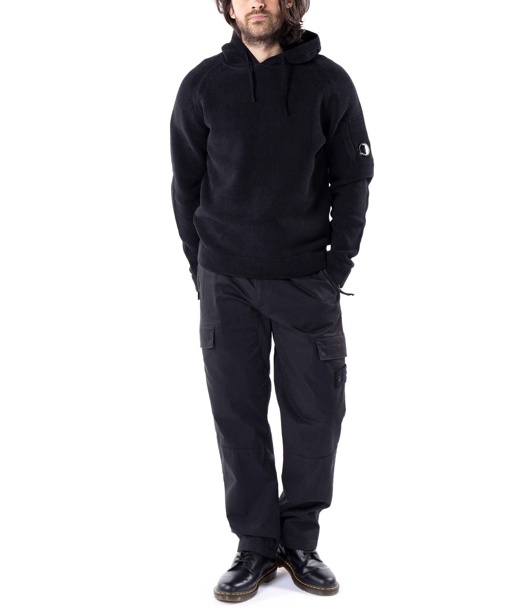 Svart, stickad hoodie från C.P Company. Huva med svarta knytband, ficka med logotyp på vänster ärm. Ribbstickade muddar i ärm- och plaggslut. Tillverkad i 100% Bomull. Modellen är 185 cm lång och bär storlek 50.