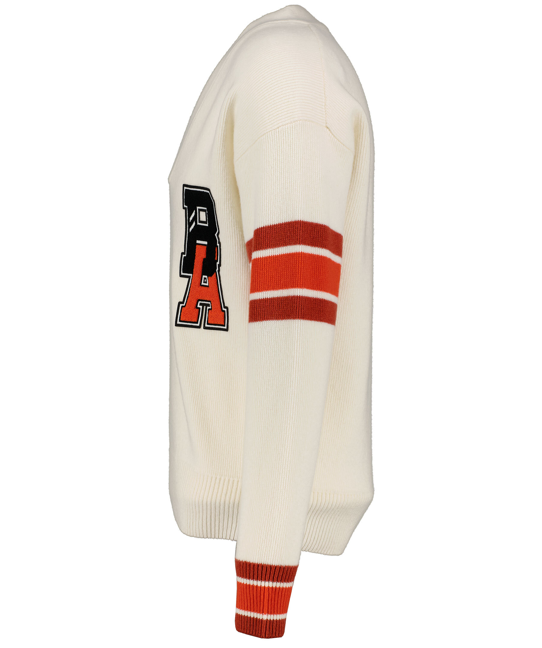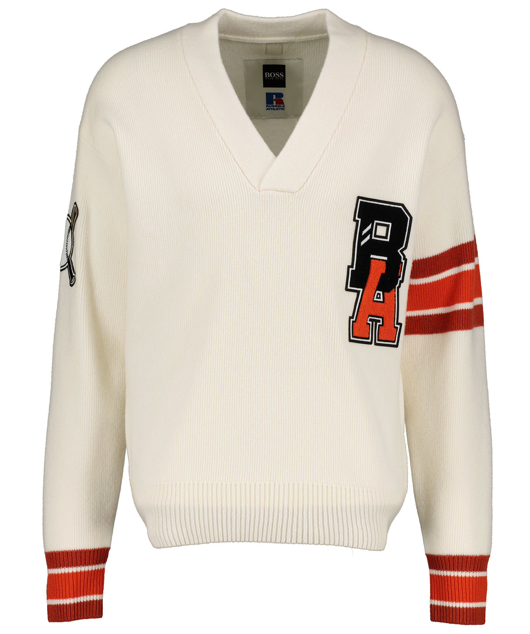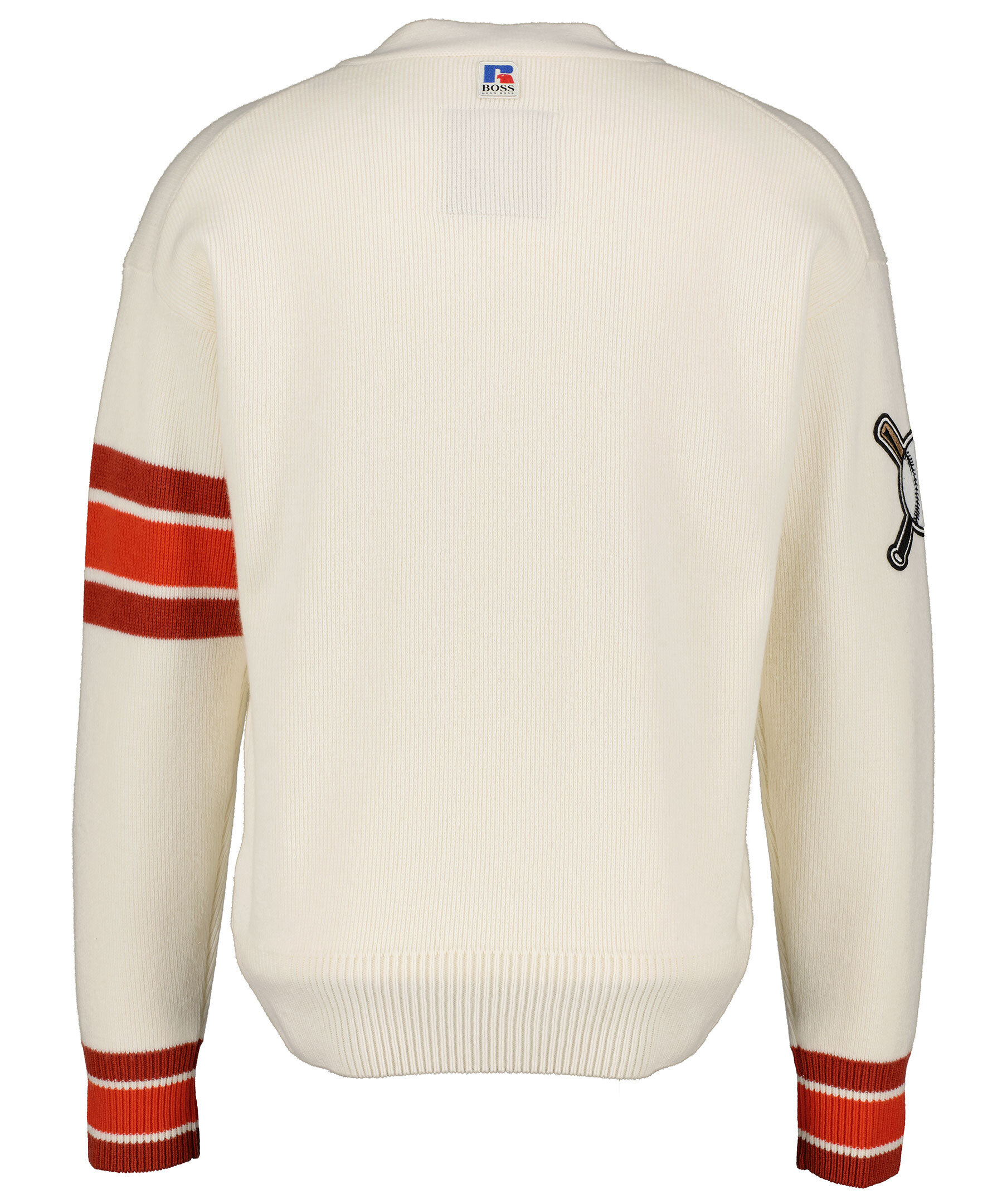 Gräddvit stickad tröja med v-ringning från BOSS x Russell Athletic. Mudd i samma färg som tröjan vid plaggslut och muddar i orange och rostrött vid ärmslut. Stort märke i svart och orange på höger sida av bröstet, märke med baseball och två korsade klubbor fastsytt på höger ärm och tre ränder i orange och rostrött på vänster ärm. Liten logotyp i nacken.