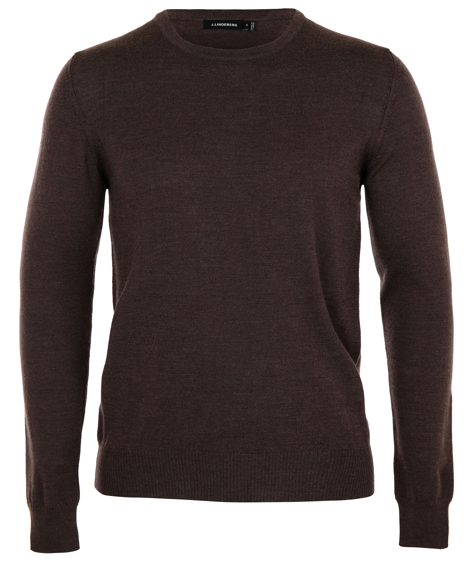 Brun finstickad tröja från J.Lindeberg gjord i mjuk merino ull. Tröjan rundad hals och ton-i-ton logotyp broderad på bröstet.