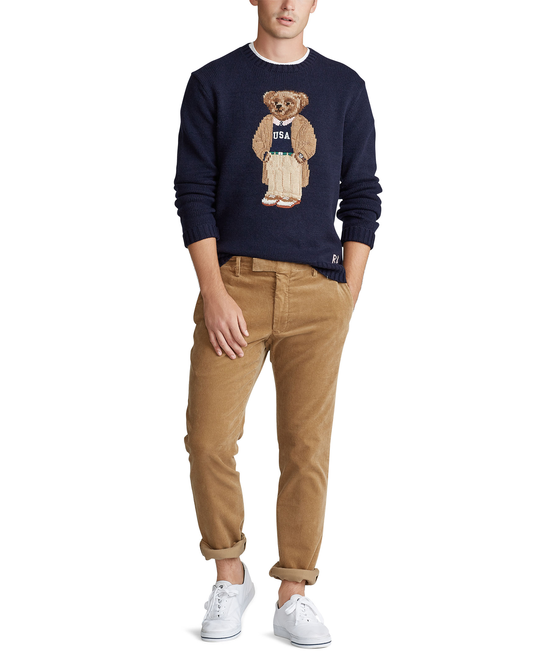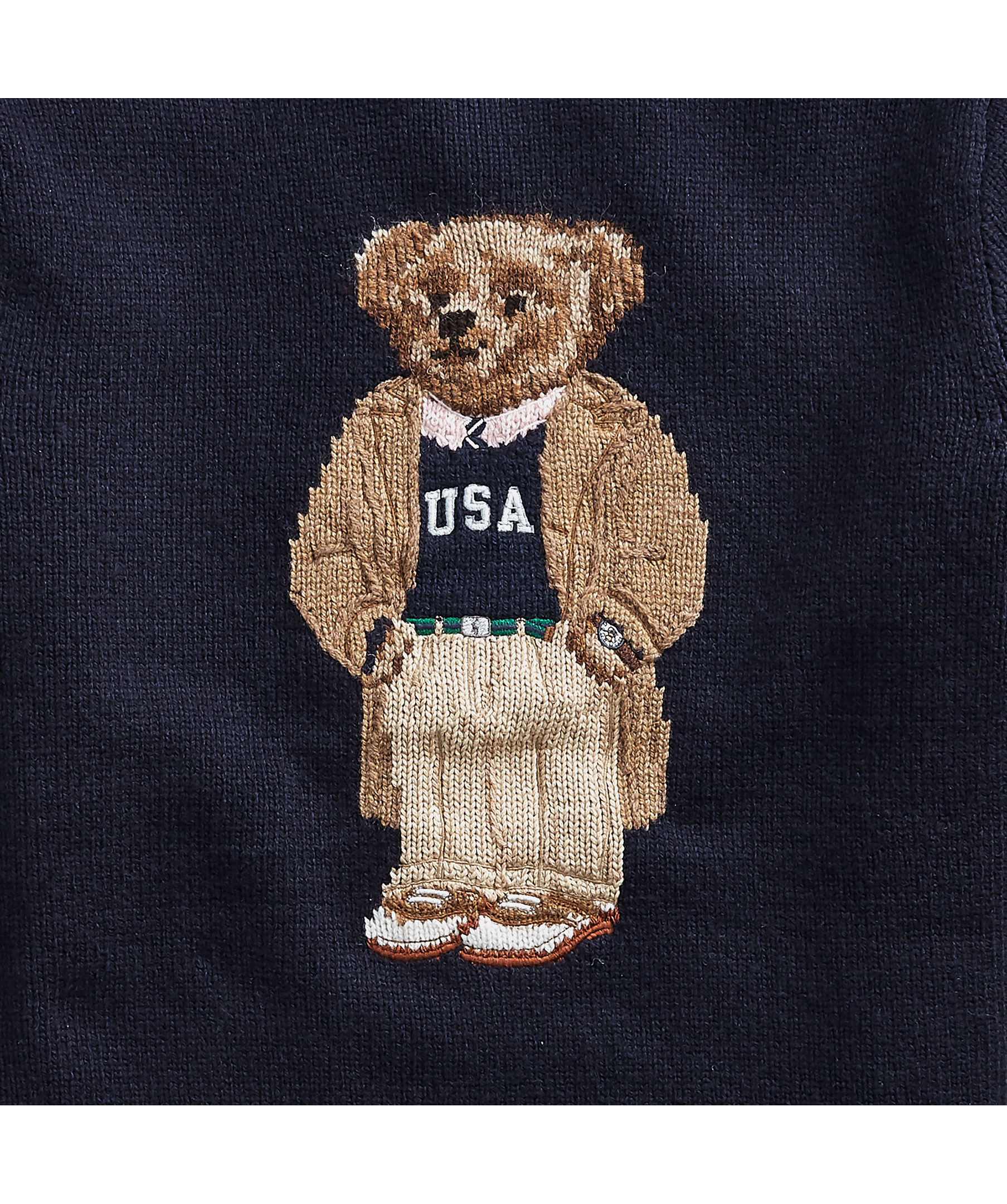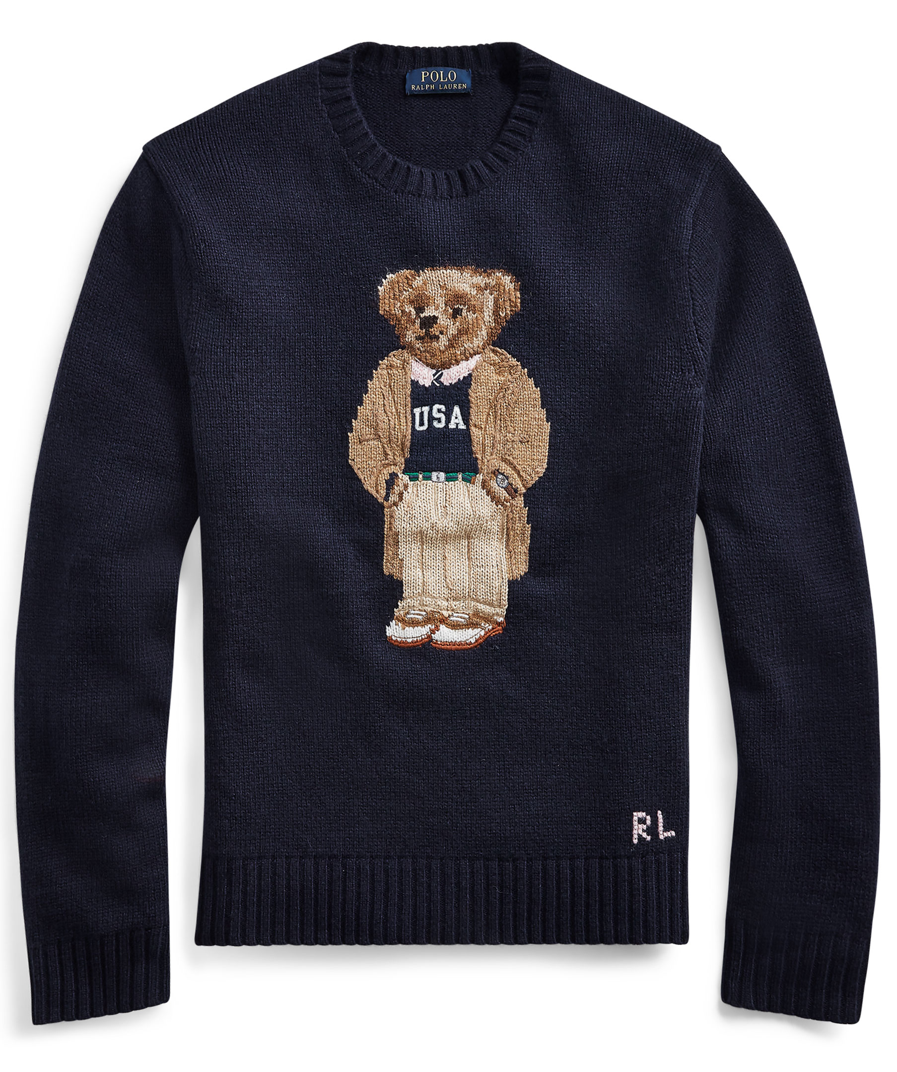 Marinblå, stickad tröja från Polo Ralph Lauren. Rundad hals, Polo Bear motiv på bröstet.