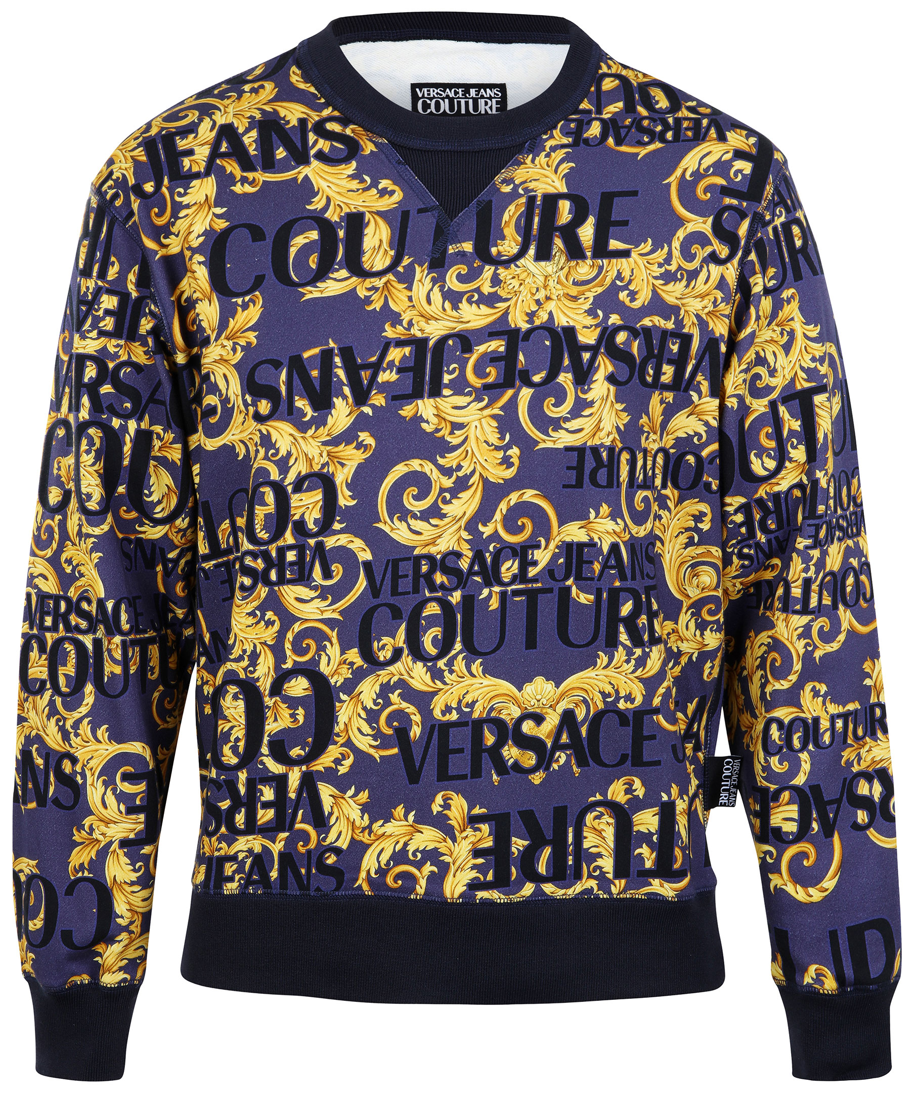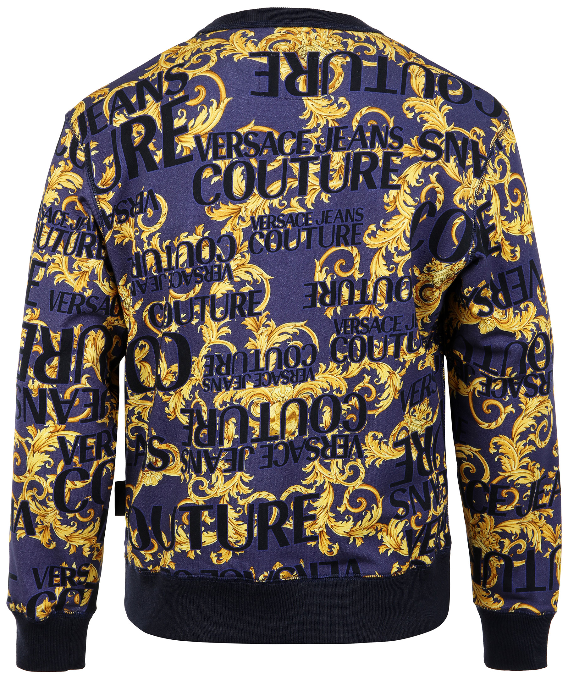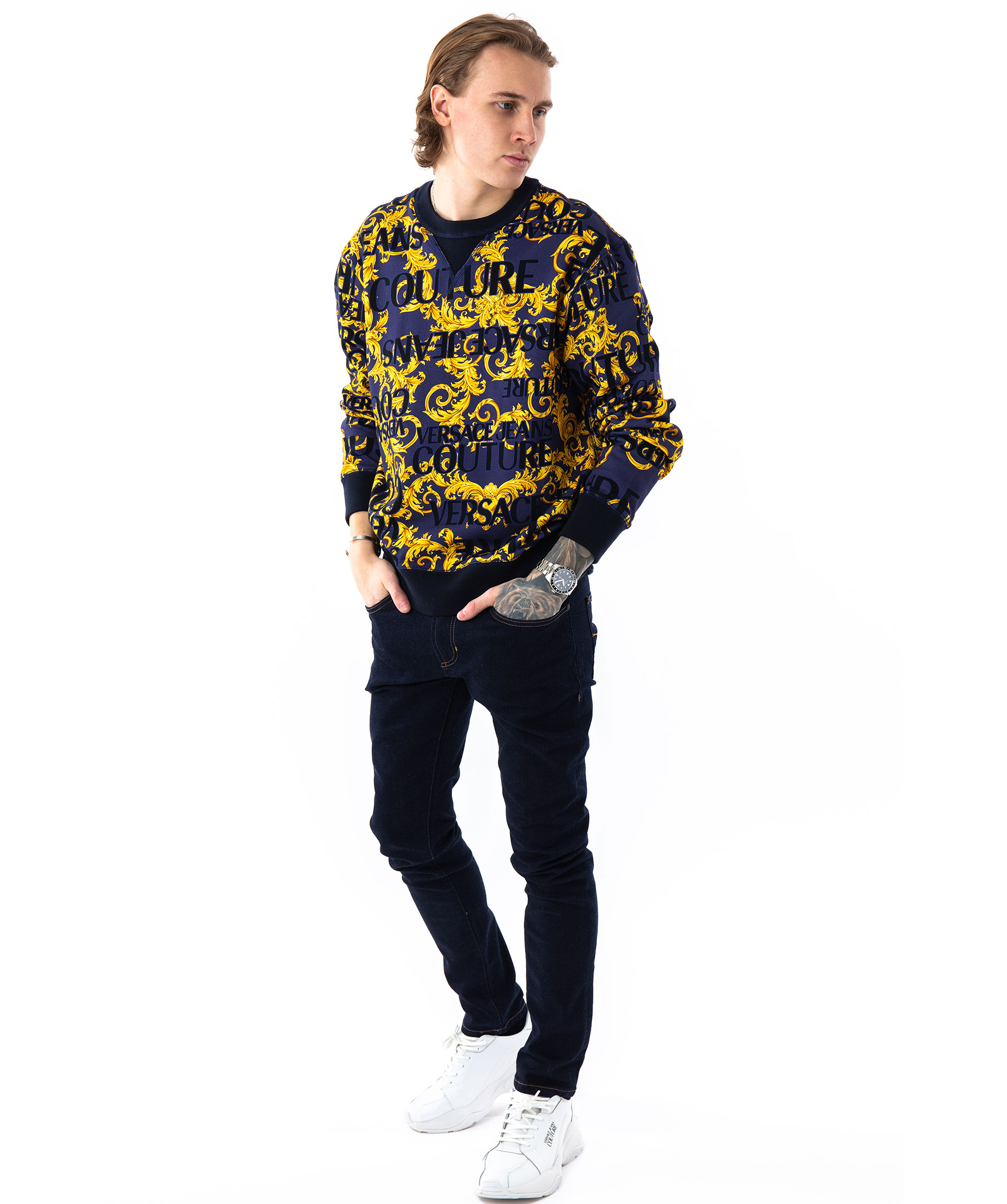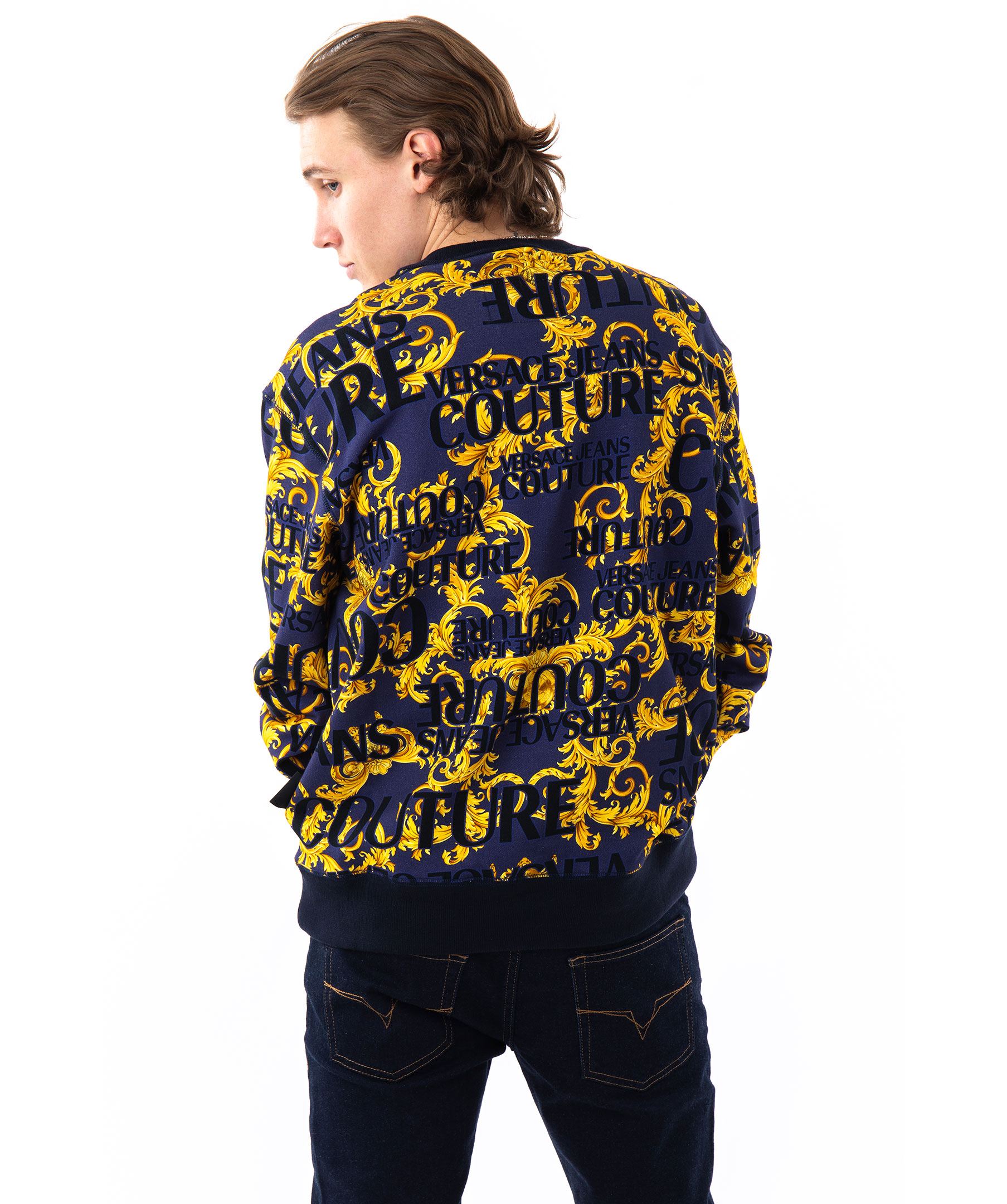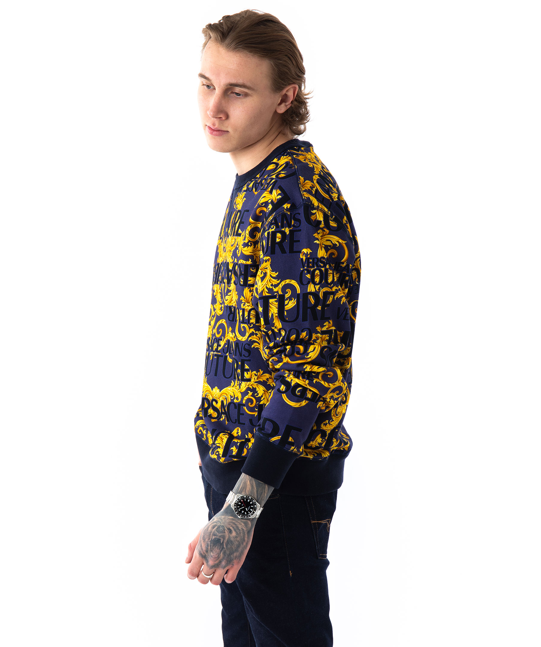 Sweatshirt från Versace Jeans Couture. Mönstrad i "Versace" mönster och logotyper. Rundad halsringning med svart mudd och svart mudd på ärmslut och plaggslut. Tillverkad i bomull. Modellen är 180 cm lång och bär storlek M.