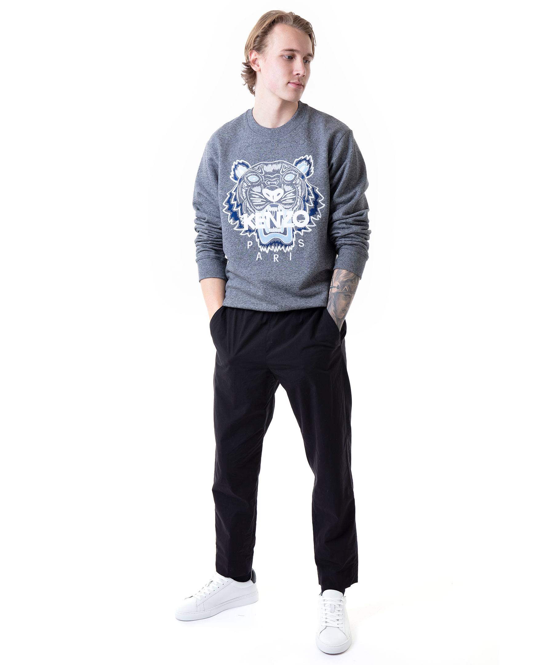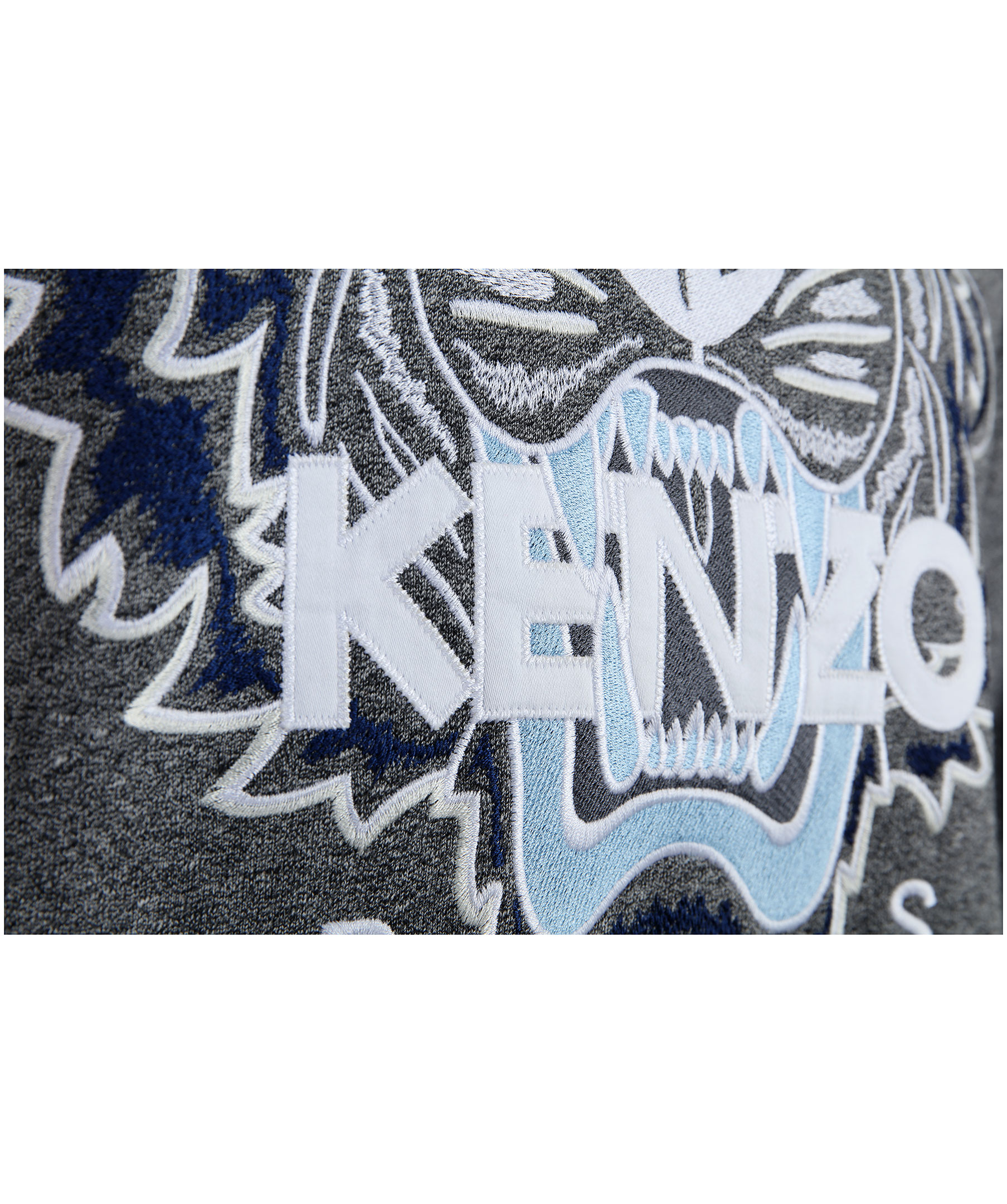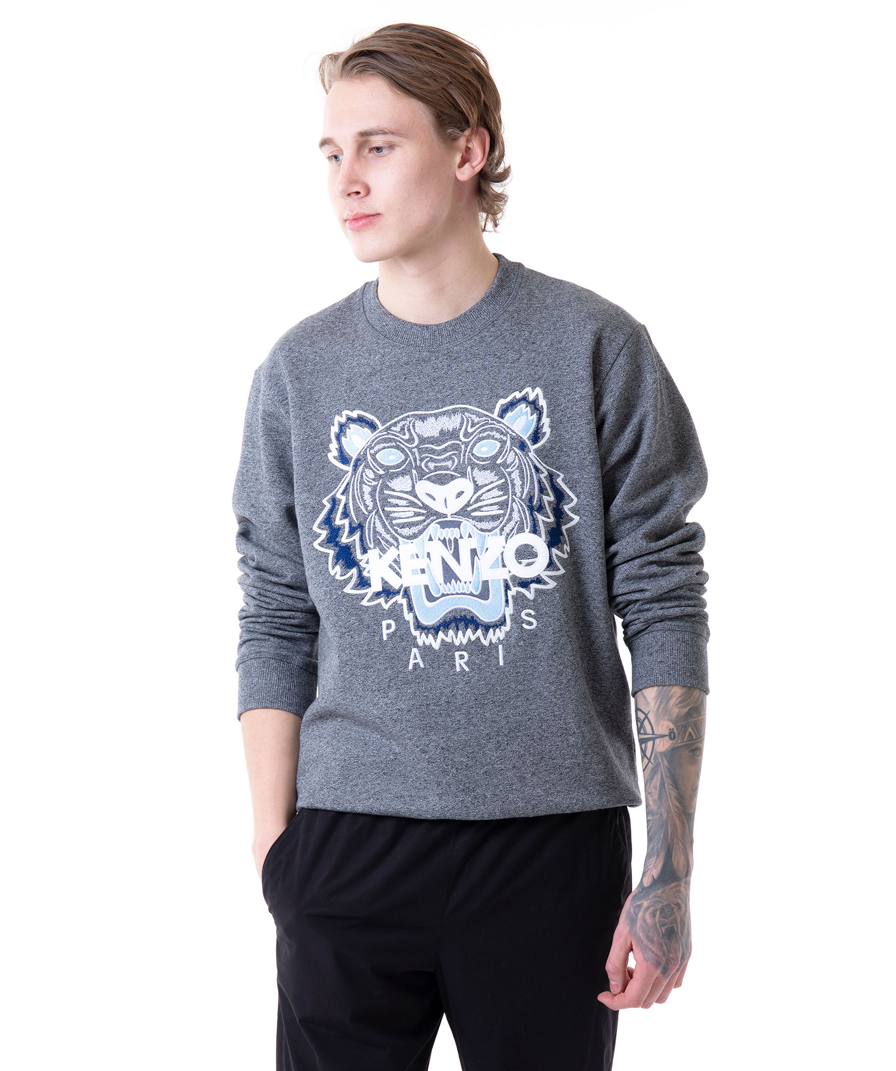 Gråmelerad sweatshirt i avslappnad passform från Kenzo. Gjord helt i bomull. Stor broderad tiger på bröstet, rundad hals och muddar i ärm och plaggslut. Modellen är 180 cm lång och bär storlek M.