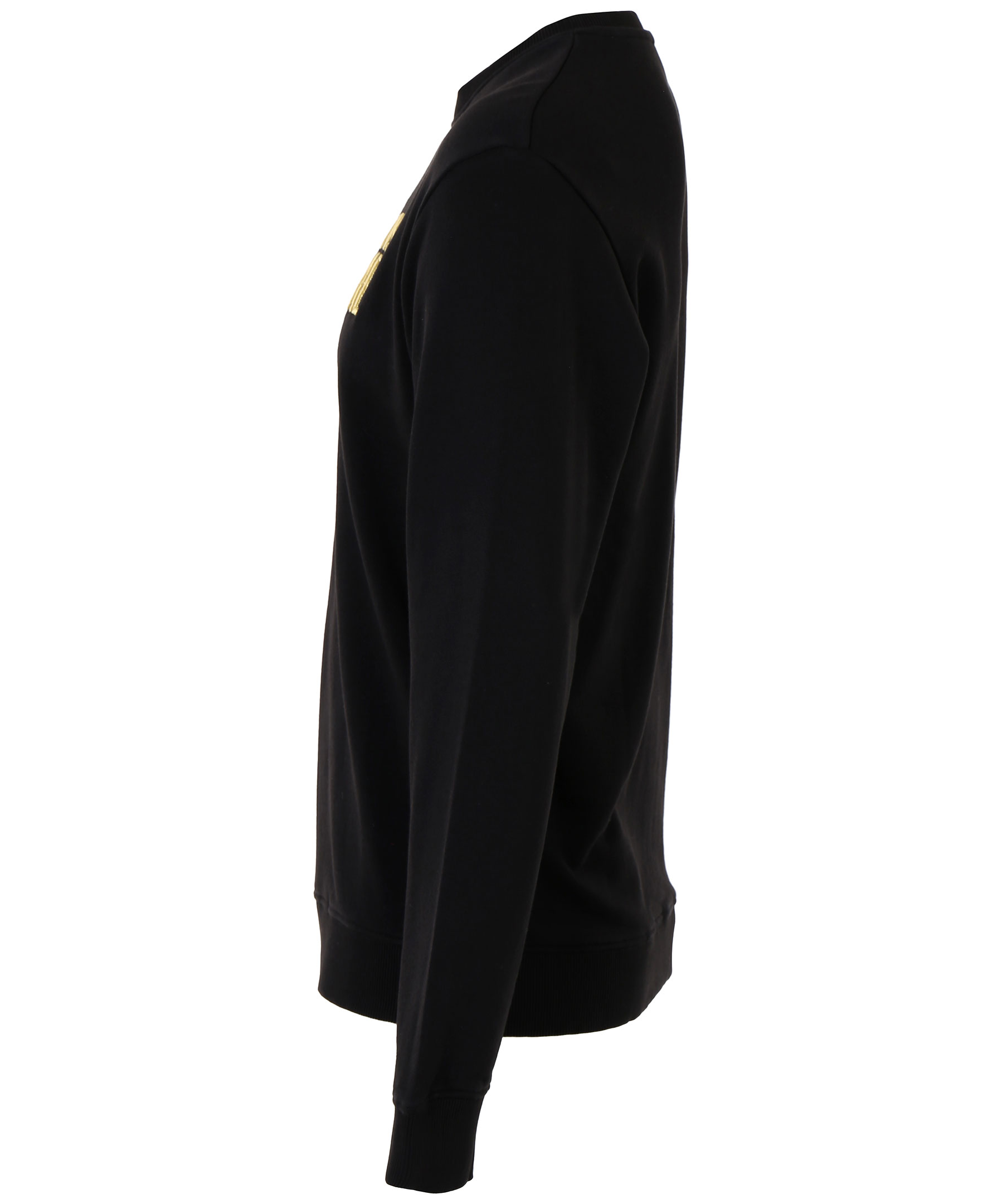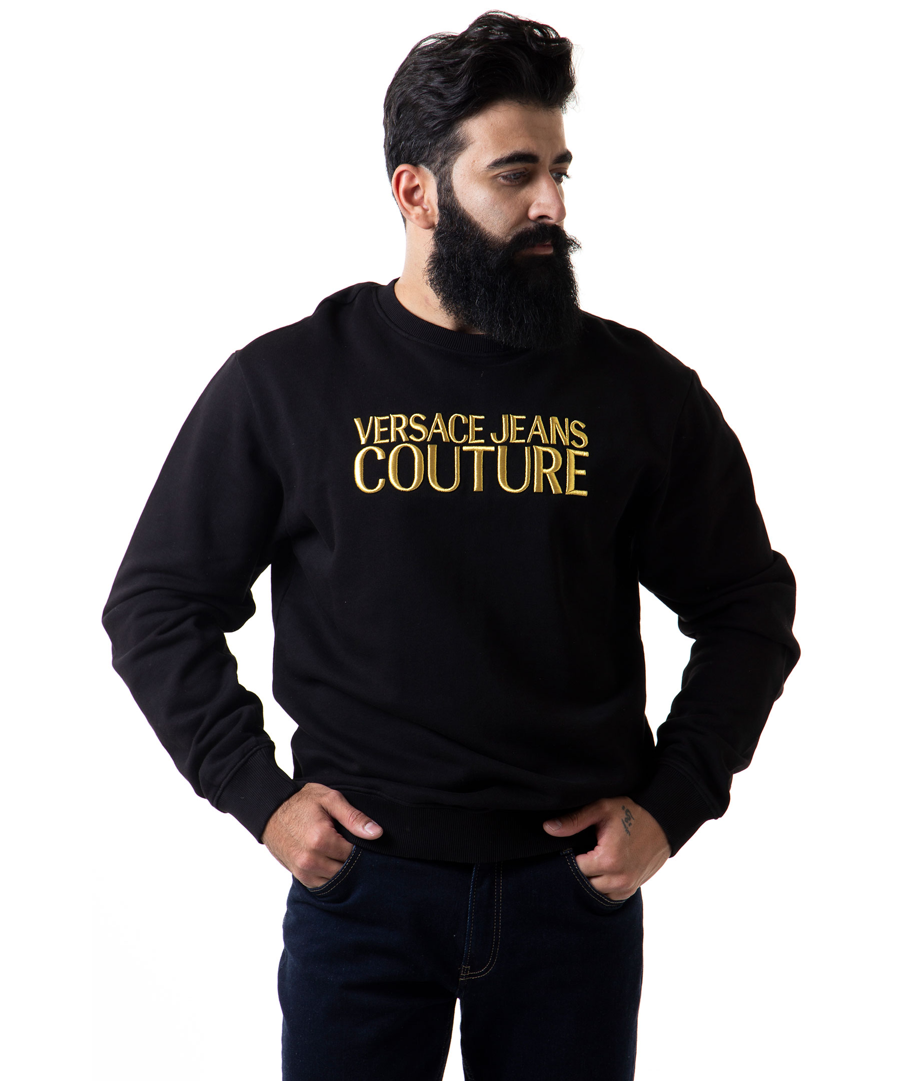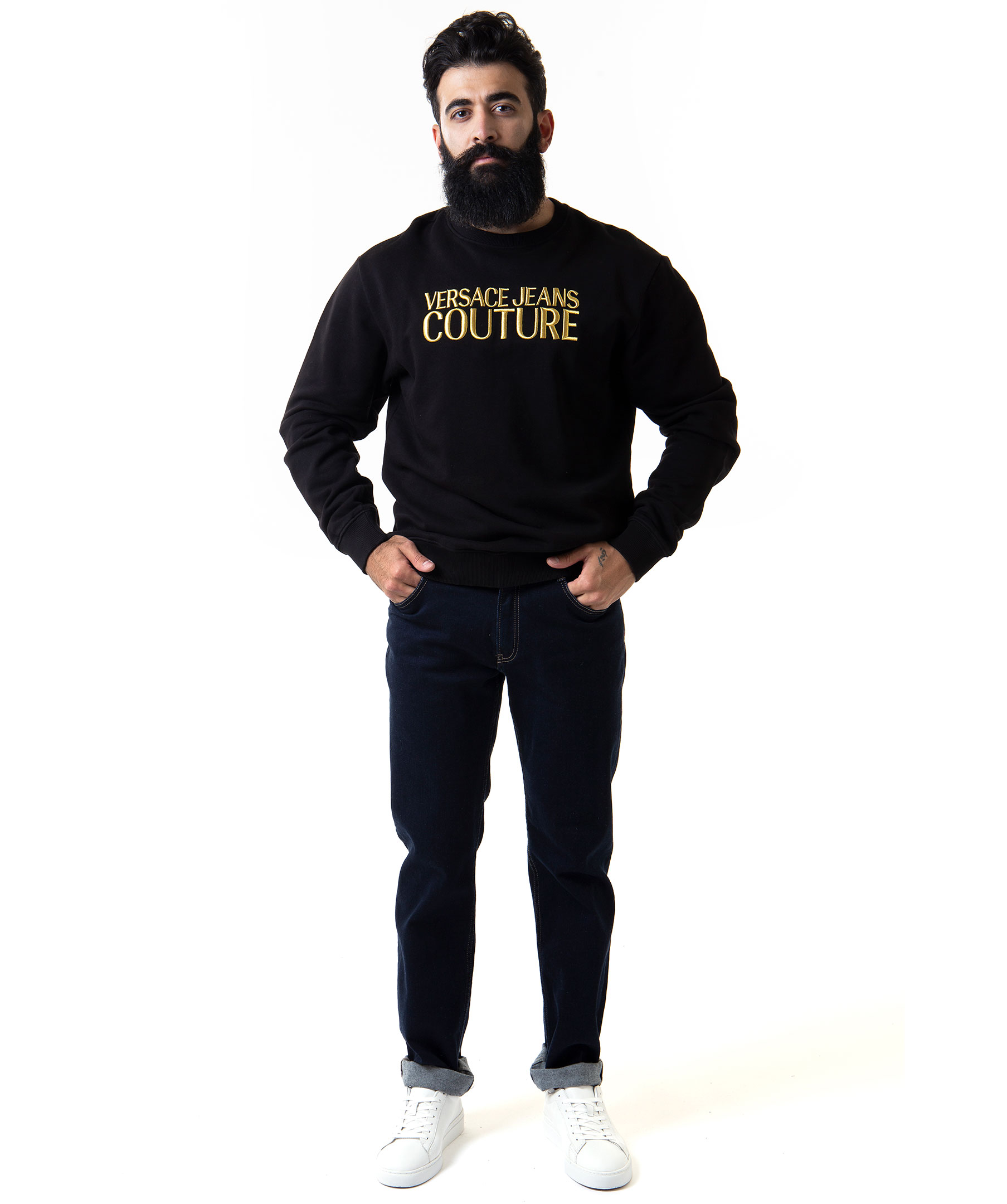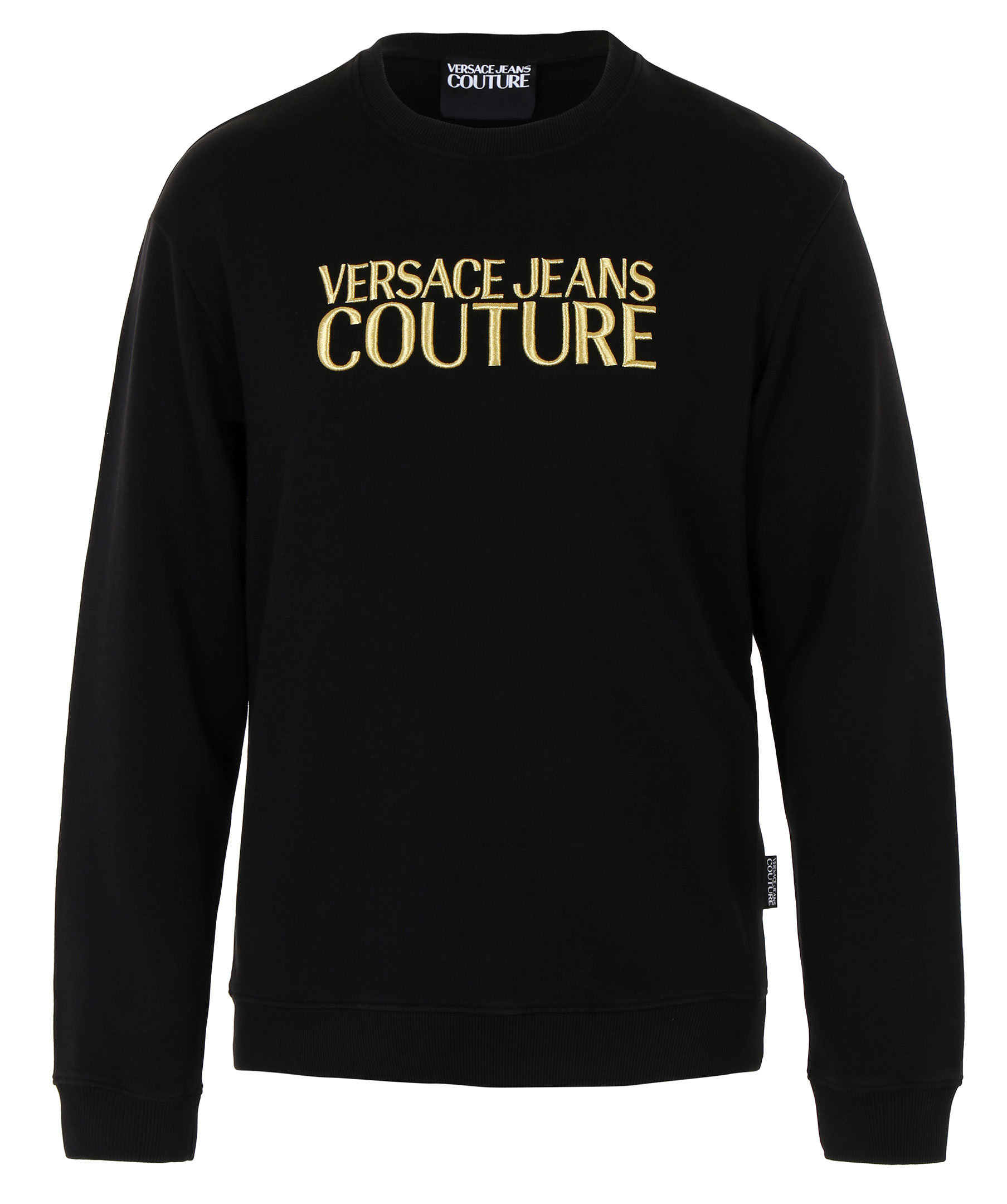 Svart sweatshirt i bomull från Versace Jeans Couture. Stor broderad text i guld. Ribbade muddar i arm och plaggslut. Modellen är 177 cm lång och bär storlek M.