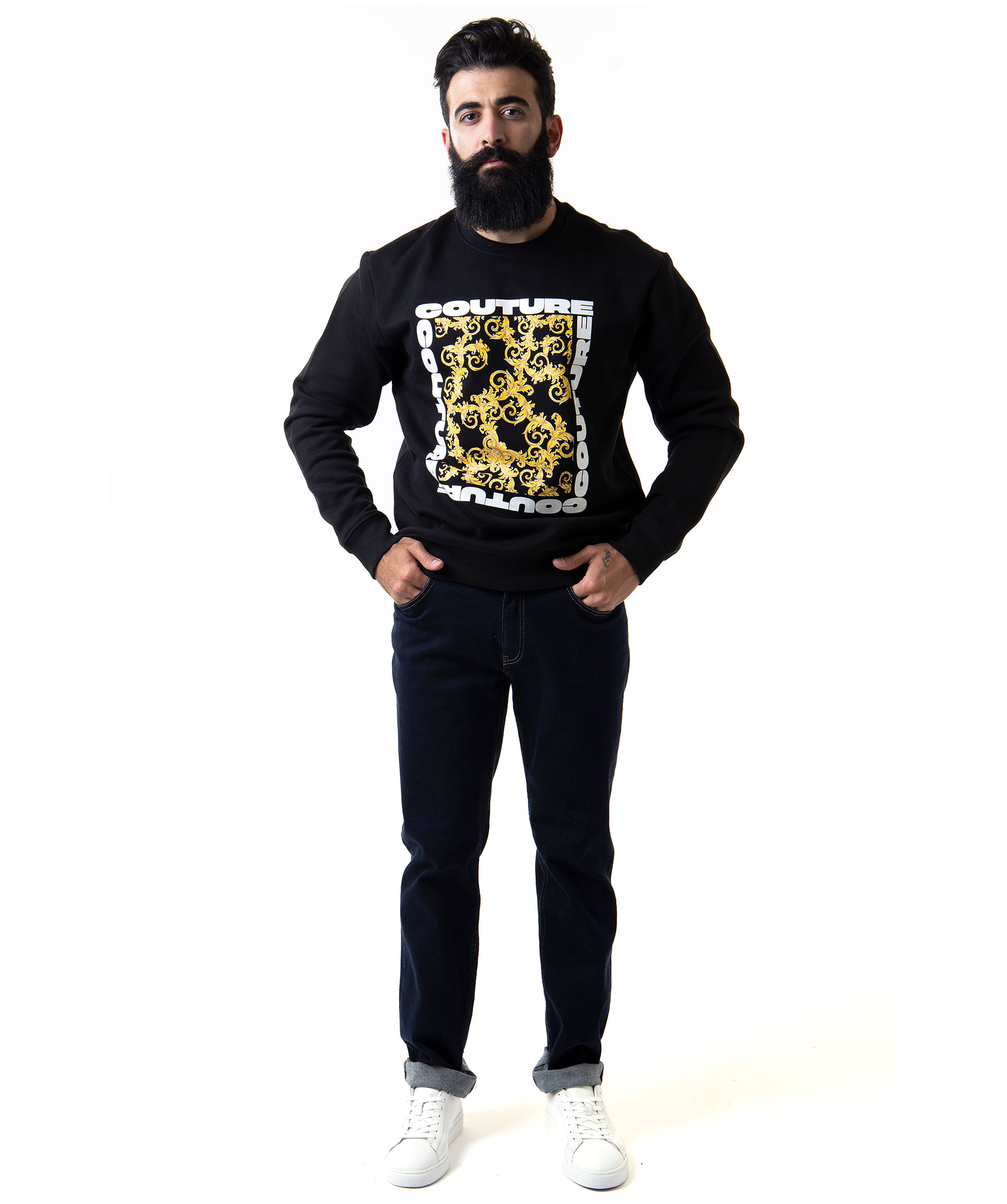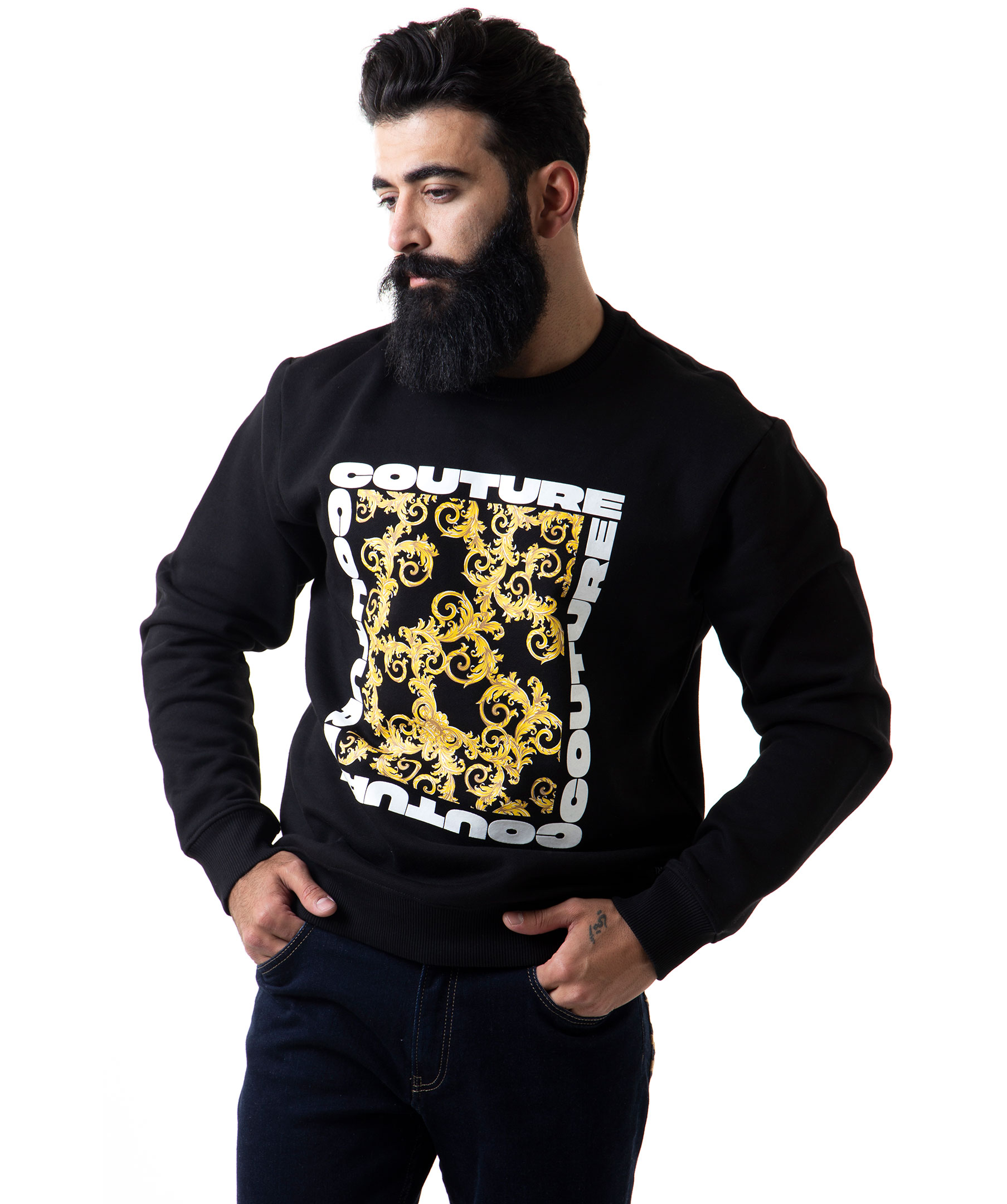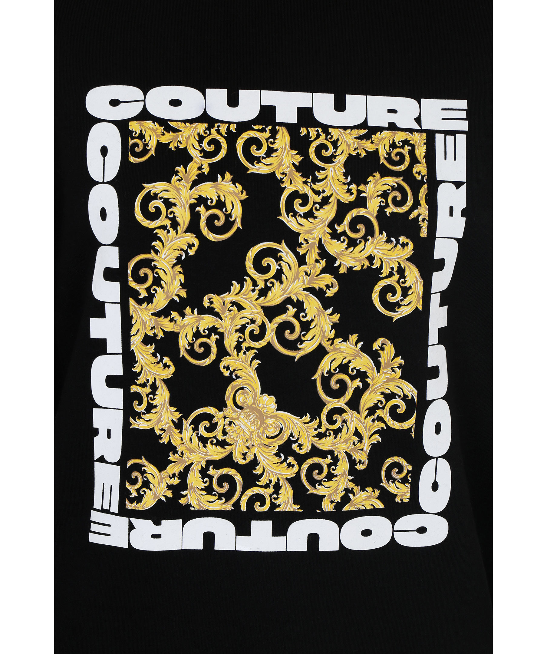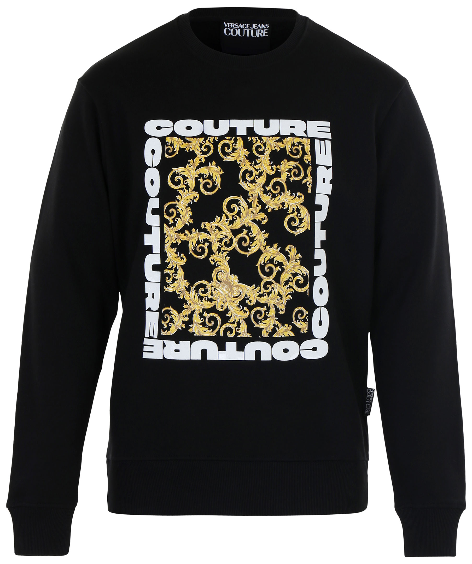 Svart sweatshirt från Versace Jeans Couture. Tröjan är gjord i skön bomullsmix, har ett stort mönstrad tryck på bröstet med gummerad logotyp i vitt runt omkring. Modellen är 177 cm lång och bär storlek M.