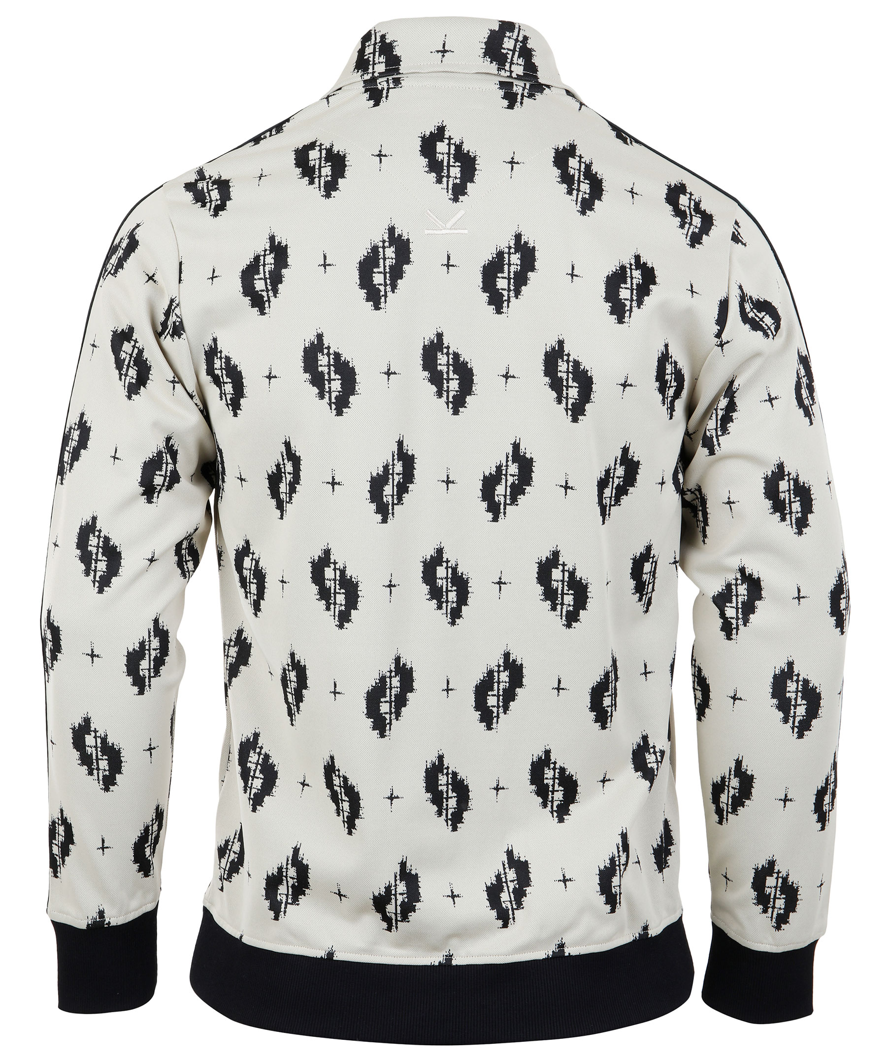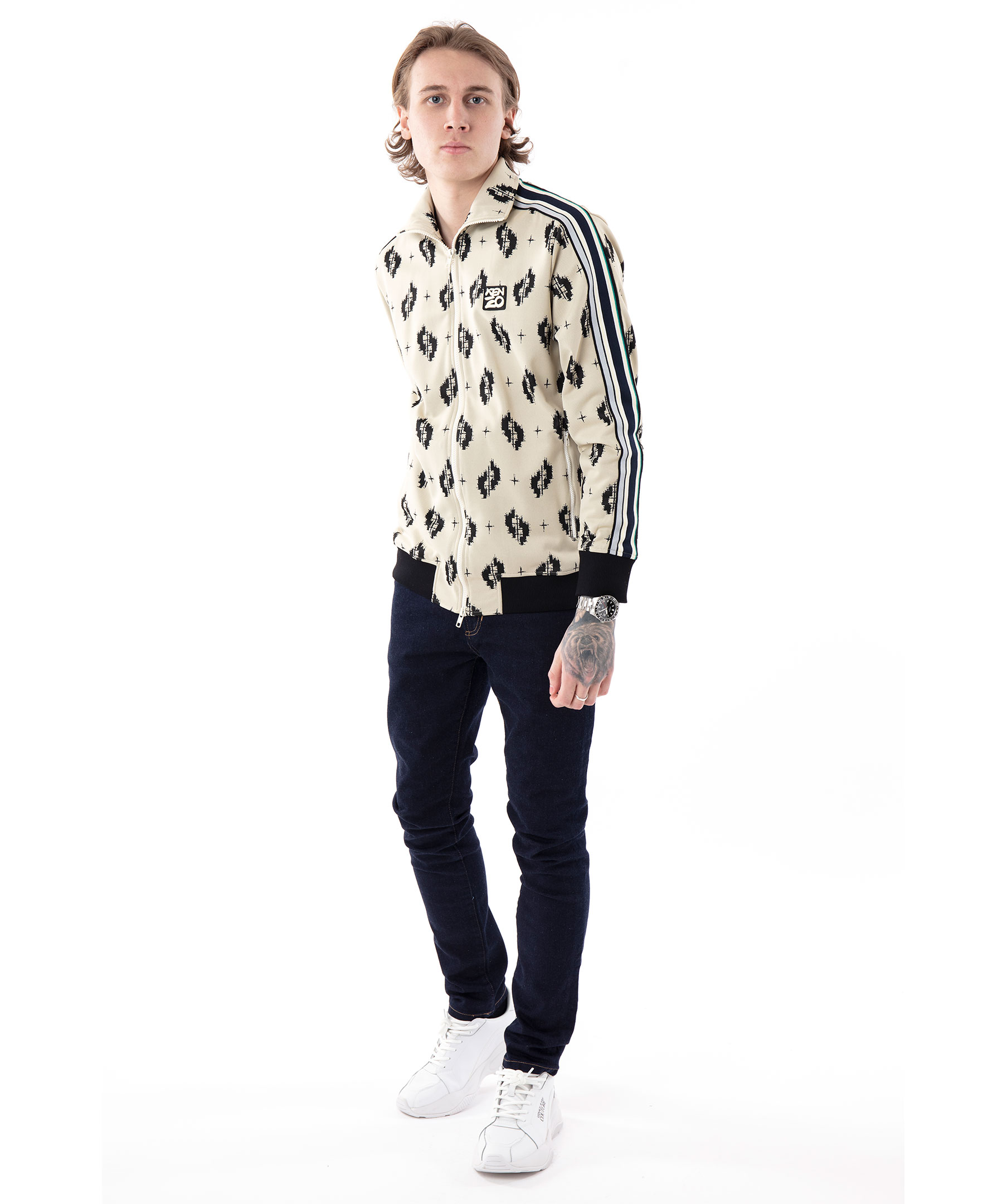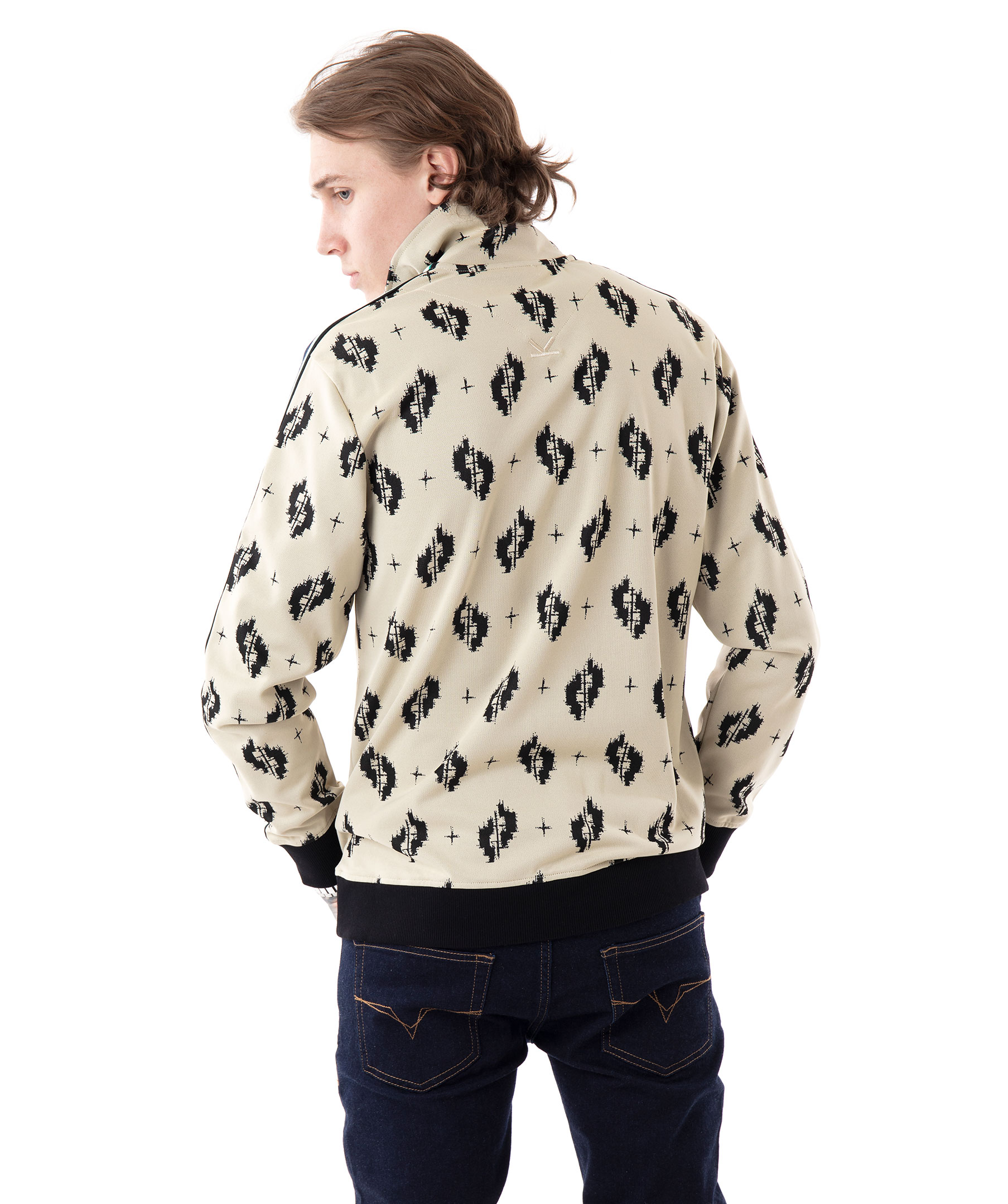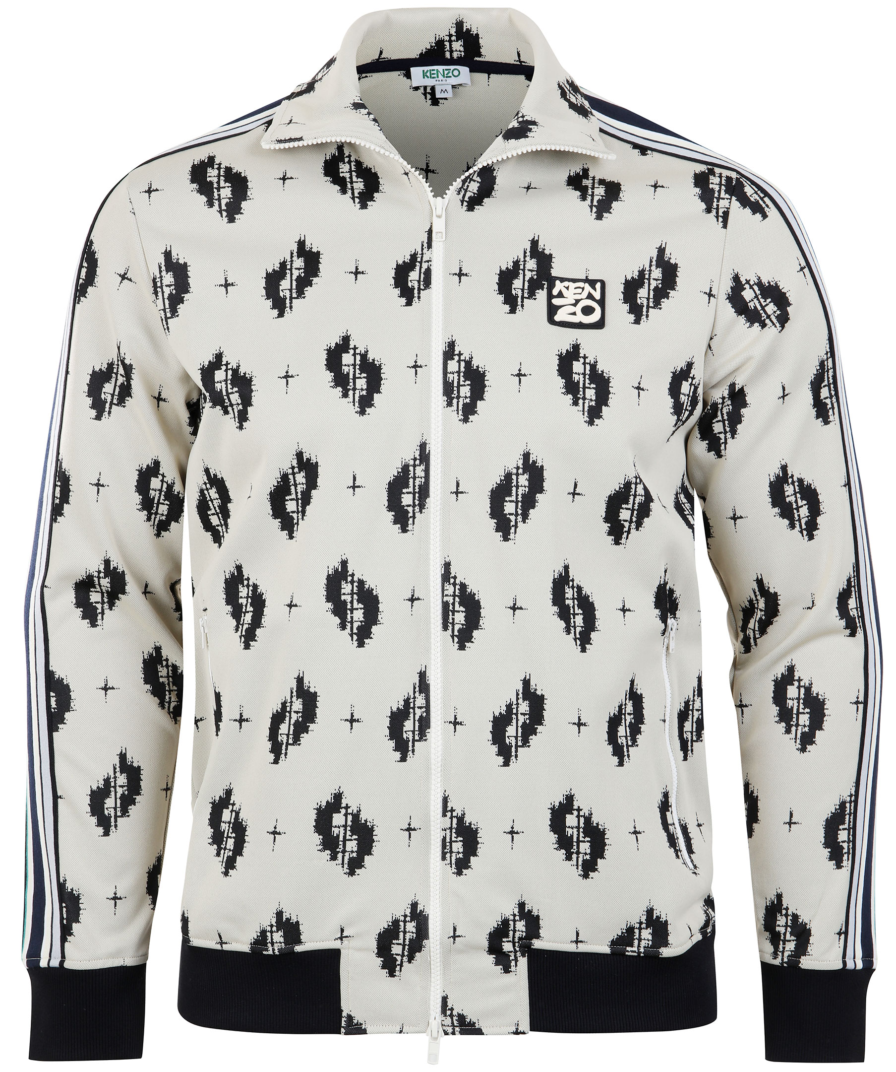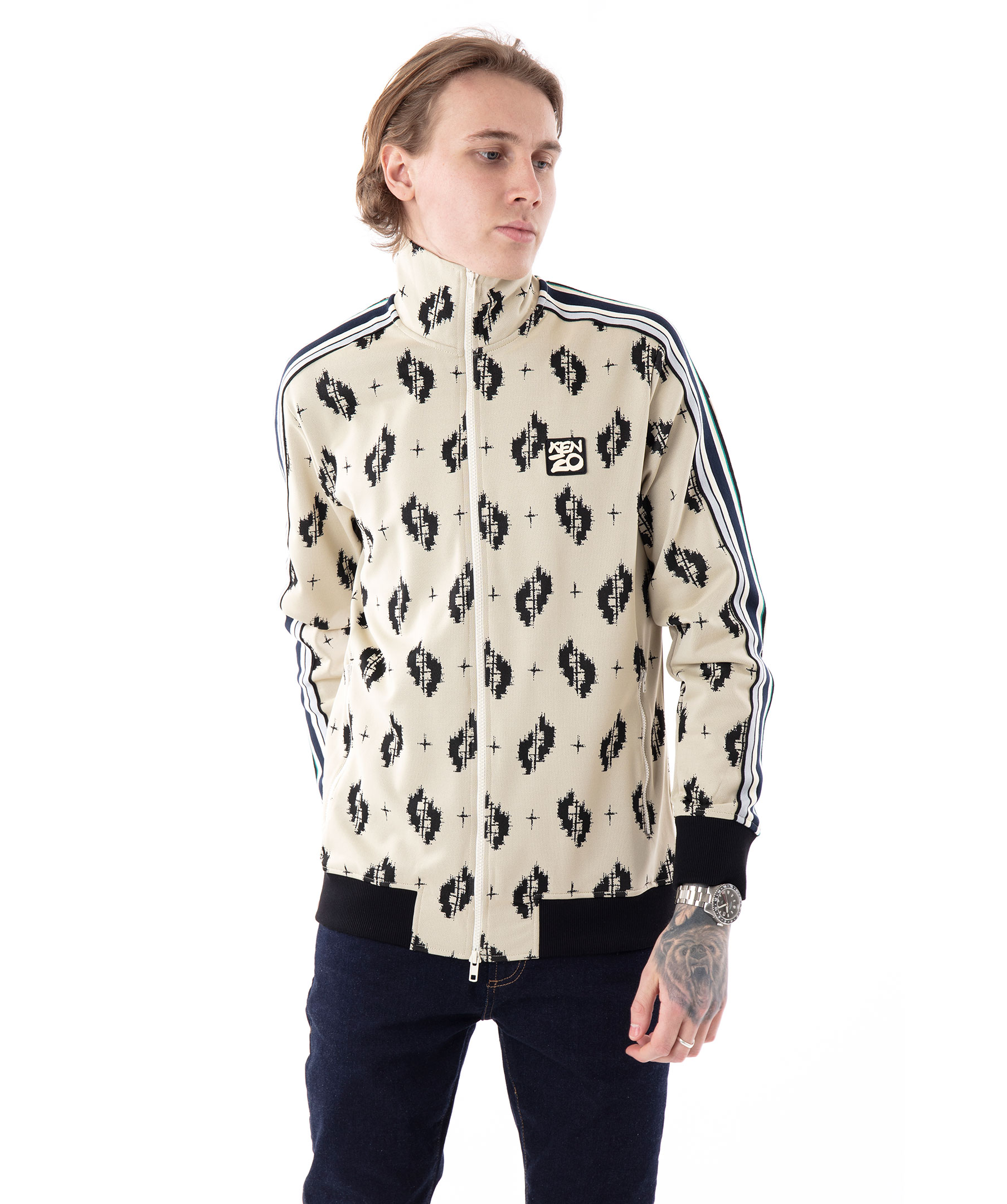 Beige och mönstrad tracksuitjacka från Kenzo. Tillverkad i ett stretchigt polyamidtyg. Stängs med dragkedja längst framsidan. Två framfickor med dragkedja, svarta ribbstickade muddar vid ärm och plaggslut. Randiga revärer längst ovansidan av armarna. Logotyp i gummi på bröstet. Modellen är 180 cm lång och bär storlek M.