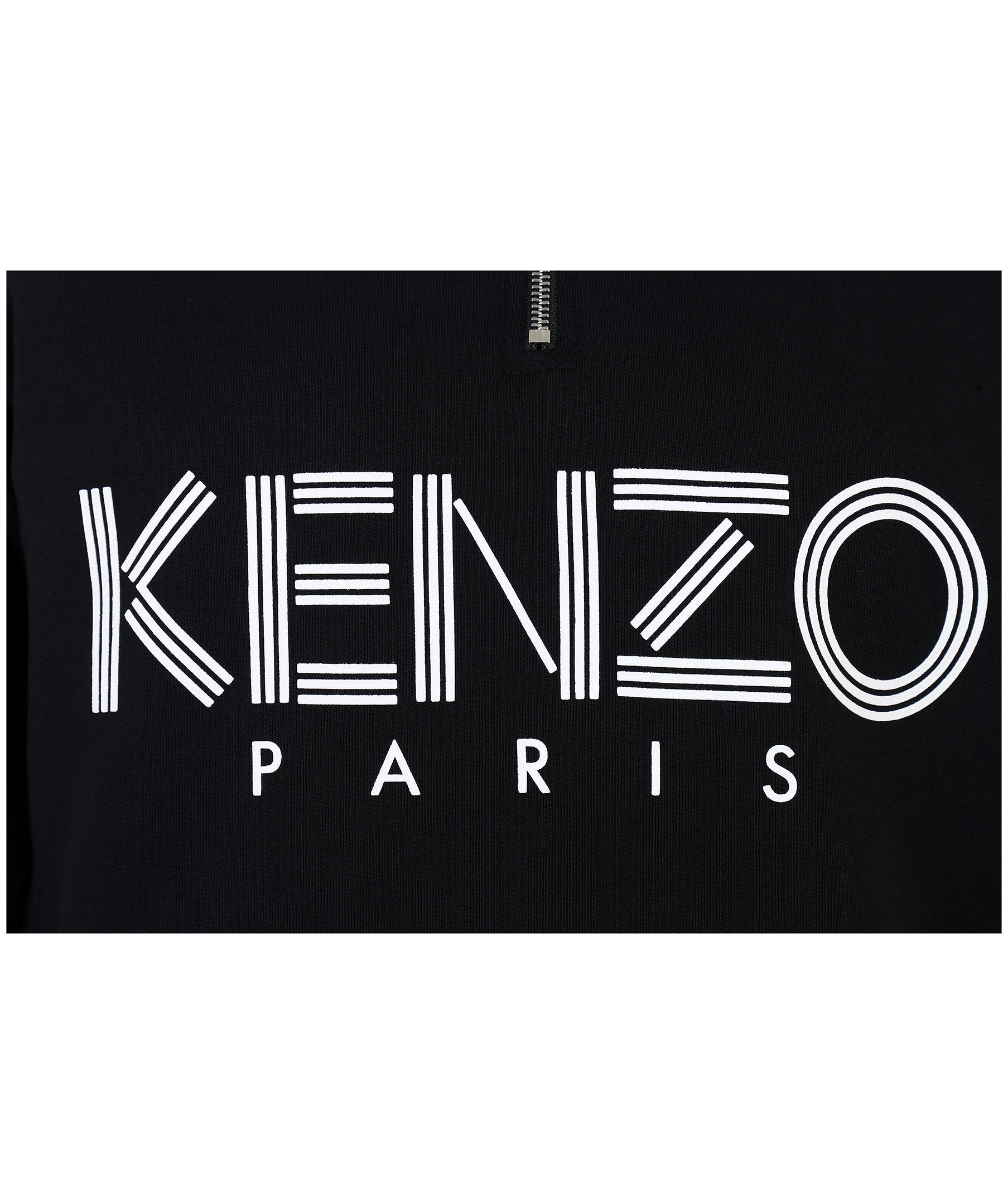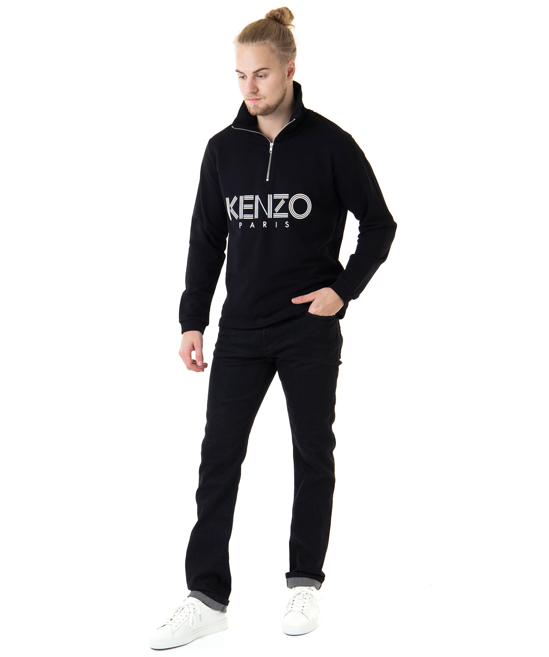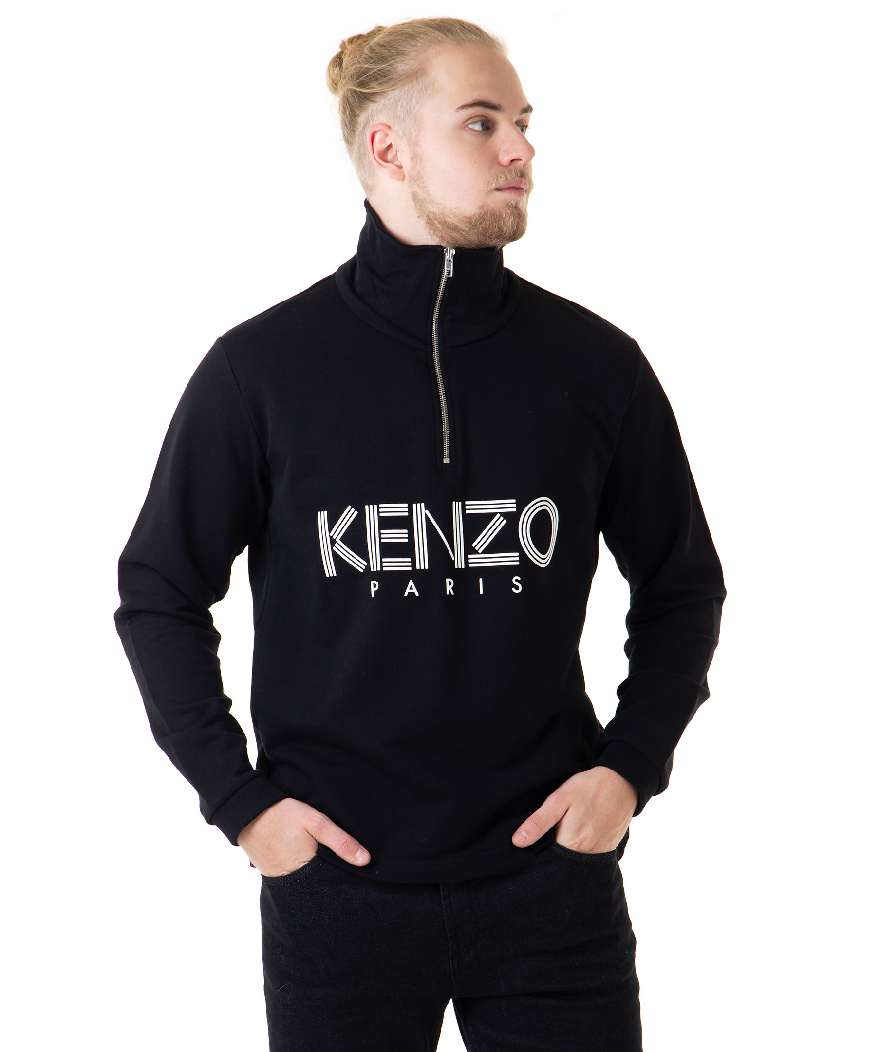 Svart sweatshirt från Kenzo tillverkad i bomull. Tröjan har en högkrage med half zip. Vit logotyp på bröstet och ribbstickade muddar vid ärmslut. Modellen är 186 cm lång och bär storlek M.