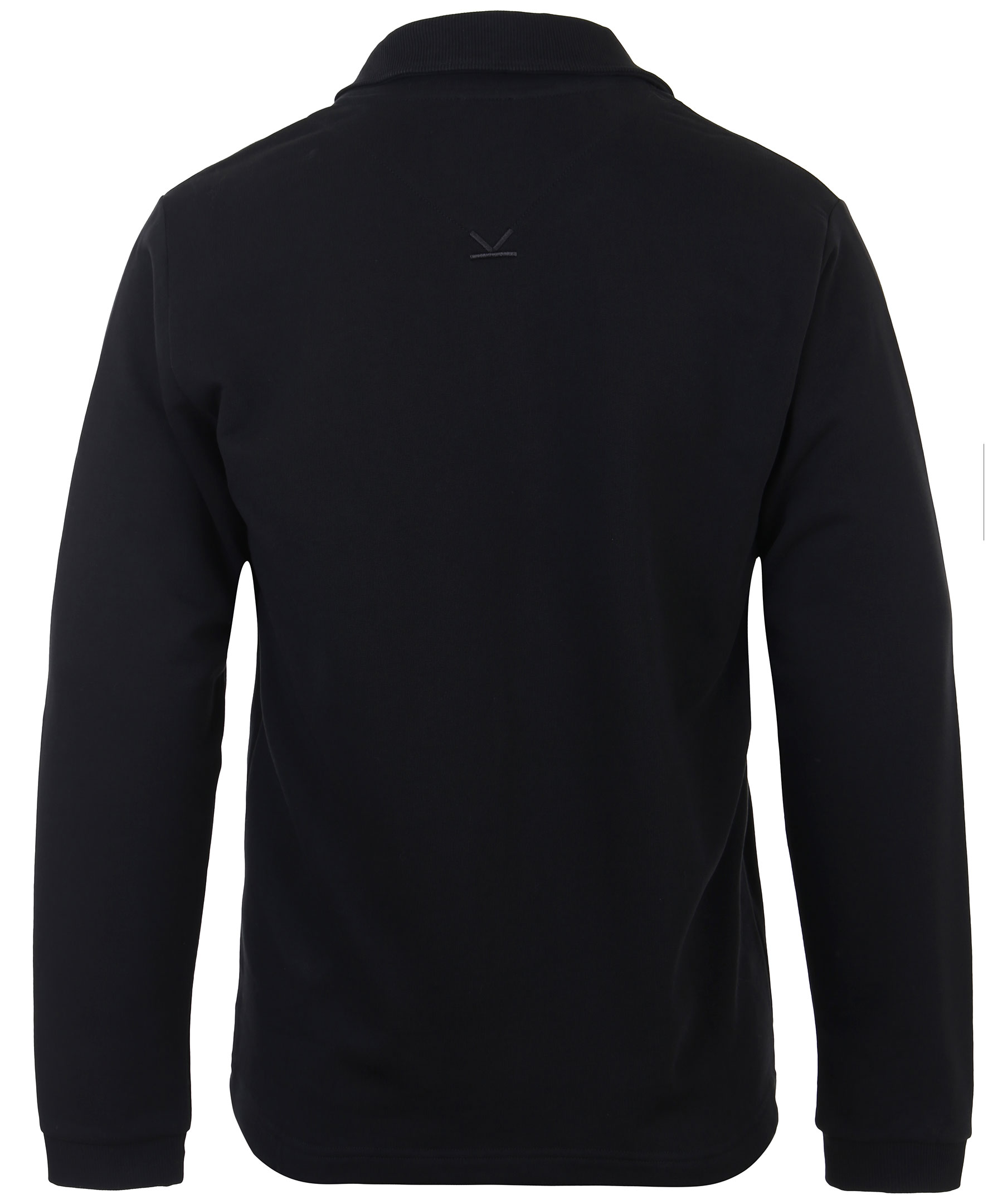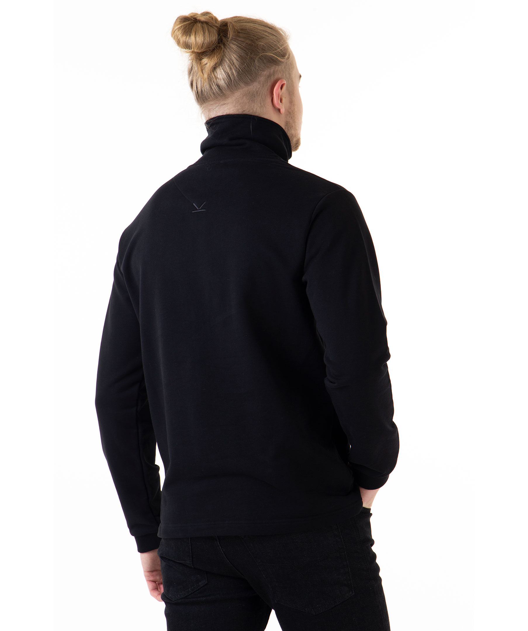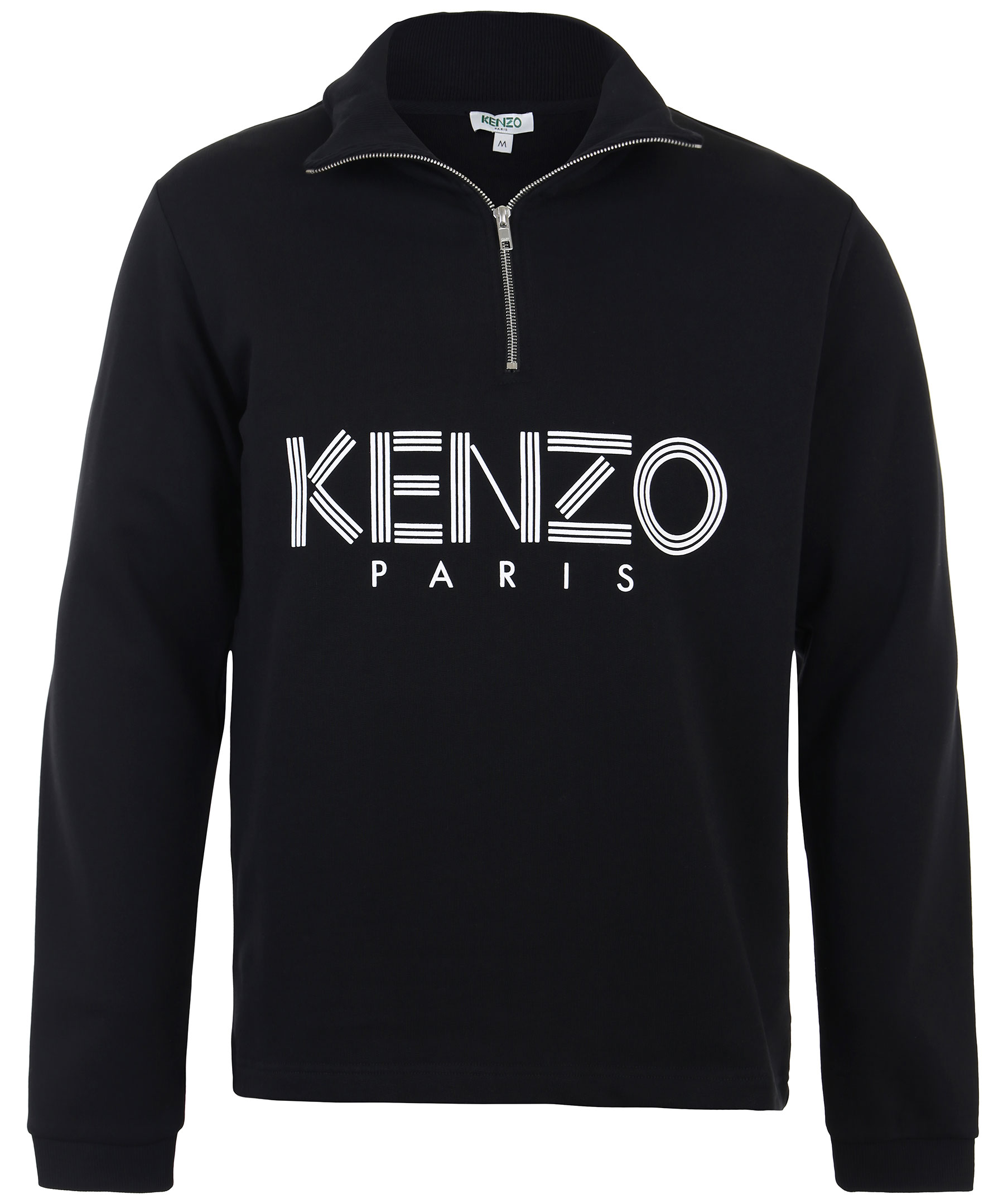Svart sweatshirt från Kenzo tillverkad i bomull. Tröjan har en högkrage med half zip. Vit logotyp på bröstet och ribbstickade muddar vid ärmslut. Modellen är 186 cm lång och bär storlek M.