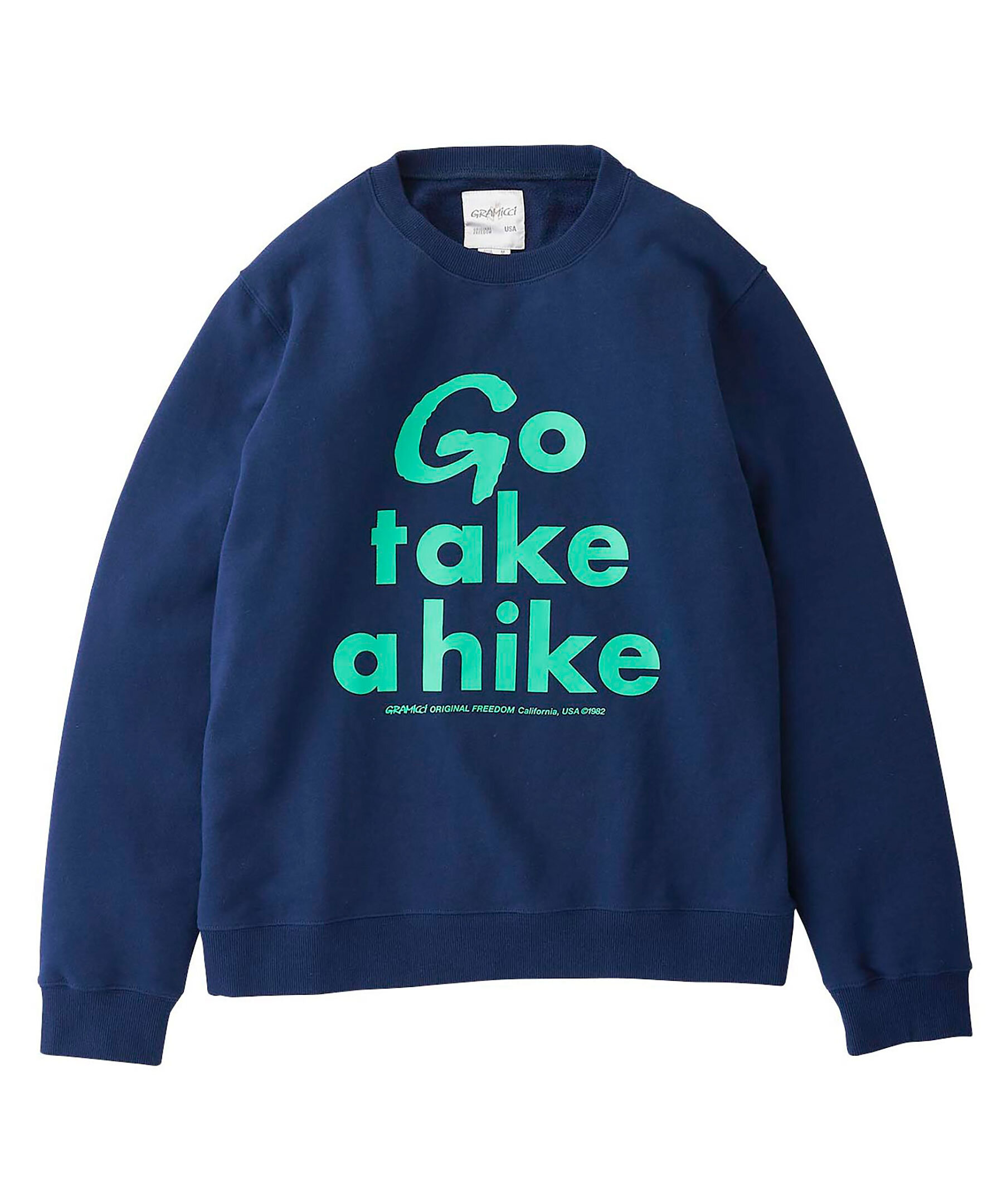 Marinblå sweatshirt från Gramicci gjord i 100% bomull. Stor grön tryck med texten "Go take a hike" på framsidan av tröjan. Ribbad halsring och muddar vid ärm och plaggslut.