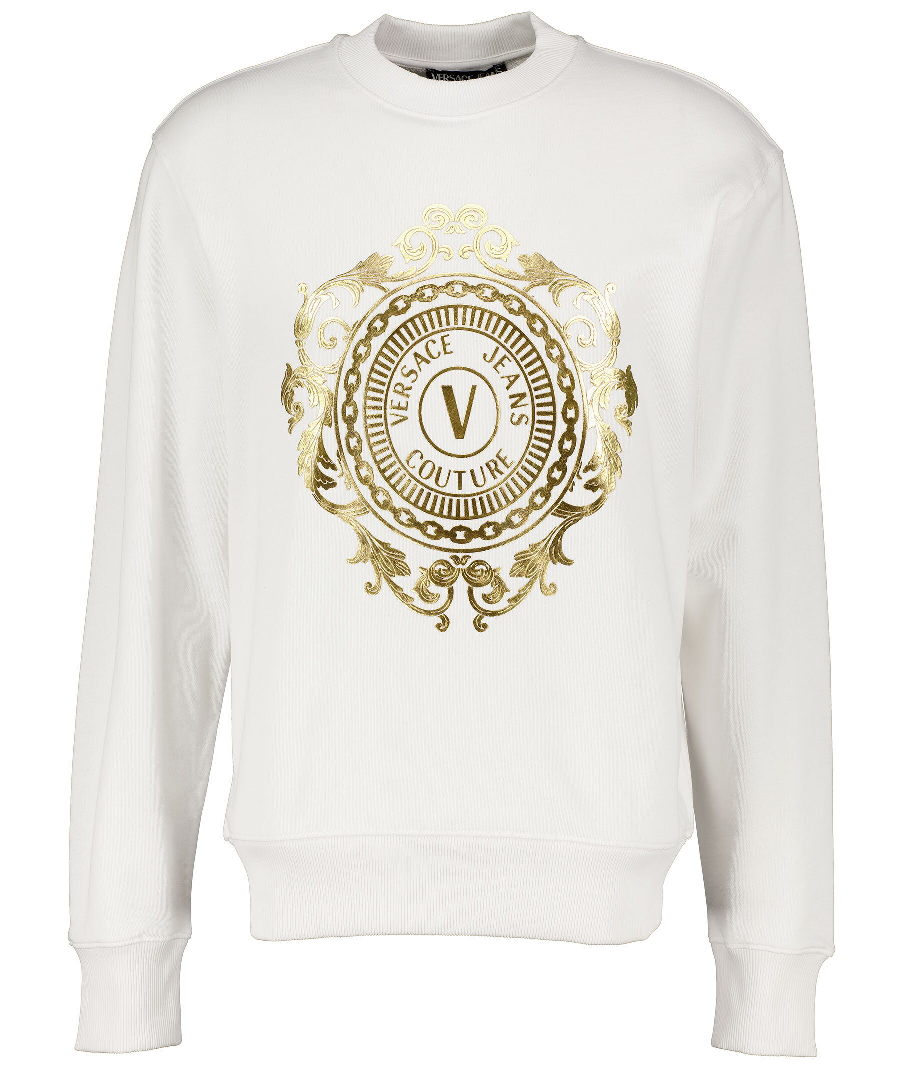 Vit sweatshirt från Versace Jeans Couture gjord i 100% bomull. Guldfärgad rokoko inspirerat mönster tryckt på bröstet och rundad hals.