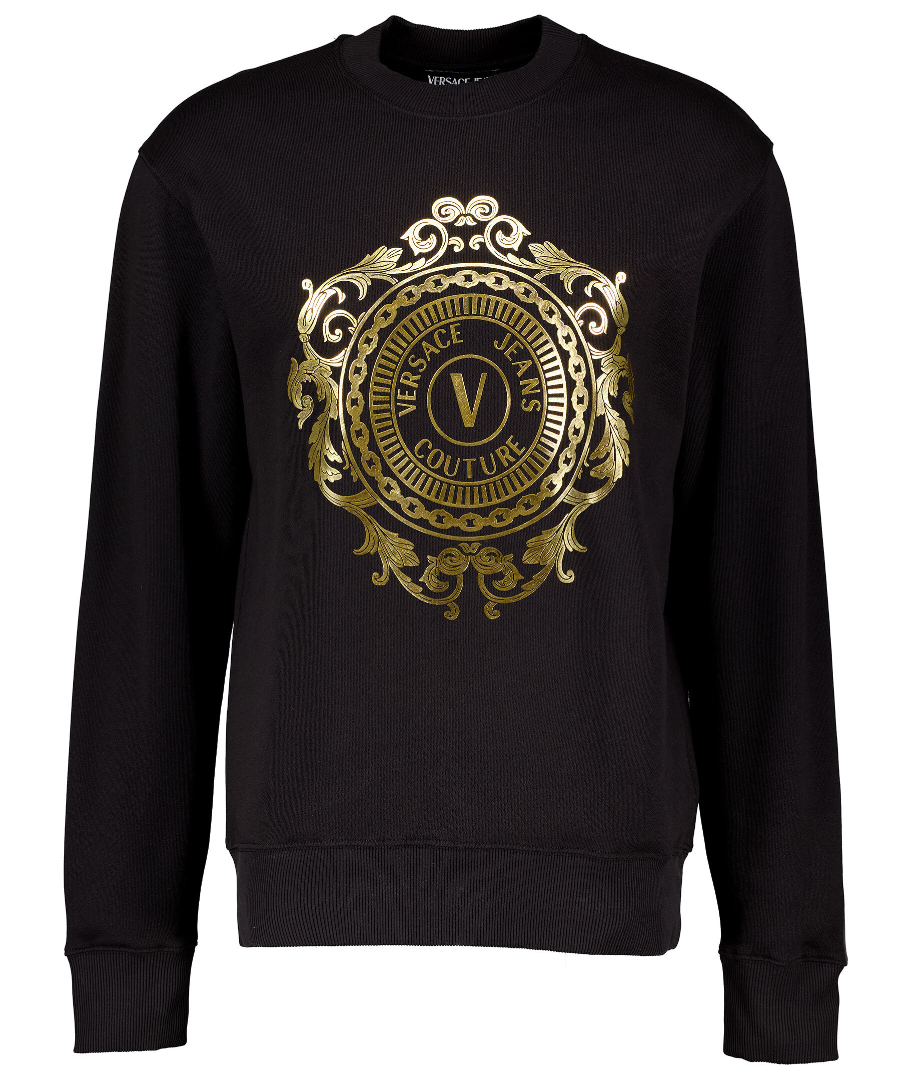 Svart sweatshirt från Versace Jeans Couture gjord i 100% bomull. Guldfärgad rokoko inspirerat mönster tryckt på bröstet och rundad hals.