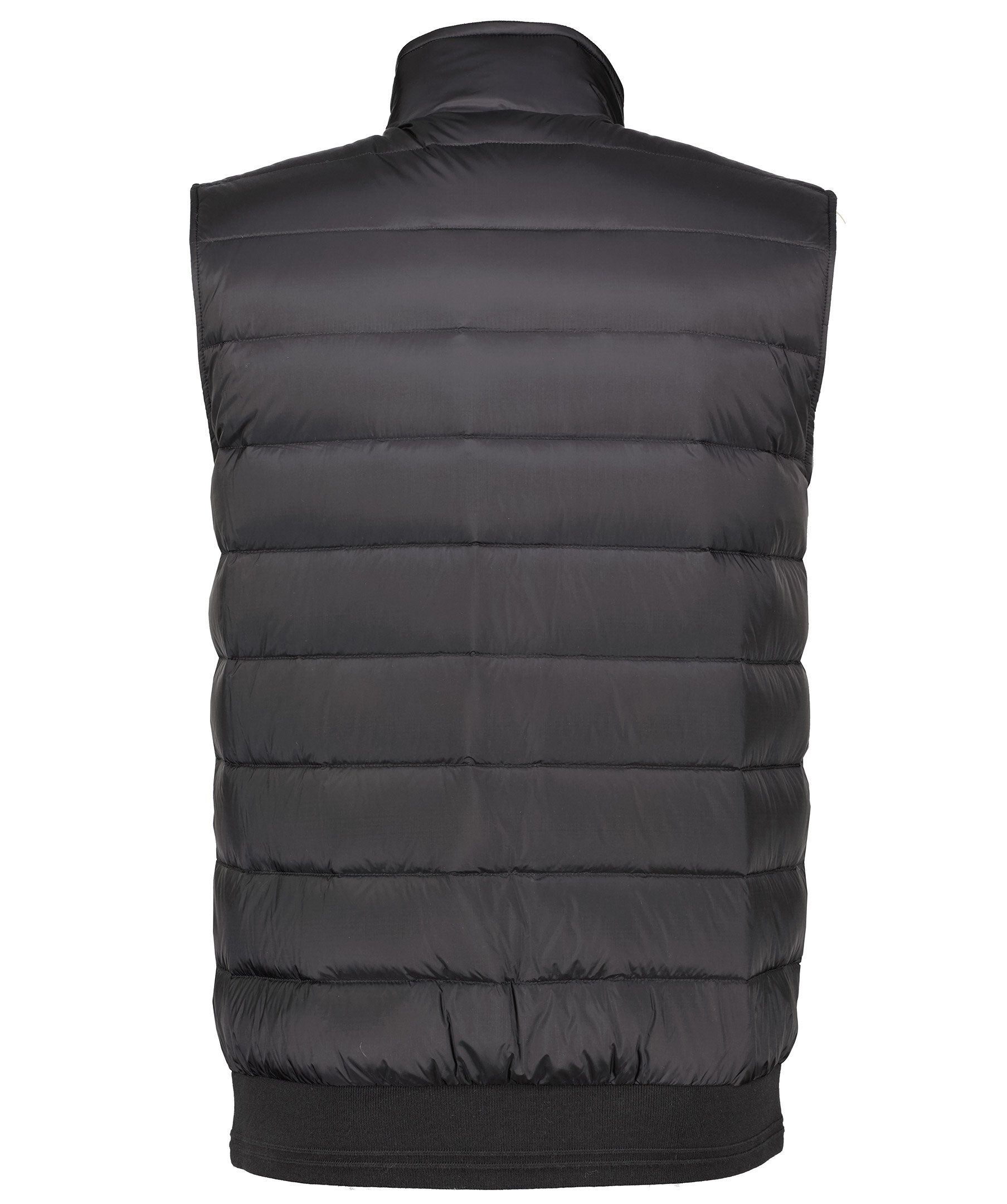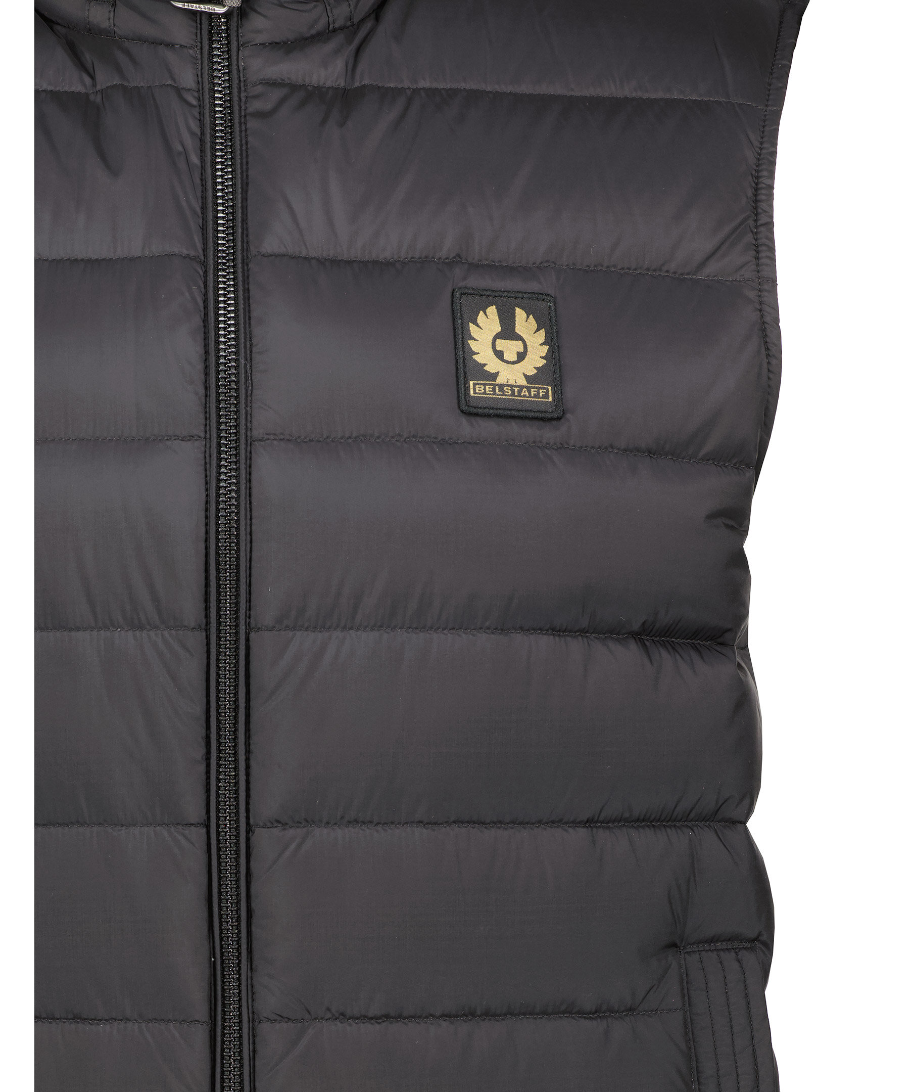 Svart väst i lättviktsdun från Belstaff. Tillverkad av vattenavvisande nylontyg med en lätt dunfyllning och med hög densitet. Tvåvägsdragkedja fram, horisontell quiltning och justerbar krage med spänne. Dekorativa sömmar på framfickorna som stängs med tryckknapp. Ribbstickad fåll och ärmar med dold, tunn mudd. Broderad patch på vänster ärm med logotyp.