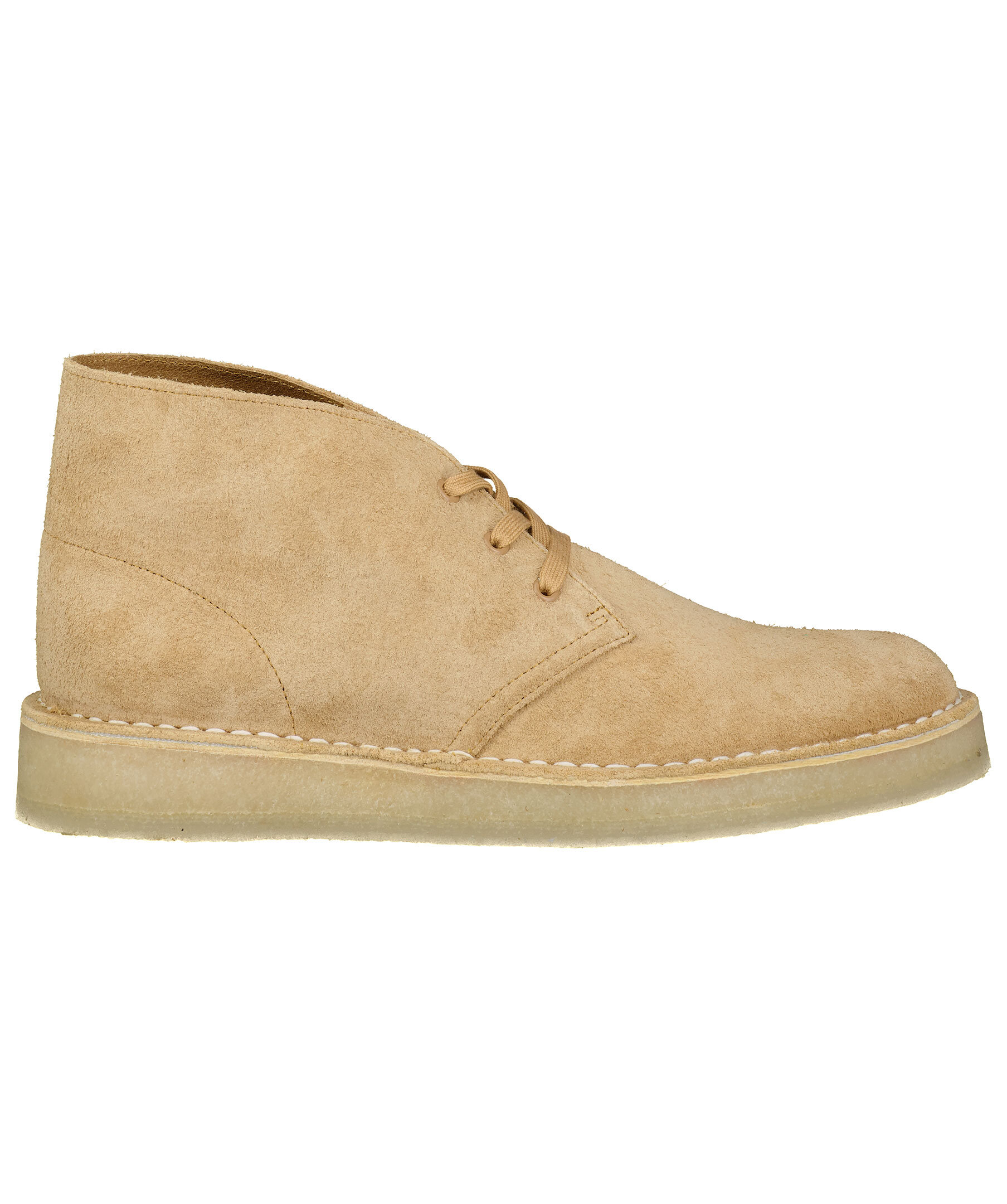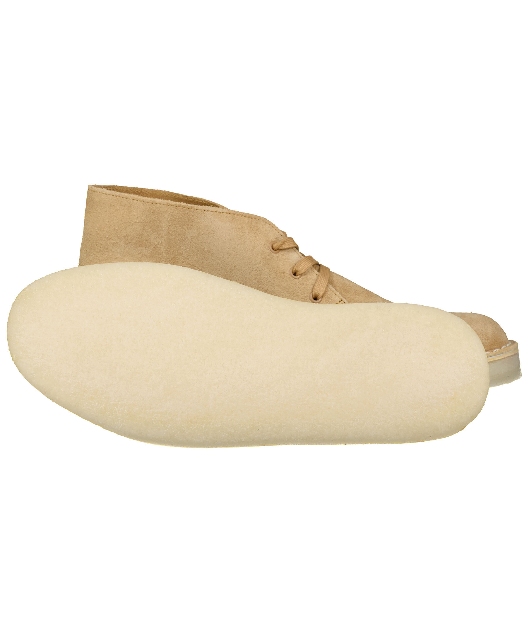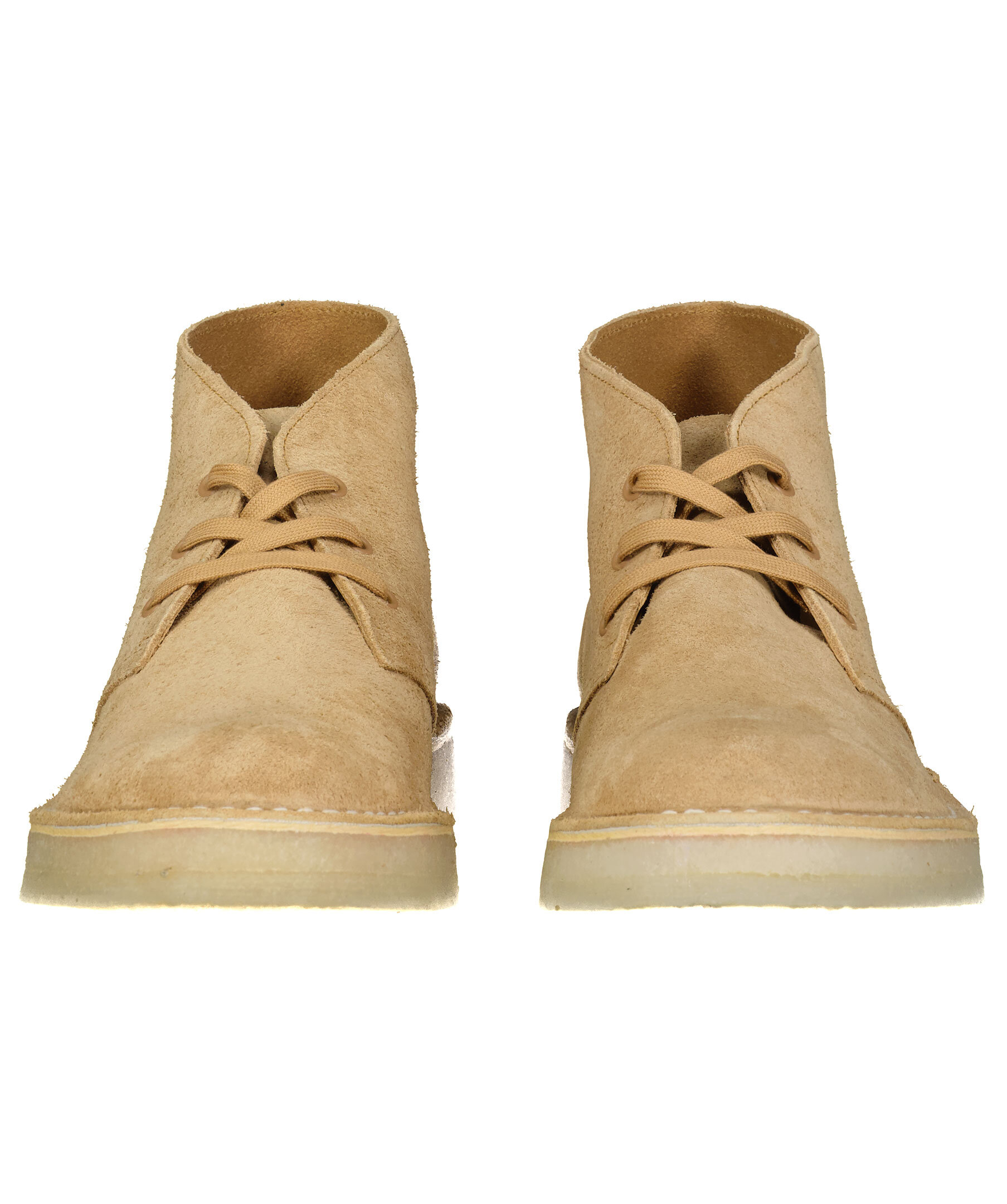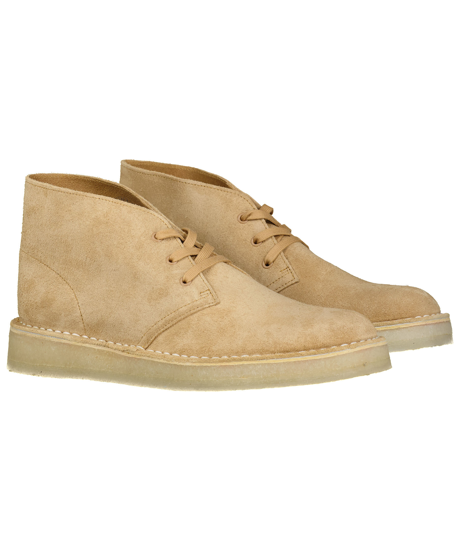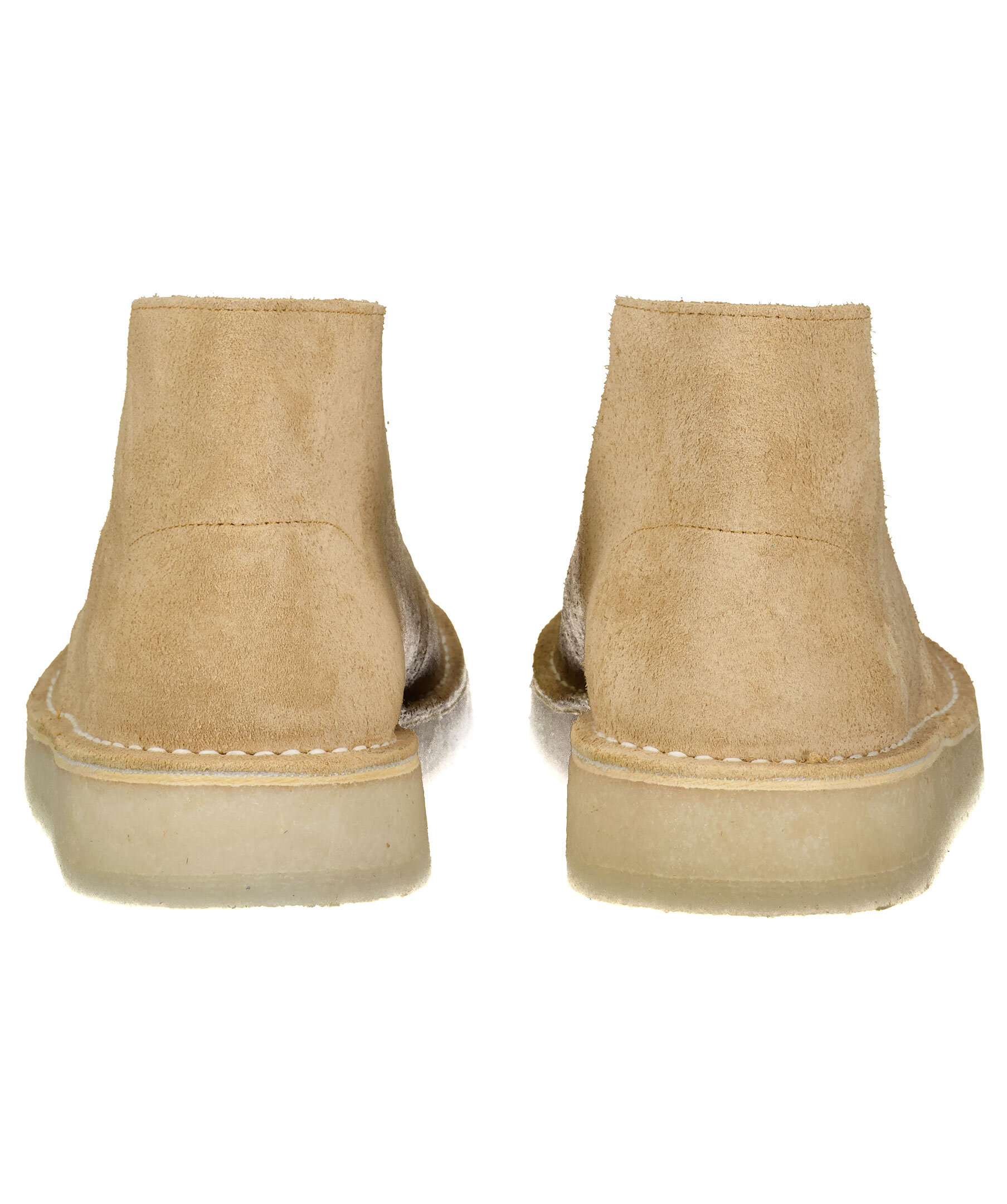 Sandfärgade mockaboots med crepe-sula med liten klack från Clarks.