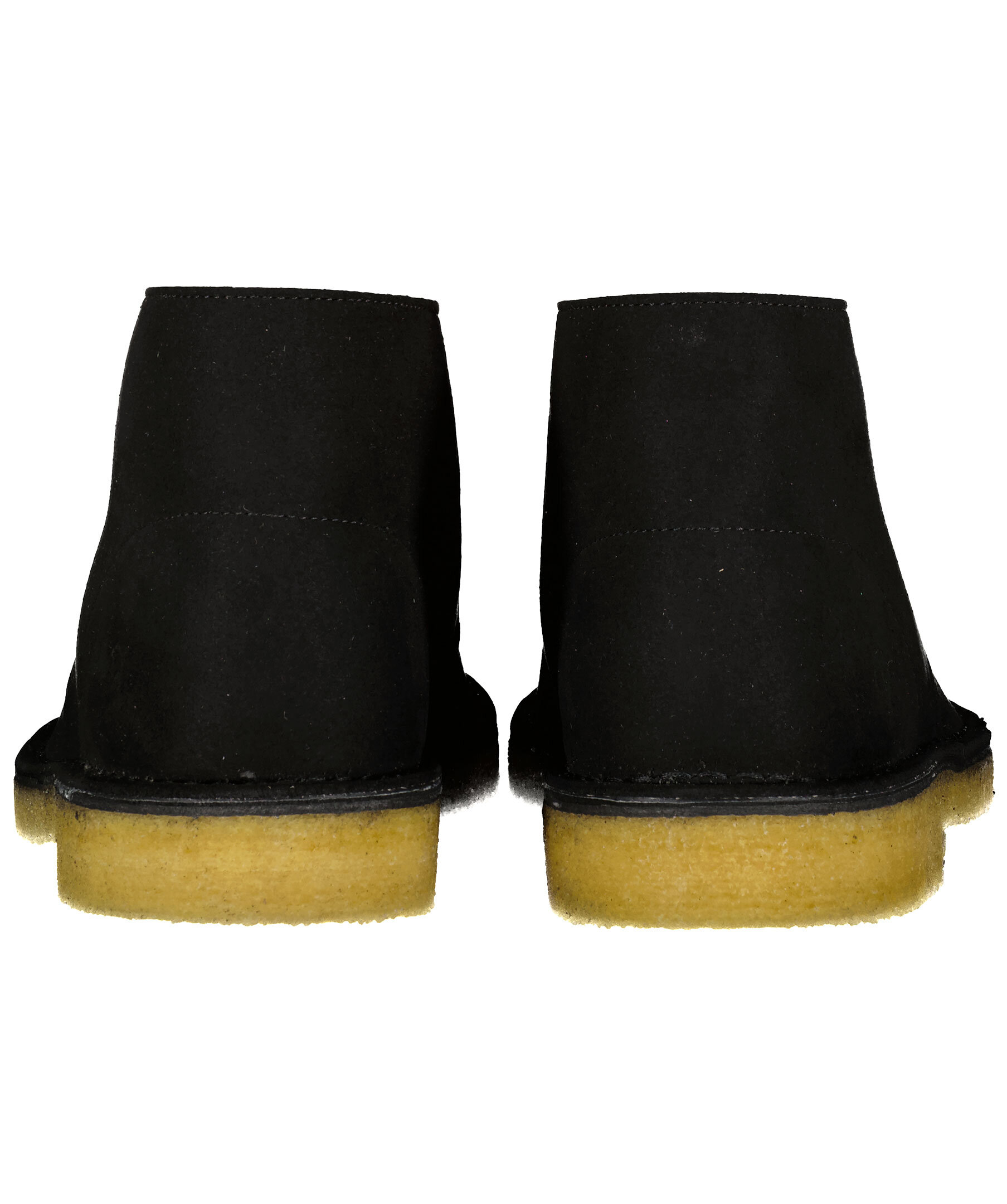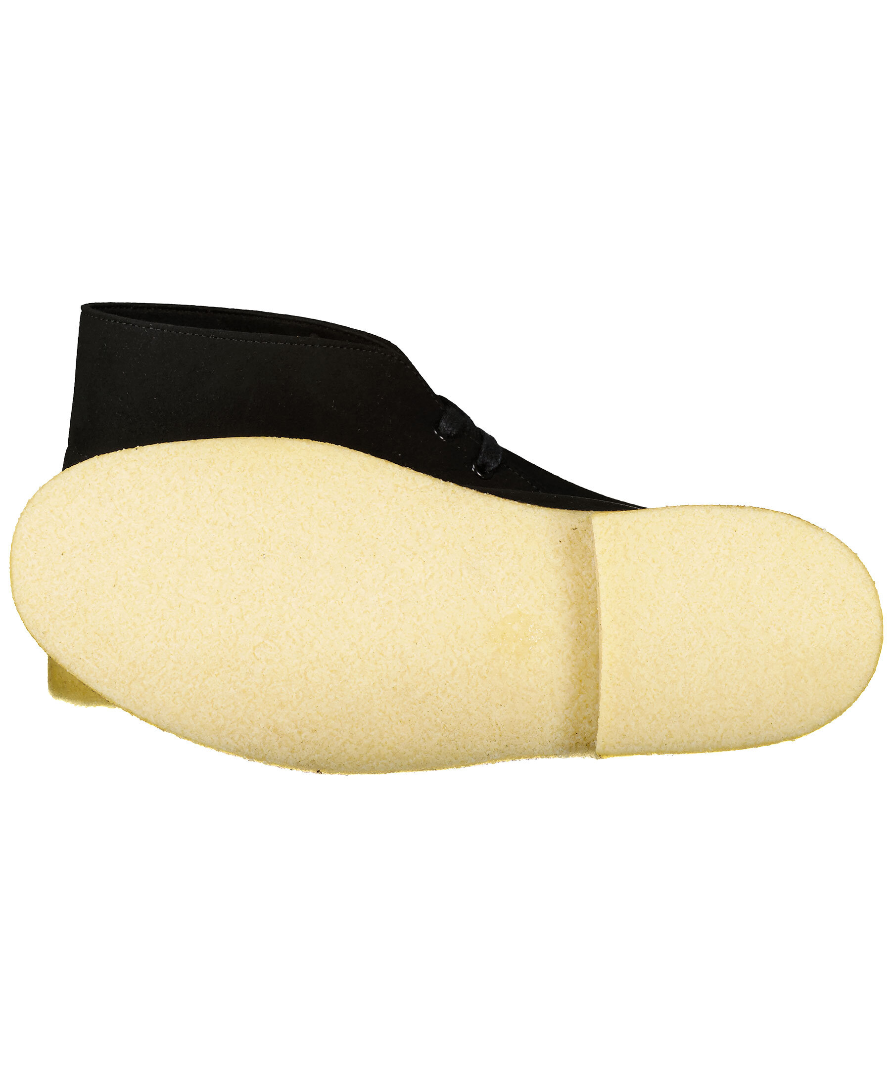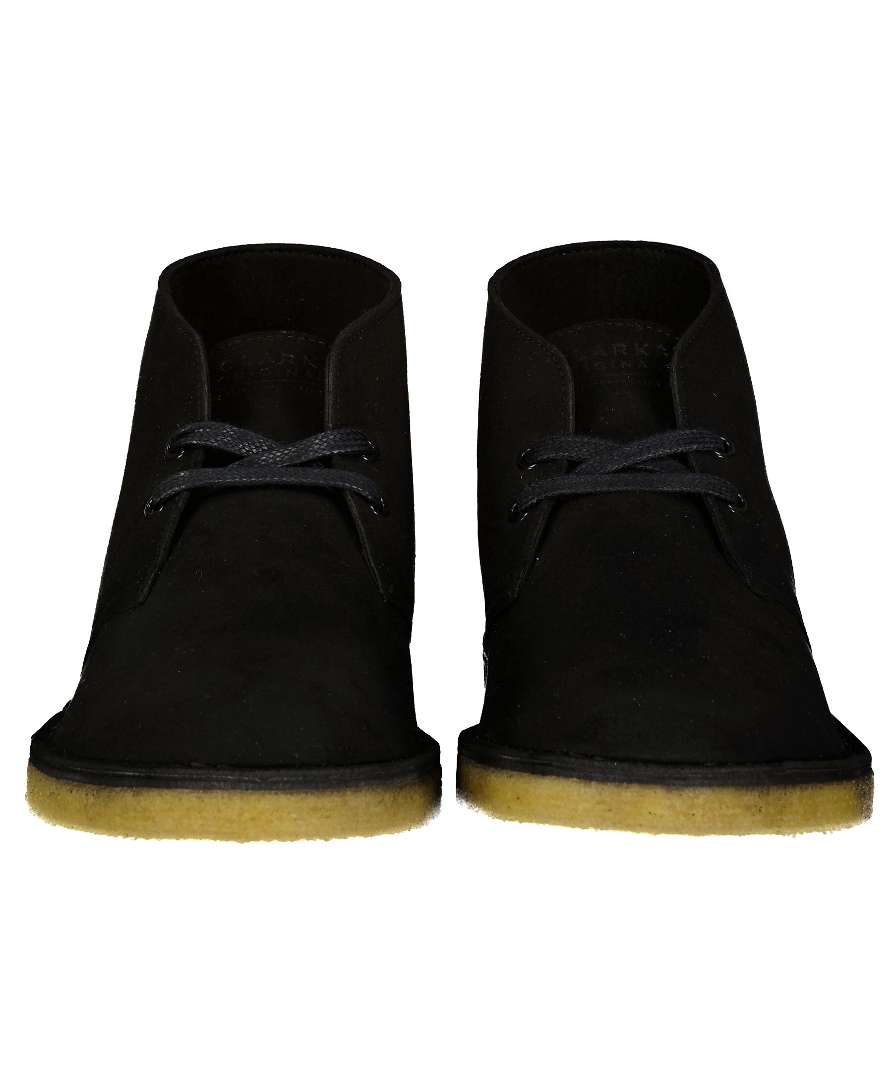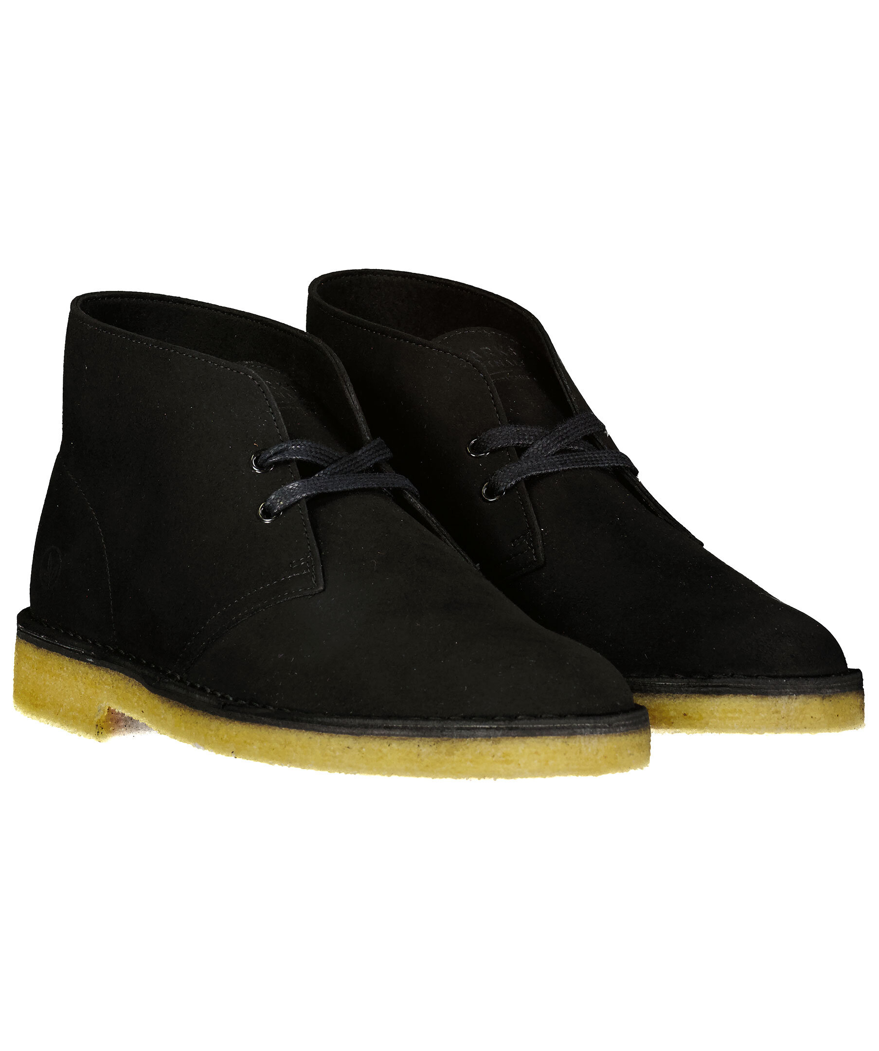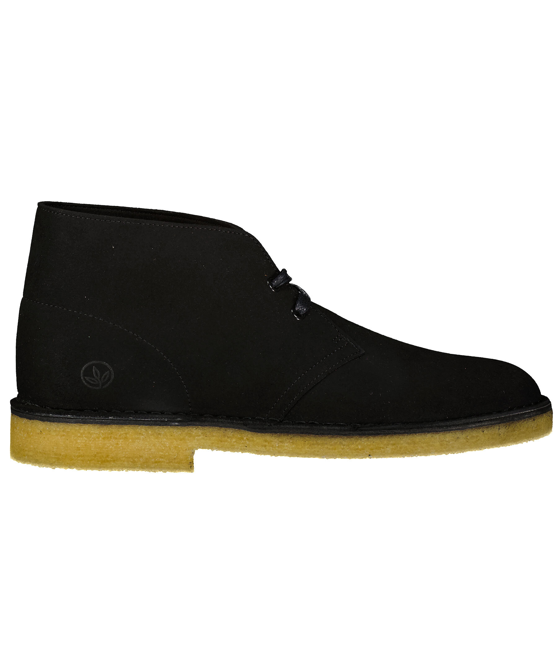 Svarta mockaboots med beige crepe-sula med liten klack från Clarks. Svarta, dressade skosnören, svartvita i sportigare design medföljer. På utsidan vid hälen är tryckt en cirkel med ett blad i.