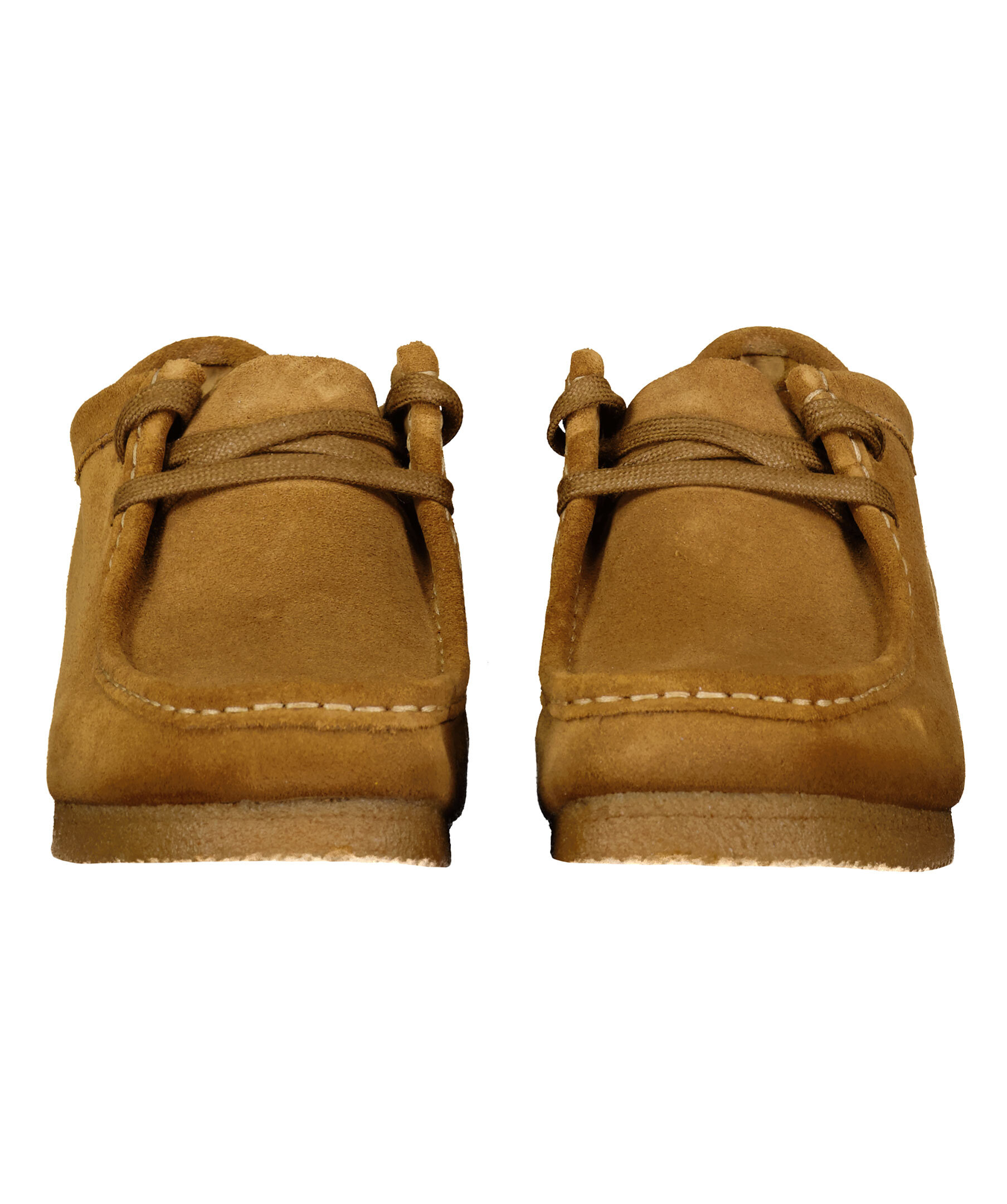 Bruna mockaboots i Clarks klassiska Wallabee-modell. Skorna har enkla och rena linjer och en tjockare, ljust beige crepe-sula. Skorna har tvåhålssnörning med brunt skosnöre.