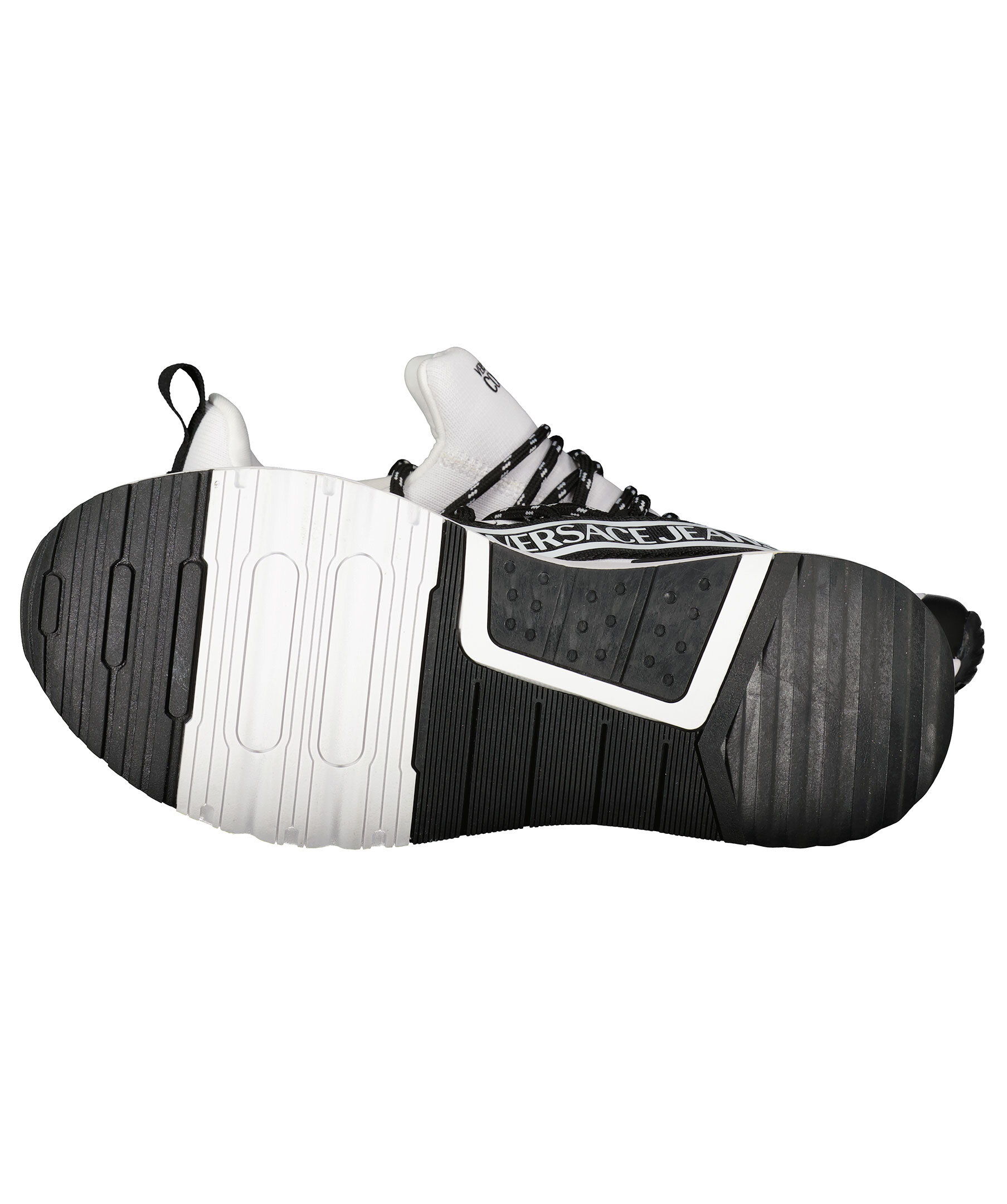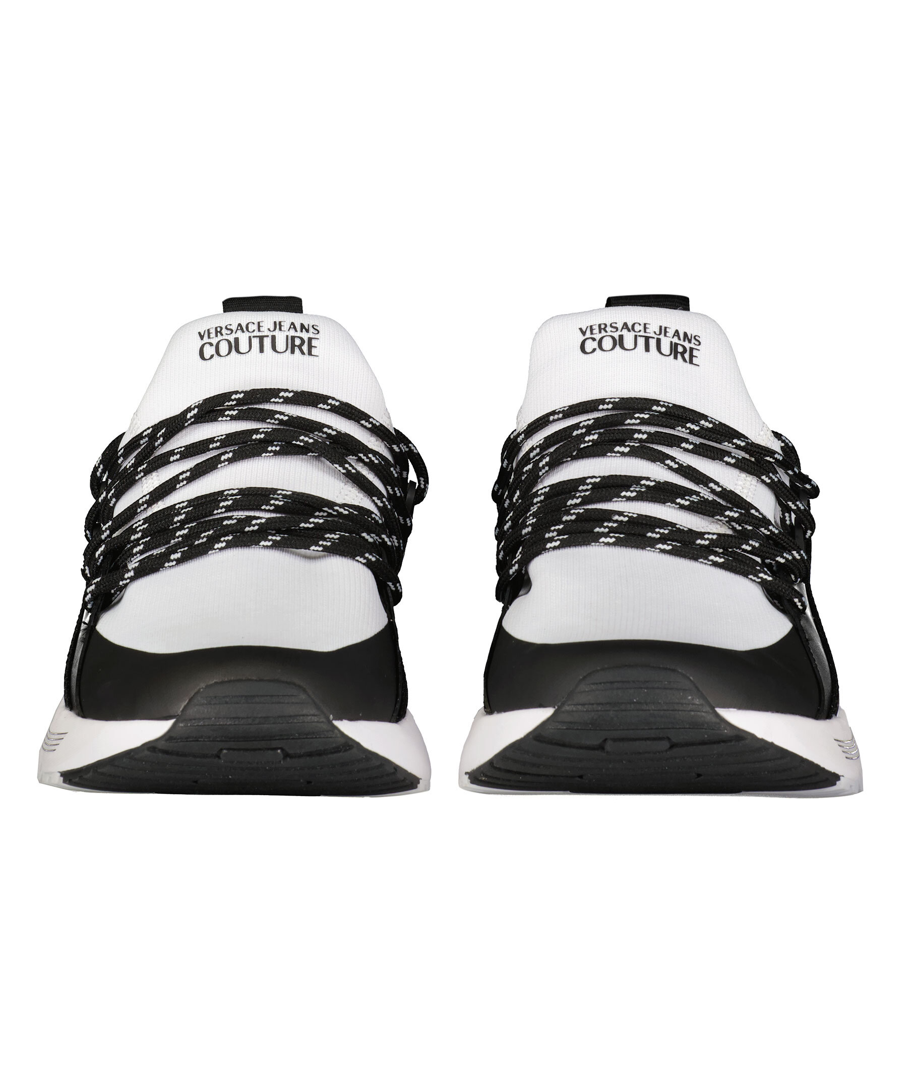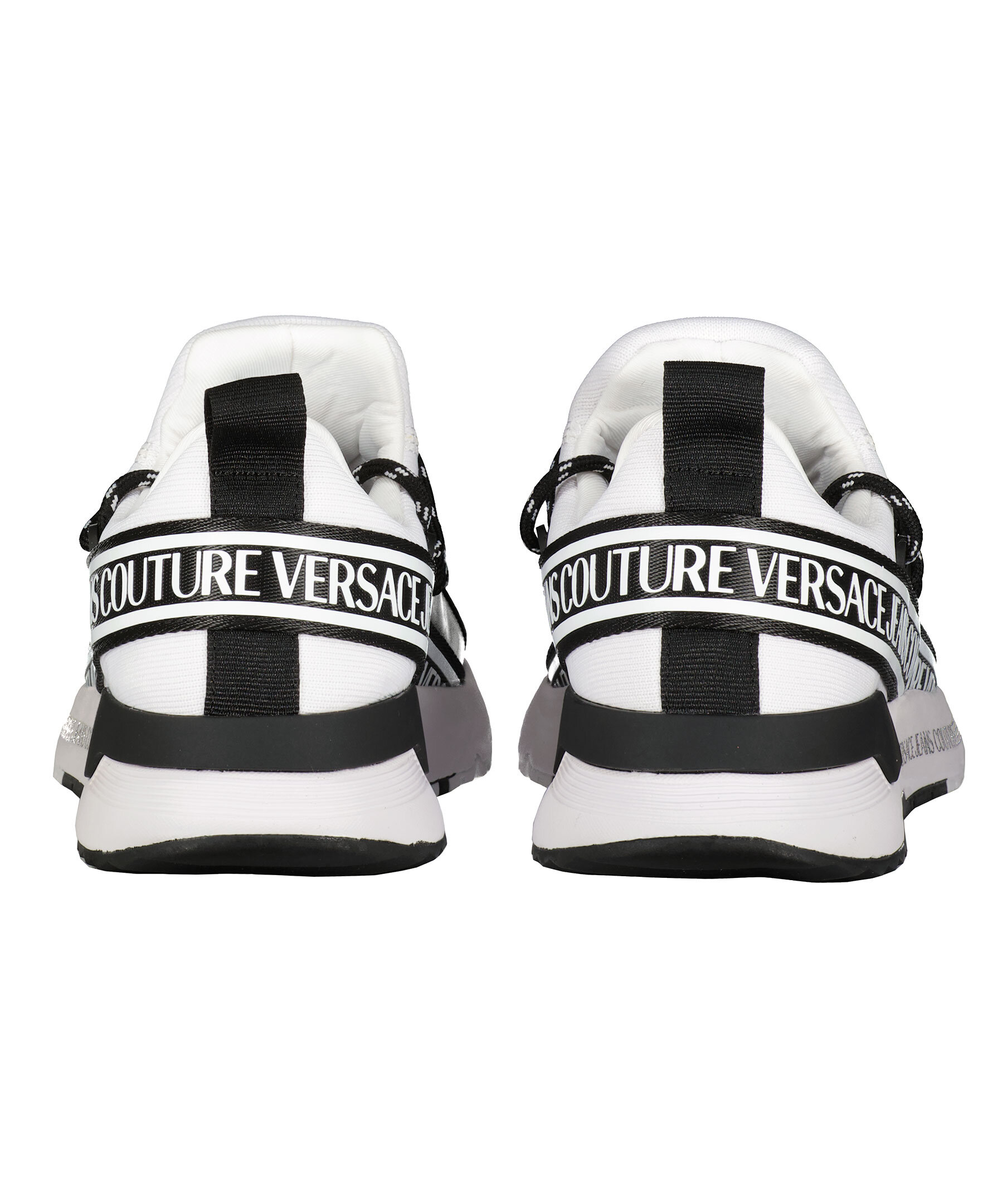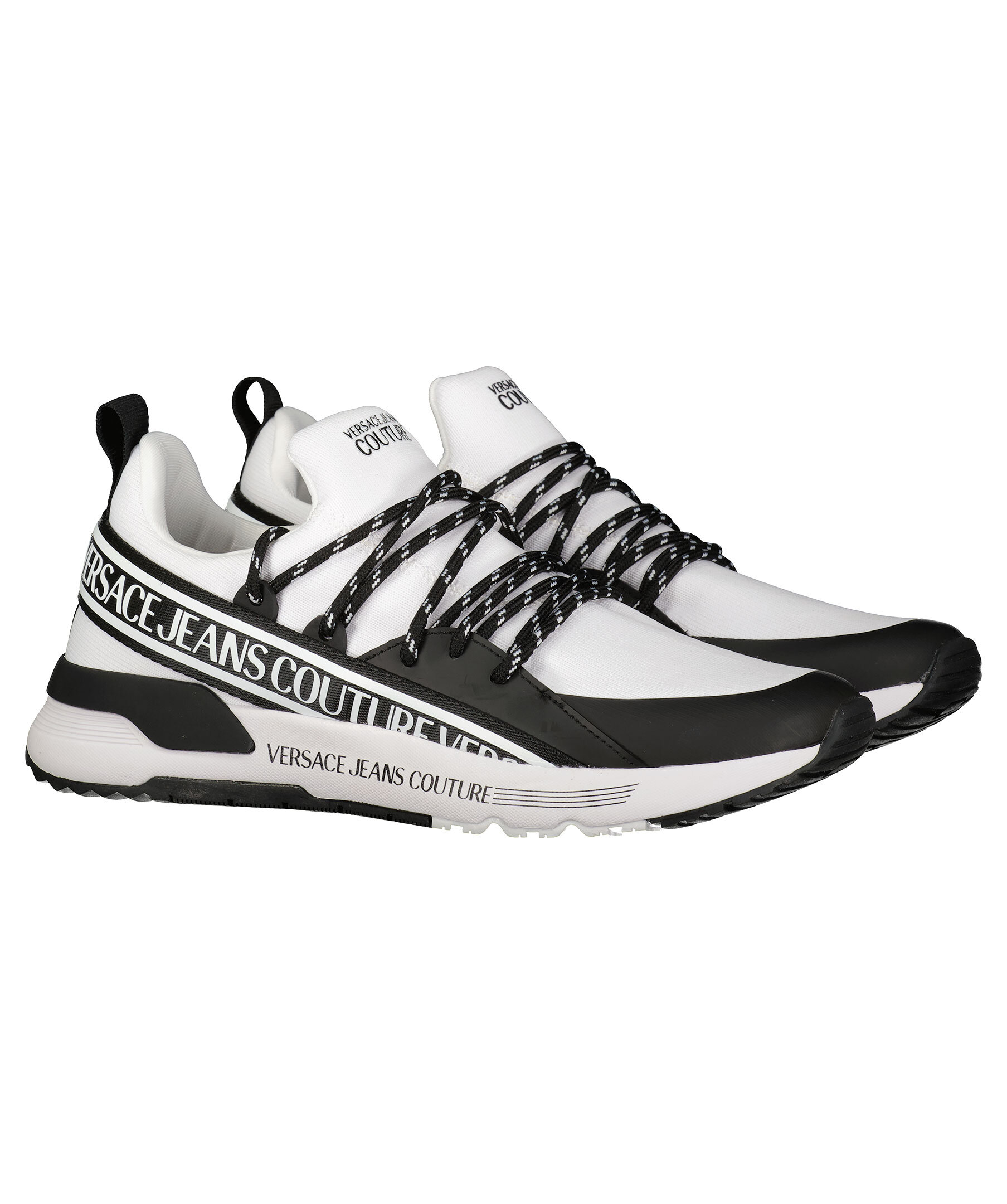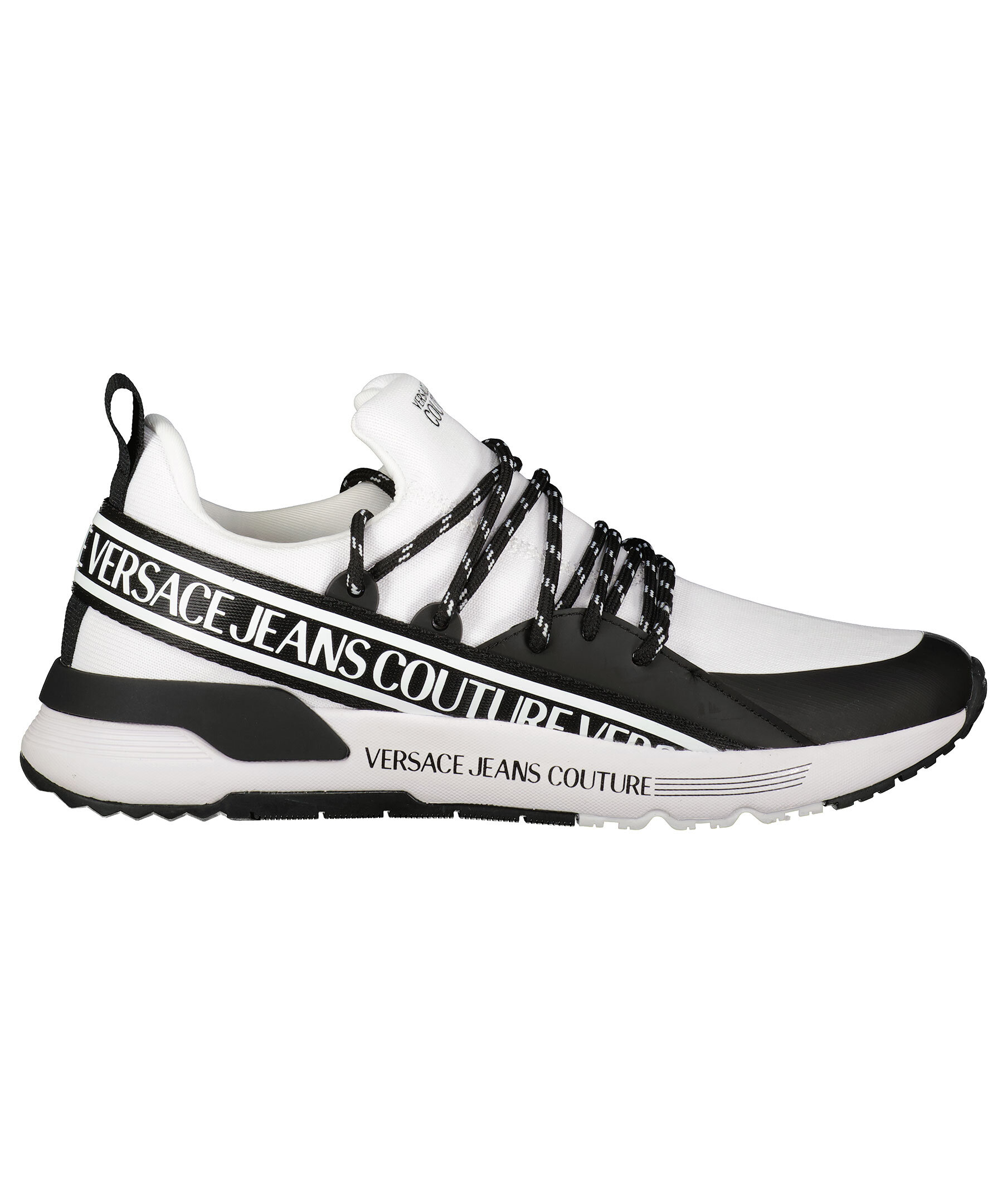 Vita sneakers med svarta detaljer från Versace Jeans Couture. Detaljer i textil och gummi. Svart band med vita logotyper på som sträcker sig från den ena sidan, bak runt hälen och till den andra sidan. Logotyp på skons sula på utsidorna samt på plös. Medelhög, vit sula med svarta detaljer i gummi. svart skosnöre med vitt mönster.