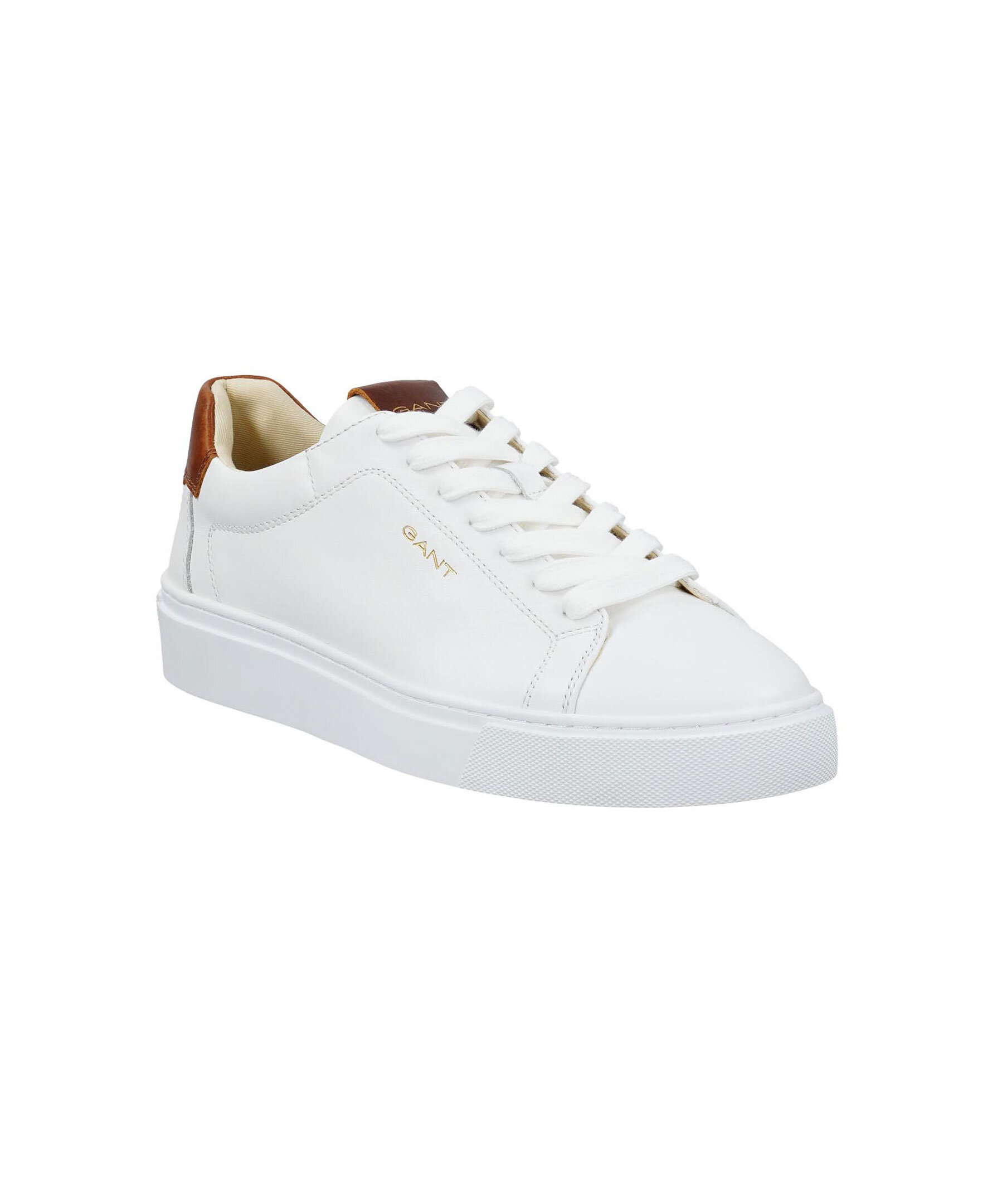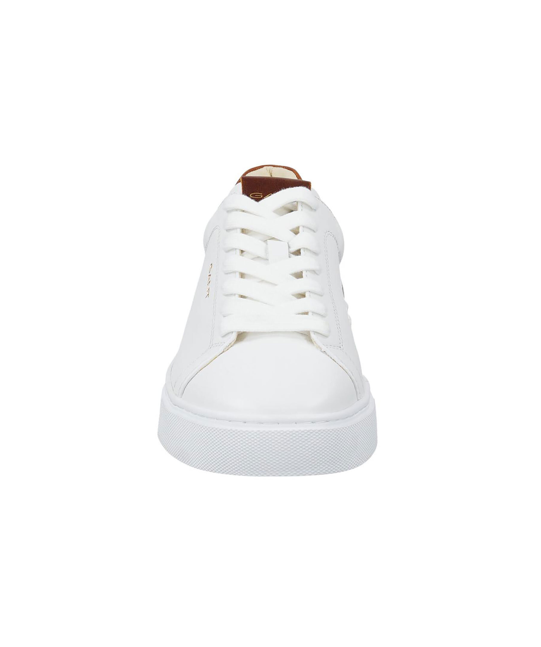 Vita sneakers i läder från Gant Footwear. Skorna har bruna detaljer i läder, röd undersida samt logotyp på plösen, utsidan och hälen.