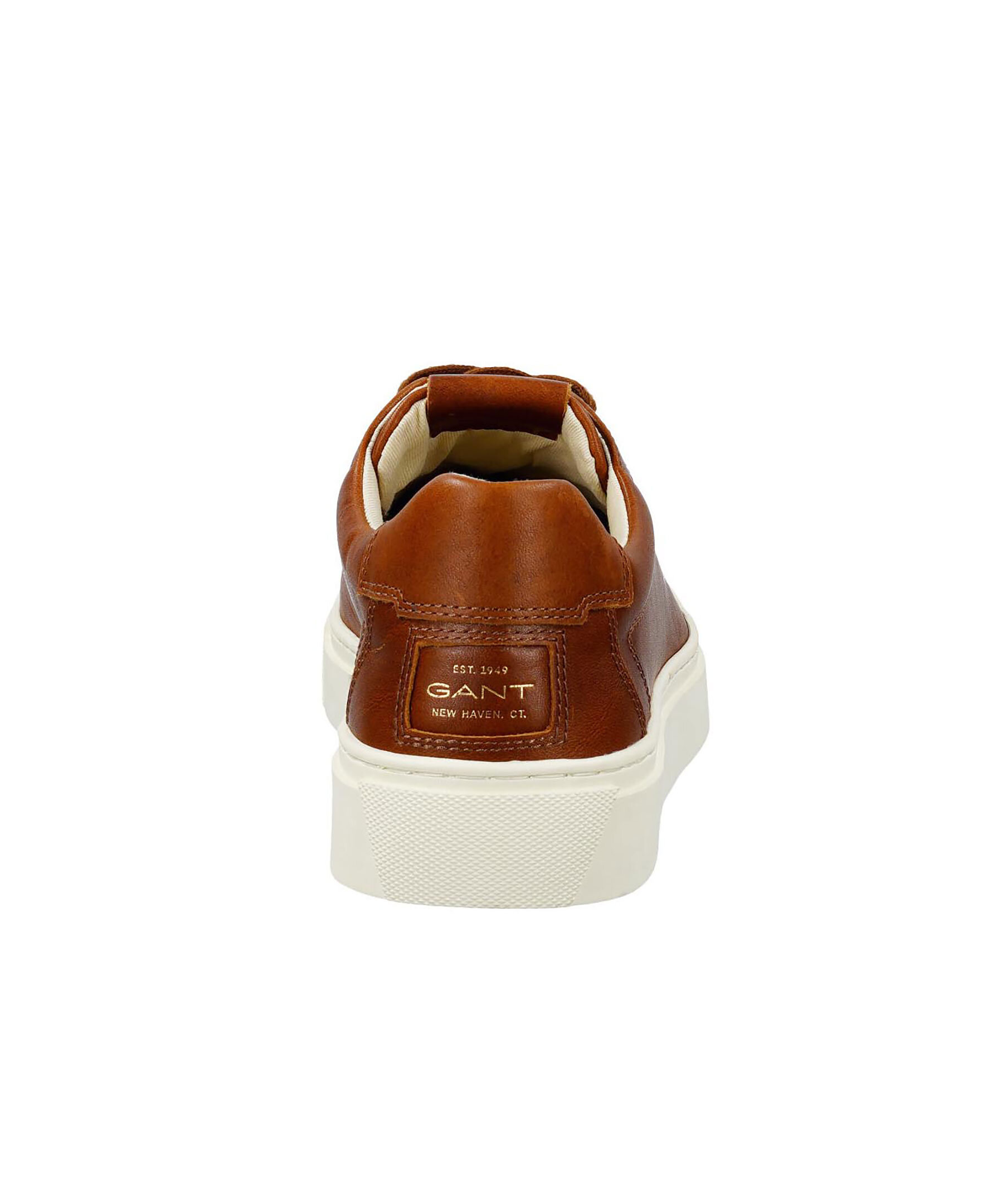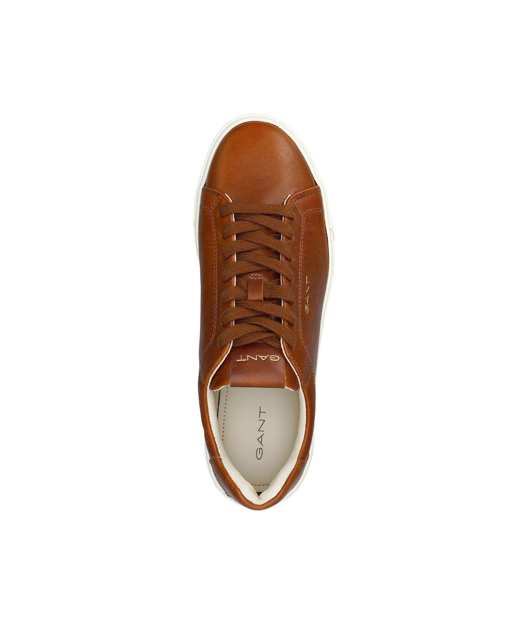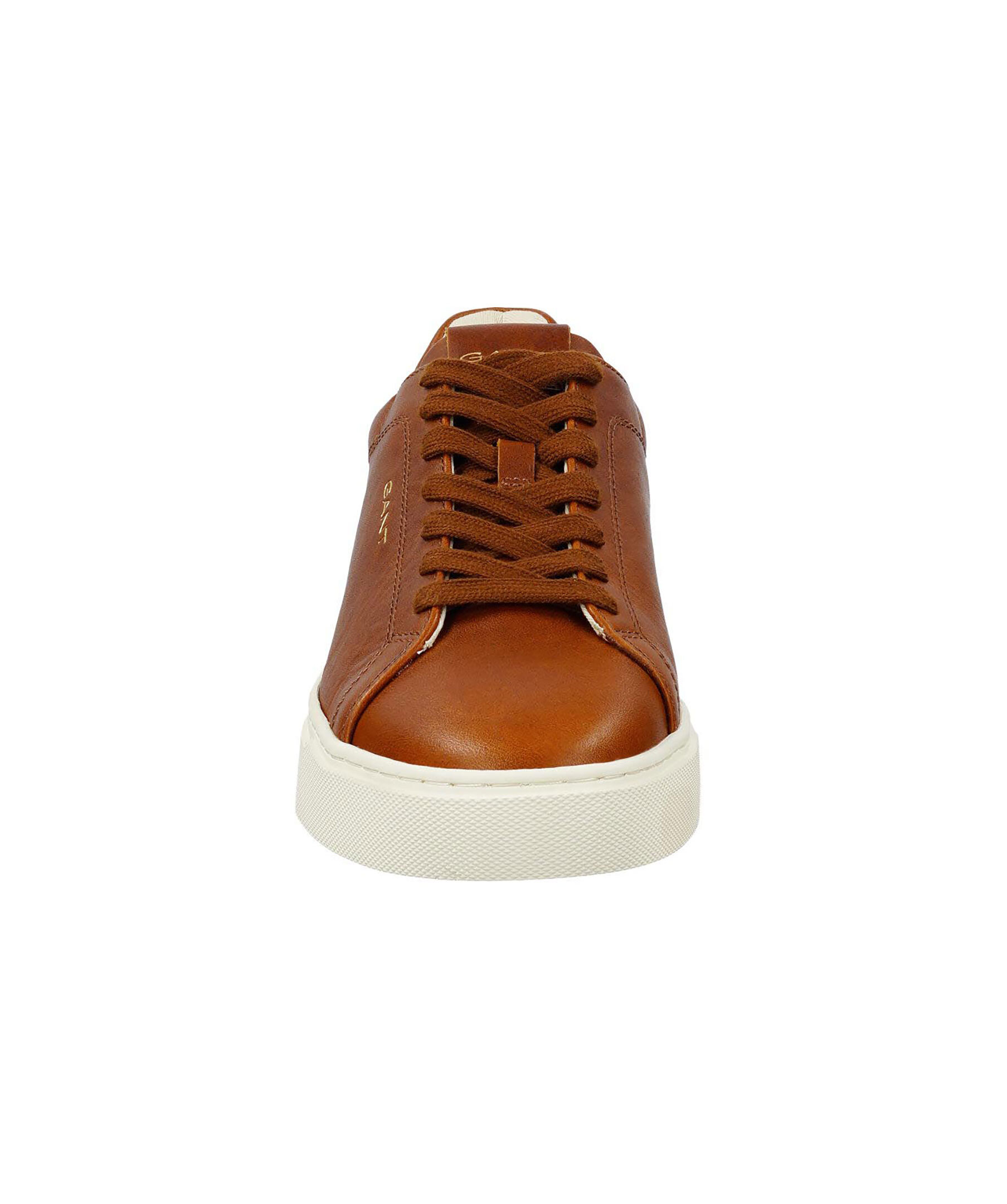 Konjakfärgade sneakers i läder från Gant Footwear. Skorna har beige sula, röd undersida samt logotyp på plösen, utsidan och hälen.