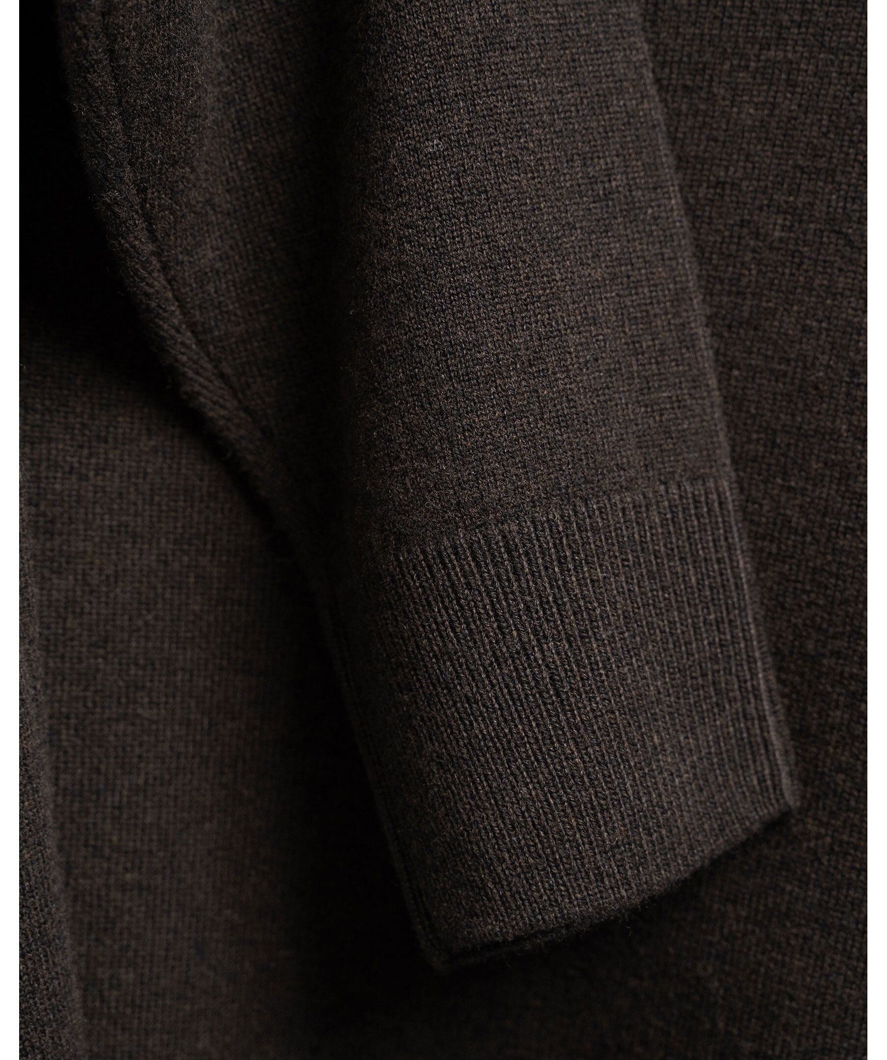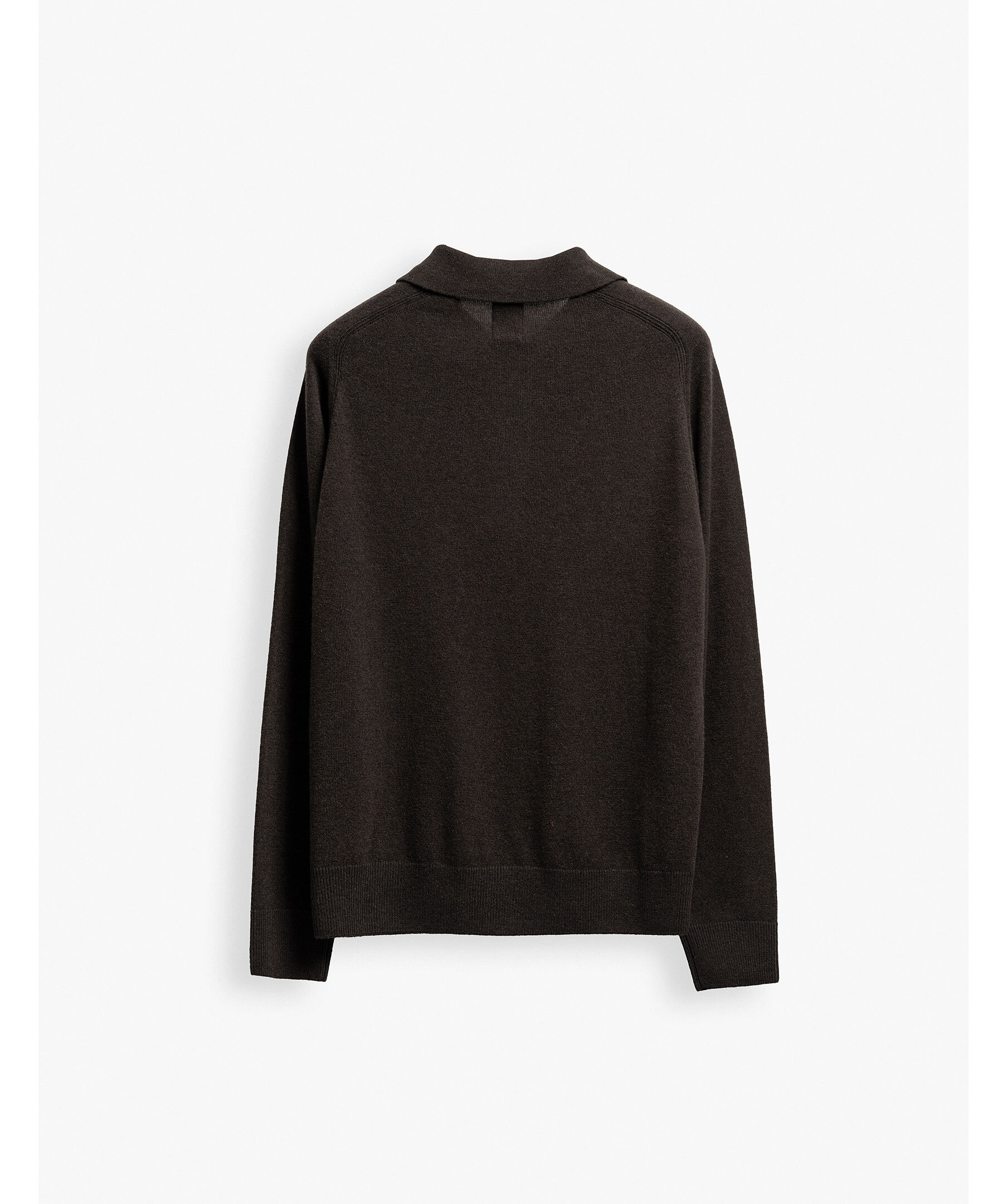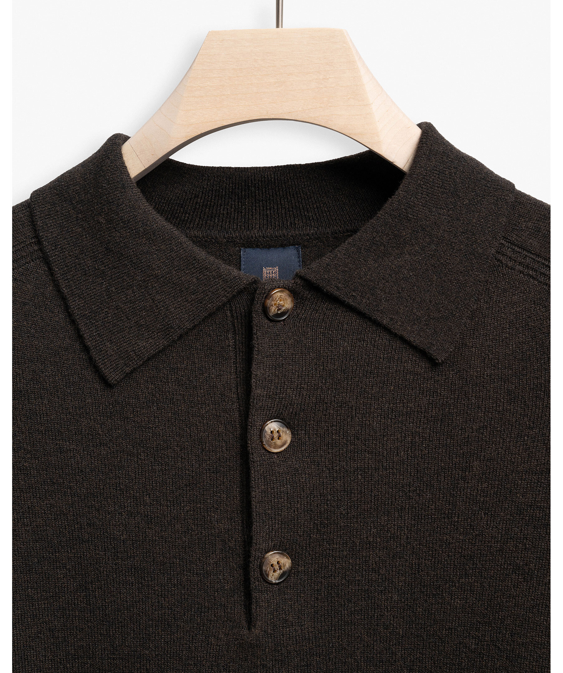 Elegant mörkbrun finstickad tröja med tenniskrage och knappslå från varumärket 1797. Tröjan har en stilren sadelärmskonstruktion och är tillverkad i en exklusiv italiensk garnblandning av merinoull och kashmir – för en extra mjuk och lyxig känsla.