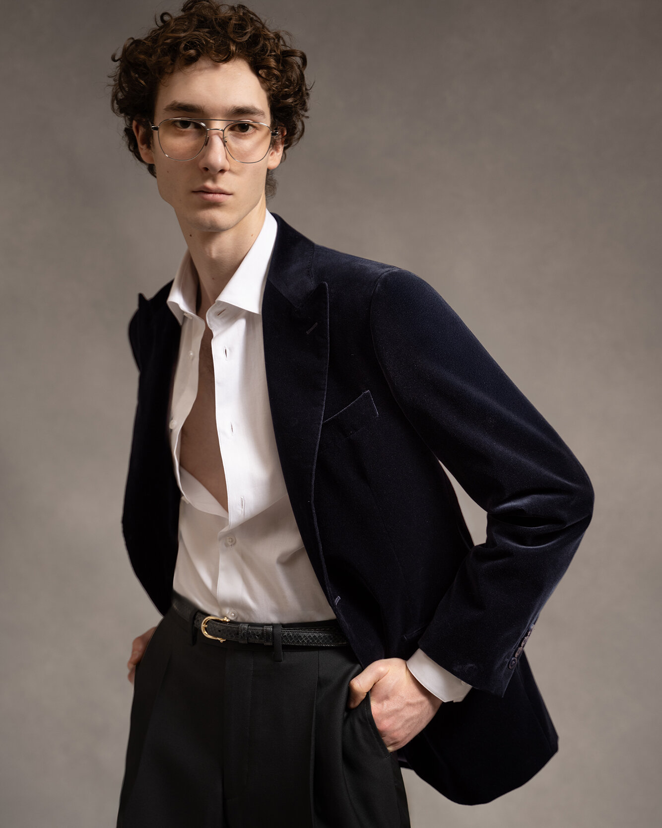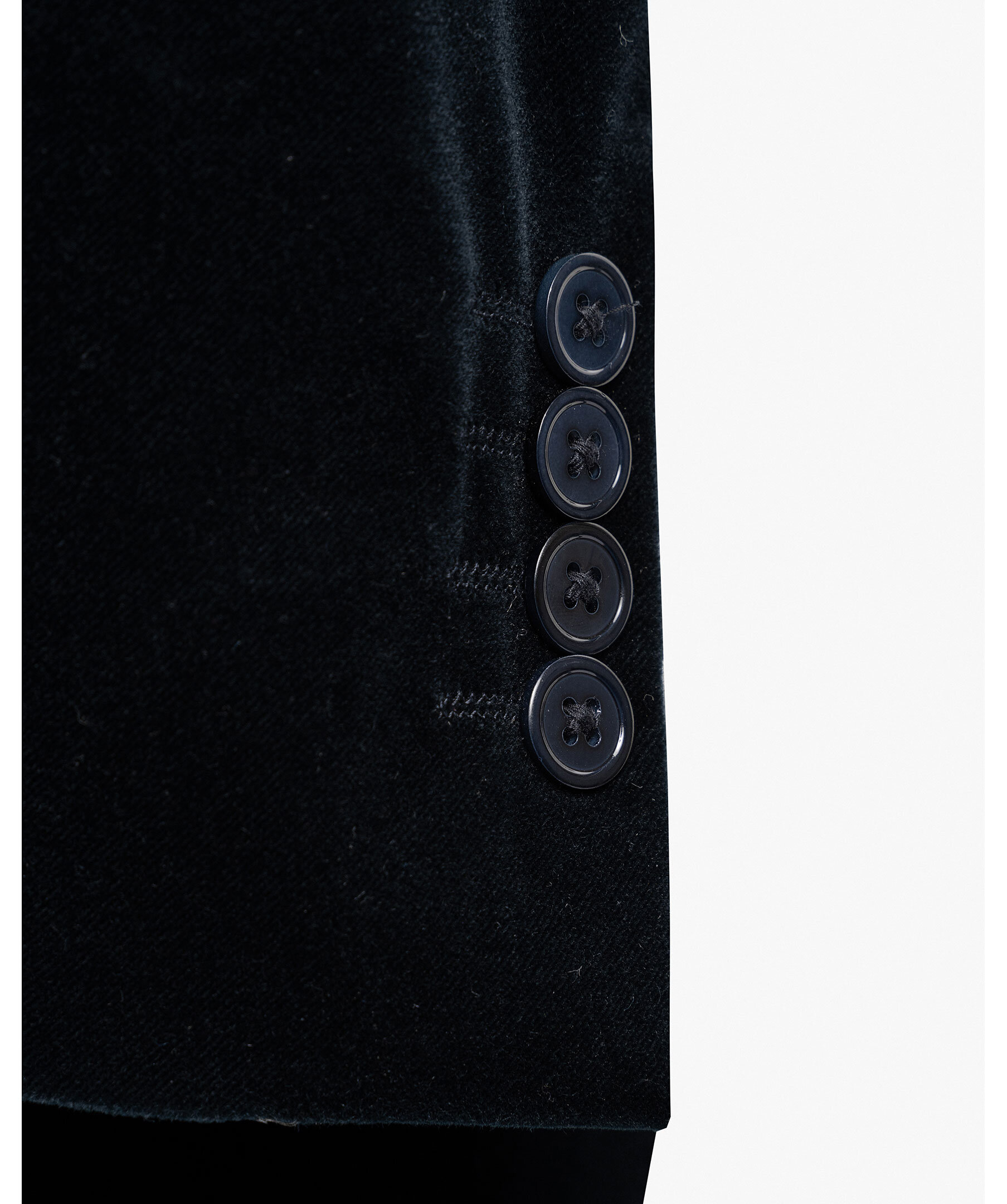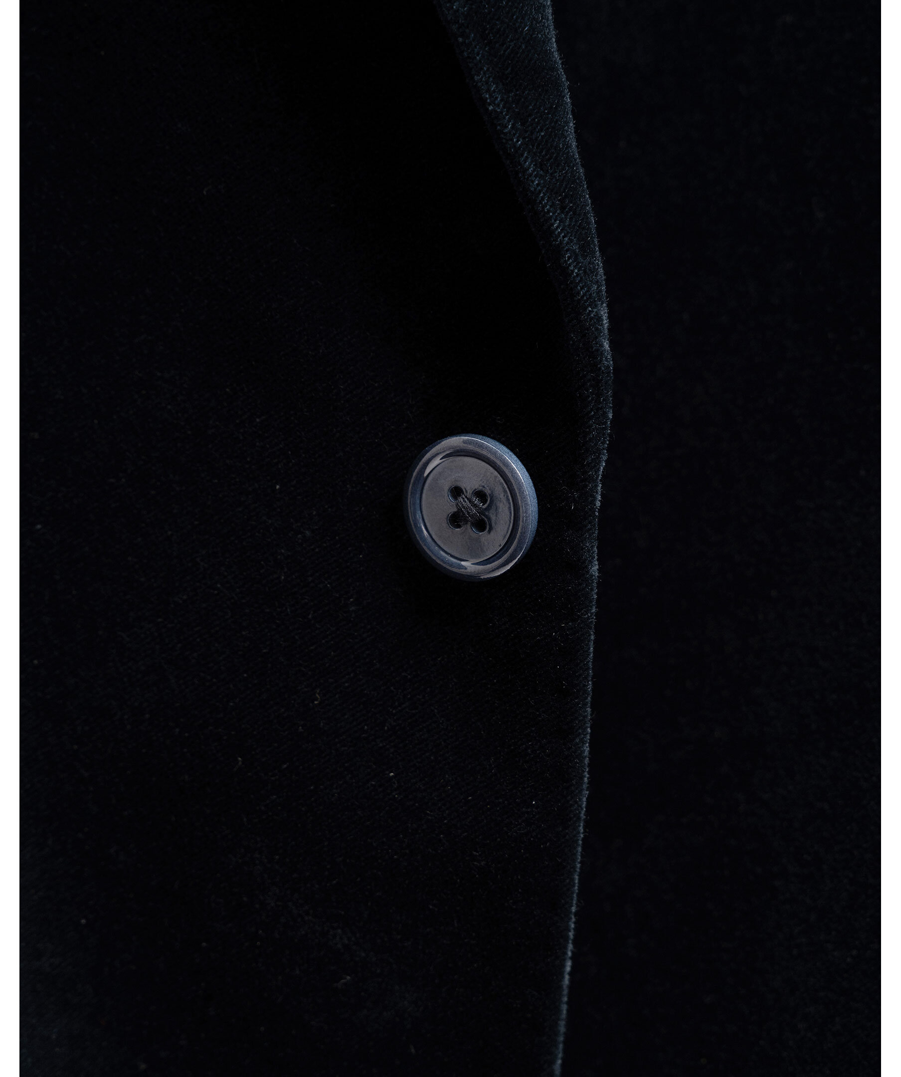 Elegant, enkelknäppt kavaj i mörkblå sammet från varumärket 1797. Kavajen har spetsiga slag, två diskreta midjefickor, en bröstficka och dubbelt sprund baktill. Kavajen är utsmyckad med dekorativa AMF-stygn som ger en sofistikerad känsla samt knappar i pärlemor – en exklusiv detalj som lyfter helhetsintrycket.