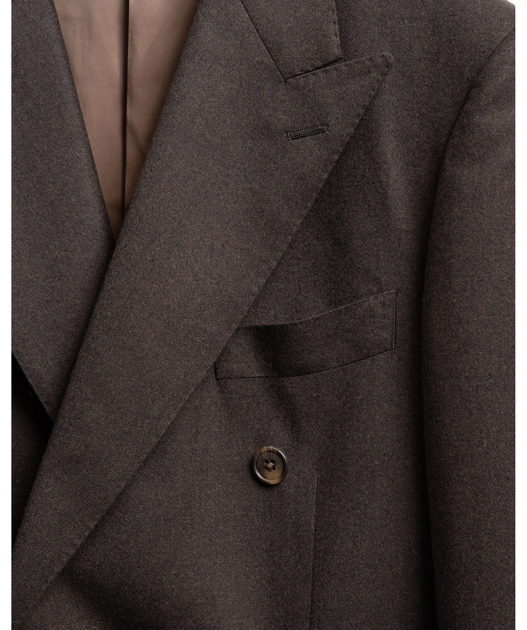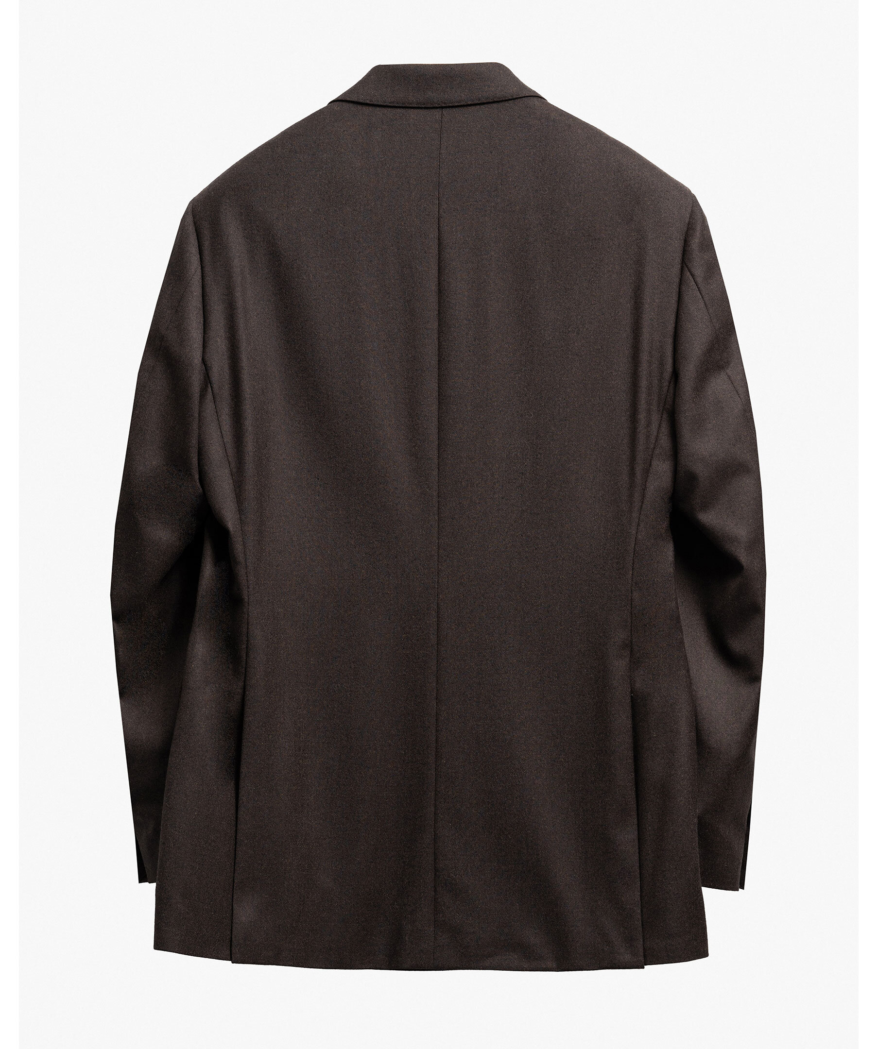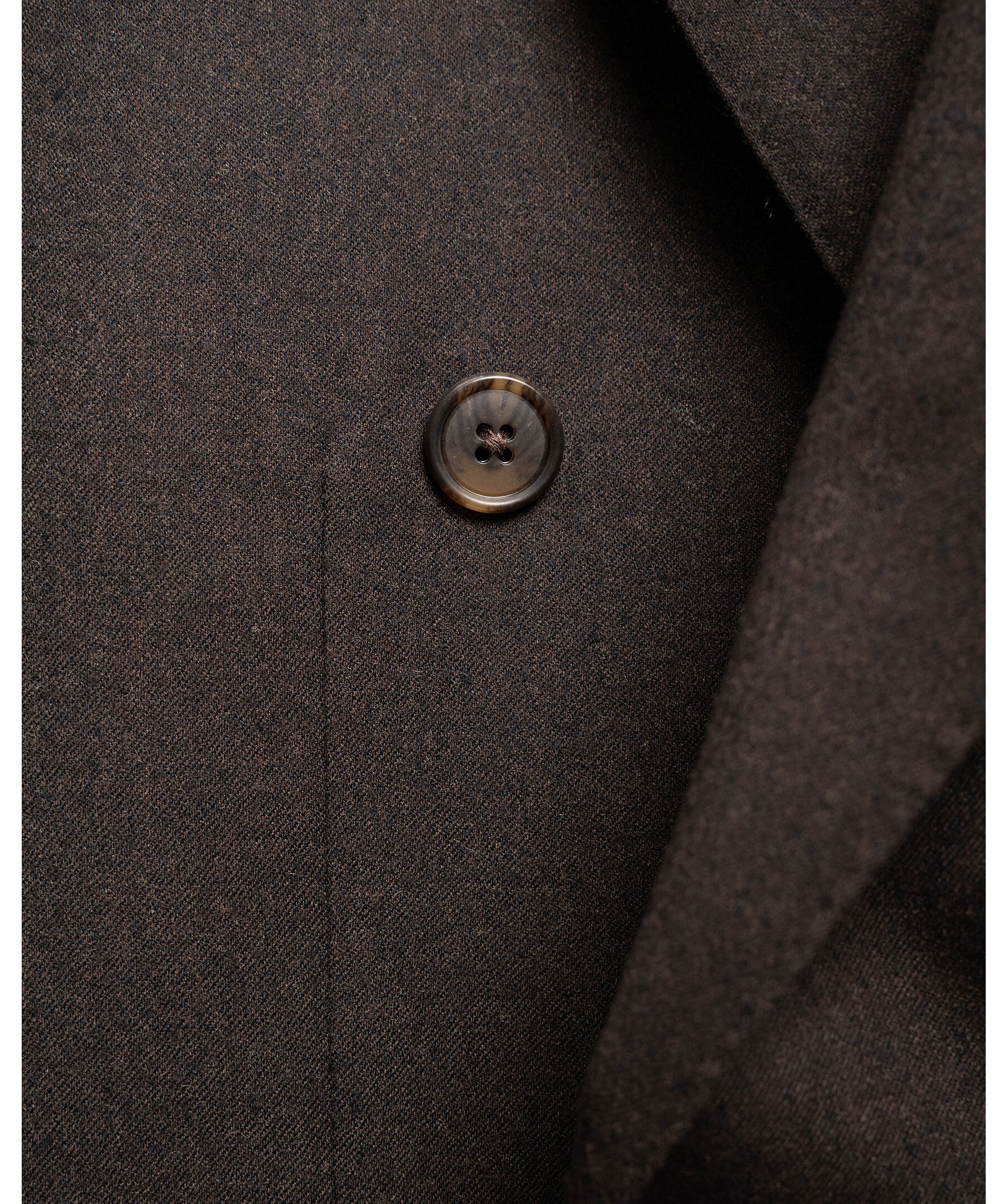 Klassisk dubbelknäppt kavaj i mörkbrun Super 120’s Wool Flannel från varumärket 1797. Kavajen har spetsiga slag, två midjefickor med lock, en bröstficka samt dubbelt sprund baktill.