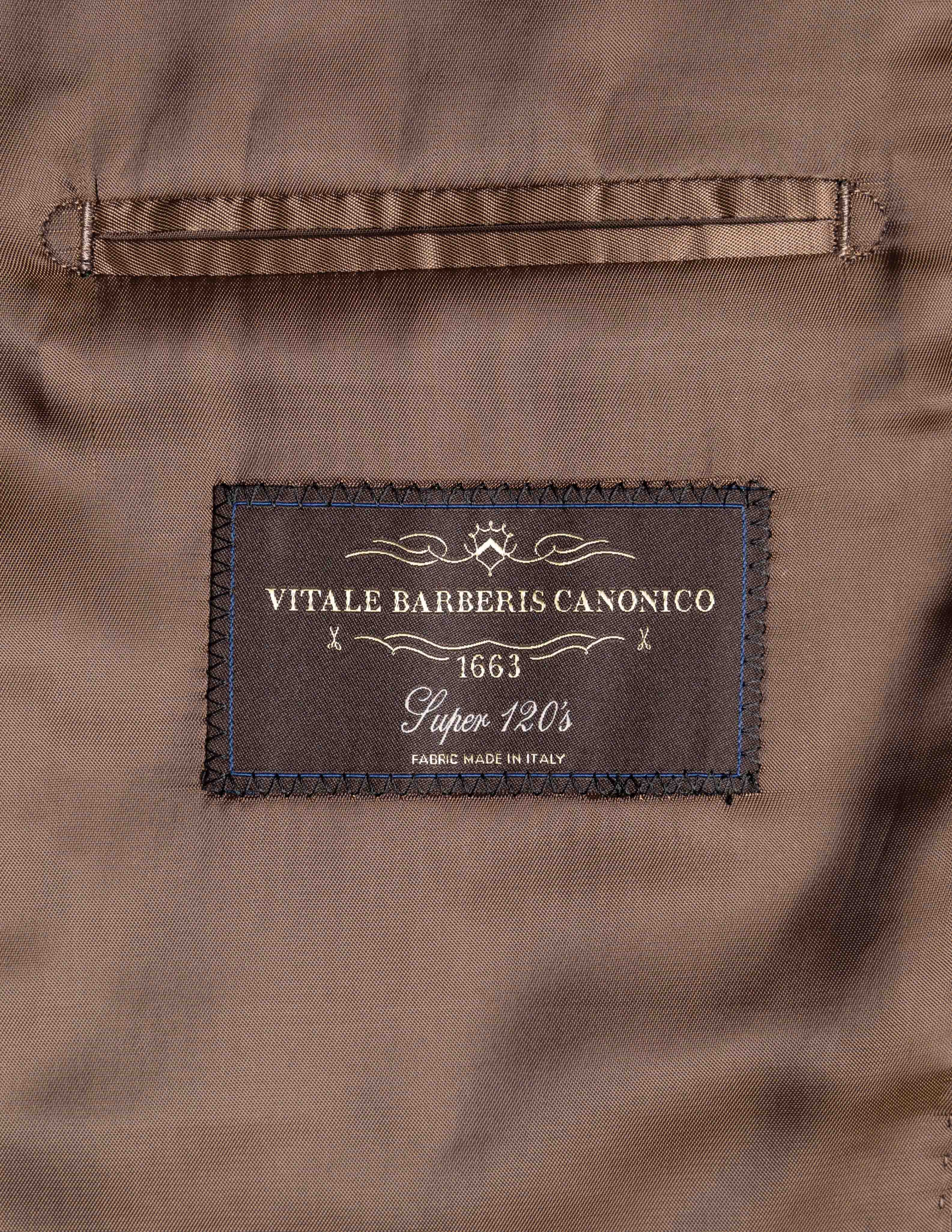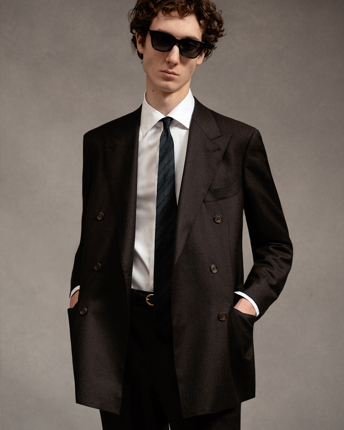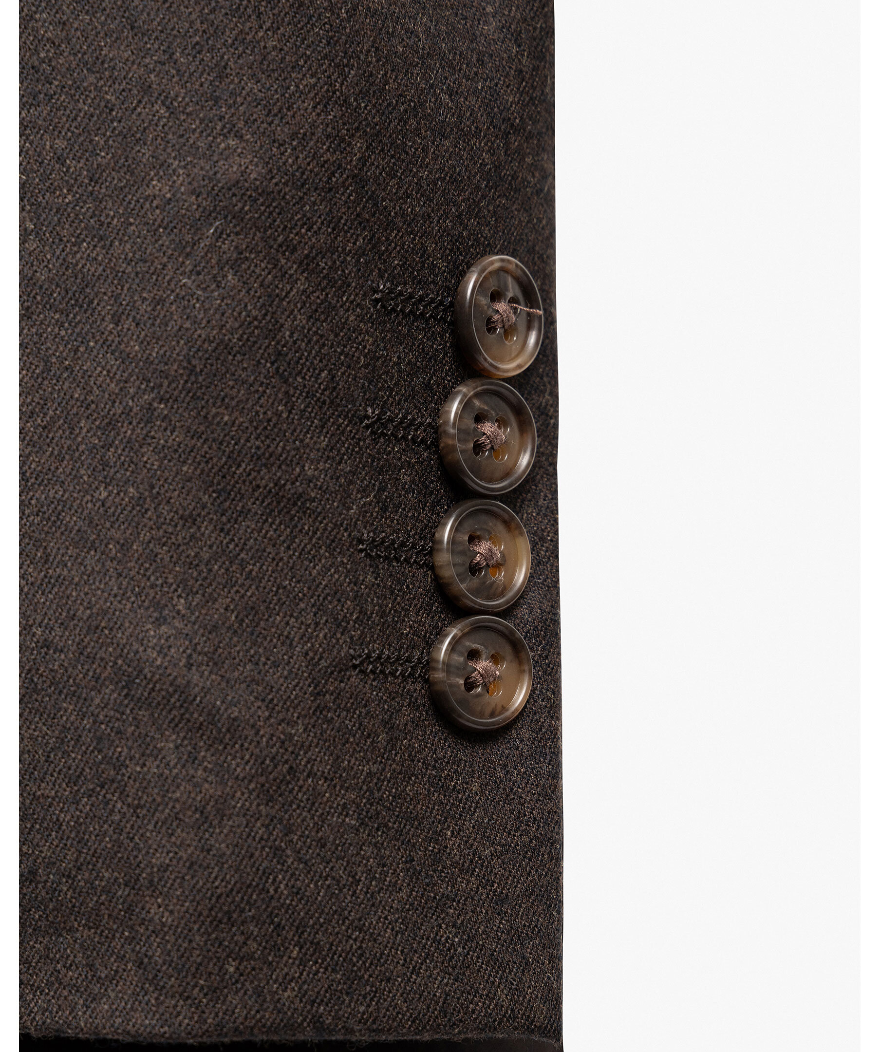 Klassisk dubbelknäppt kavaj i mörkbrun Super 120’s Wool Flannel från varumärket 1797. Kavajen har spetsiga slag, två midjefickor med lock, en bröstficka samt dubbelt sprund baktill.