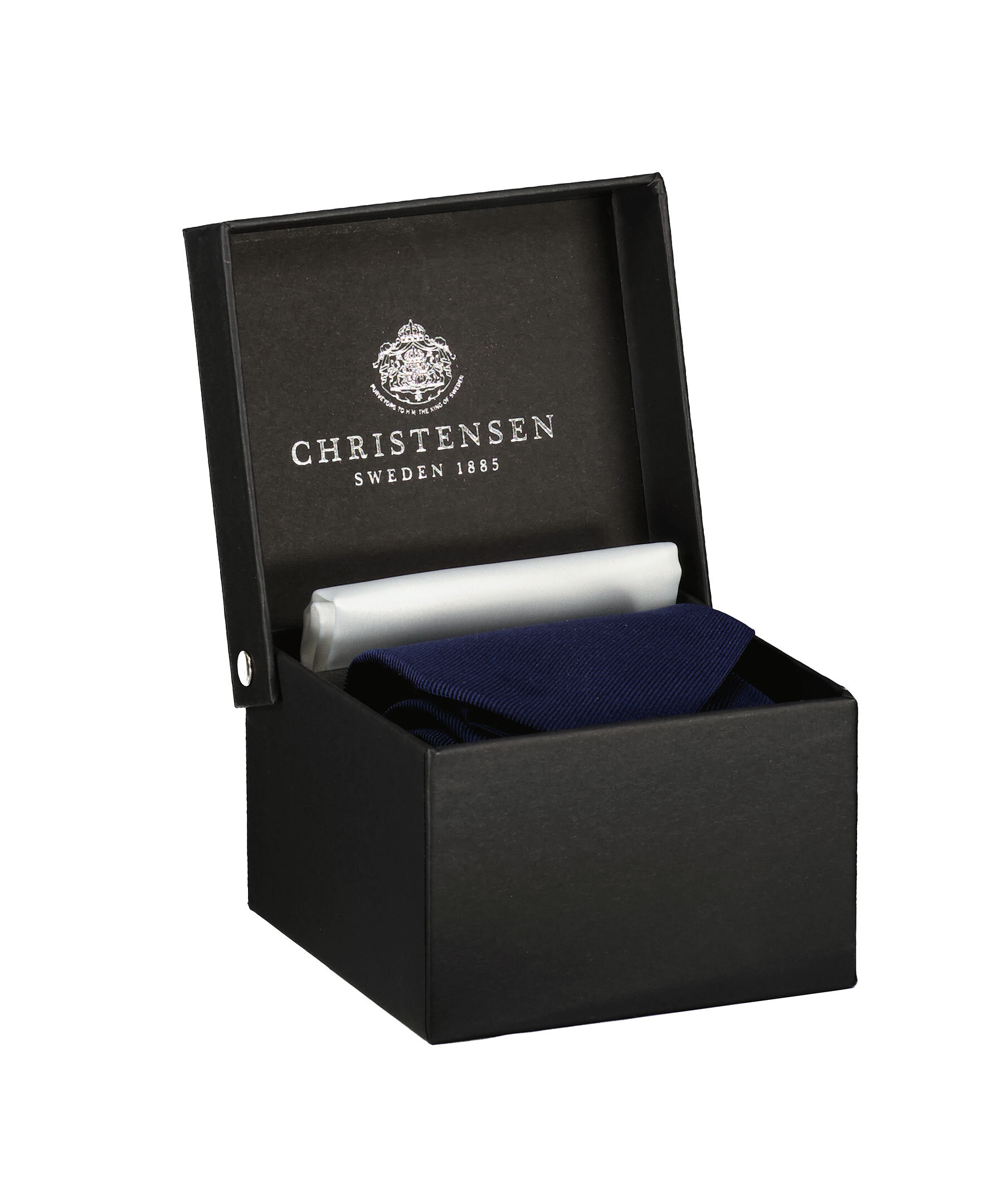 Box med slips och ficknäsduk från Amanda Christensen. Marinblå slips och vit ficknäsduk. Mått slips: B: 8cm. Mått ficknäsduk: 33 x 33 cm.