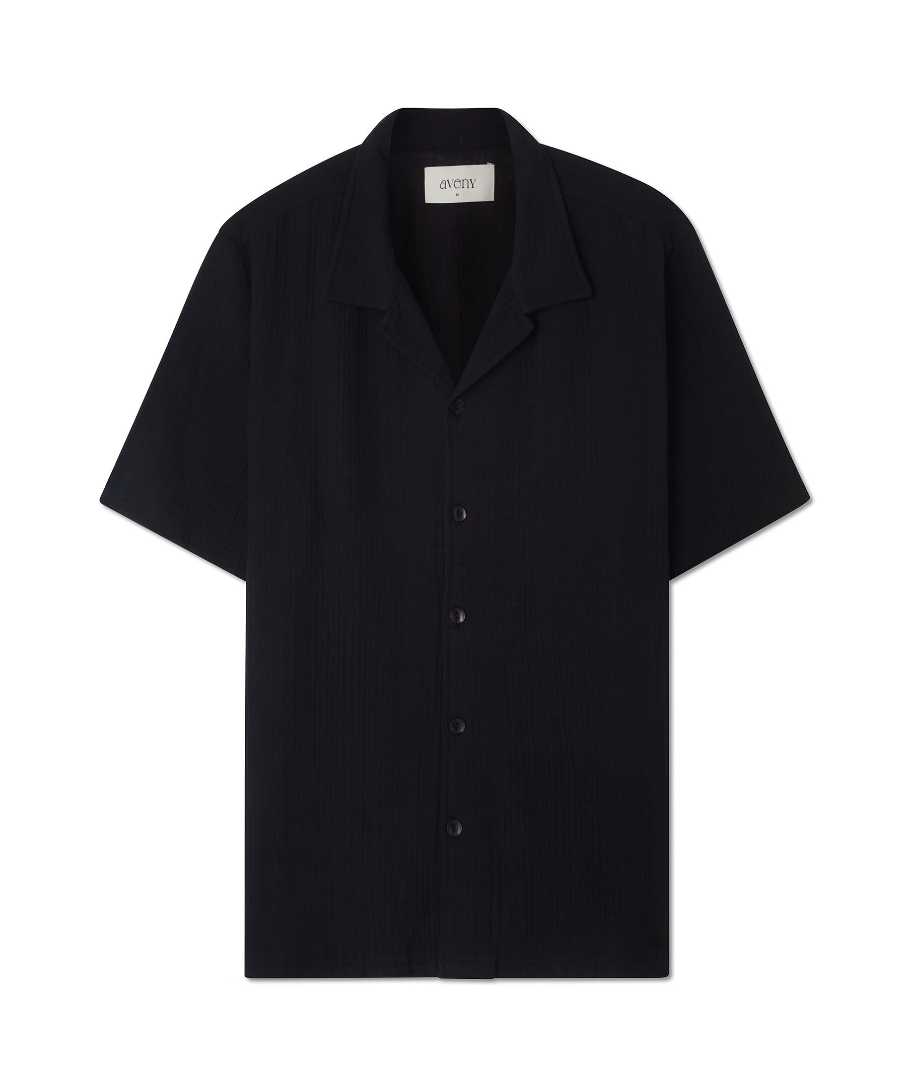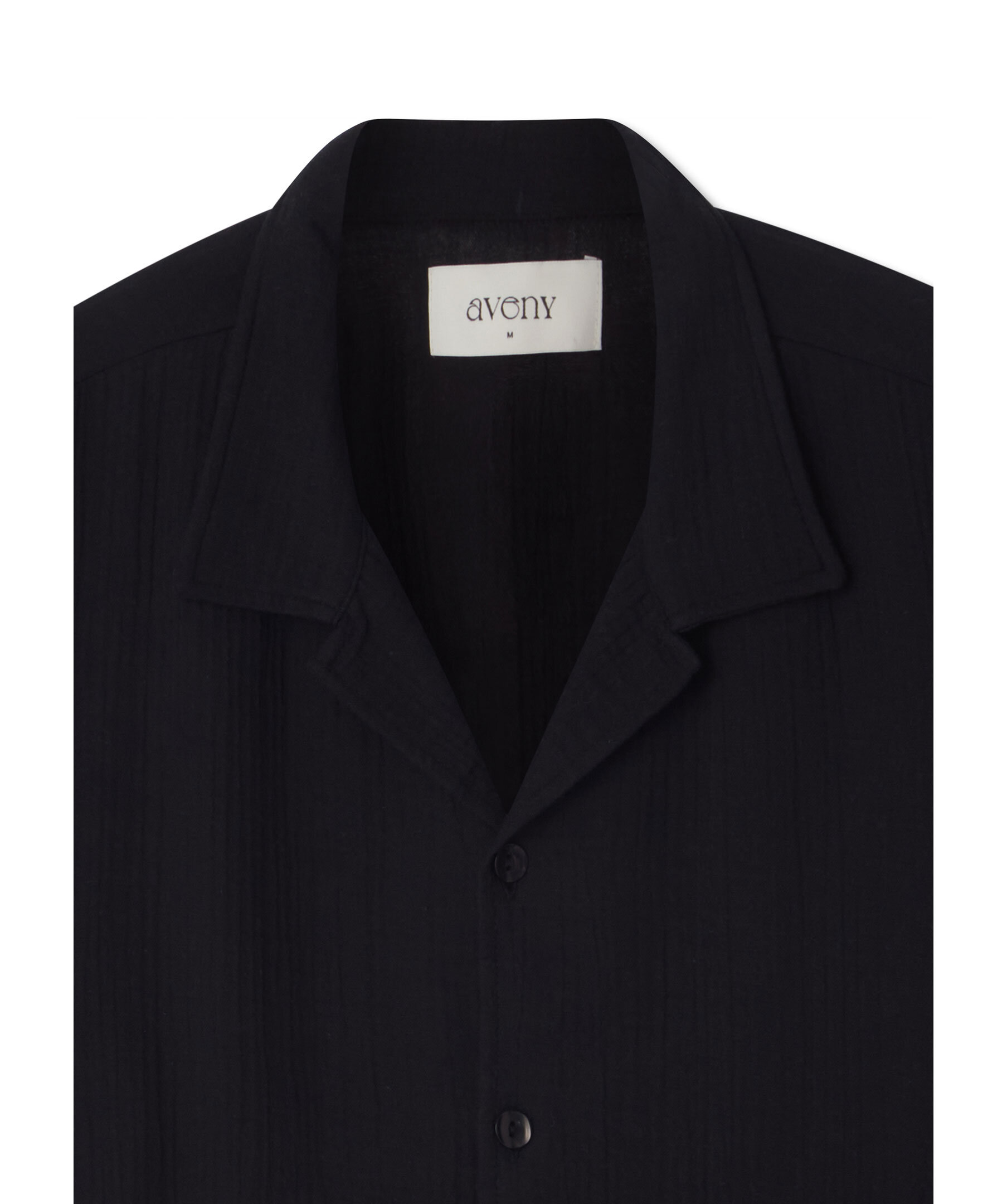 Svart skjorta från Aveny. Skjortan är kortärmad och har en bowlingkrage, stängs med pärlknappar fram. Tillverkad av bomull, i ett stilfullt skrynkligt tyg.