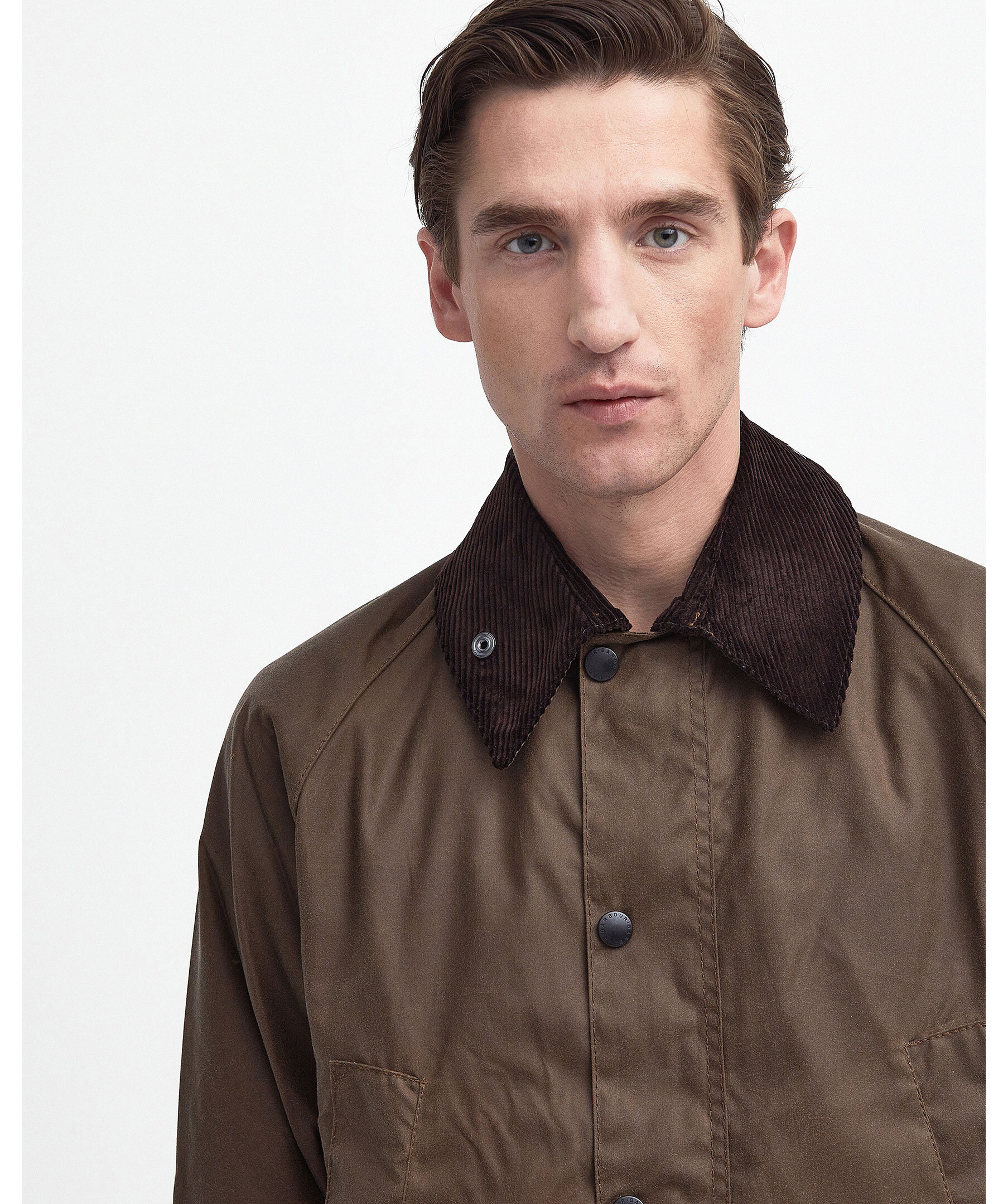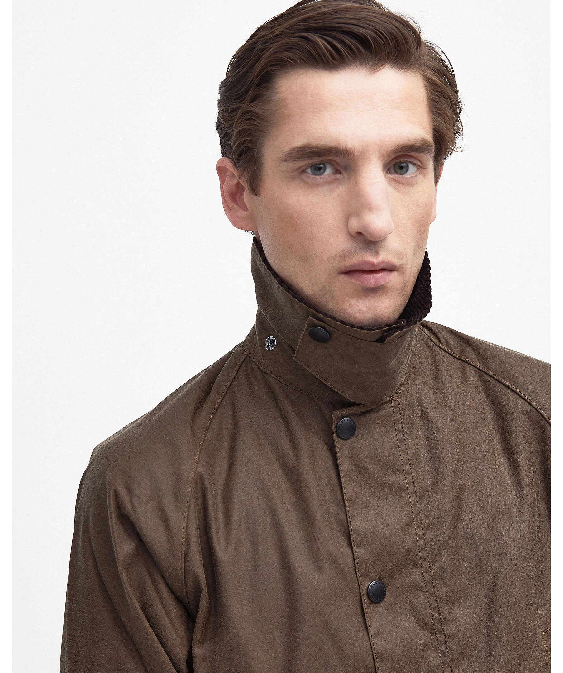 Brun jacka i vaxad bomull från Barbour. Jackan stängs med dold tvåvägsdragkedja och tryckknappar och har en kortare längd, ventilationsöppningar bak och den viktiga invändiga "droppremsan" i nylon som ger motstånd mot fukt från hästar som sipprar in i jackan. Den har även fyra fickor, två med lock och knapp samt krage i manchestertyg som går att vika upp vid extra dåligt väder.