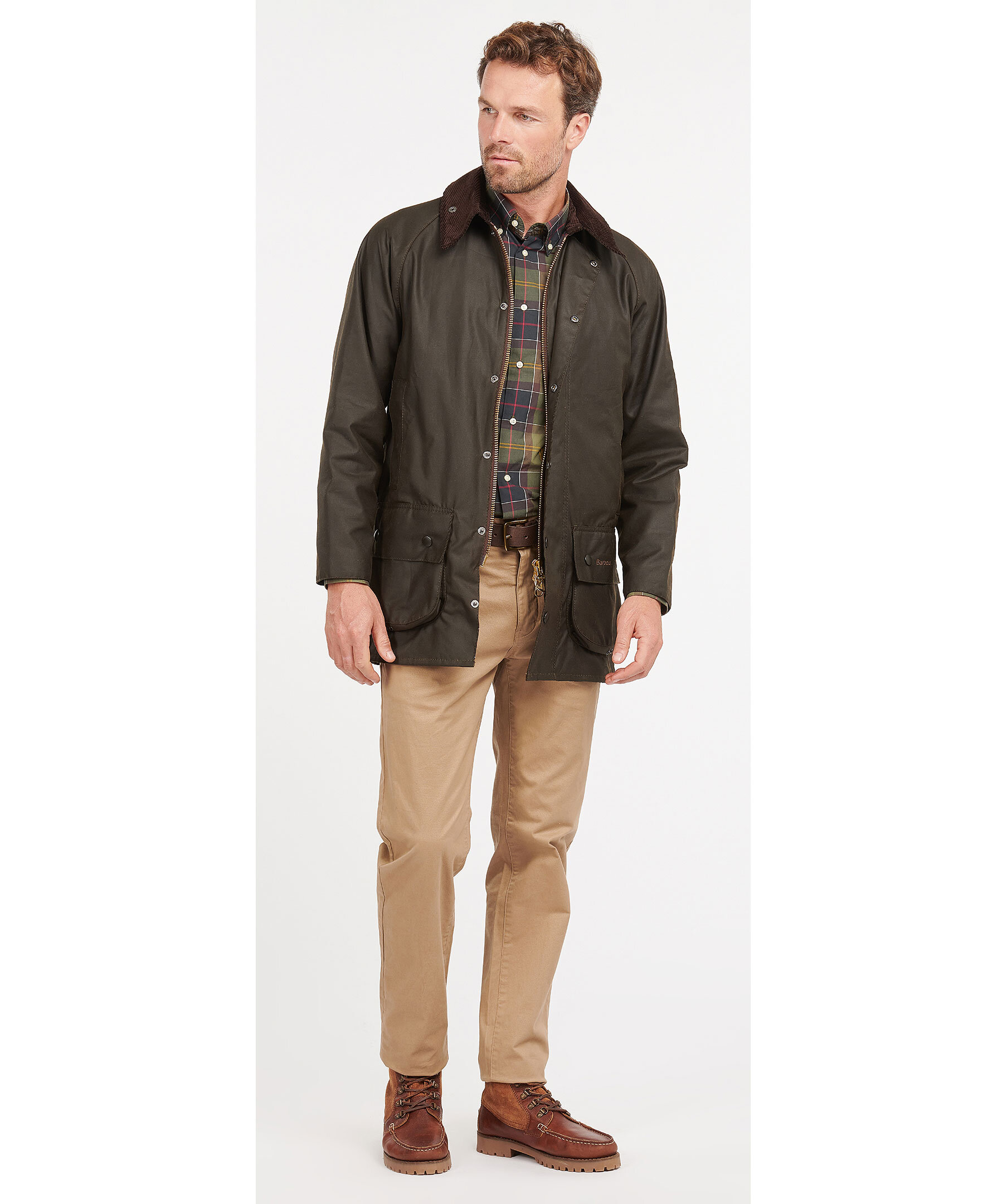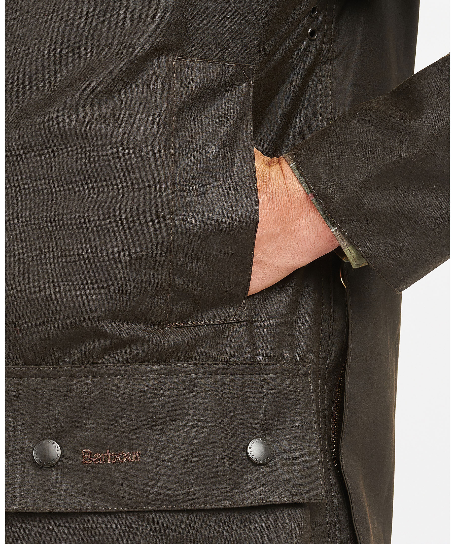 Mörkgrön jacka i vaxad bomull, från Barbour. Krage i brunt manchester, fyra fickor fram med diskret logga på vänster sida. Stor ficka med två öppningar vid ryggslutet. Helt fodrad i tartanmönstrat bomull. Stängs med dragkedja och tryckknappar.